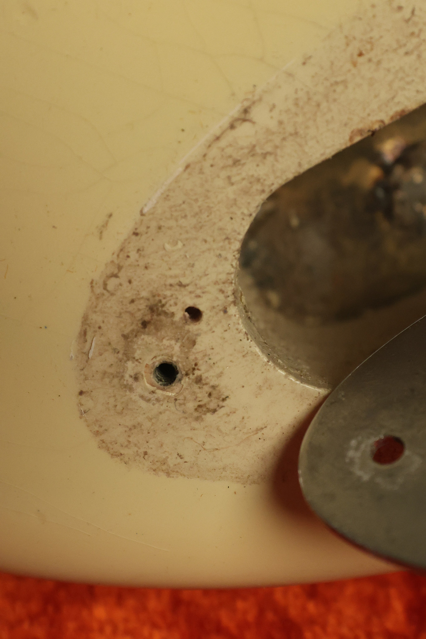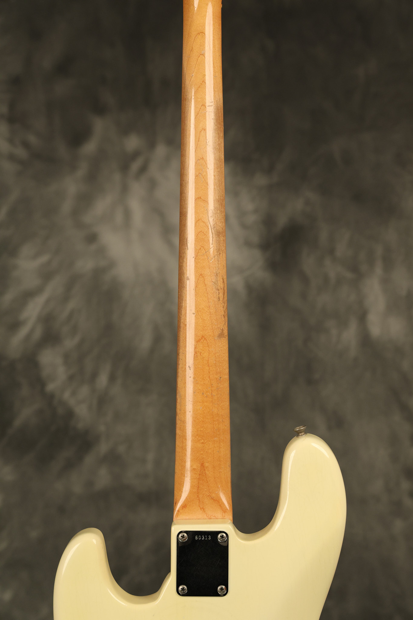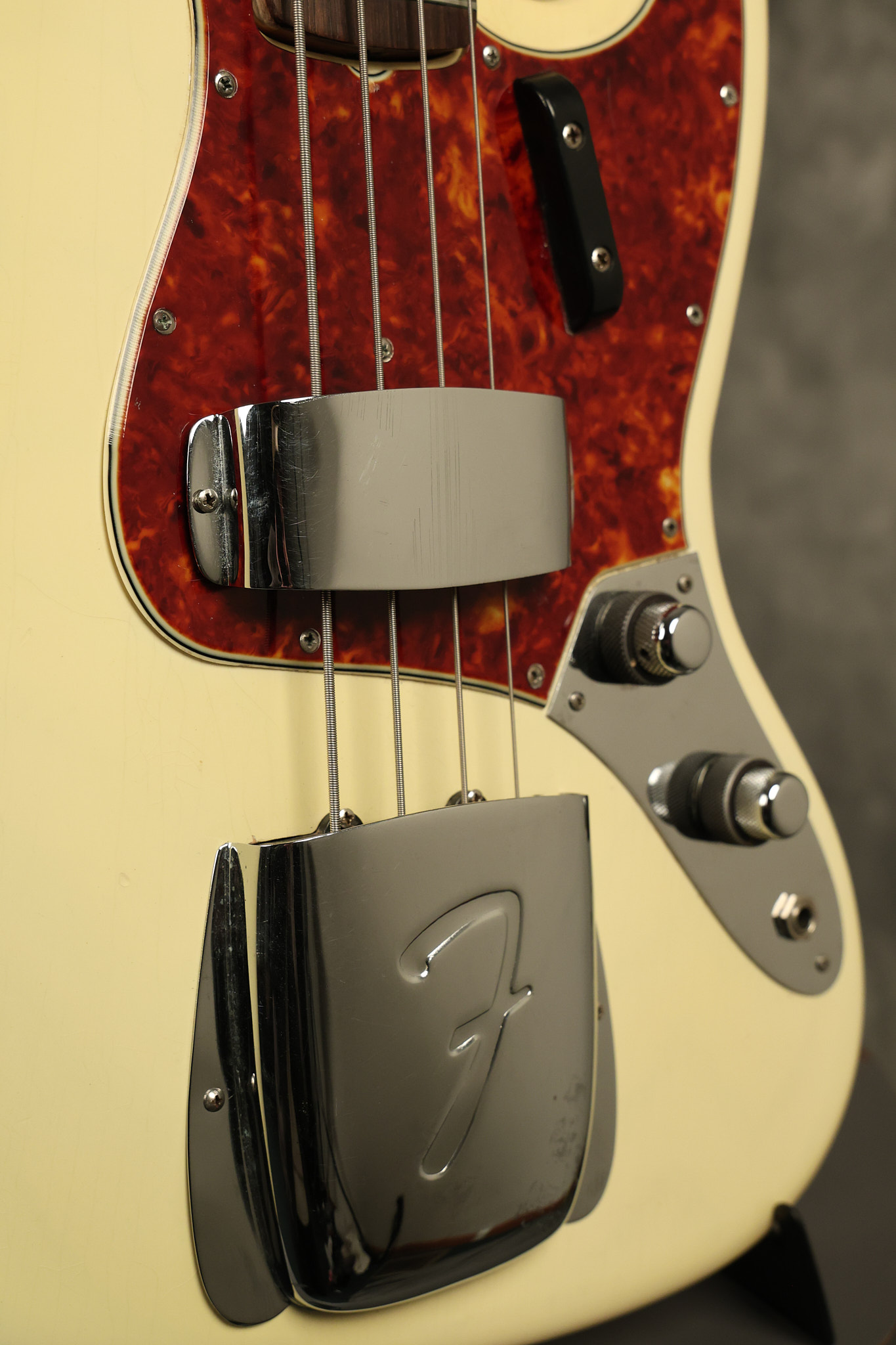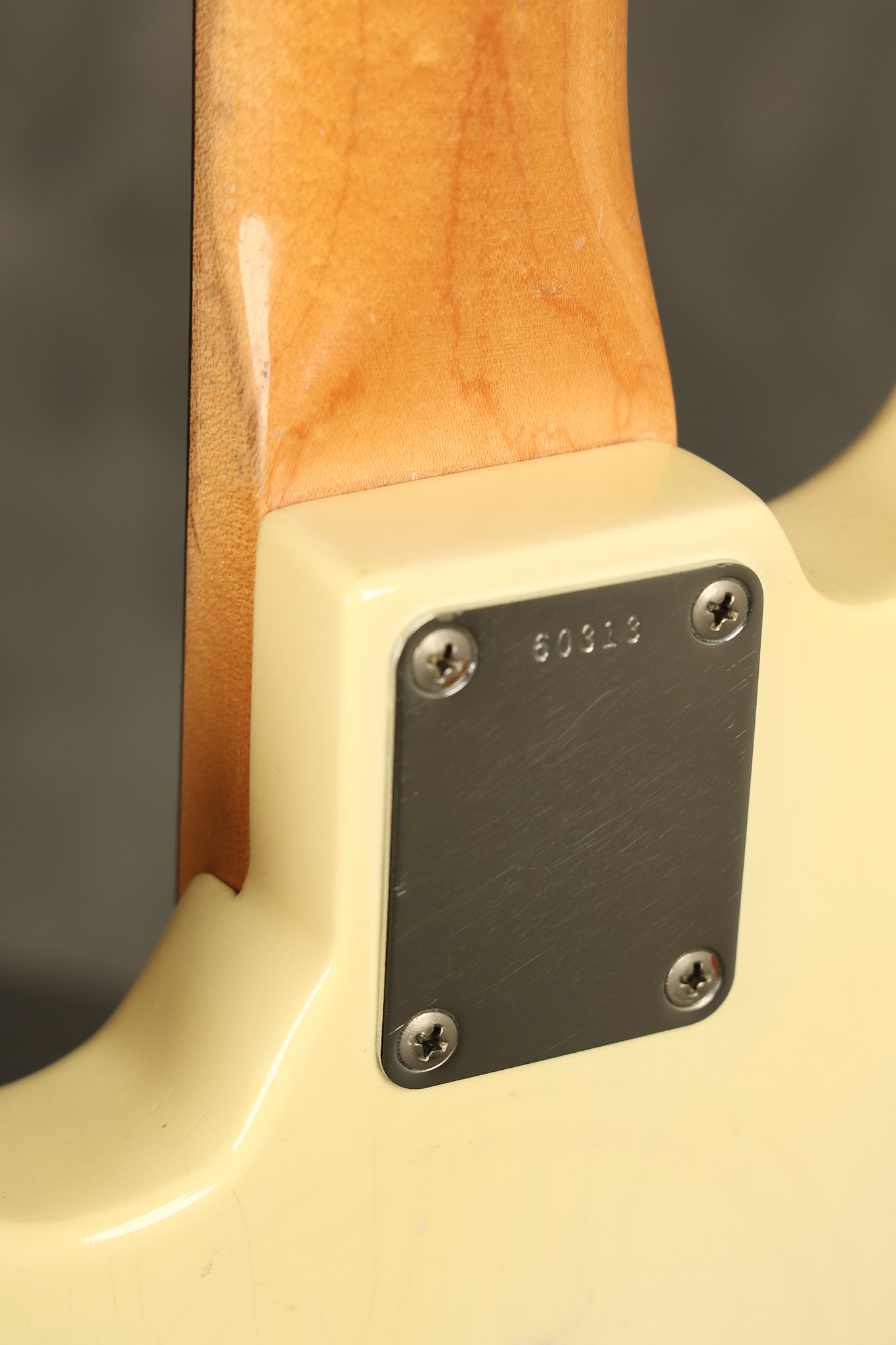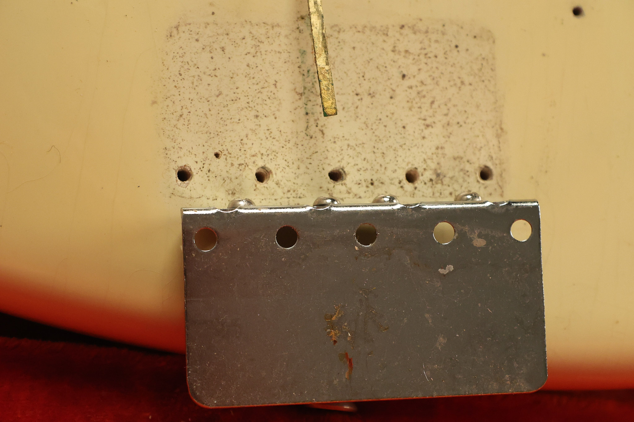 1961 Fender Jazz Bass "Stack Knob" with a body that has been refinished Blonde. Traces of original paint found underneath some parts indicate that it was originally Sunburst. The finish on the neck is original, but at the heel end of the neck the underside portion that is concealed in the neck pocket has been sanded. It has a great playing neck with great frets. Both pickups appear to have been rewound. All other parts appear to be original with the exception of one washer for one tuning key, one washer for one of the mutes and 3 of the 4 screws for the chrome covers. The original mutes are included along with the original Brown hardshell case. There are two areas on the back of the body where the finish was chipped/buffed out over the two factory dowels. There are nicks + dings, finish checking and other cosmetic wear including two faint rings in the finish of the back of the body. All electronics work and sound great, but the two original resistors have been removed. The weight is 8 lbs. 9 oz. without the covers.