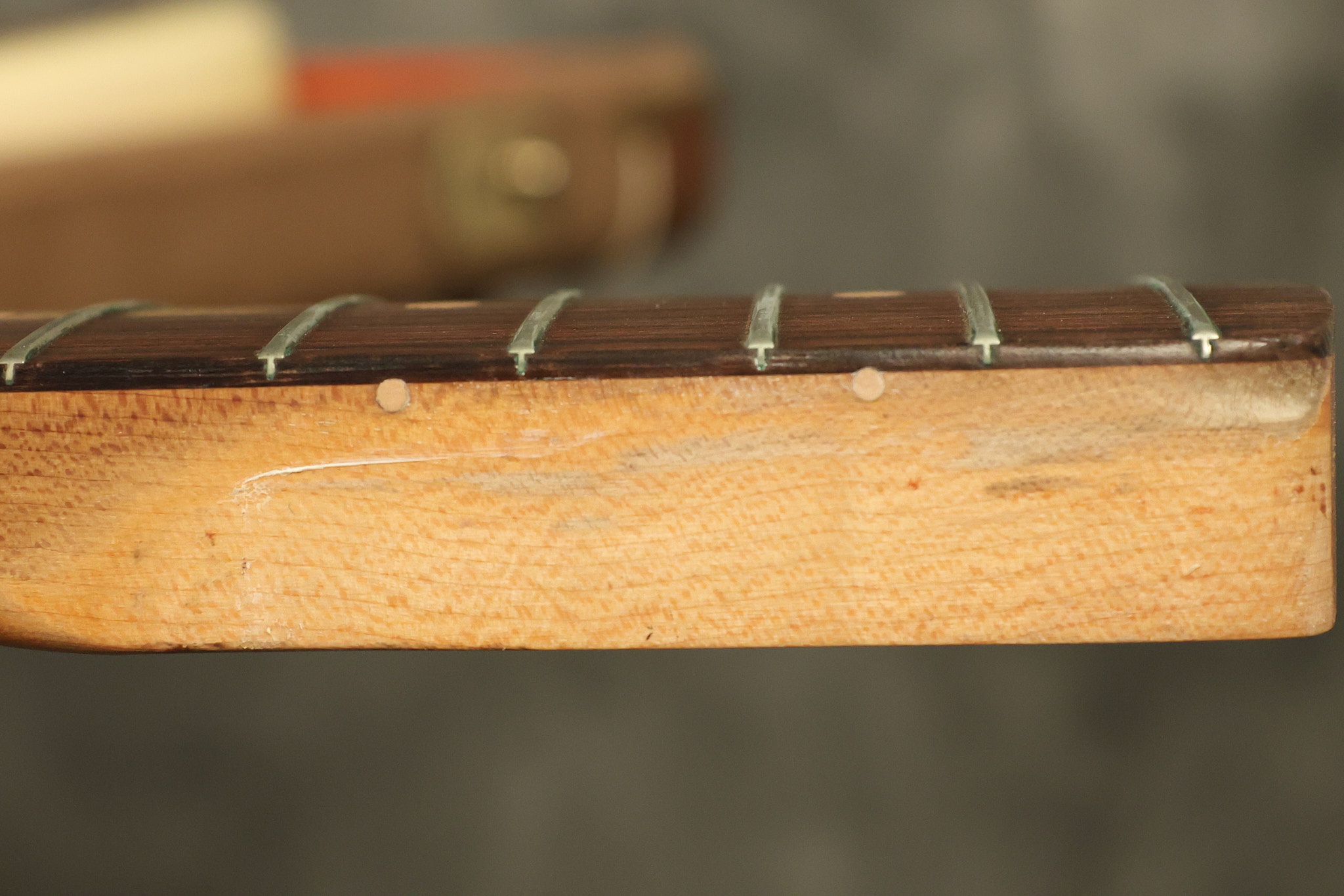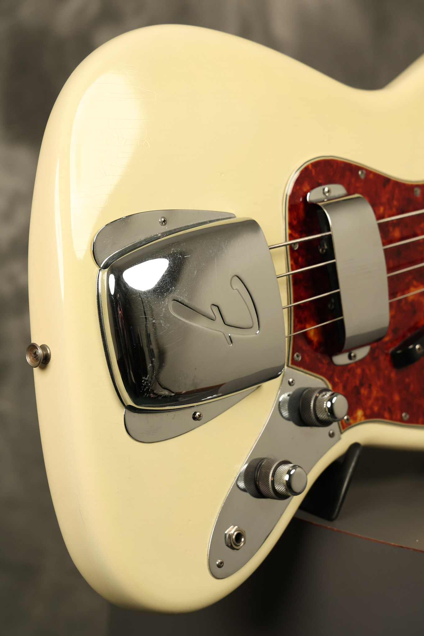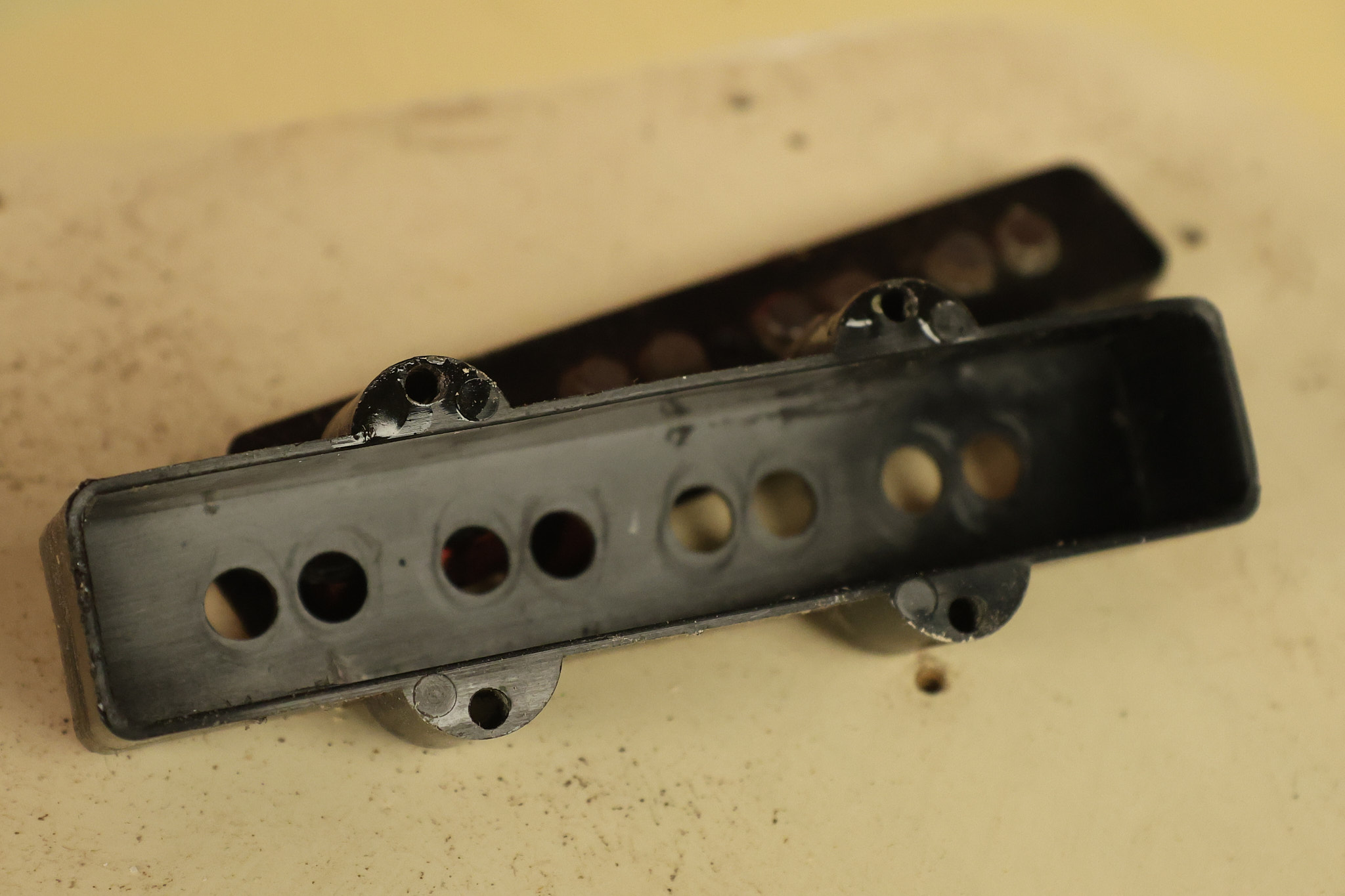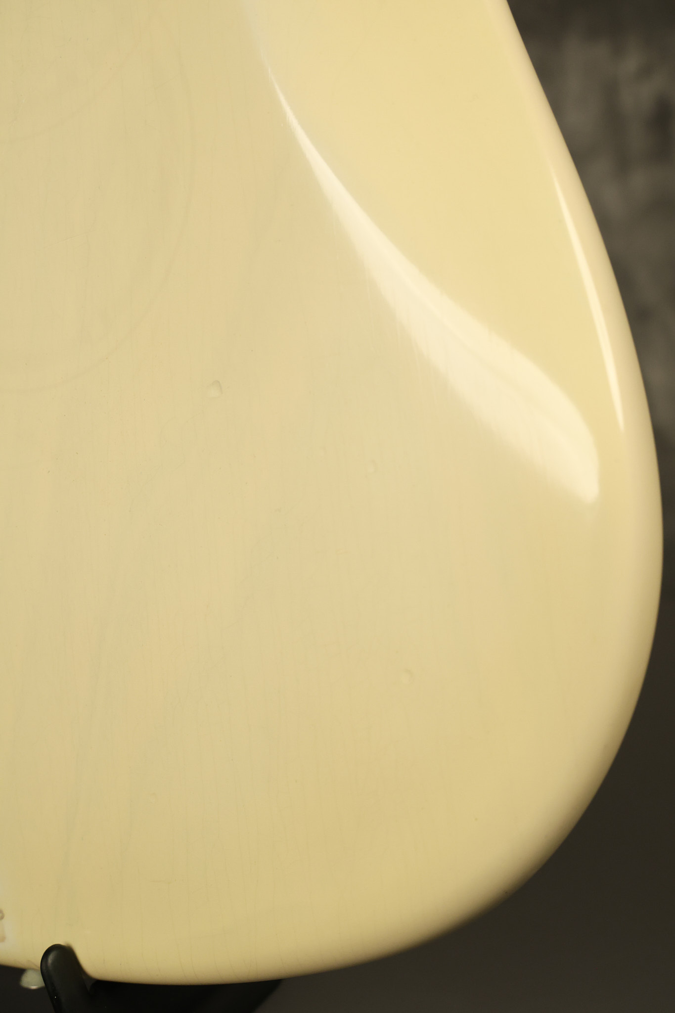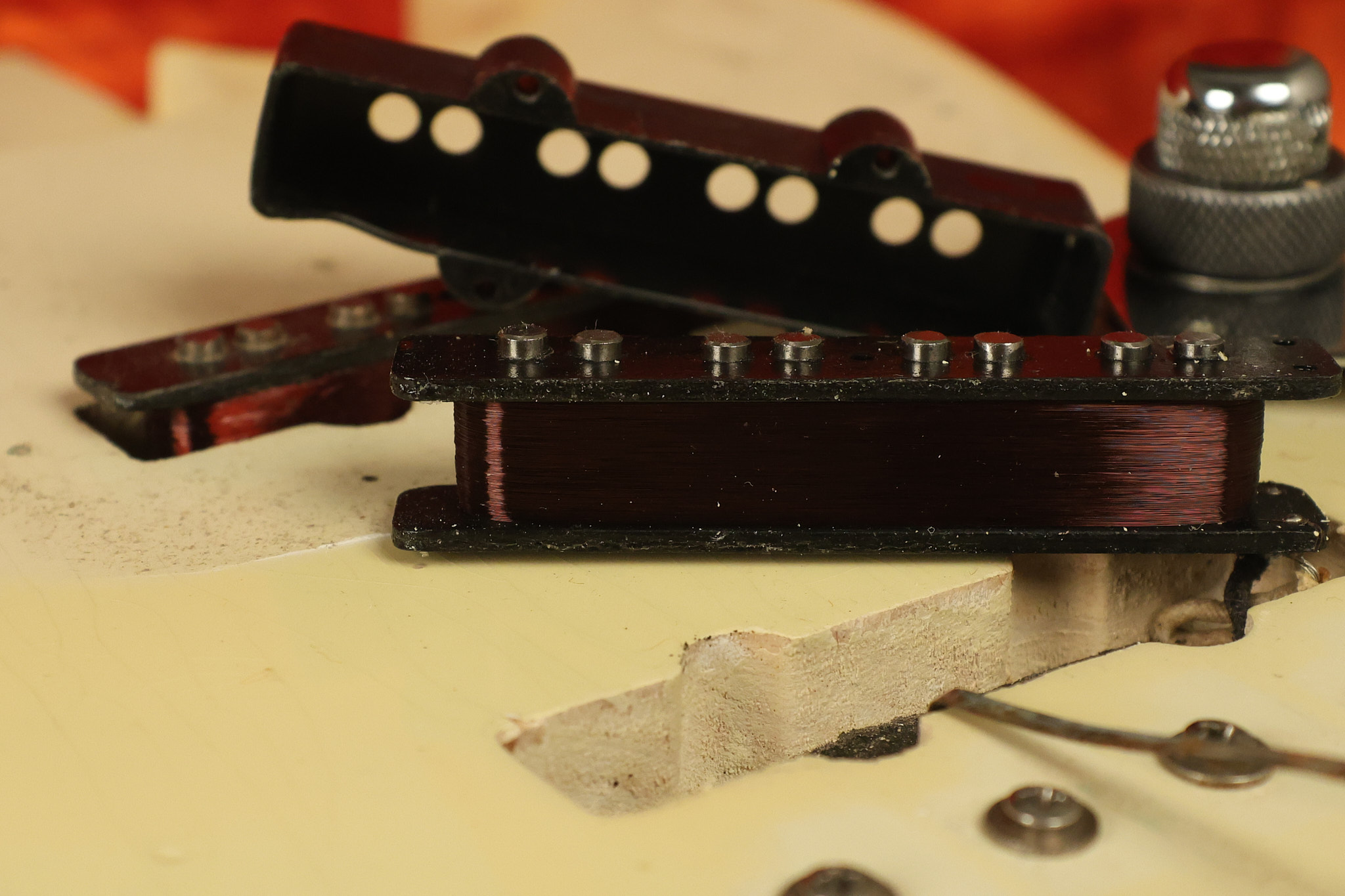1961 Fender Jazz Bass "Stack Knob" with a body that has been refinished Blonde. Traces of original paint found underneath some parts indicate that it was originally Sunburst. The finish on the neck is original, but at the heel end of the neck the underside portion that is concealed in the neck pocket has been sanded. It has a great playing neck with great frets. Both pickups appear to have been rewound. All other parts appear to be original with the exception of one washer for one tuning key, one washer for one of the mutes and 3 of the 4 screws for the chrome covers. The original mutes are included along with the original Brown hardshell case. There are two areas on the back of the body where the finish was chipped/buffed out over the two factory dowels. There are nicks + dings, finish checking and other cosmetic wear including two faint rings in the finish of the back of the body. All electronics work and sound great, but the two original resistors have been removed. The weight is 8 lbs. 9 oz. without the covers.