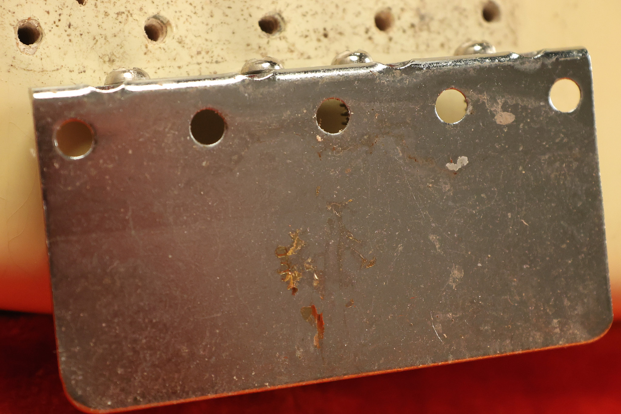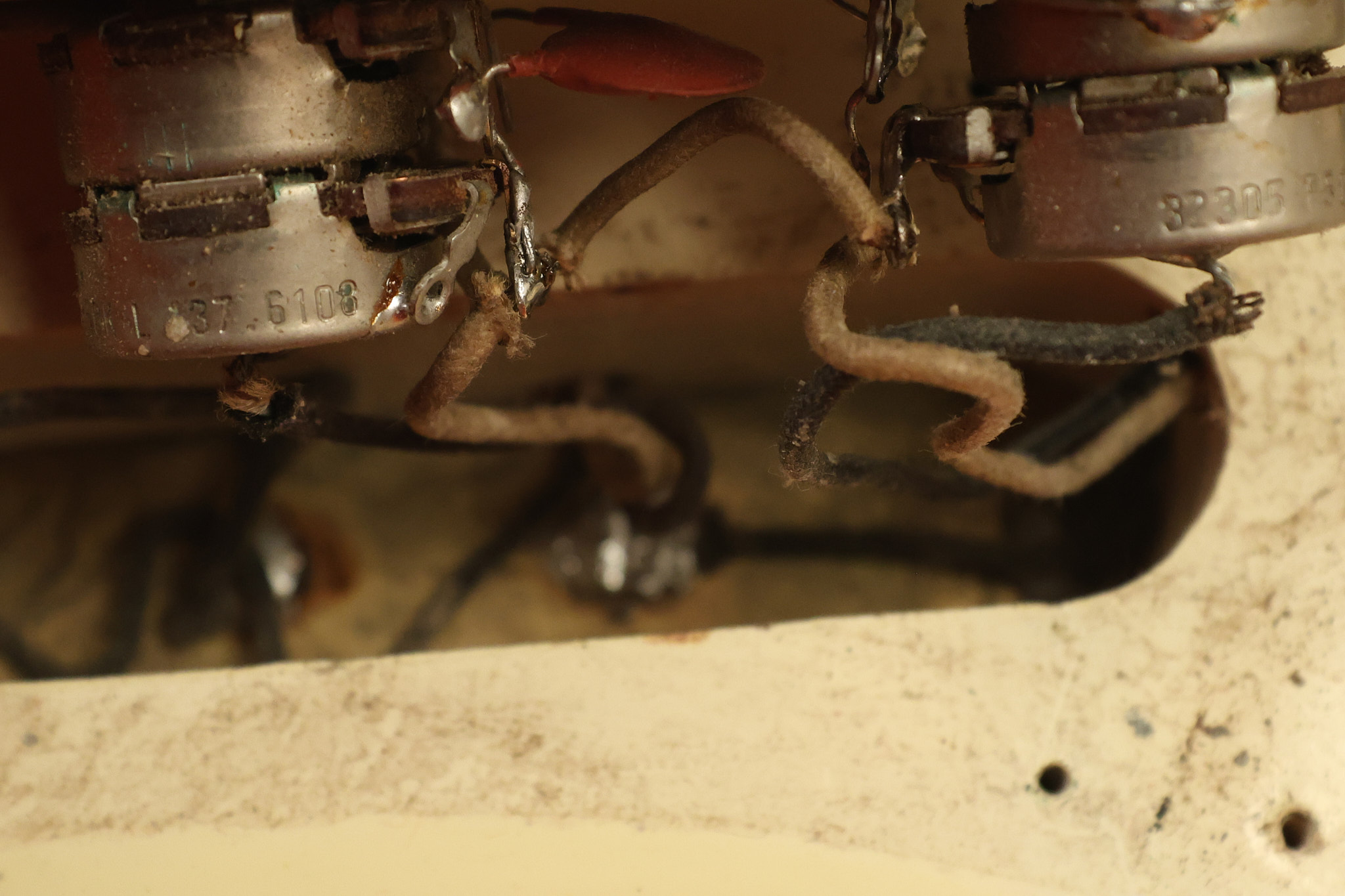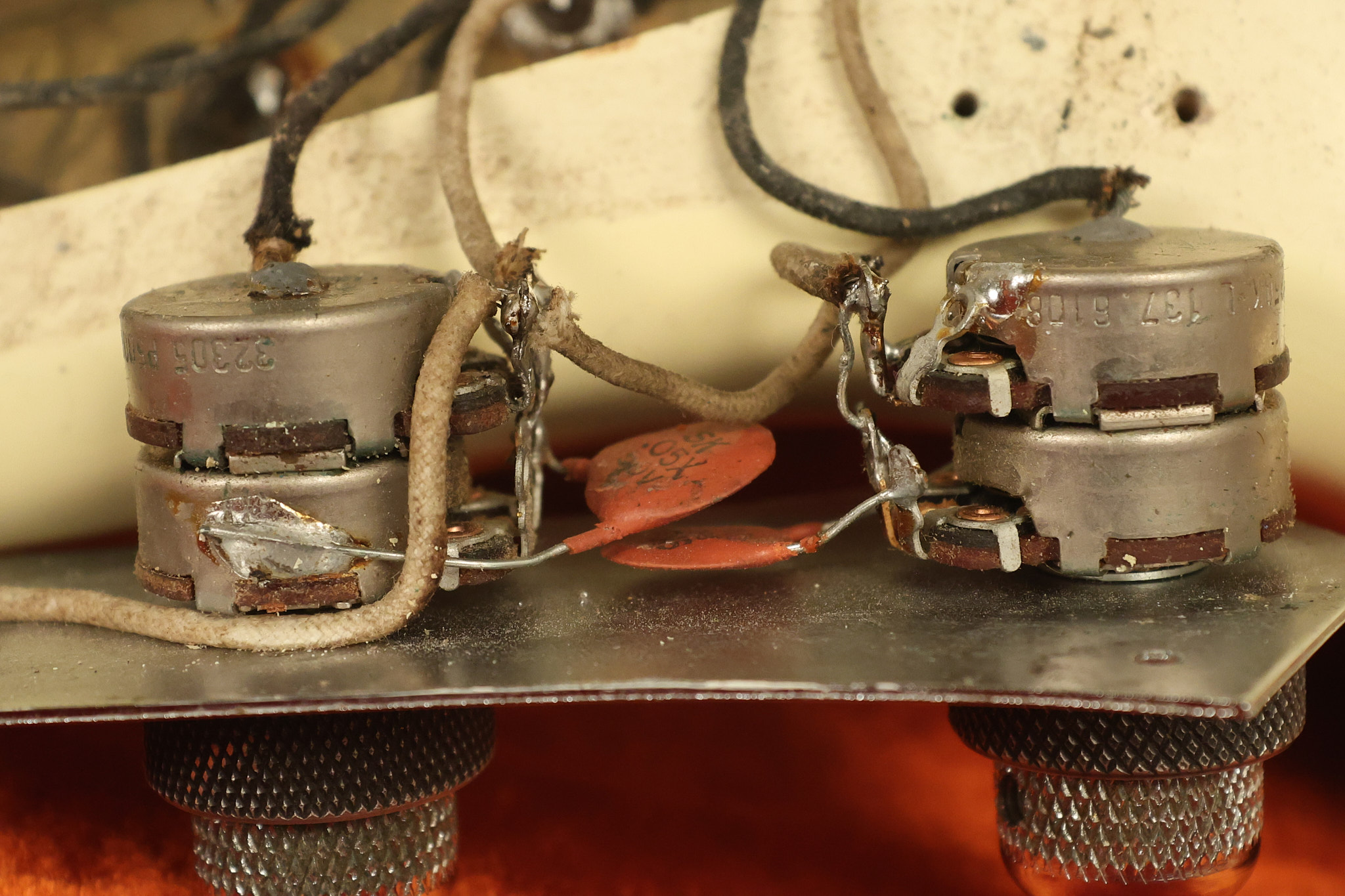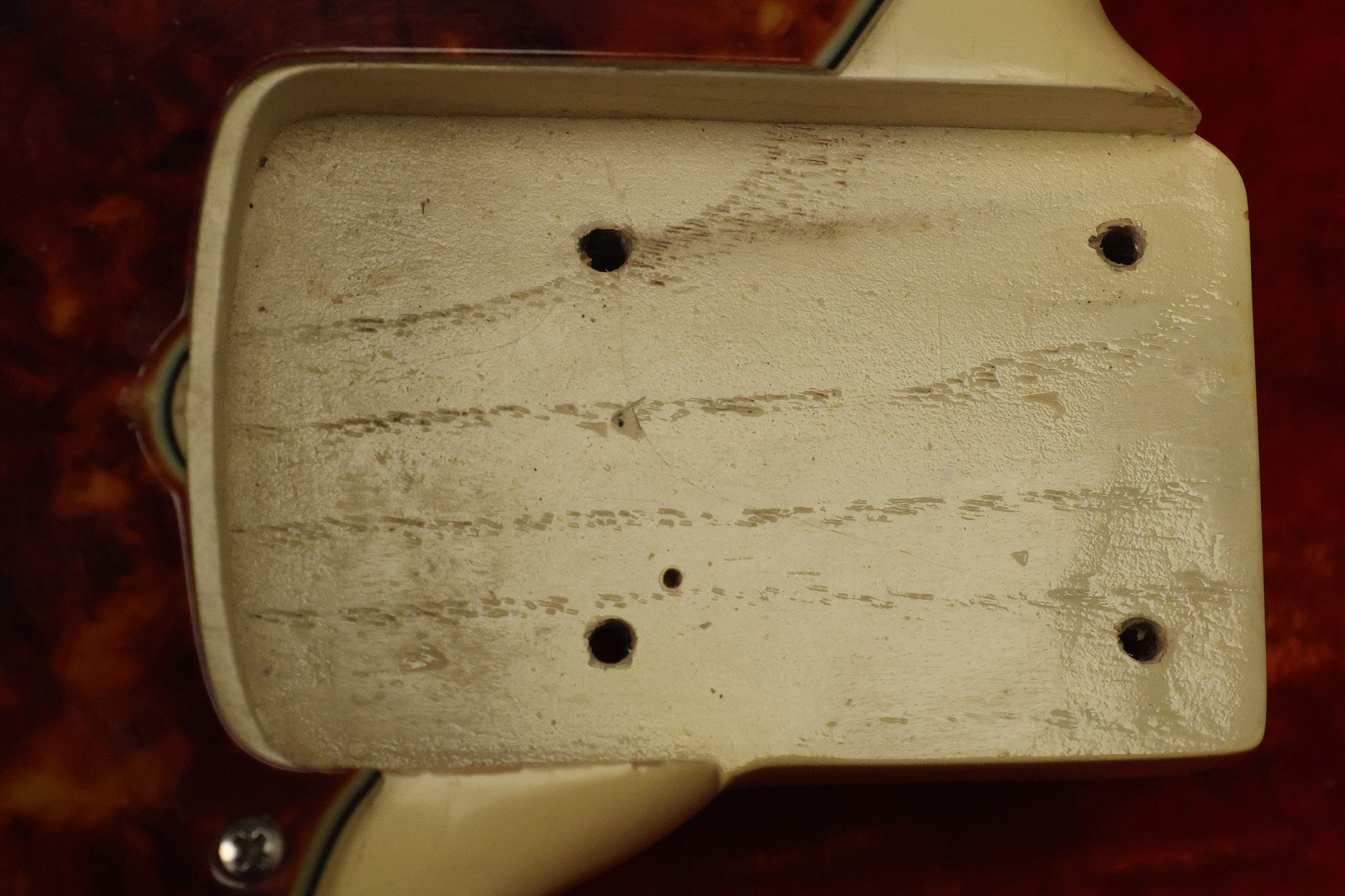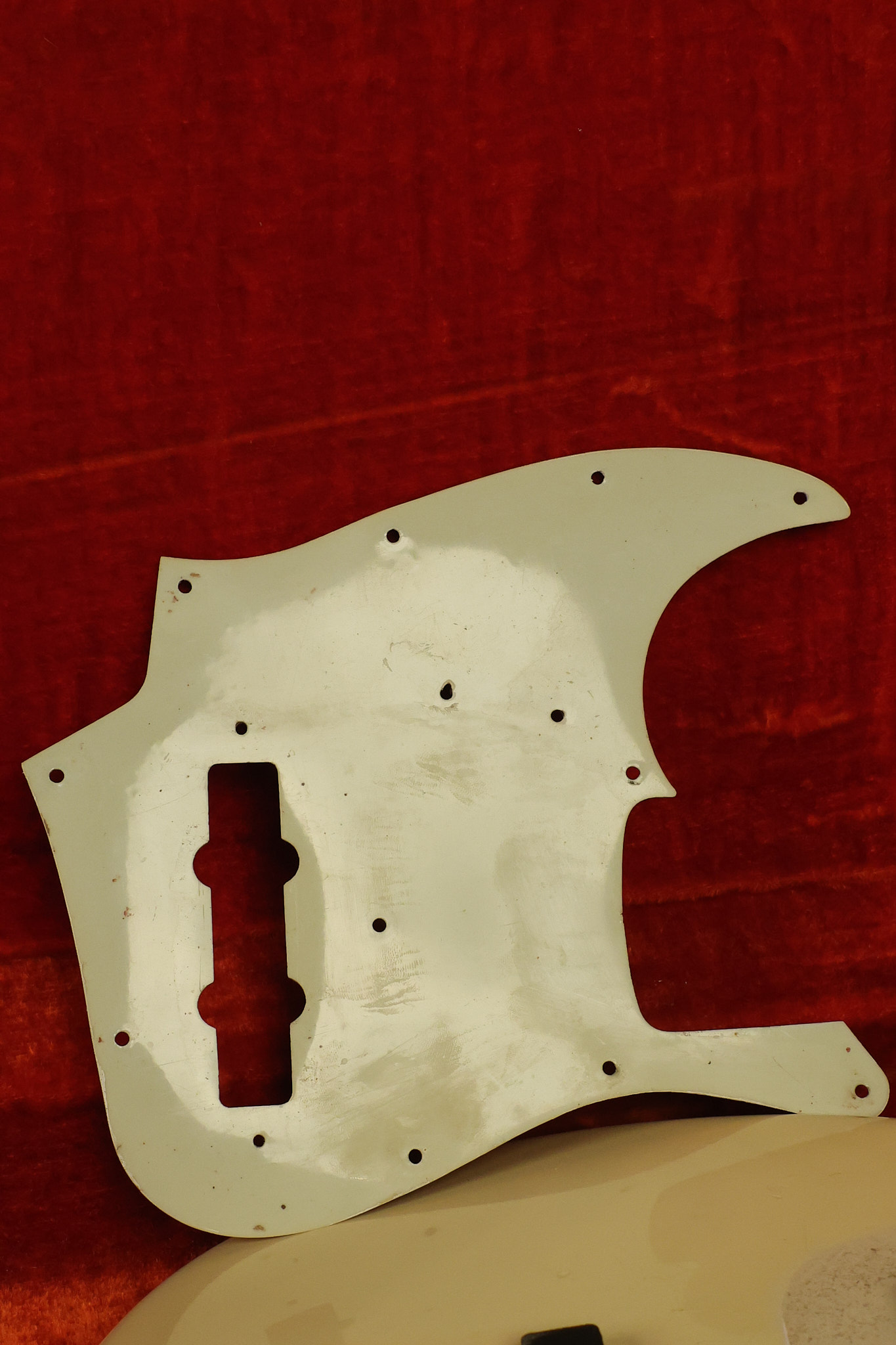 1961 Fender Jazz Bass "Stack Knob" with a body that has been refinished Blonde. Traces of original paint found underneath some parts indicate that it was originally Sunburst. The finish on the neck is original, but at the heel end of the neck the underside portion that is concealed in the neck pocket has been sanded. It has a great playing neck with great frets. Both pickups appear to have been rewound. All other parts appear to be original with the exception of one washer for one tuning key, one washer for one of the mutes and 3 of the 4 screws for the chrome covers. The original mutes are included along with the original Brown hardshell case. There are two areas on the back of the body where the finish was chipped/buffed out over the two factory dowels. There are nicks + dings, finish checking and other cosmetic wear including two faint rings in the finish of the back of the body. All electronics work and sound great, but the two original resistors have been removed. The weight is 8 lbs. 9 oz. without the covers.