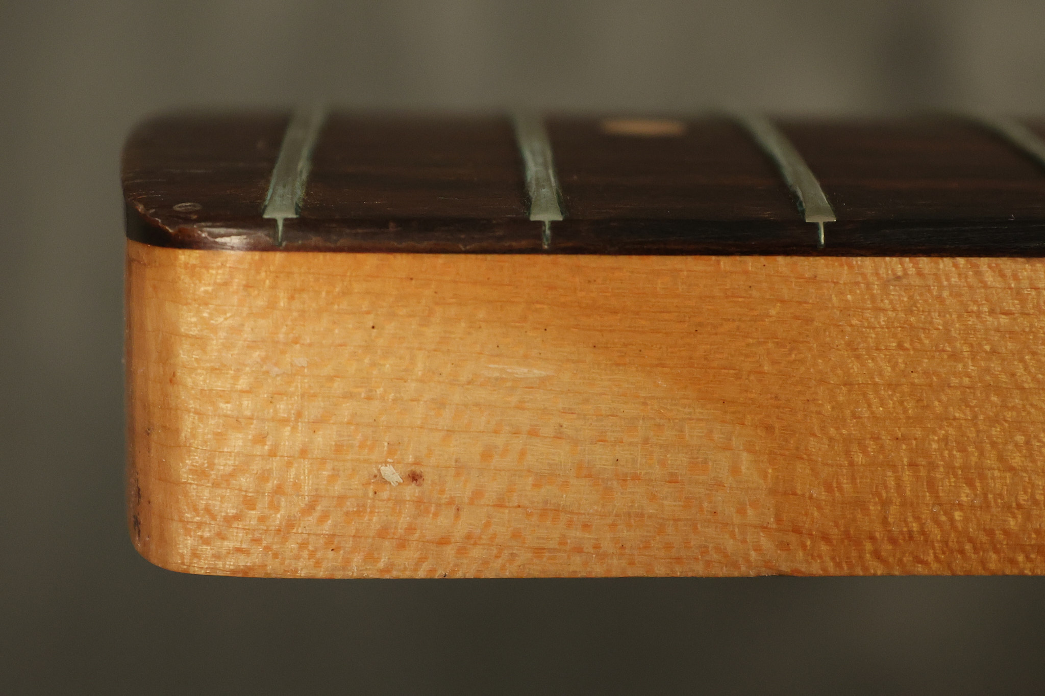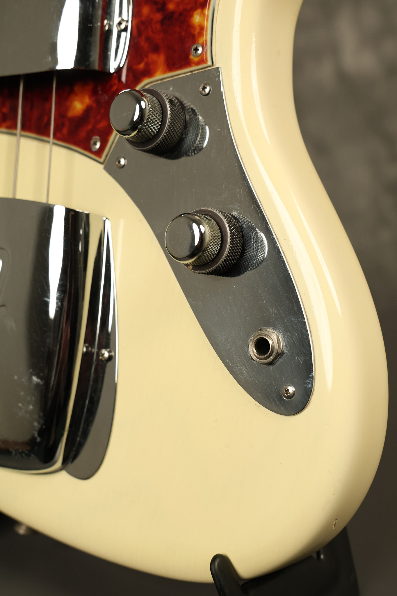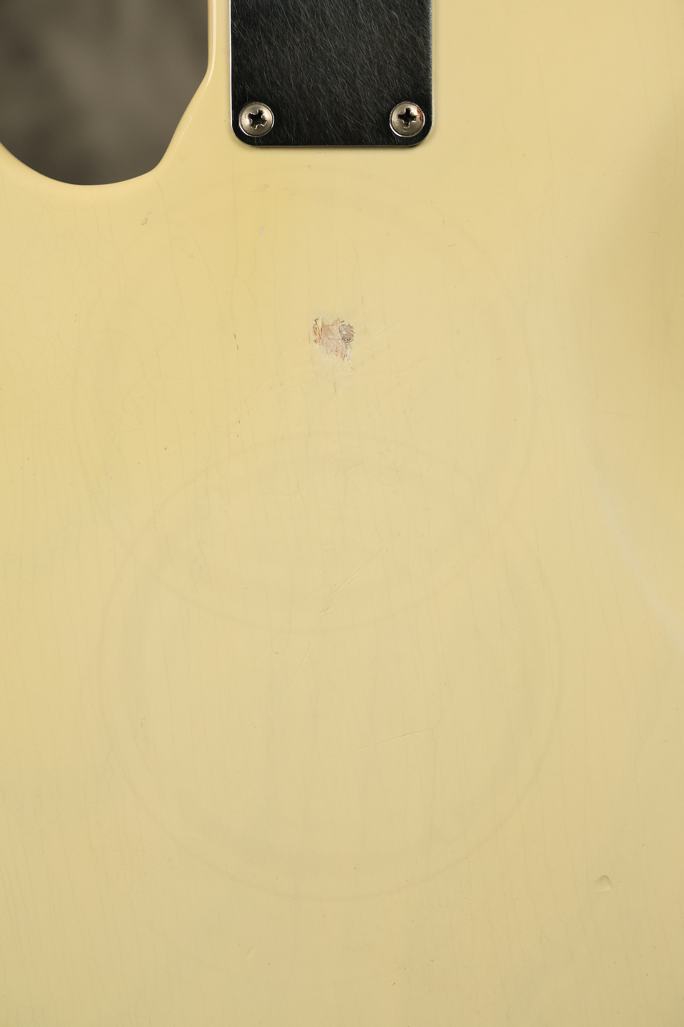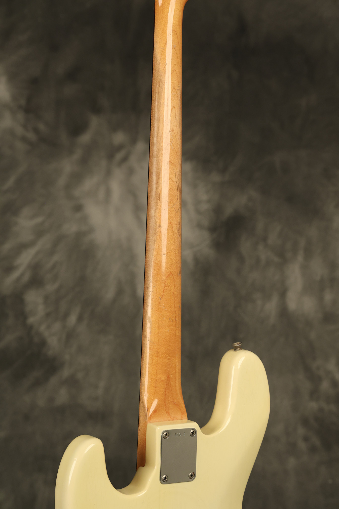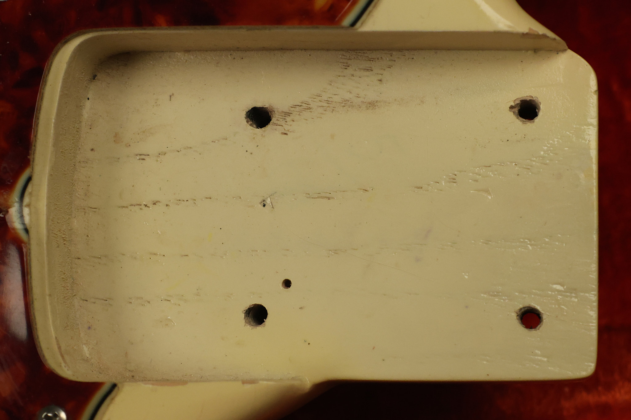 1961 Fender Jazz Bass "Stack Knob" with a body that has been refinished Blonde. Traces of original paint found underneath some parts indicate that it was originally Sunburst. The finish on the neck is original, but at the heel end of the neck the underside portion that is concealed in the neck pocket has been sanded. It has a great playing neck with great frets. Both pickups appear to have been rewound. All other parts appear to be original with the exception of one washer for one tuning key, one washer for one of the mutes and 3 of the 4 screws for the chrome covers. The original mutes are included along with the original Brown hardshell case. There are two areas on the back of the body where the finish was chipped/buffed out over the two factory dowels. There are nicks + dings, finish checking and other cosmetic wear including two faint rings in the finish of the back of the body. All electronics work and sound great, but the two original resistors have been removed. The weight is 8 lbs. 9 oz. without the covers.