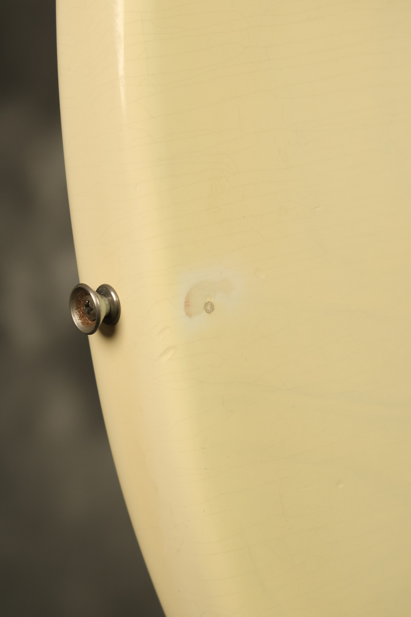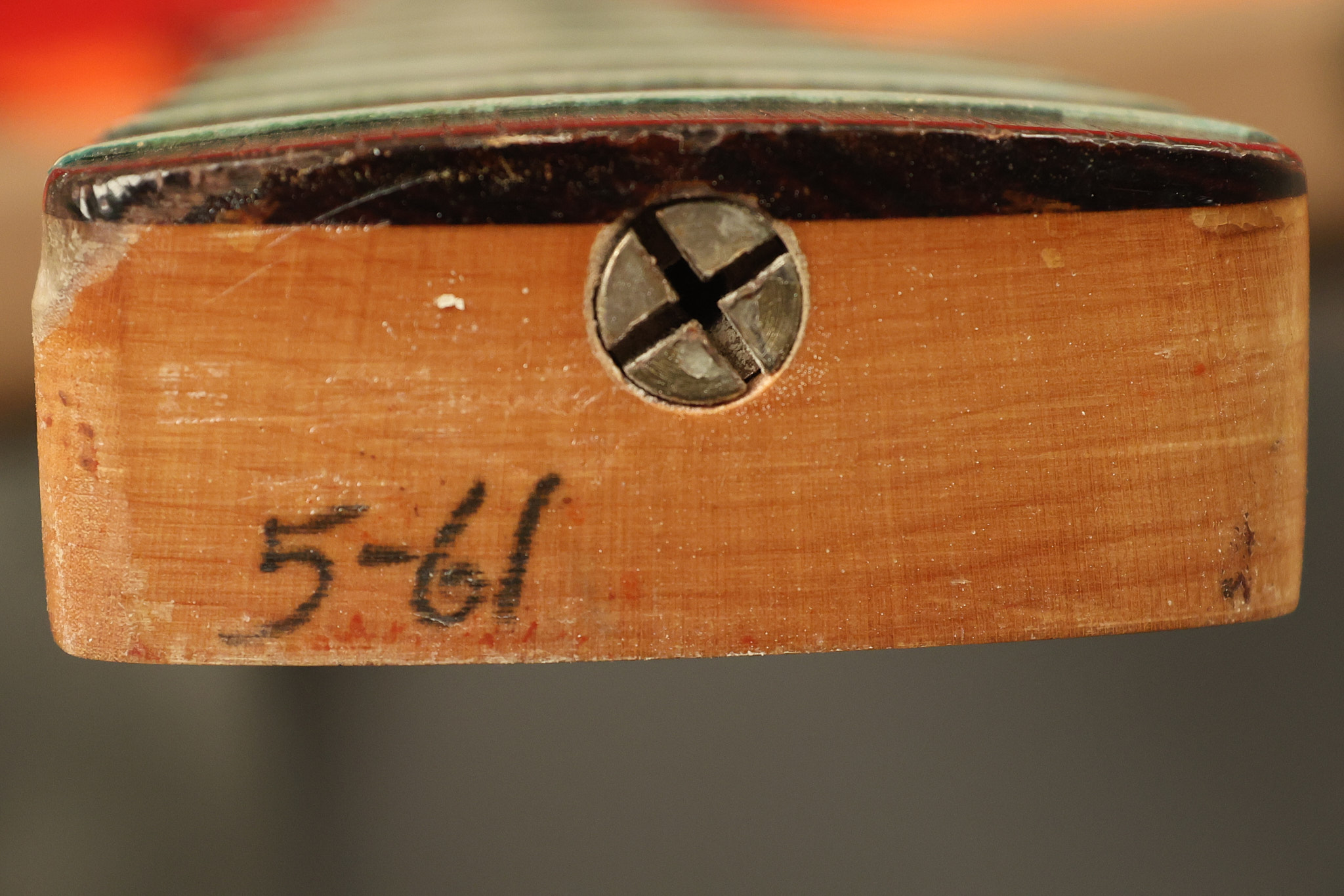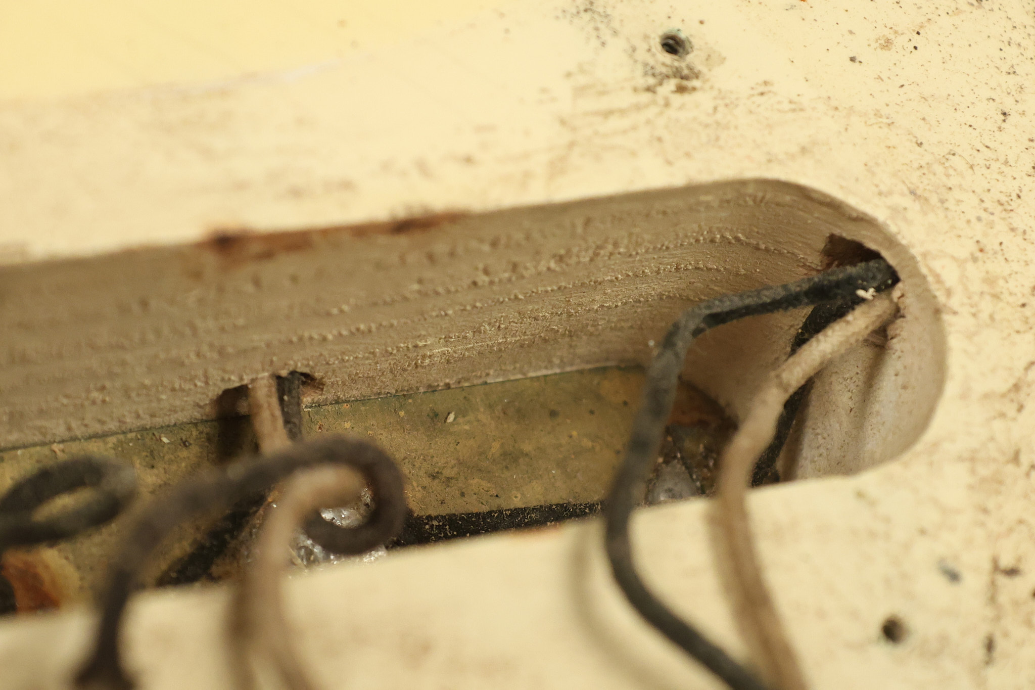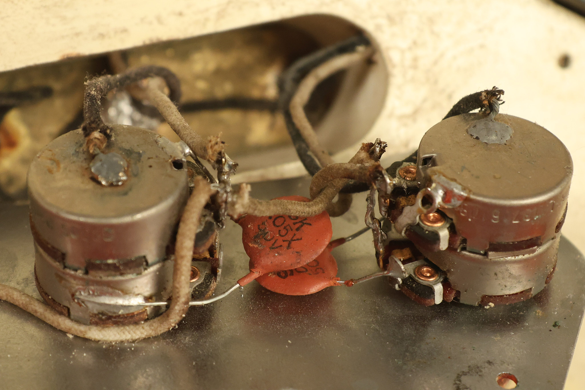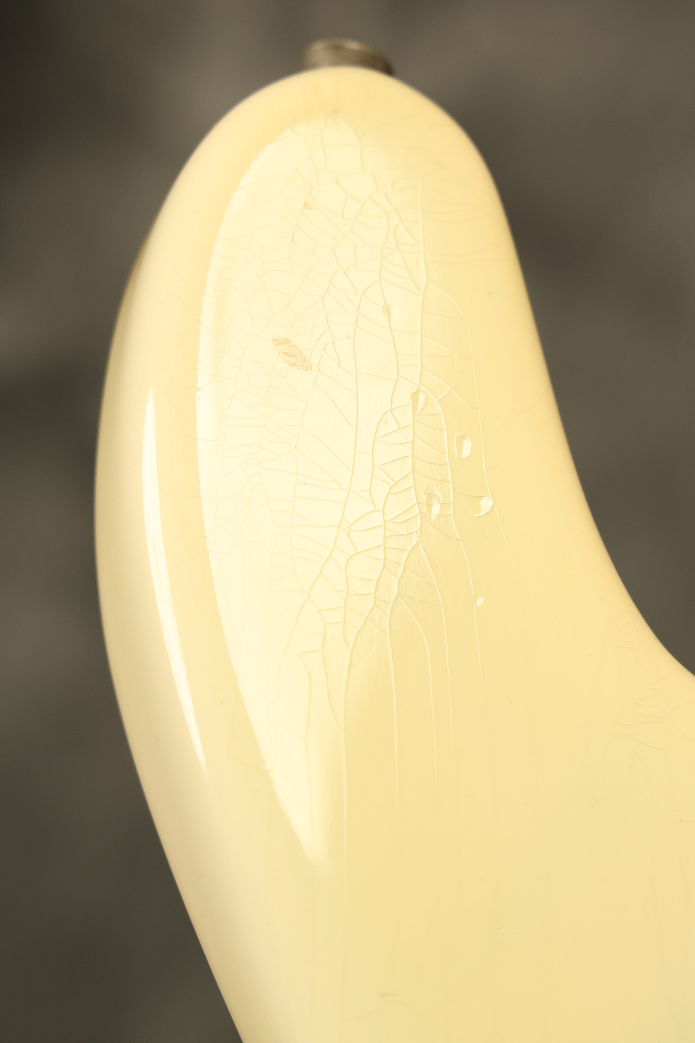 1961 Fender Jazz Bass "Stack Knob" with a body that has been refinished Blonde. Traces of original paint found underneath some parts indicate that it was originally Sunburst. The finish on the neck is original, but at the heel end of the neck the underside portion that is concealed in the neck pocket has been sanded. It has a great playing neck with great frets. Both pickups appear to have been rewound. All other parts appear to be original with the exception of one washer for one tuning key, one washer for one of the mutes and 3 of the 4 screws for the chrome covers. The original mutes are included along with the original Brown hardshell case. There are two areas on the back of the body where the finish was chipped/buffed out over the two factory dowels. There are nicks + dings, finish checking and other cosmetic wear including two faint rings in the finish of the back of the body. All electronics work and sound great, but the two original resistors have been removed. The weight is 8 lbs. 9 oz. without the covers.