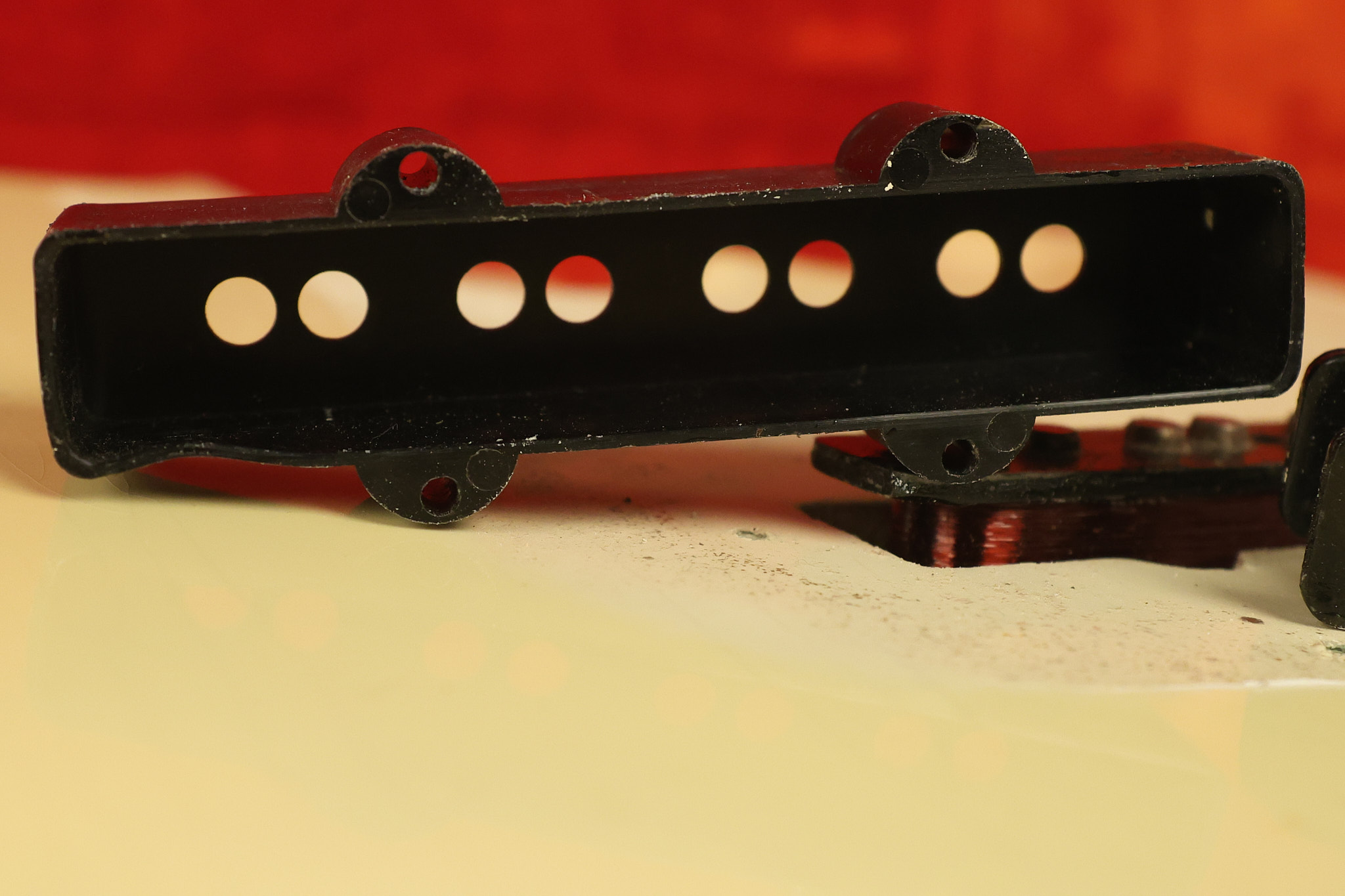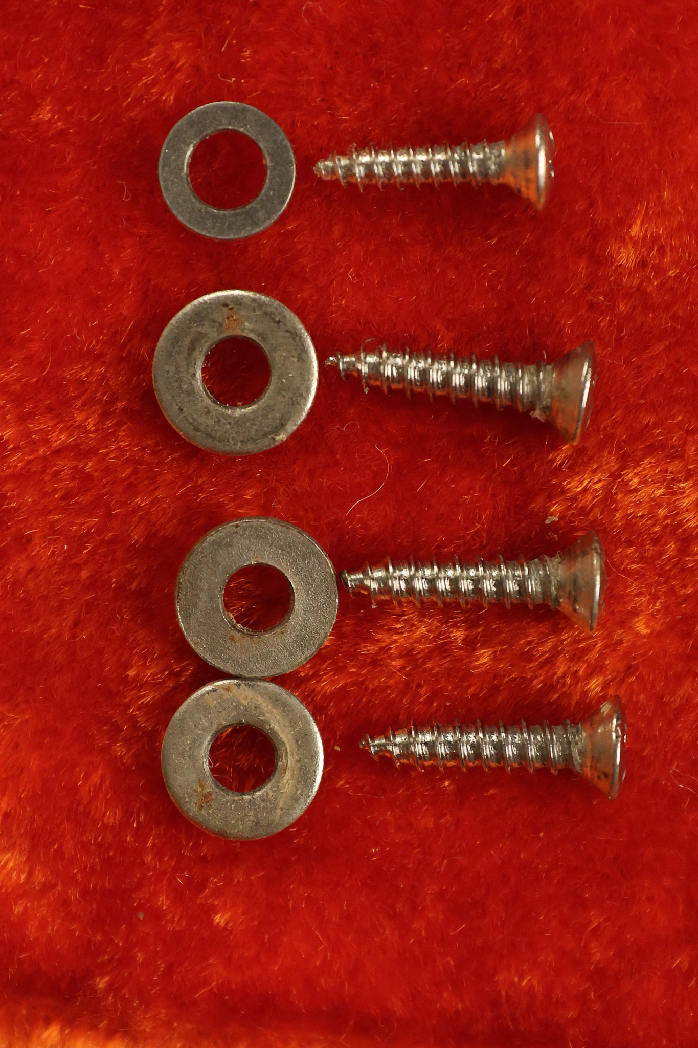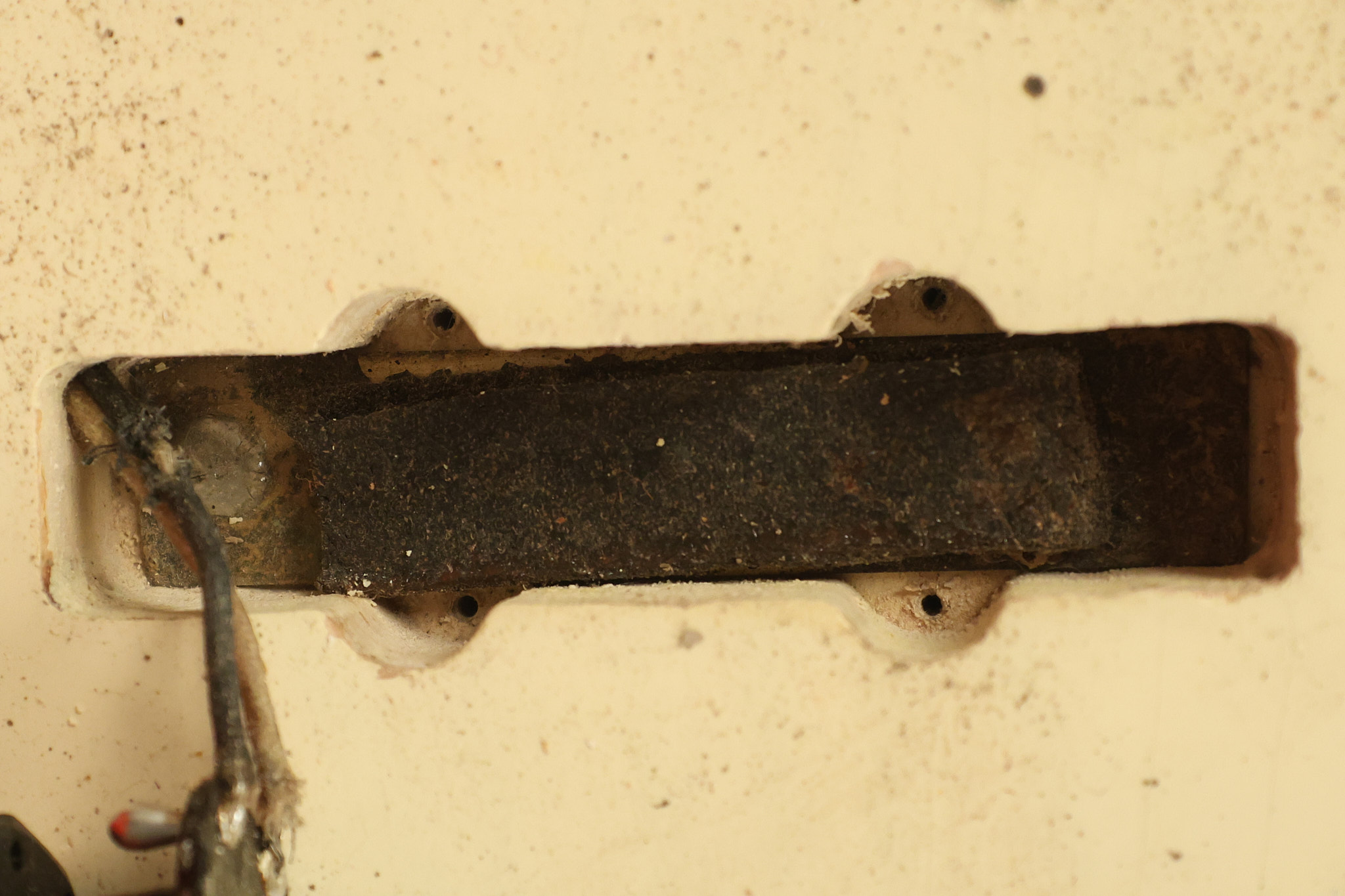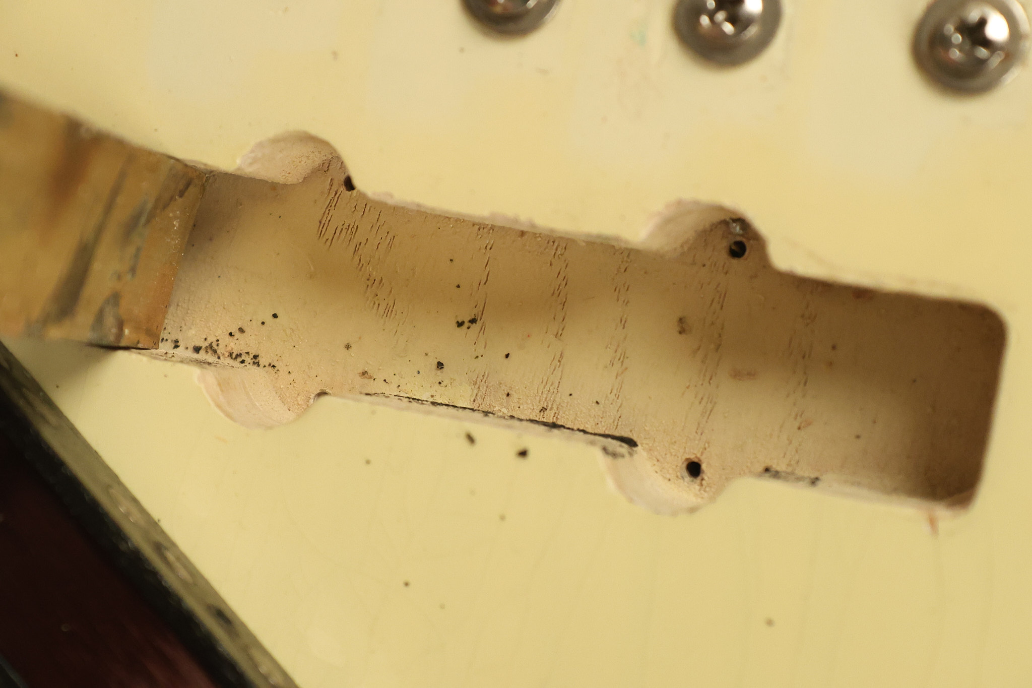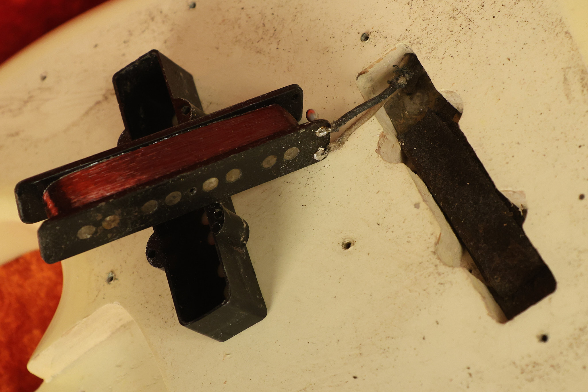 1961 Fender Jazz Bass "Stack Knob" with a body that has been refinished Blonde. Traces of original paint found underneath some parts indicate that it was originally Sunburst. The finish on the neck is original, but at the heel end of the neck the underside portion that is concealed in the neck pocket has been sanded. It has a great playing neck with great frets. Both pickups appear to have been rewound. All other parts appear to be original with the exception of one washer for one tuning key, one washer for one of the mutes and 3 of the 4 screws for the chrome covers. The original mutes are included along with the original Brown hardshell case. There are two areas on the back of the body where the finish was chipped/buffed out over the two factory dowels. There are nicks + dings, finish checking and other cosmetic wear including two faint rings in the finish of the back of the body. All electronics work and sound great, but the two original resistors have been removed. The weight is 8 lbs. 9 oz. without the covers.