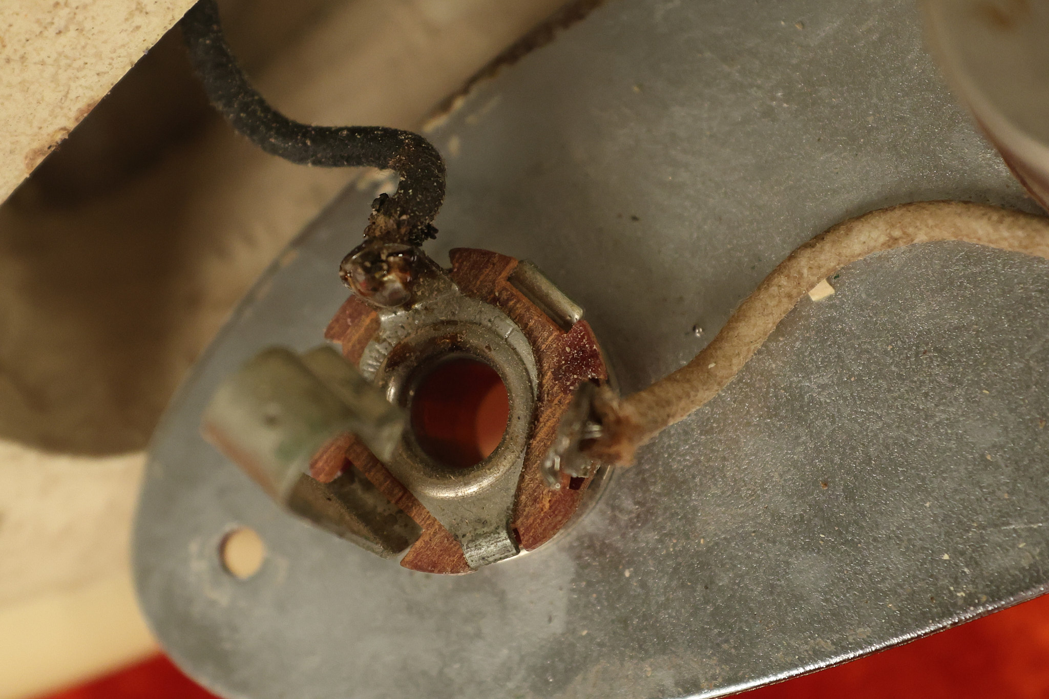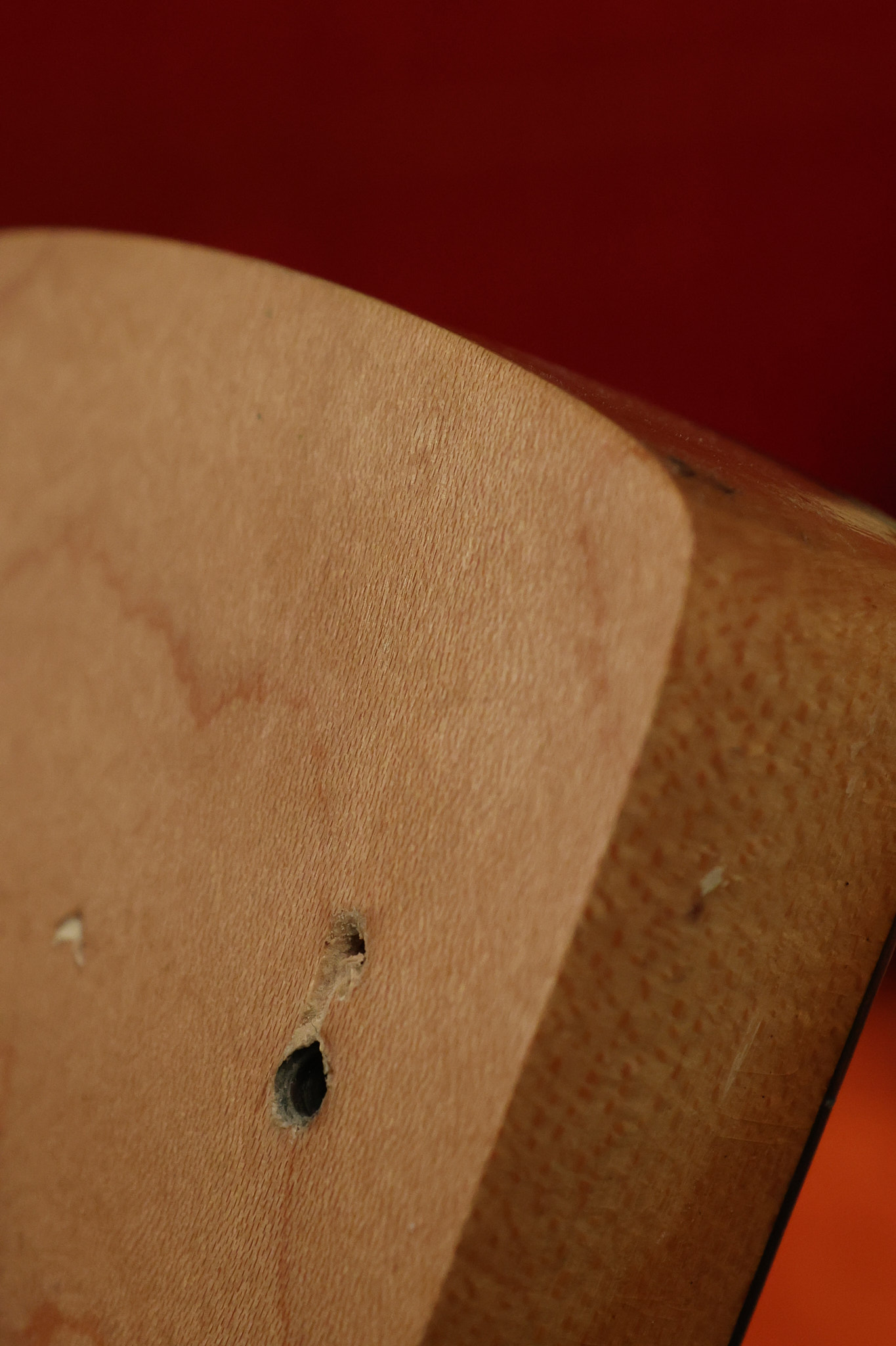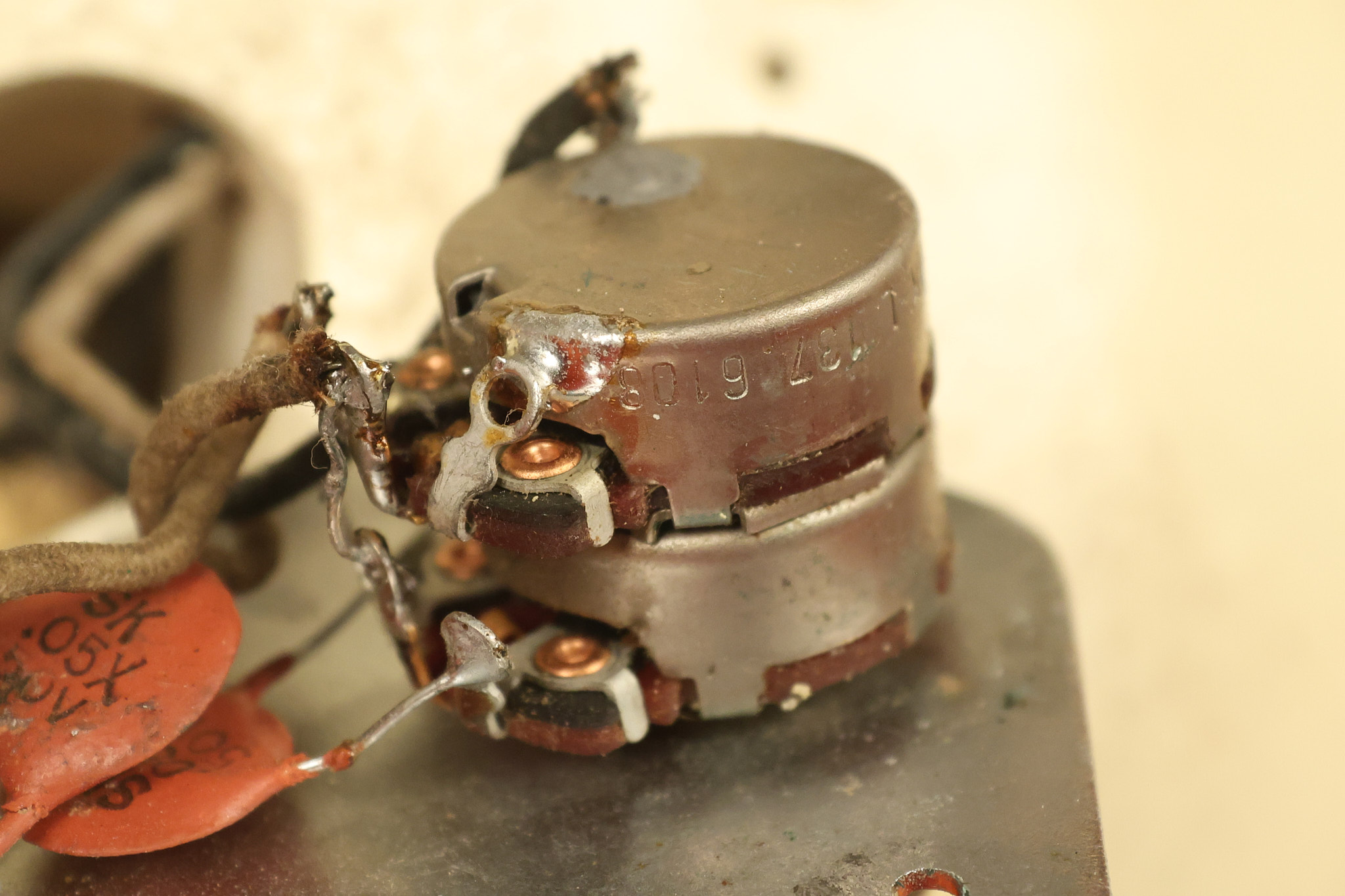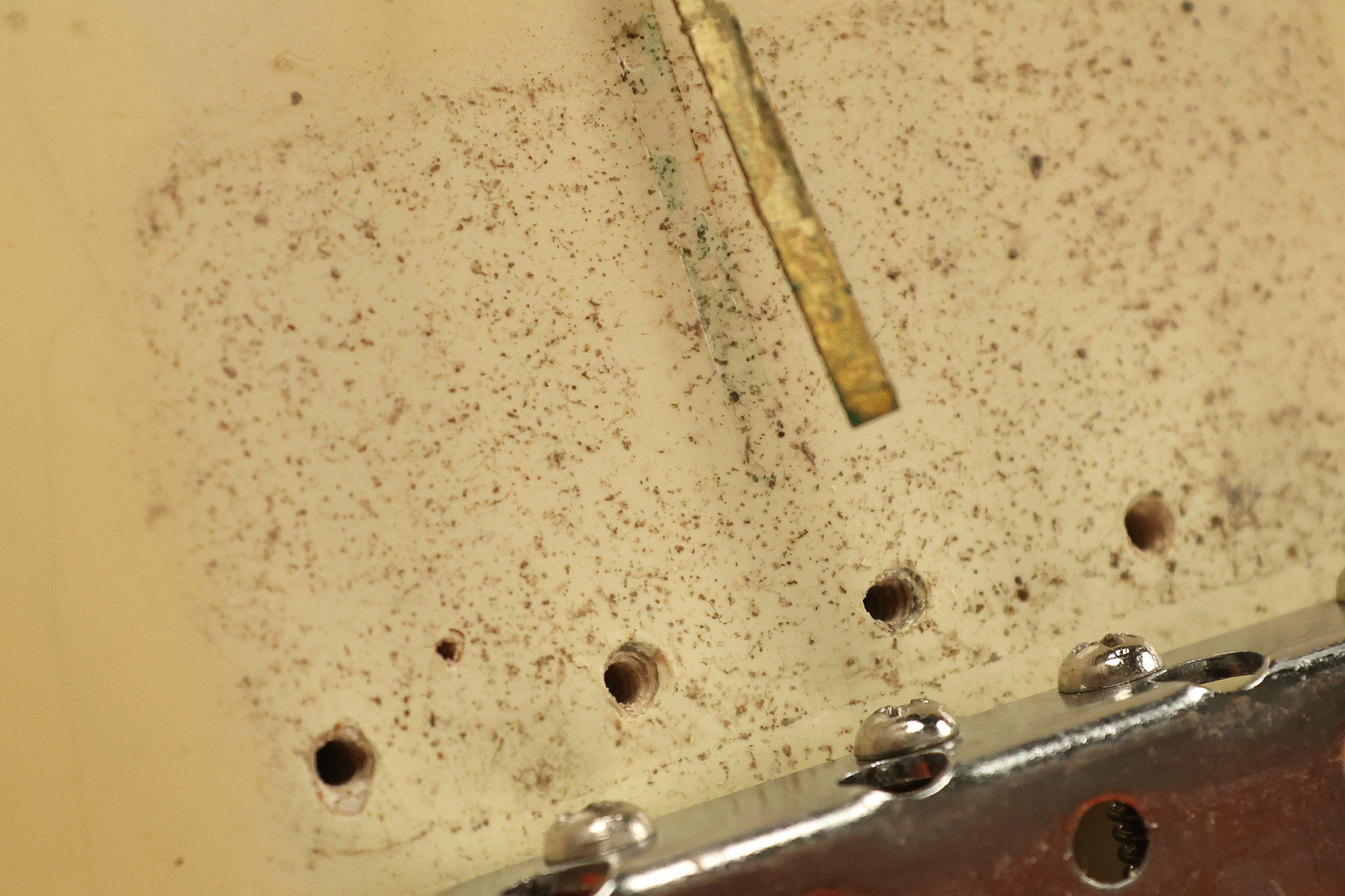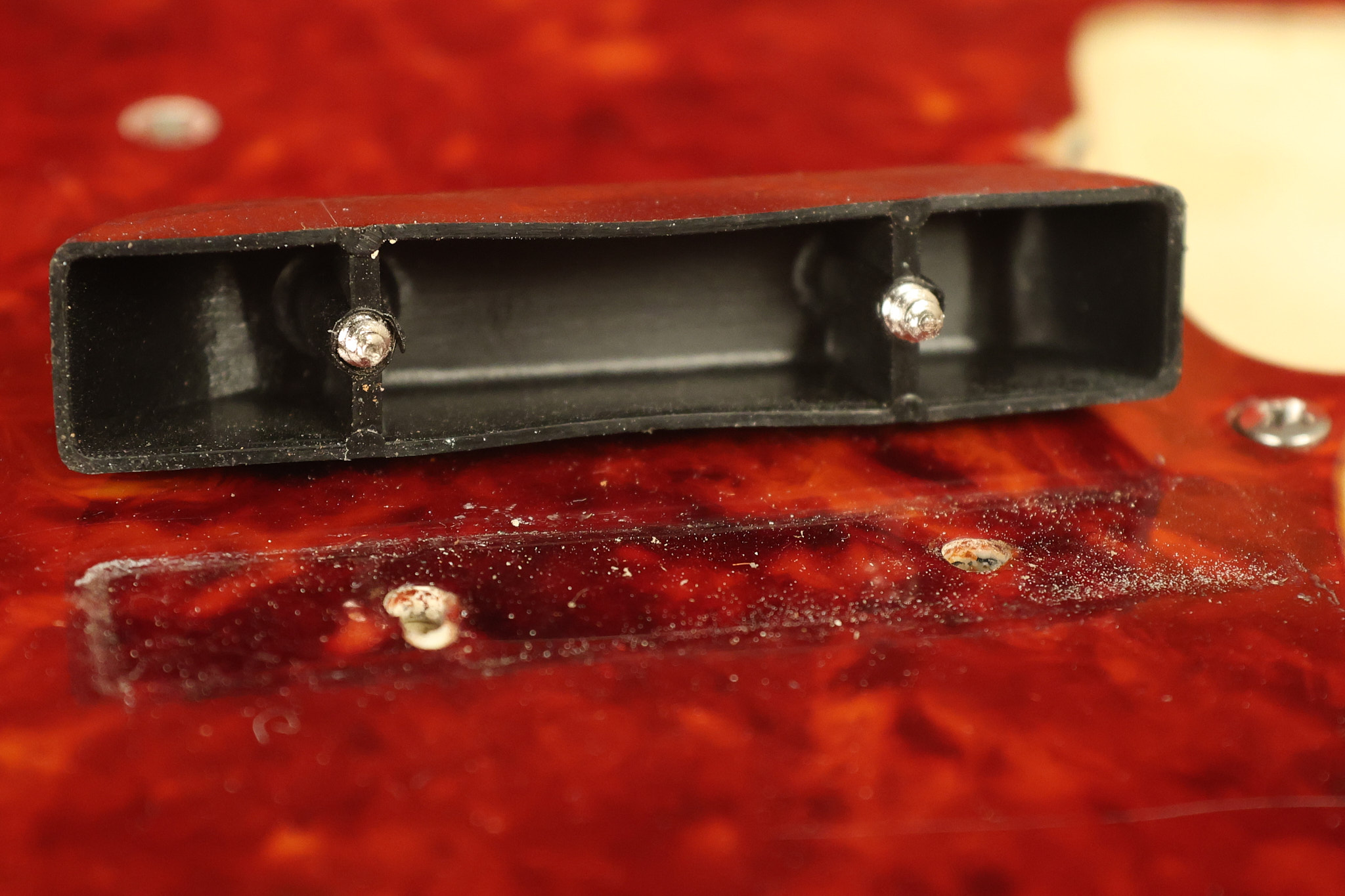 1961 Fender Jazz Bass "Stack Knob" with a body that has been refinished Blonde. Traces of original paint found underneath some parts indicate that it was originally Sunburst. The finish on the neck is original, but at the heel end of the neck the underside portion that is concealed in the neck pocket has been sanded. It has a great playing neck with great frets. Both pickups appear to have been rewound. All other parts appear to be original with the exception of one washer for one tuning key, one washer for one of the mutes and 3 of the 4 screws for the chrome covers. The original mutes are included along with the original Brown hardshell case. There are two areas on the back of the body where the finish was chipped/buffed out over the two factory dowels. There are nicks + dings, finish checking and other cosmetic wear including two faint rings in the finish of the back of the body. All electronics work and sound great, but the two original resistors have been removed. The weight is 8 lbs. 9 oz. without the covers.