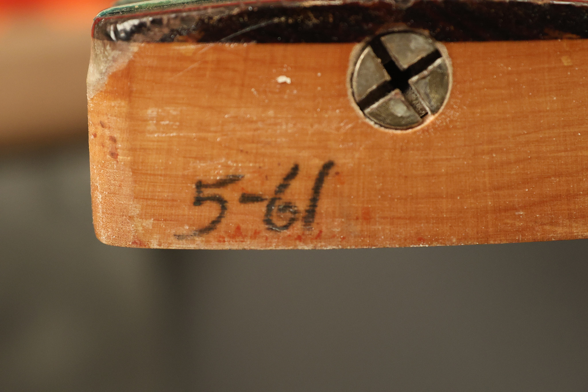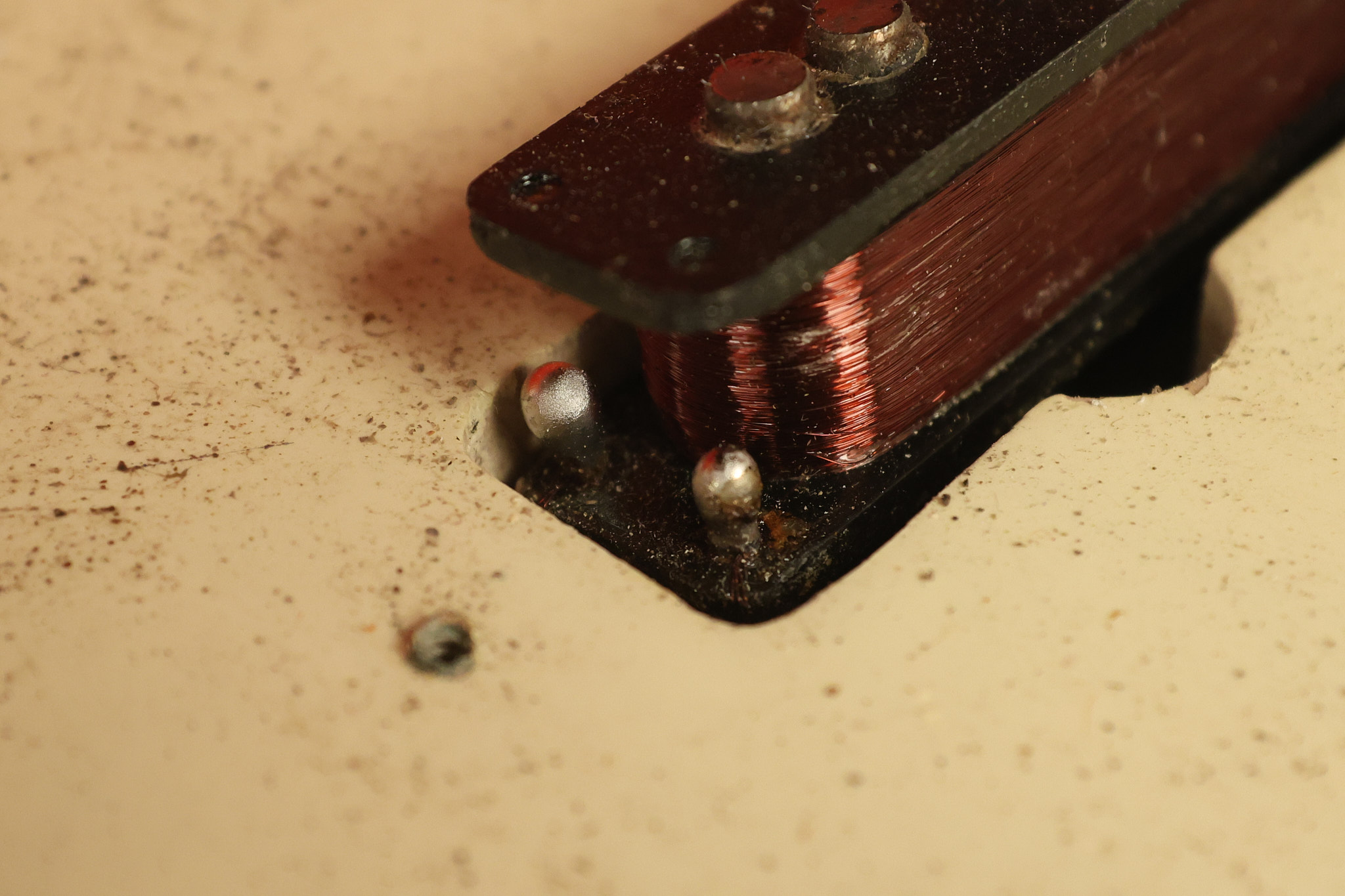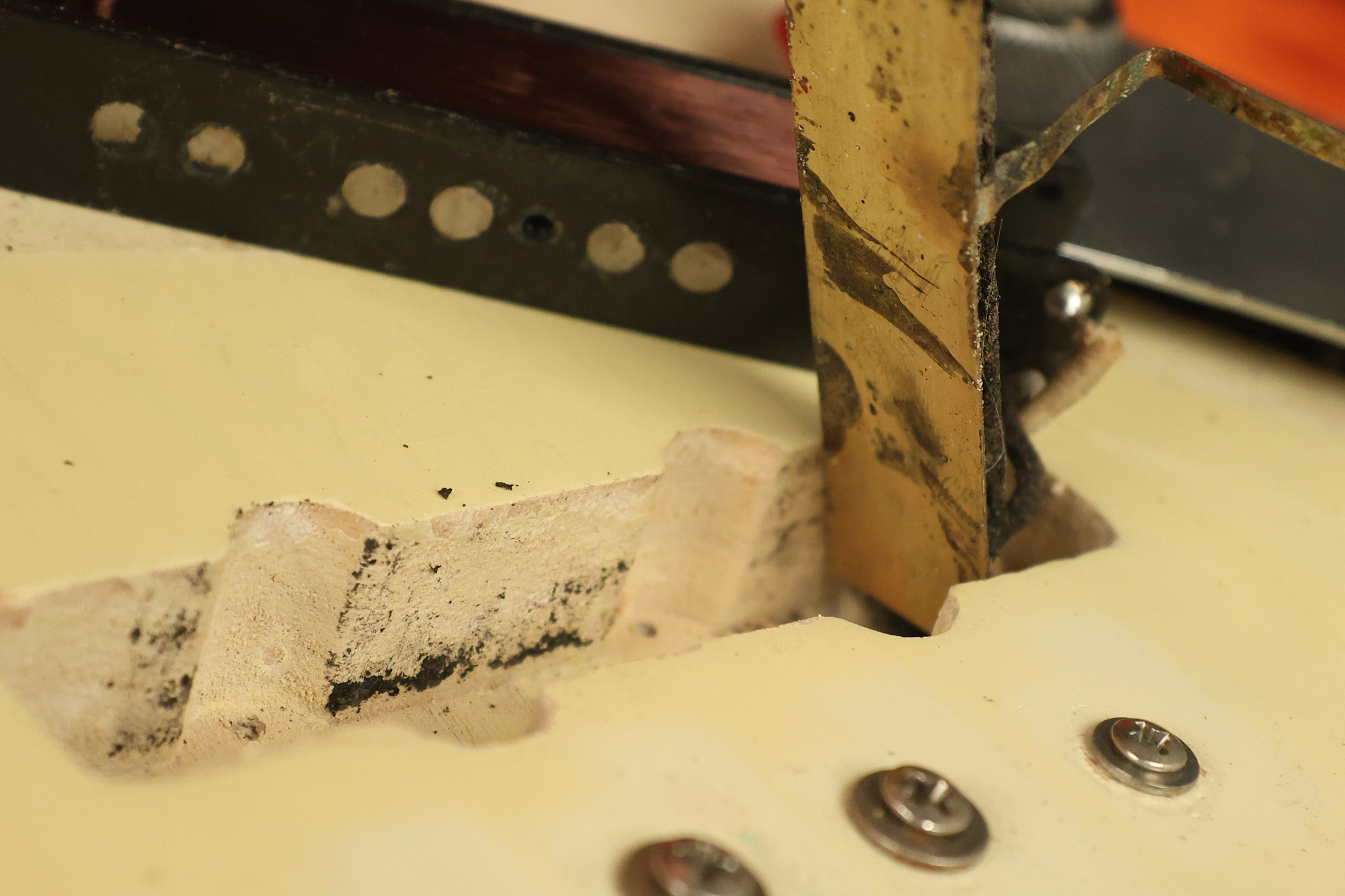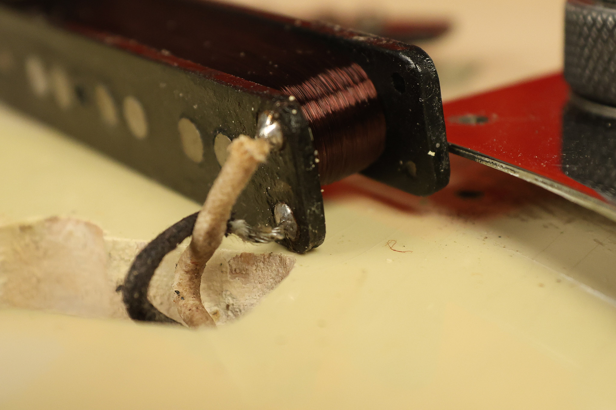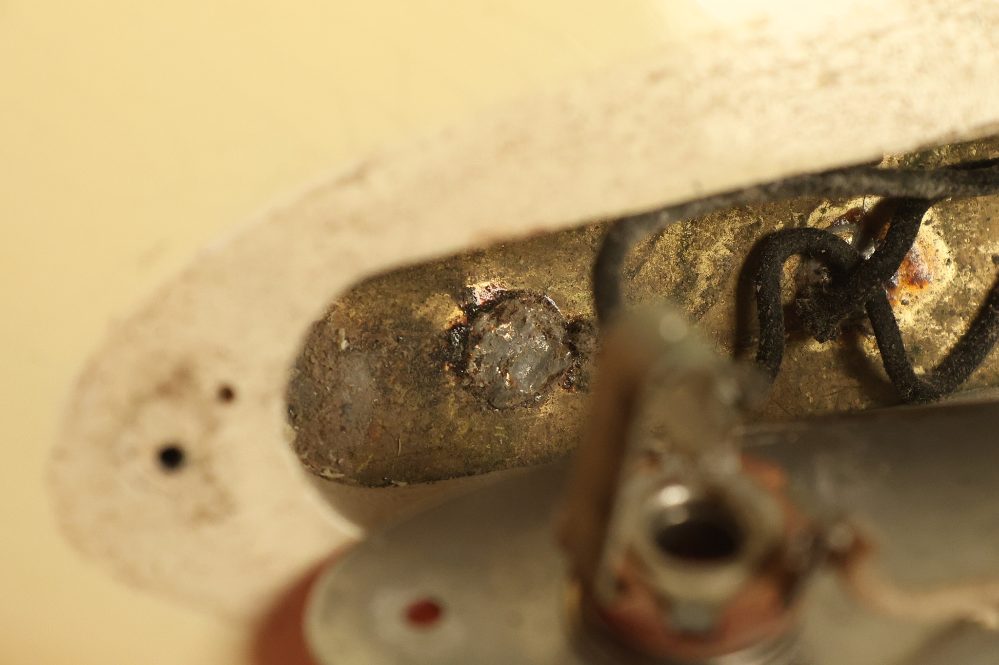 1961 Fender Jazz Bass "Stack Knob" with a body that has been refinished Blonde. Traces of original paint found underneath some parts indicate that it was originally Sunburst. The finish on the neck is original, but at the heel end of the neck the underside portion that is concealed in the neck pocket has been sanded. It has a great playing neck with great frets. Both pickups appear to have been rewound. All other parts appear to be original with the exception of one washer for one tuning key, one washer for one of the mutes and 3 of the 4 screws for the chrome covers. The original mutes are included along with the original Brown hardshell case. There are two areas on the back of the body where the finish was chipped/buffed out over the two factory dowels. There are nicks + dings, finish checking and other cosmetic wear including two faint rings in the finish of the back of the body. All electronics work and sound great, but the two original resistors have been removed. The weight is 8 lbs. 9 oz. without the covers.