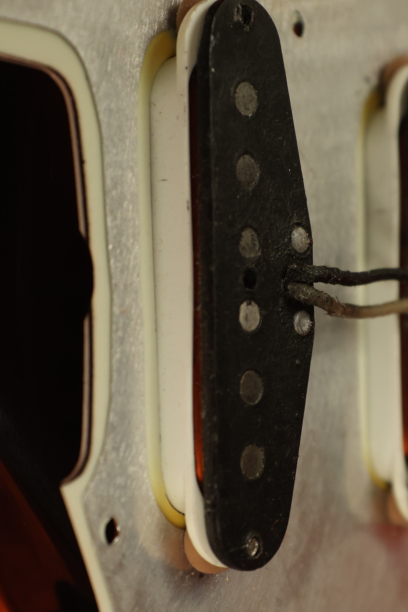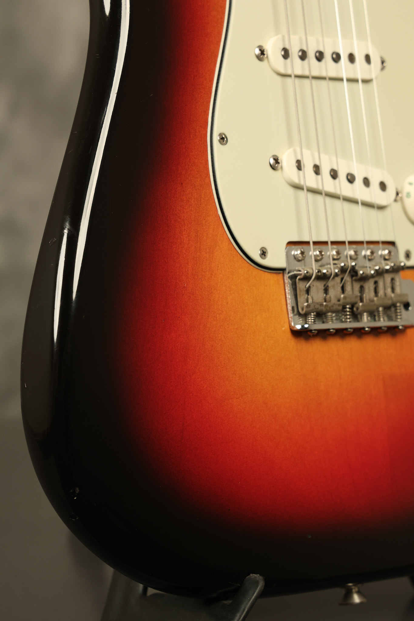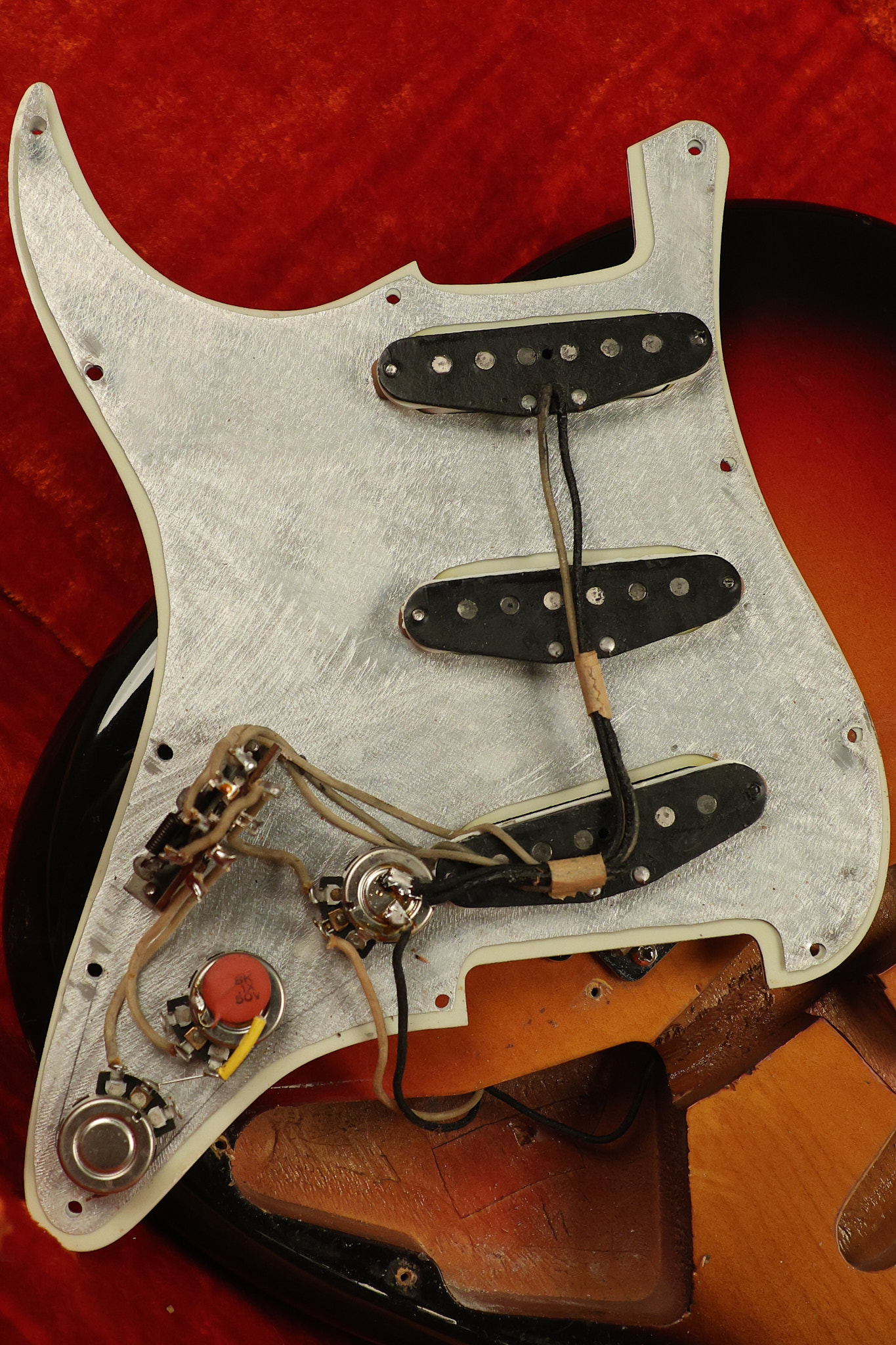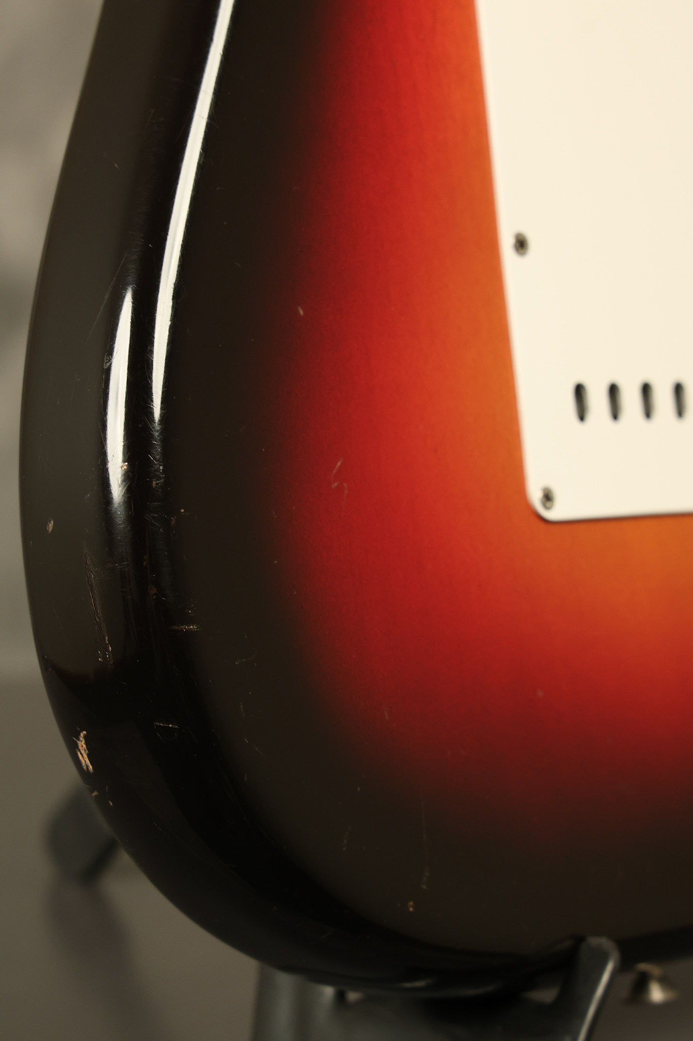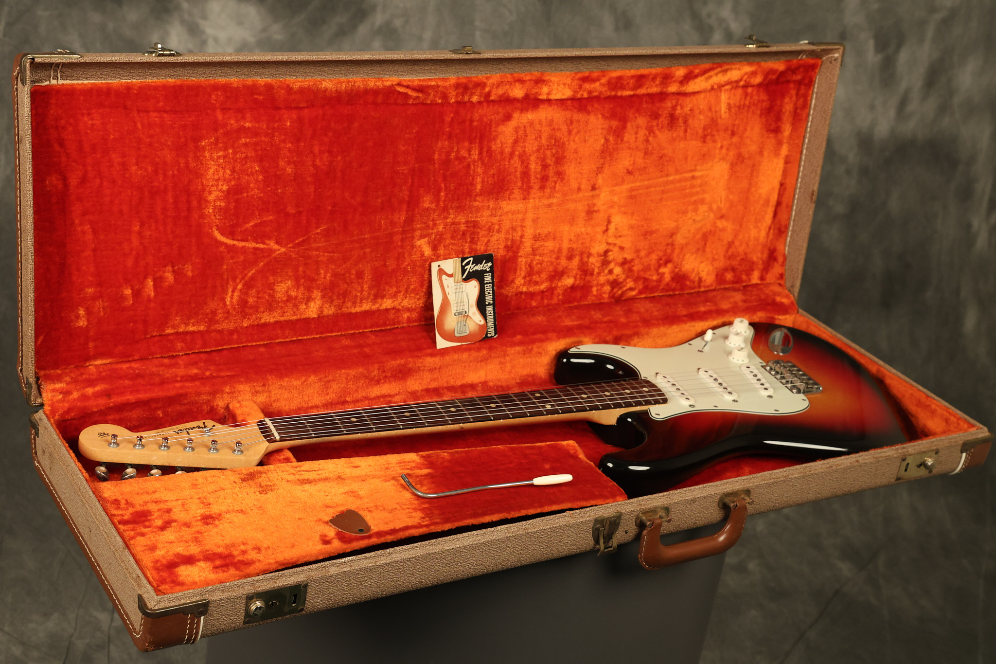 1961 Fender Stratocaster in its original Sunburst finish which has really maintained its original brilliance in color. It has a great playing neck with great frets. It's all original and 100% complete along with its original tremolo arm, original hardshell case and original HANG TAG with the matching serial number and original allen wrench still taped to the inside. It's in EXCELLENT condition with nicks + dings and other cosmetic wear. Everything remains structurally sound with no cracks, breaks or repairs. All electronics work and sound great while all solder joints remain original and untampered with. The weight is 7 lbs. 12.8 oz.