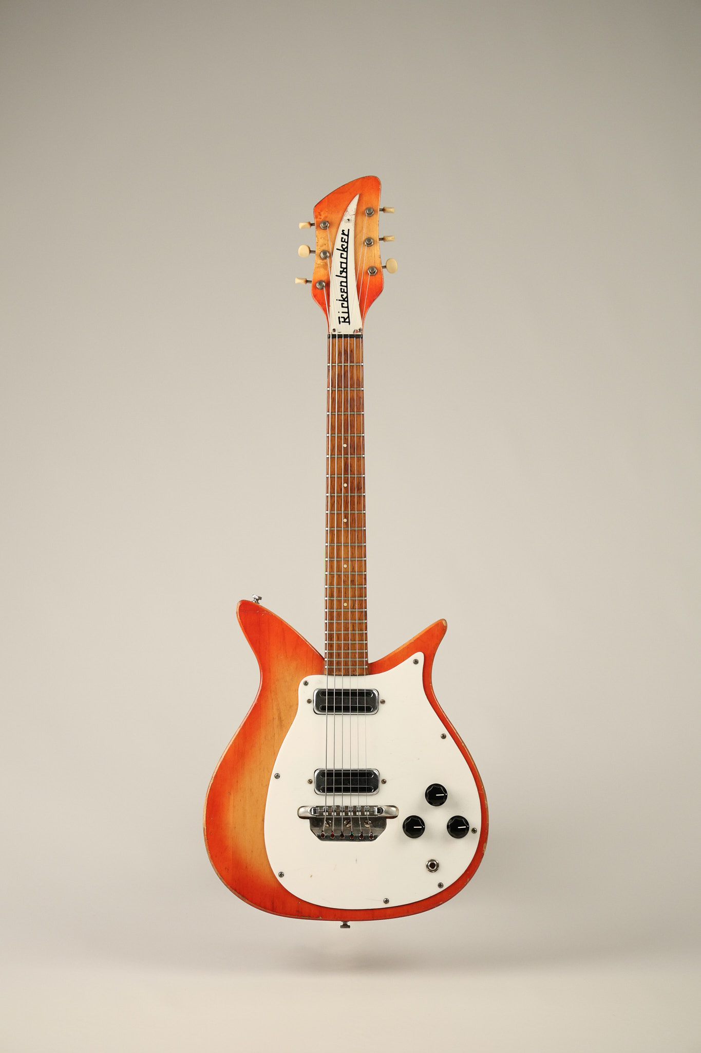 1963 Rickenbacker model 950 3/4 scale in its original Fireglo finish. It has a good playing neck with good frets. Parts that have been changed include the bridge, nut, pickguard screws, 2 tuning key screws, one pot, the capacitor, the jack and some of the wires. The pickups are original along with the 3-way rotary tone switch and a pot that dates to 1960. The original hardshell case is also included. A 3-digit number has been stamped into the back of the headstock. There are lots of nicks + dings, belt buckle wear, play wear and other cosmetic wear including some cracks in the pickguard. The guitar itself remains structurally sound. All electronics work and sound great.