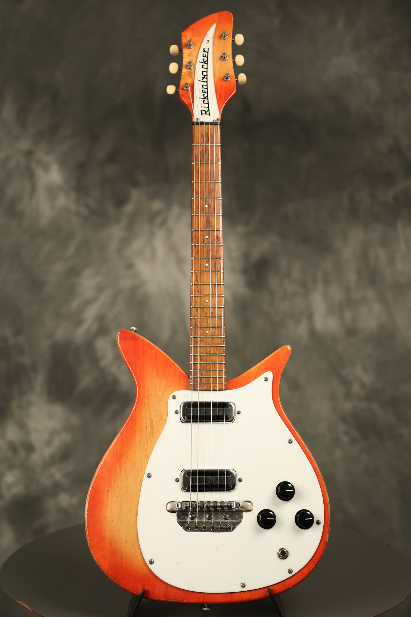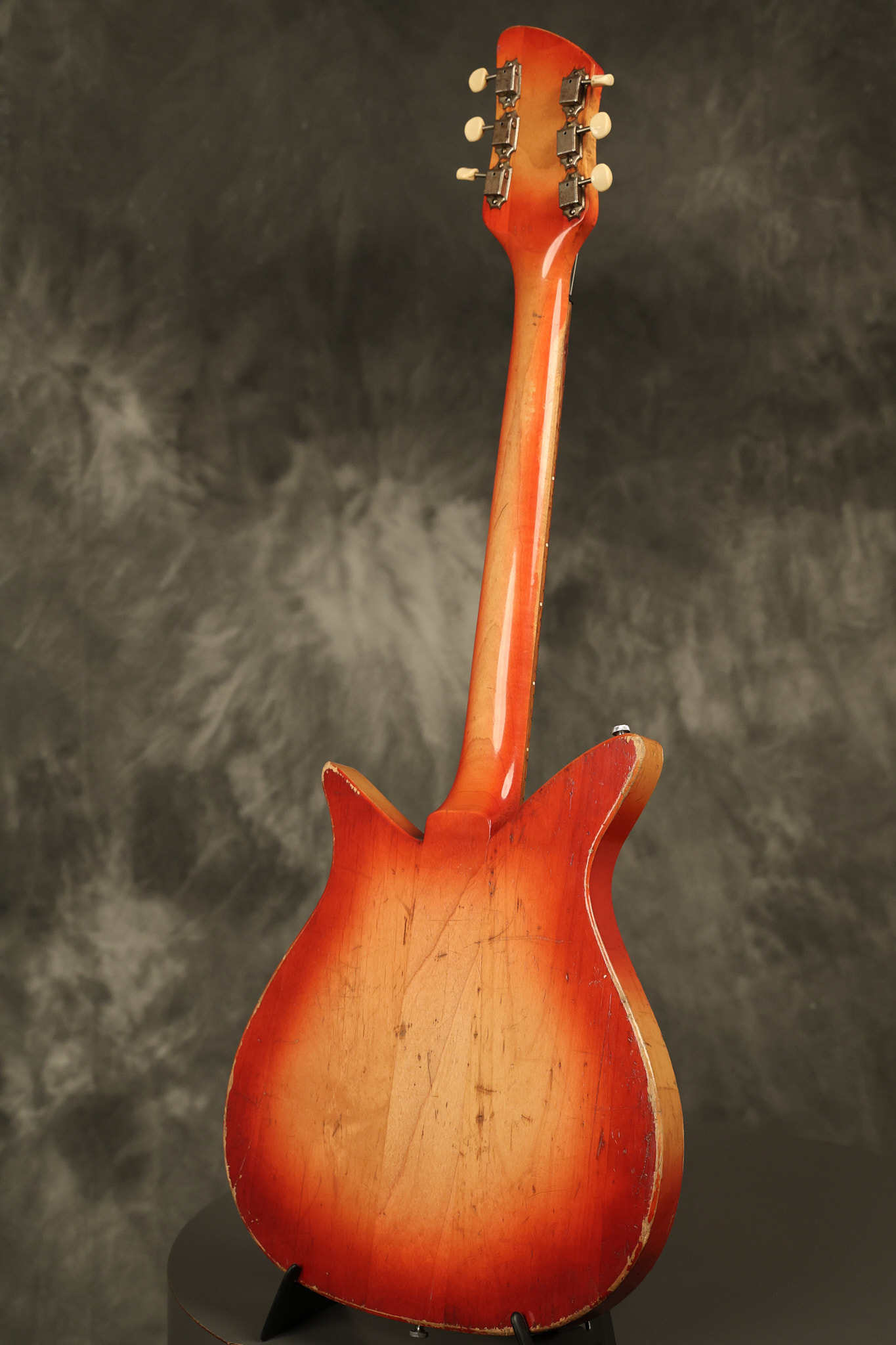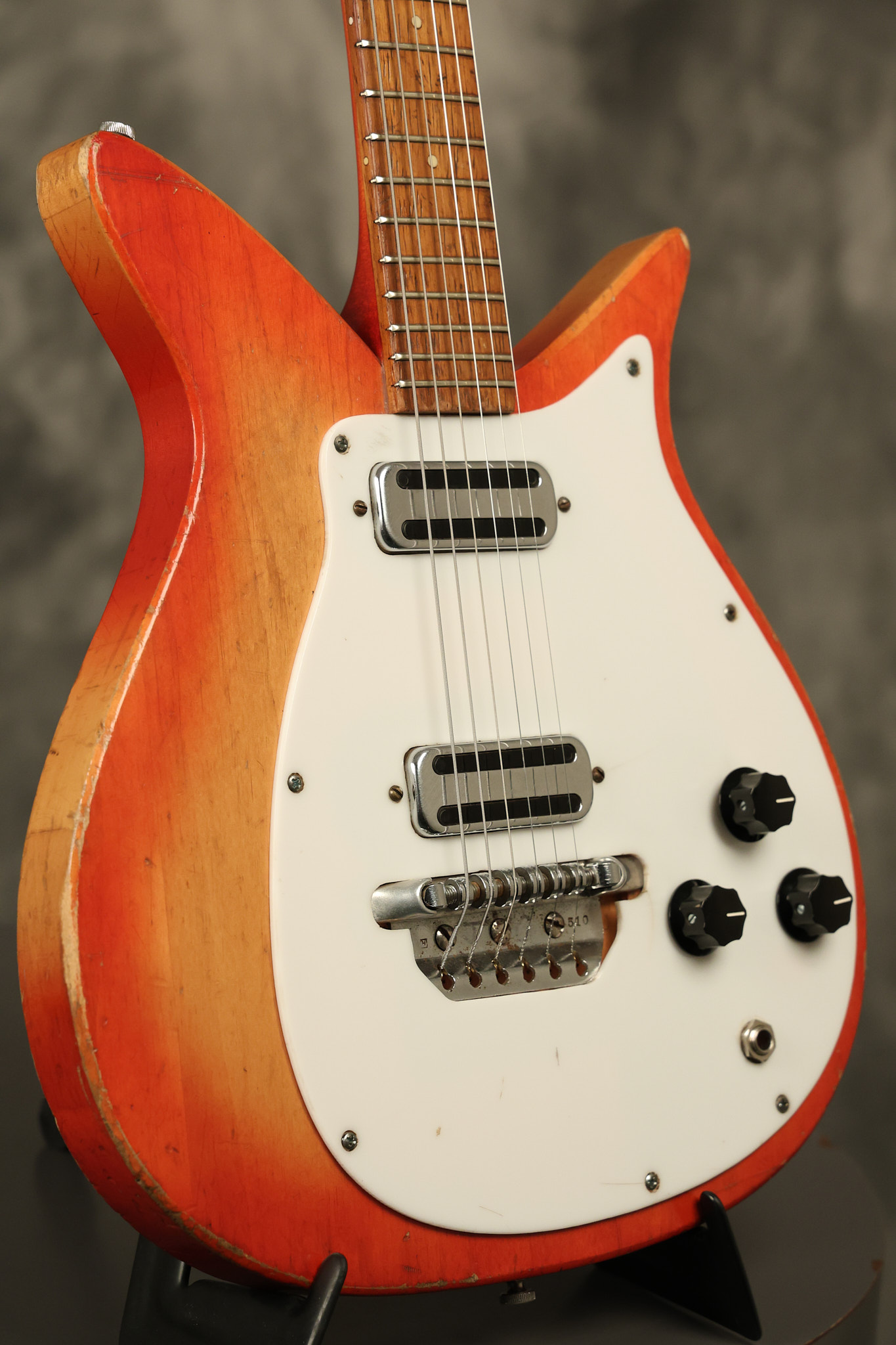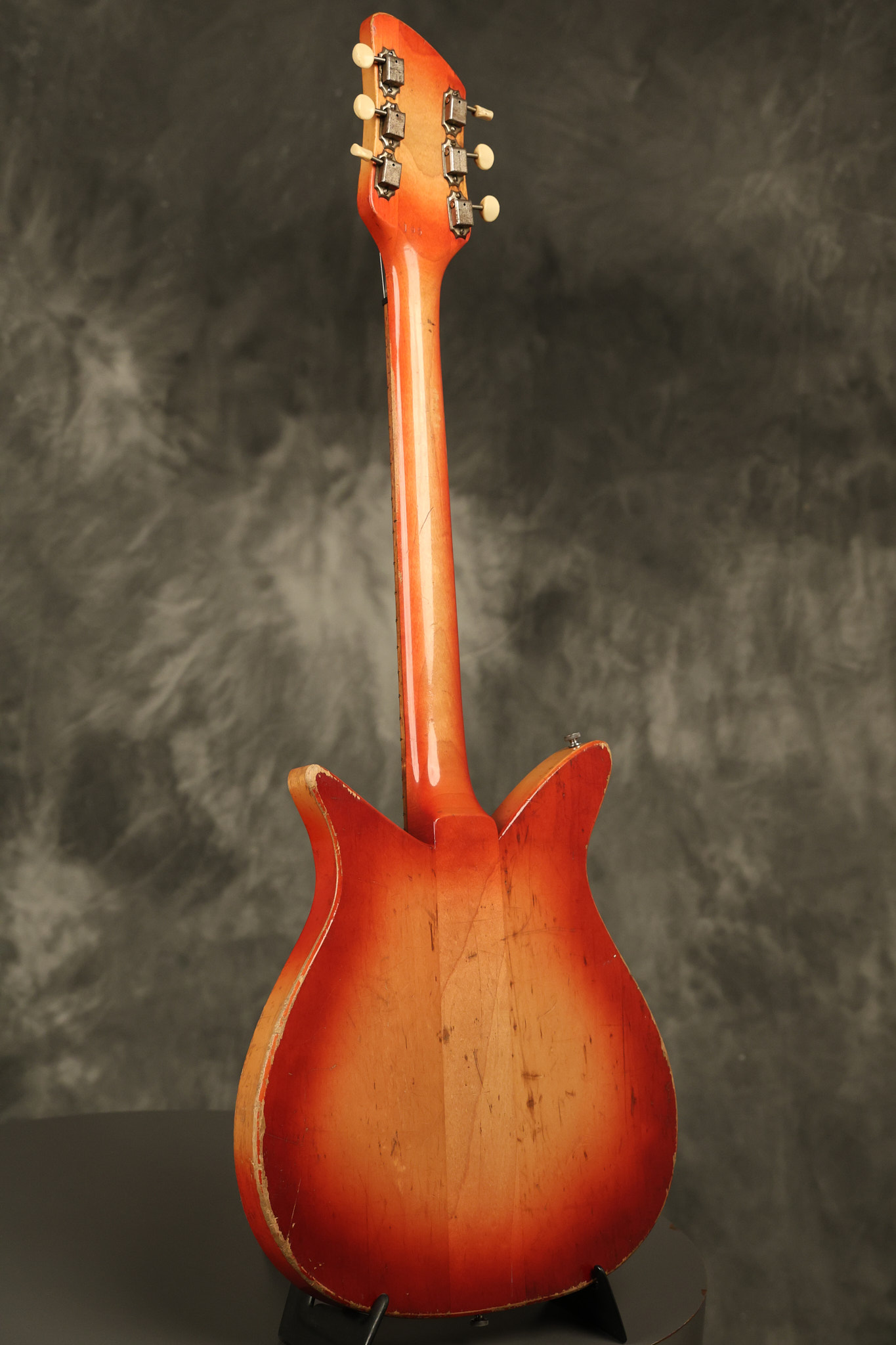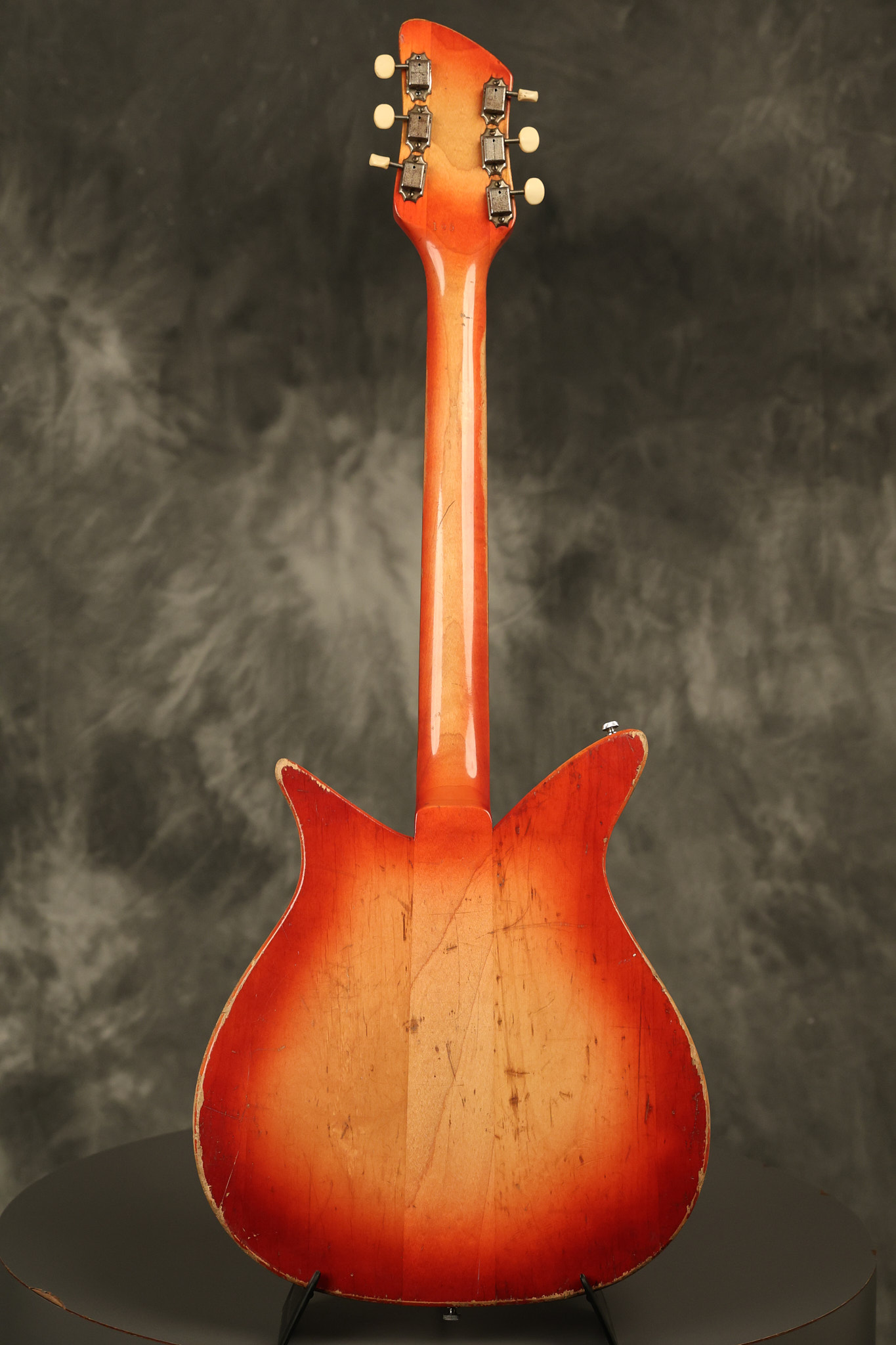 1963 Rickenbacker model 950 3/4 scale in its original Fireglo finish. It has a good playing neck with good frets. Parts that have been changed include the bridge, nut, pickguard screws, 2 tuning key screws, one pot, the capacitor, the jack and some of the wires. The pickups are original along with the 3-way rotary tone switch and a pot that dates to 1960. The original hardshell case is also included. A 3-digit number has been stamped into the back of the headstock. There are lots of nicks + dings, belt buckle wear, play wear and other cosmetic wear including some cracks in the pickguard. The guitar itself remains structurally sound. All electronics work and sound great.