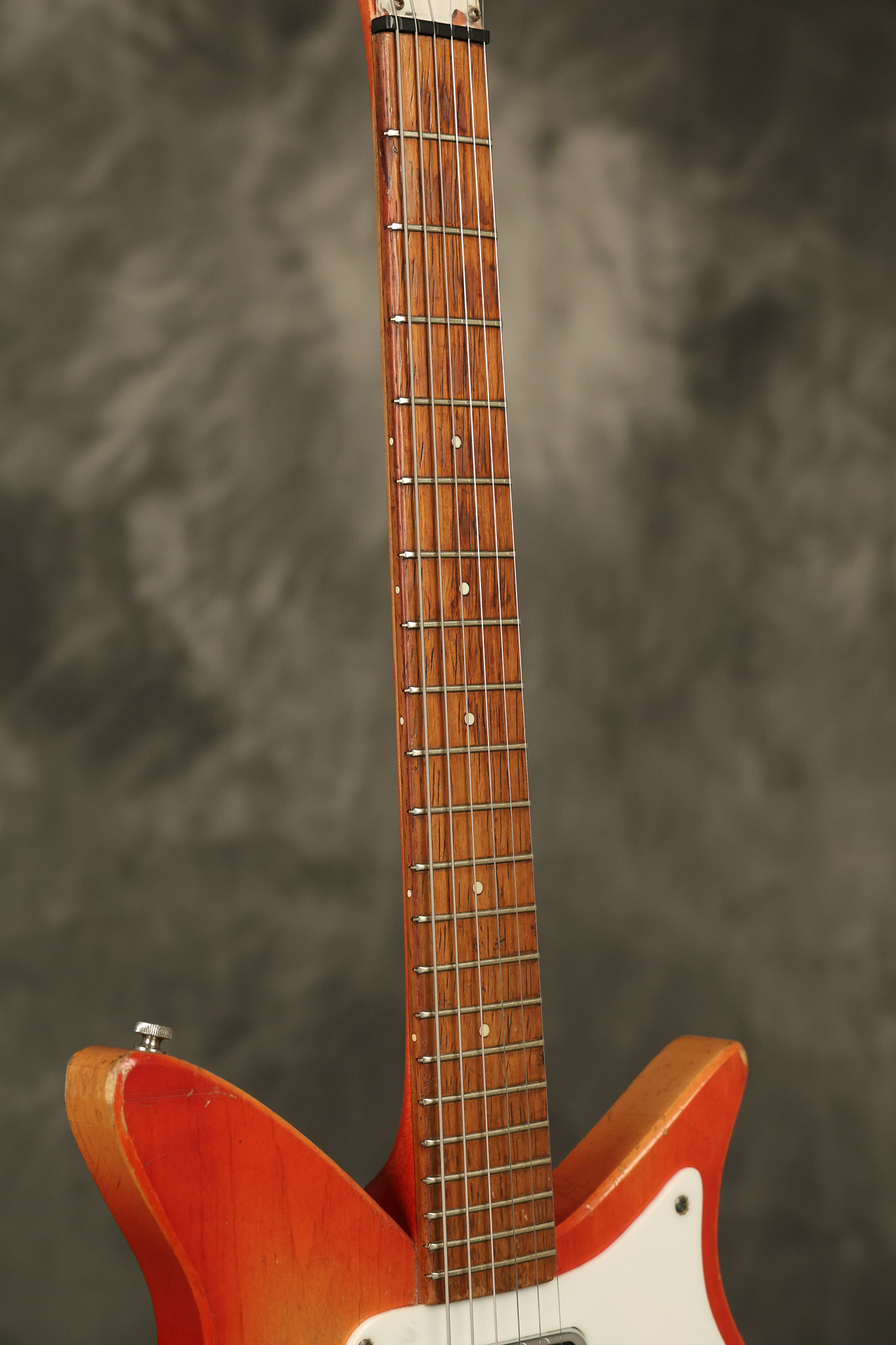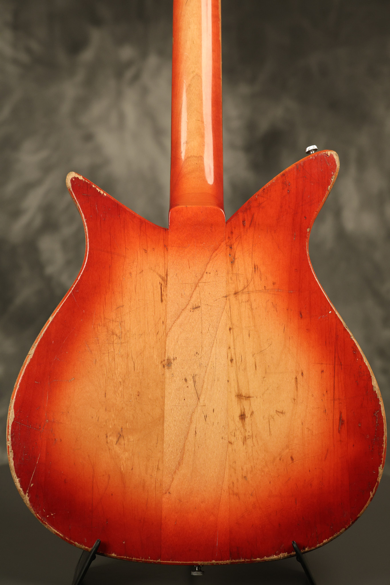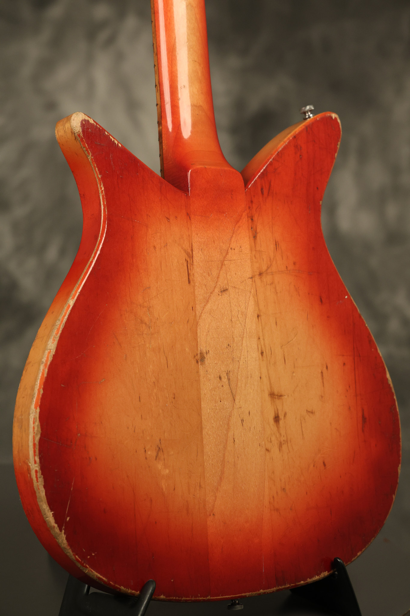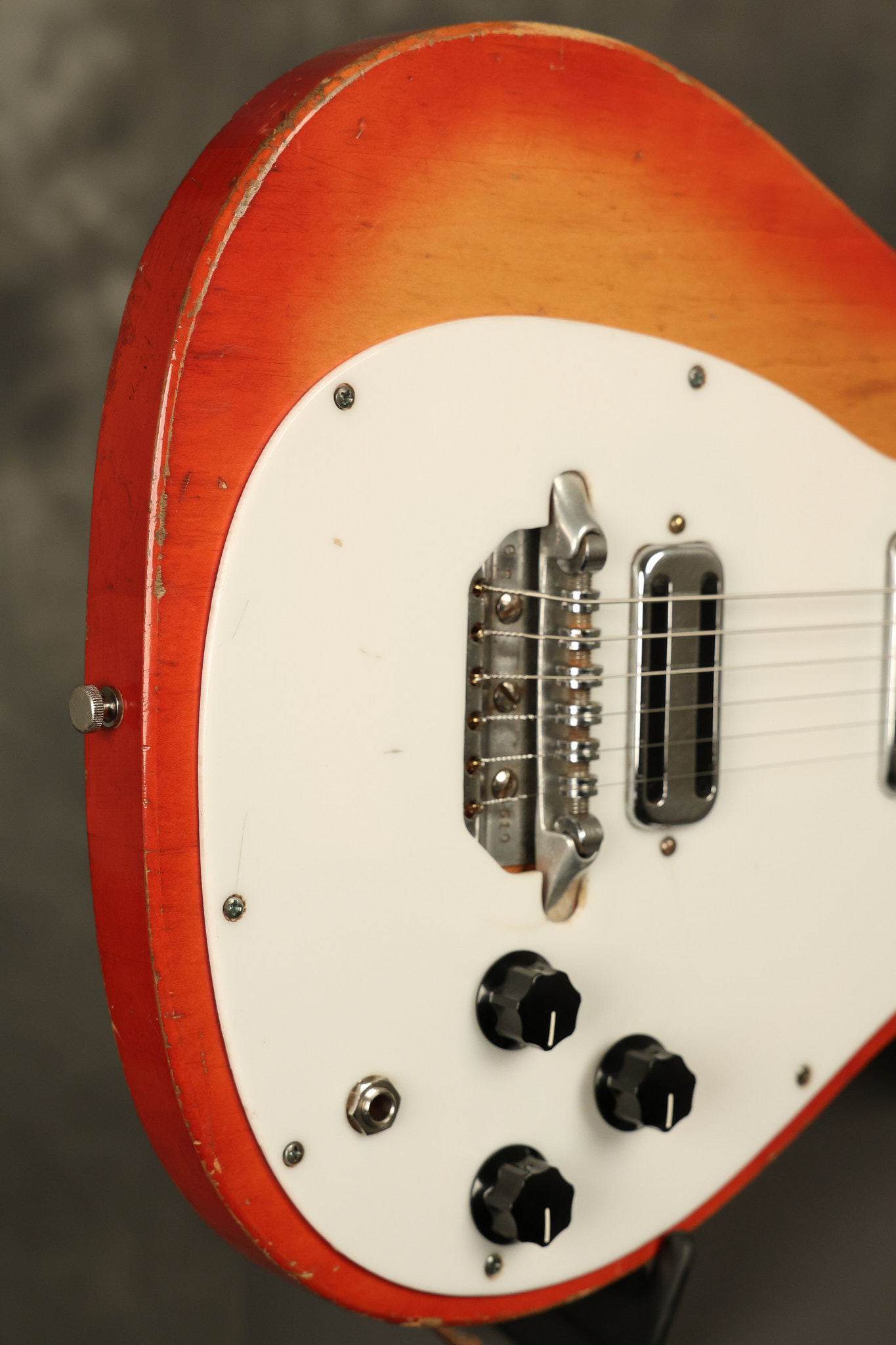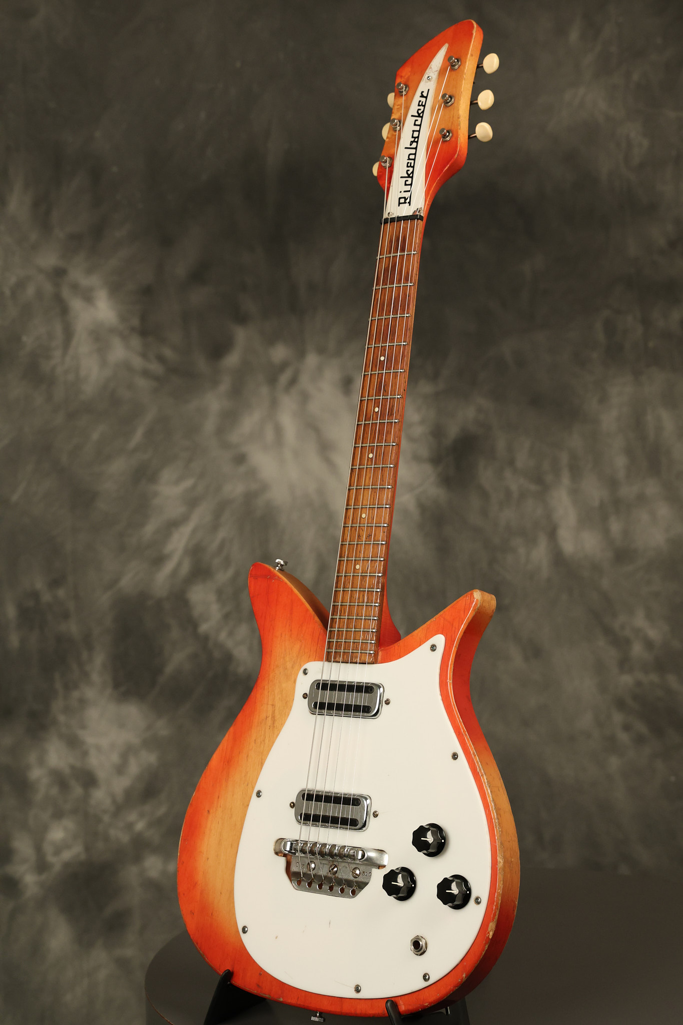 1963 Rickenbacker model 950 3/4 scale in its original Fireglo finish. It has a good playing neck with good frets. Parts that have been changed include the bridge, nut, pickguard screws, 2 tuning key screws, one pot, the capacitor, the jack and some of the wires. The pickups are original along with the 3-way rotary tone switch and a pot that dates to 1960. The original hardshell case is also included. A 3-digit number has been stamped into the back of the headstock. There are lots of nicks + dings, belt buckle wear, play wear and other cosmetic wear including some cracks in the pickguard. The guitar itself remains structurally sound. All electronics work and sound great.