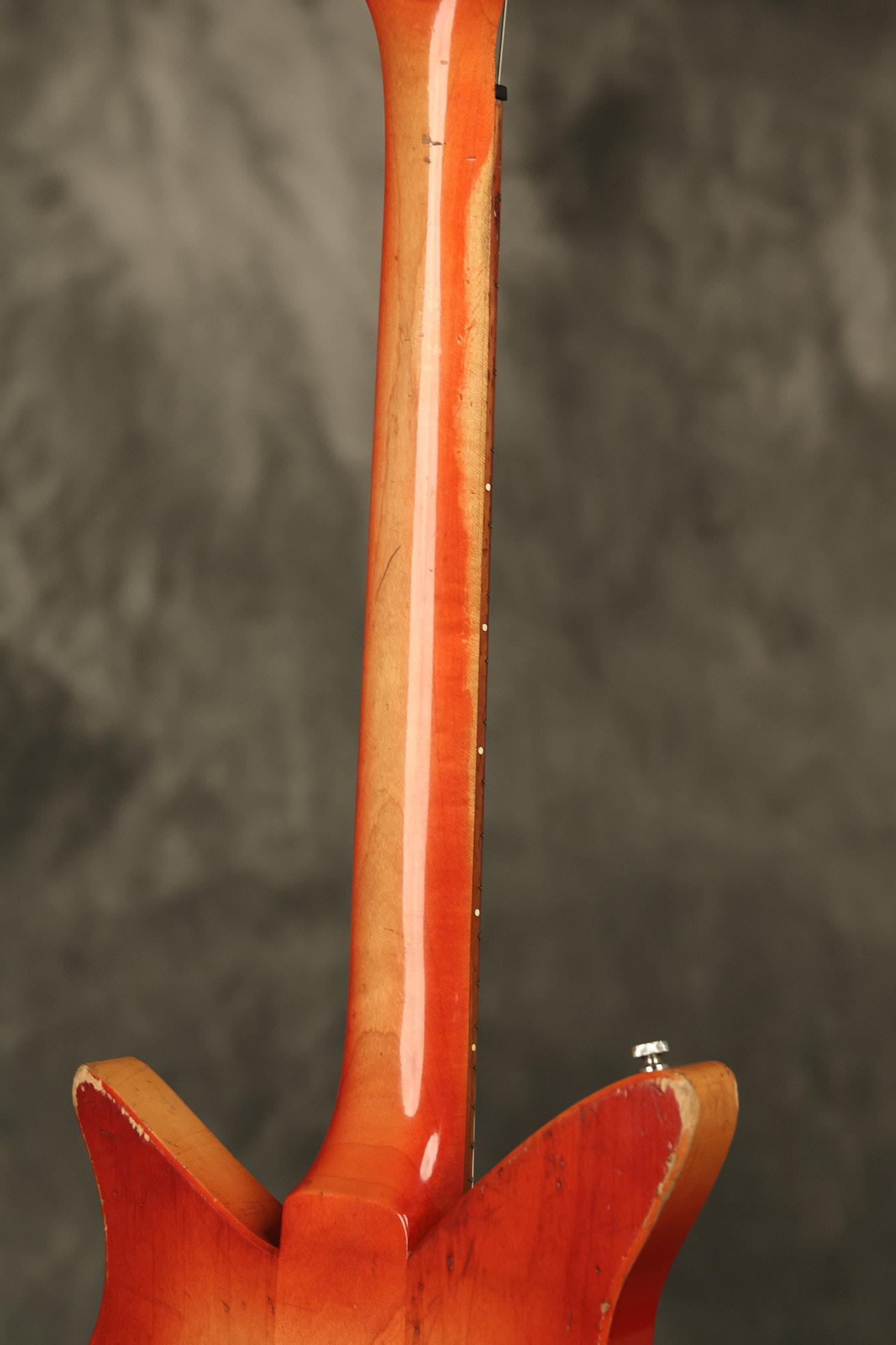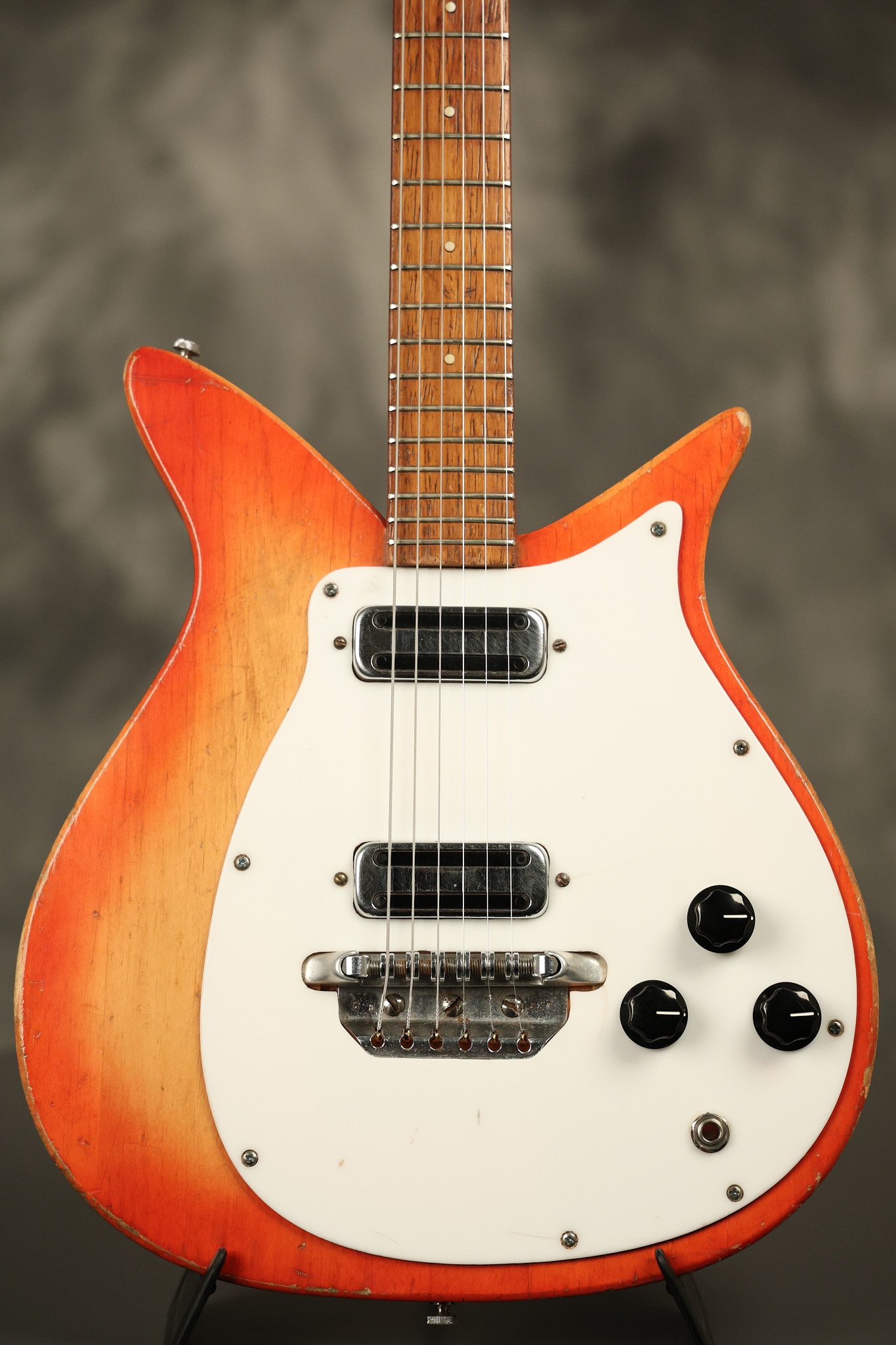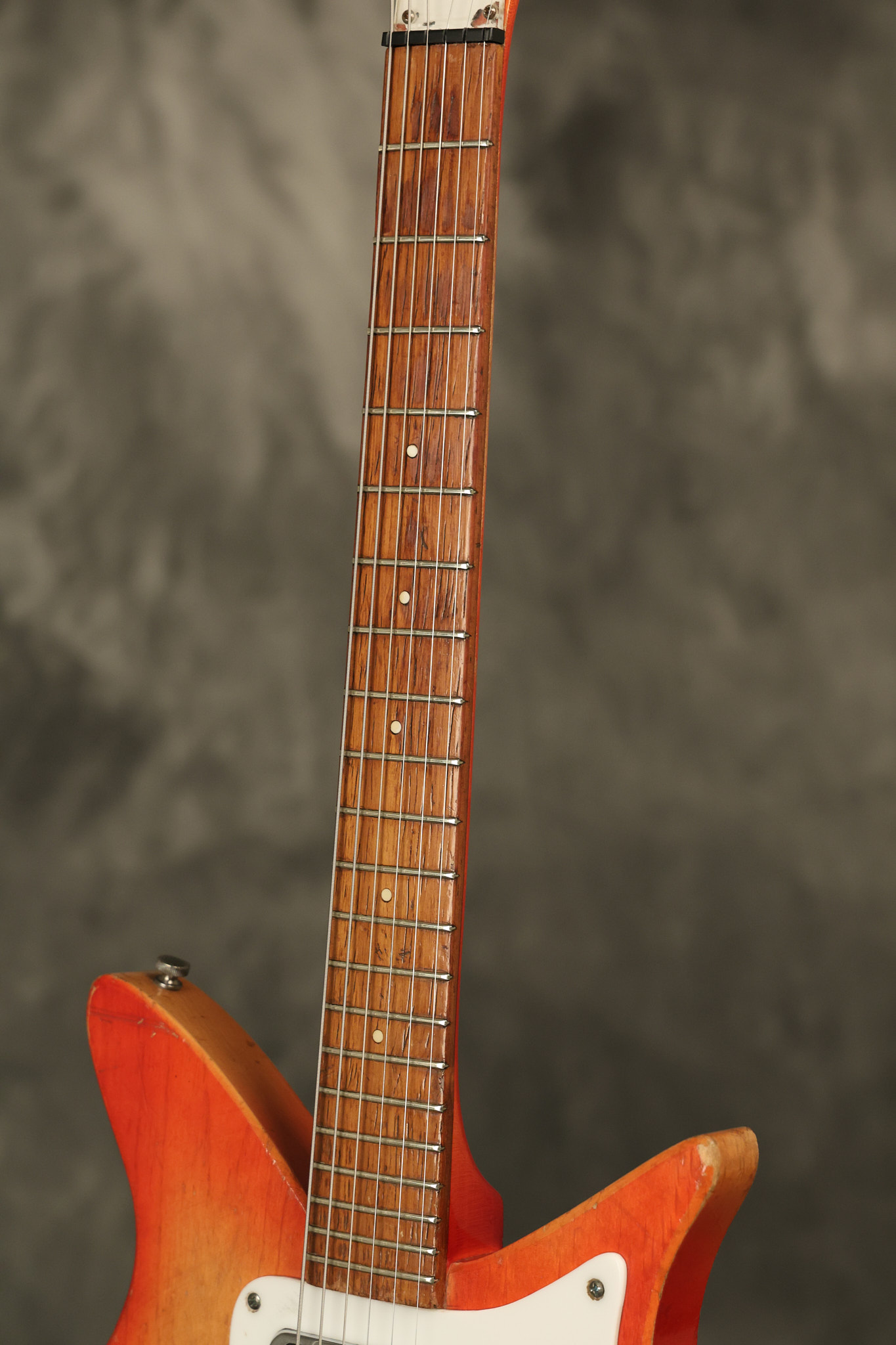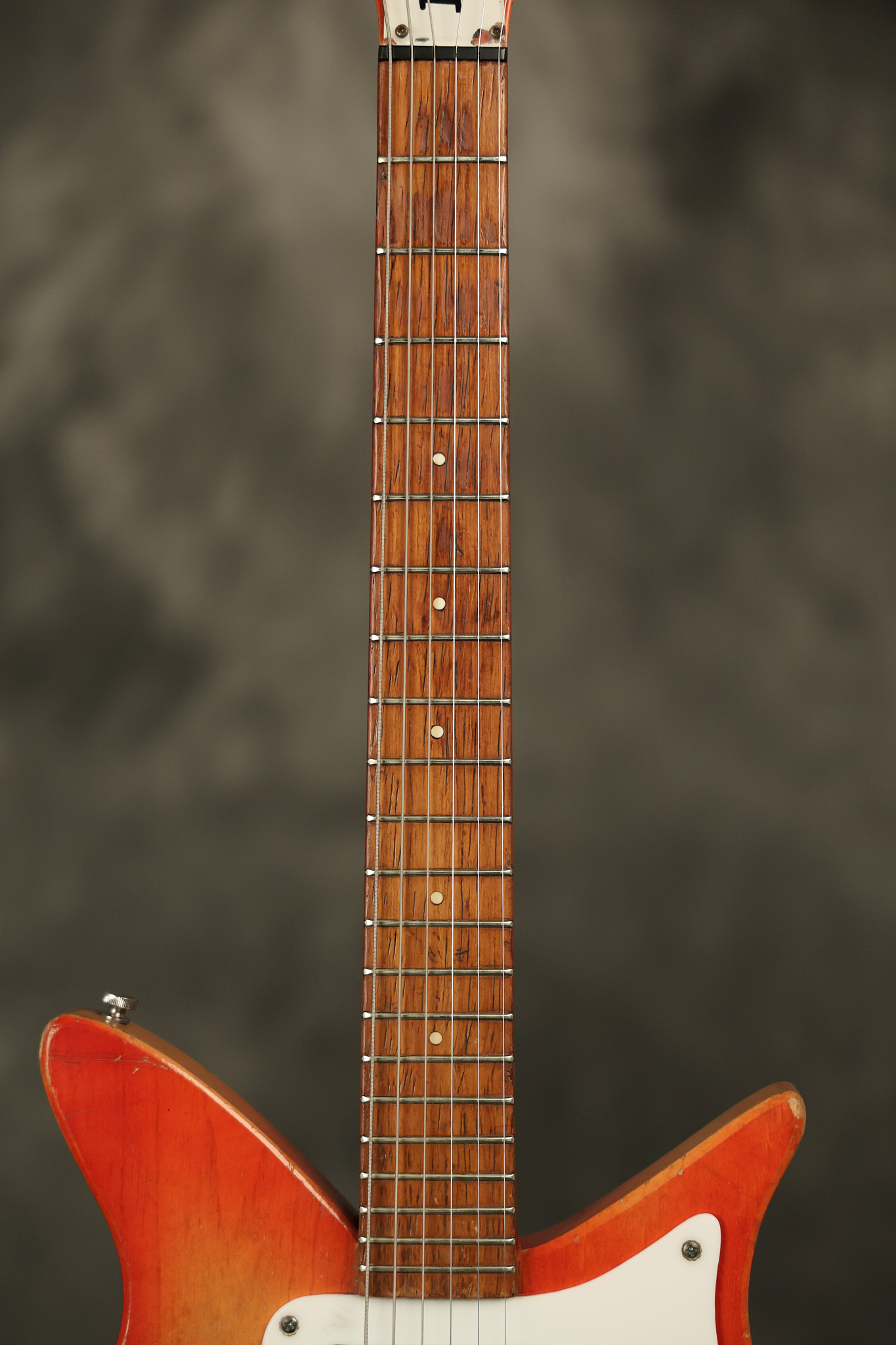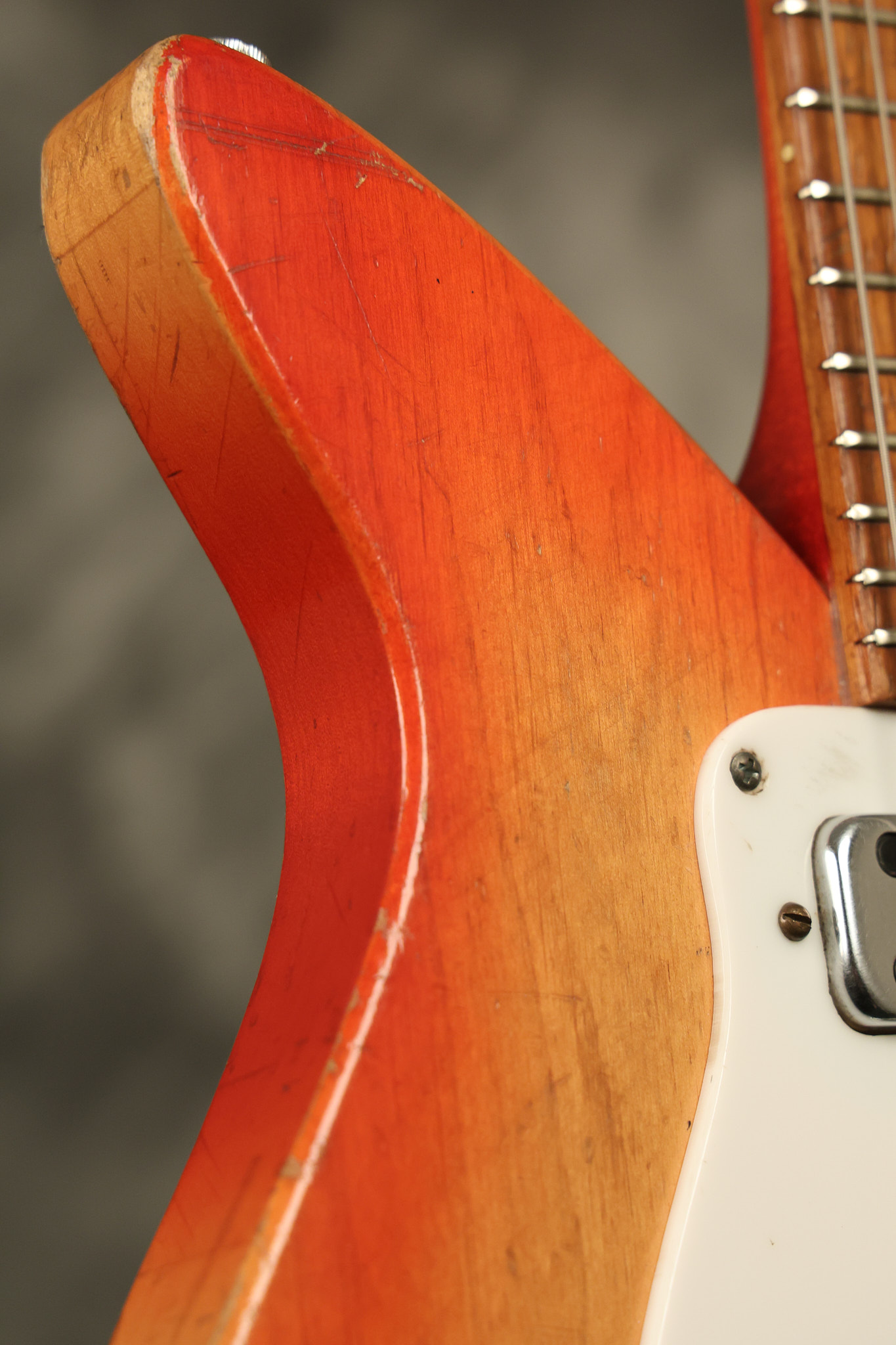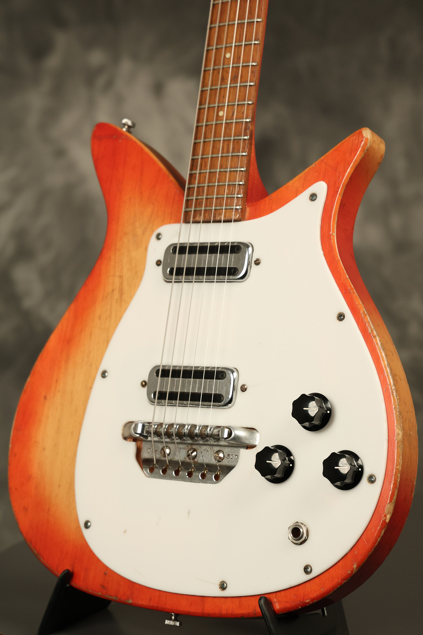 1963 Rickenbacker model 950 3/4 scale in its original Fireglo finish. It has a good playing neck with good frets. Parts that have been changed include the bridge, nut, pickguard screws, 2 tuning key screws, one pot, the capacitor, the jack and some of the wires. The pickups are original along with the 3-way rotary tone switch and a pot that dates to 1960. The original hardshell case is also included. A 3-digit number has been stamped into the back of the headstock. There are lots of nicks + dings, belt buckle wear, play wear and other cosmetic wear including some cracks in the pickguard. The guitar itself remains structurally sound. All electronics work and sound great.