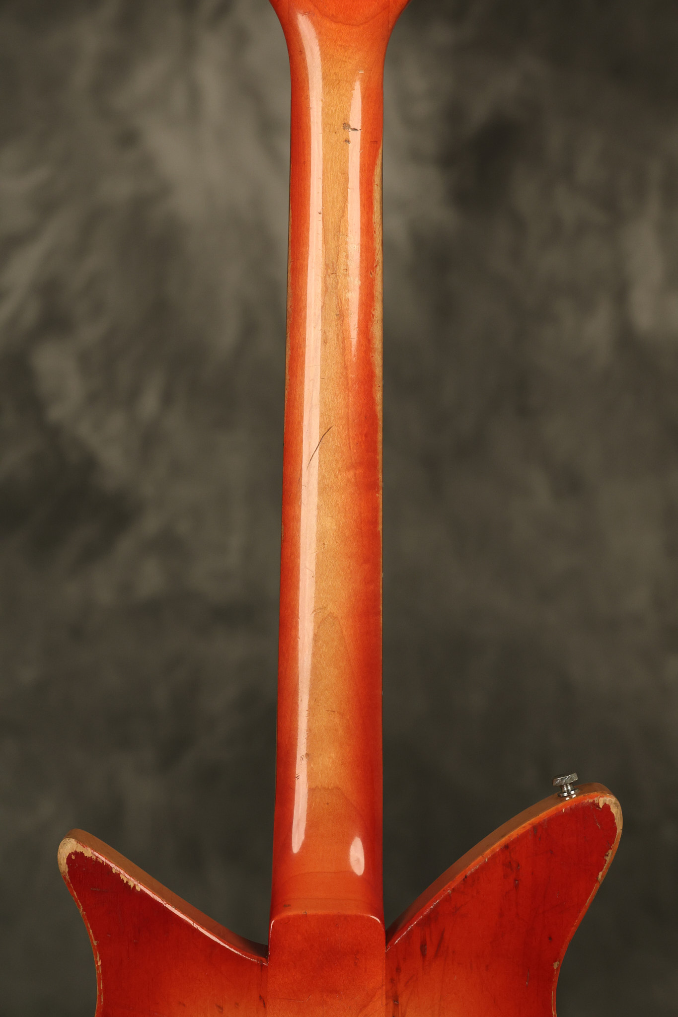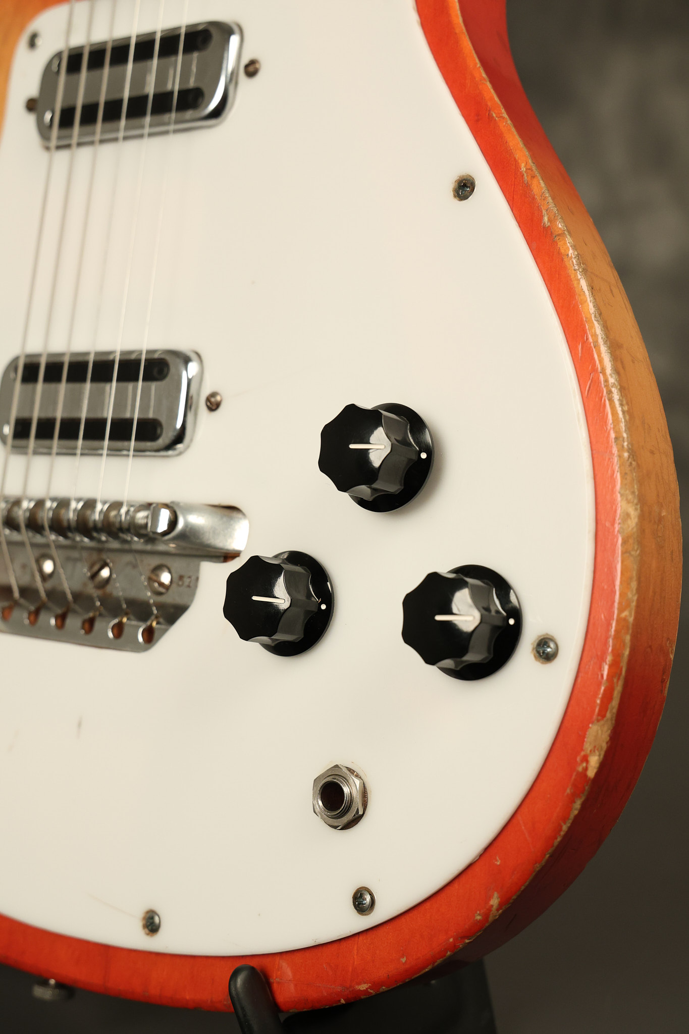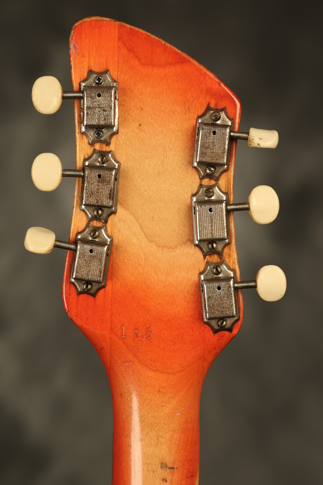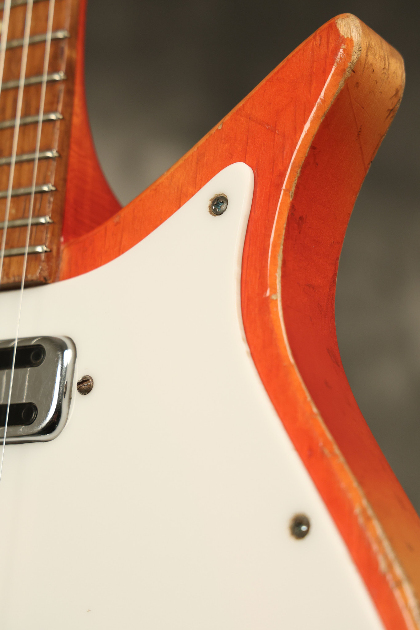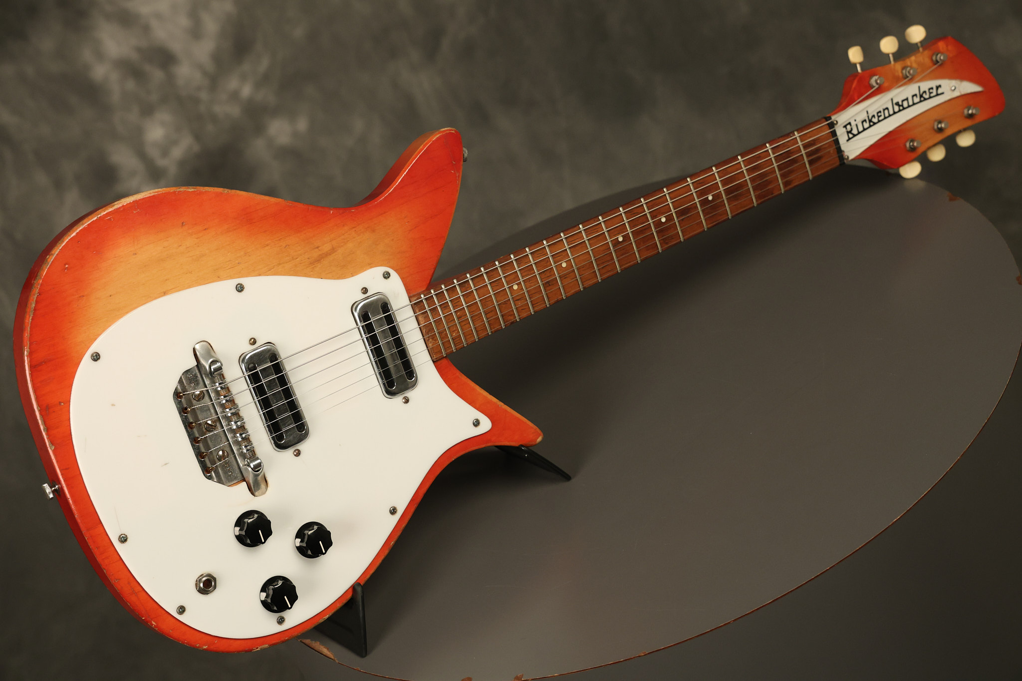 1963 Rickenbacker model 950 3/4 scale in its original Fireglo finish. It has a good playing neck with good frets. Parts that have been changed include the bridge, nut, pickguard screws, 2 tuning key screws, one pot, the capacitor, the jack and some of the wires. The pickups are original along with the 3-way rotary tone switch and a pot that dates to 1960. The original hardshell case is also included. A 3-digit number has been stamped into the back of the headstock. There are lots of nicks + dings, belt buckle wear, play wear and other cosmetic wear including some cracks in the pickguard. The guitar itself remains structurally sound. All electronics work and sound great.