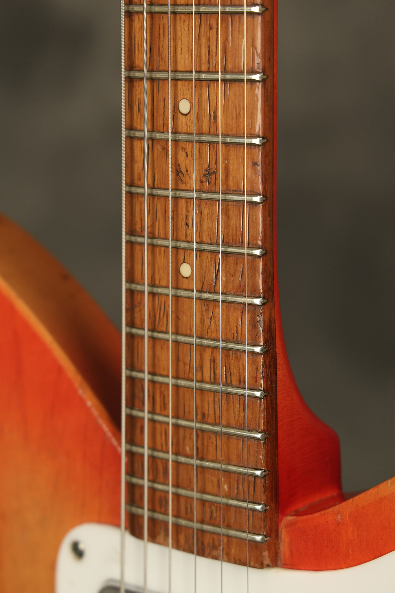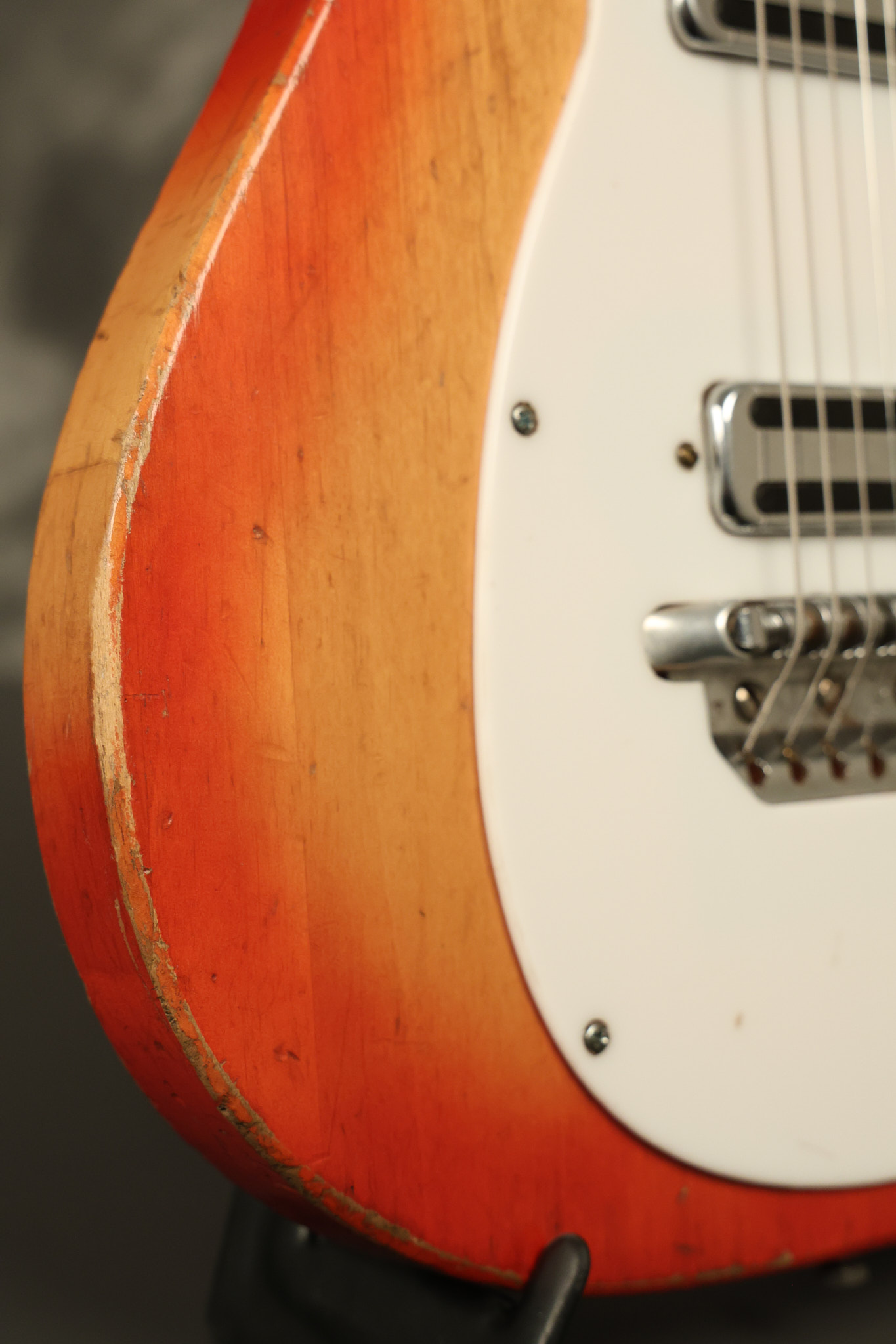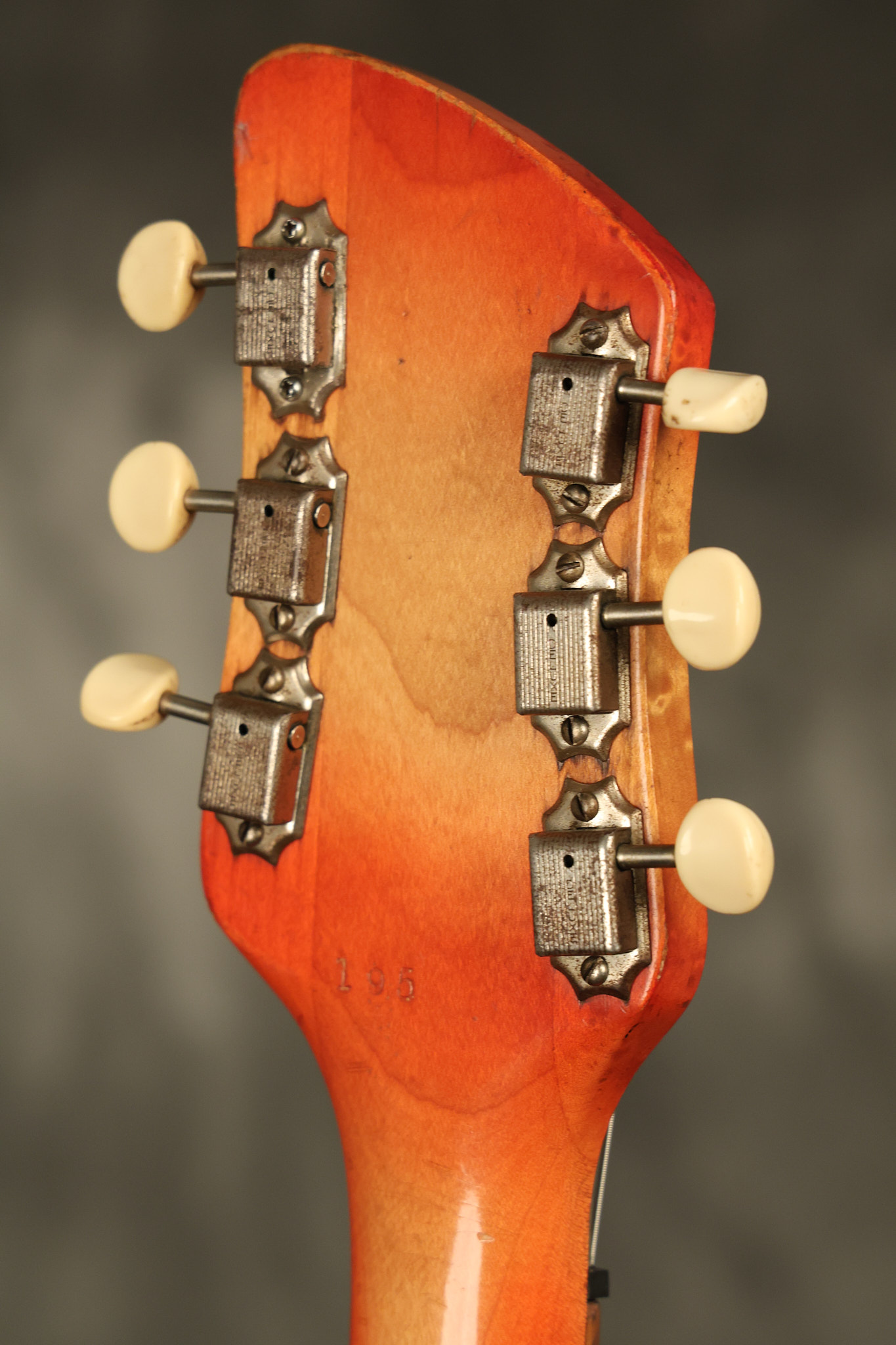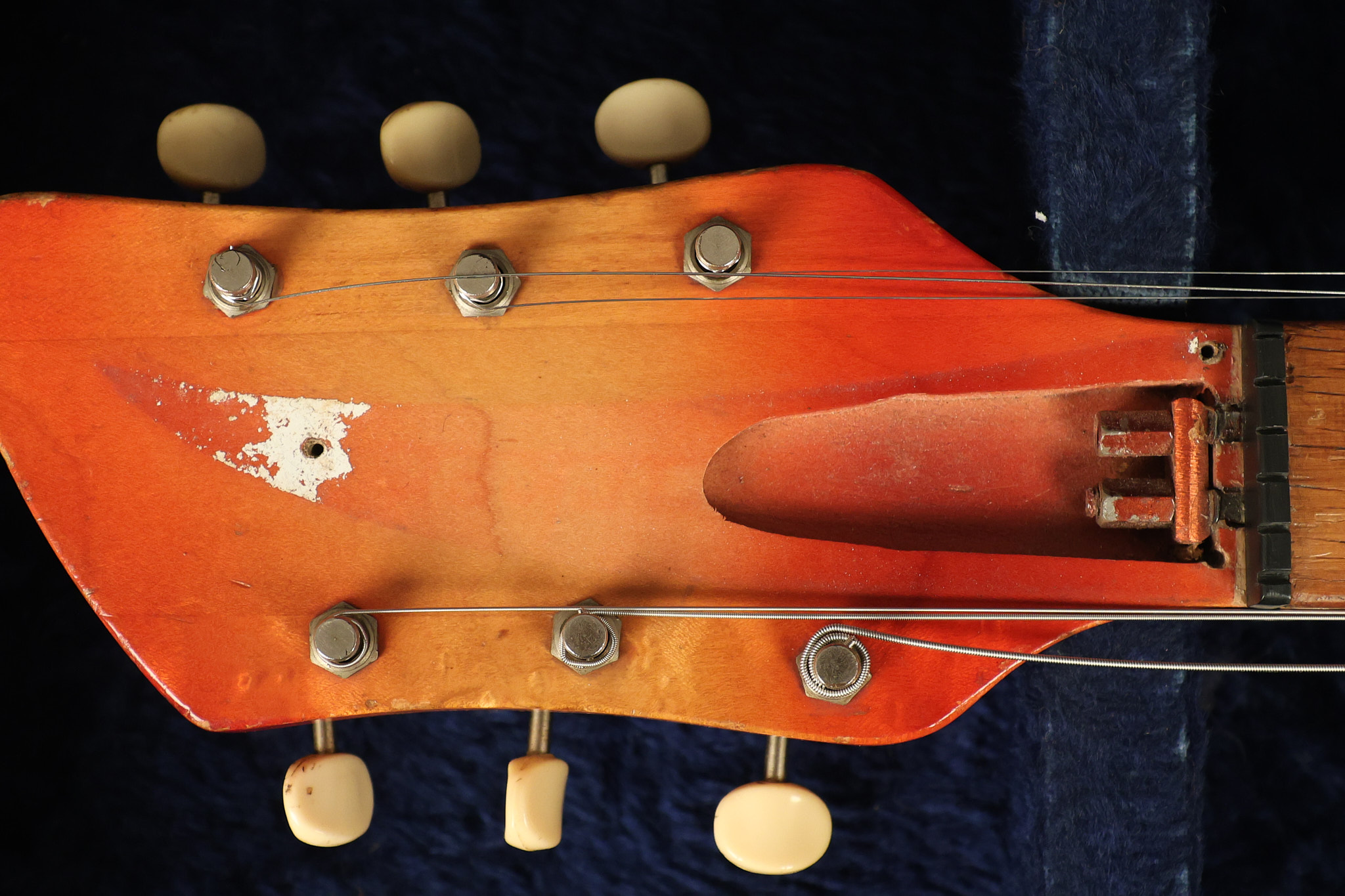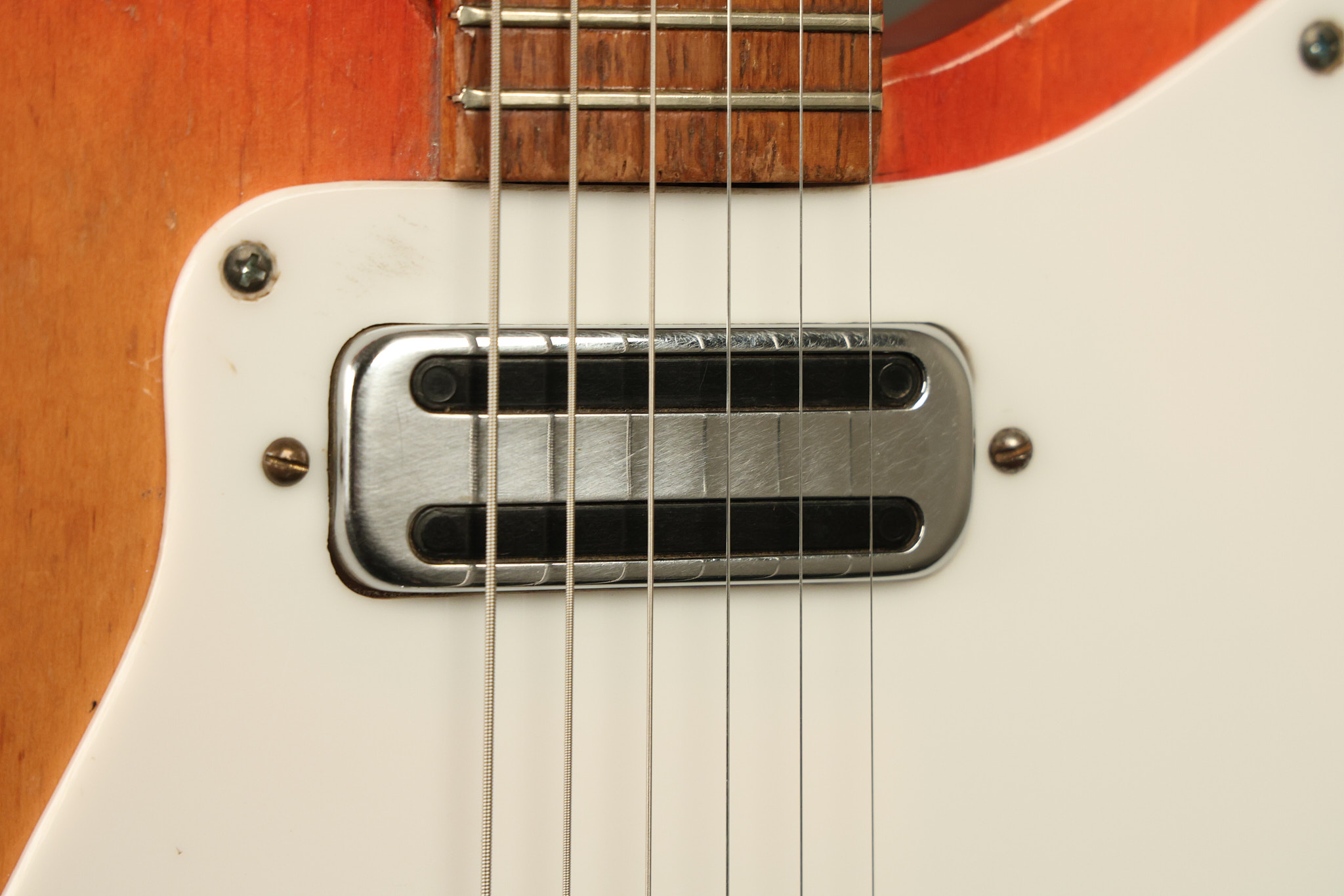 1963 Rickenbacker model 950 3/4 scale in its original Fireglo finish. It has a good playing neck with good frets. Parts that have been changed include the bridge, nut, pickguard screws, 2 tuning key screws, one pot, the capacitor, the jack and some of the wires. The pickups are original along with the 3-way rotary tone switch and a pot that dates to 1960. The original hardshell case is also included. A 3-digit number has been stamped into the back of the headstock. There are lots of nicks + dings, belt buckle wear, play wear and other cosmetic wear including some cracks in the pickguard. The guitar itself remains structurally sound. All electronics work and sound great.