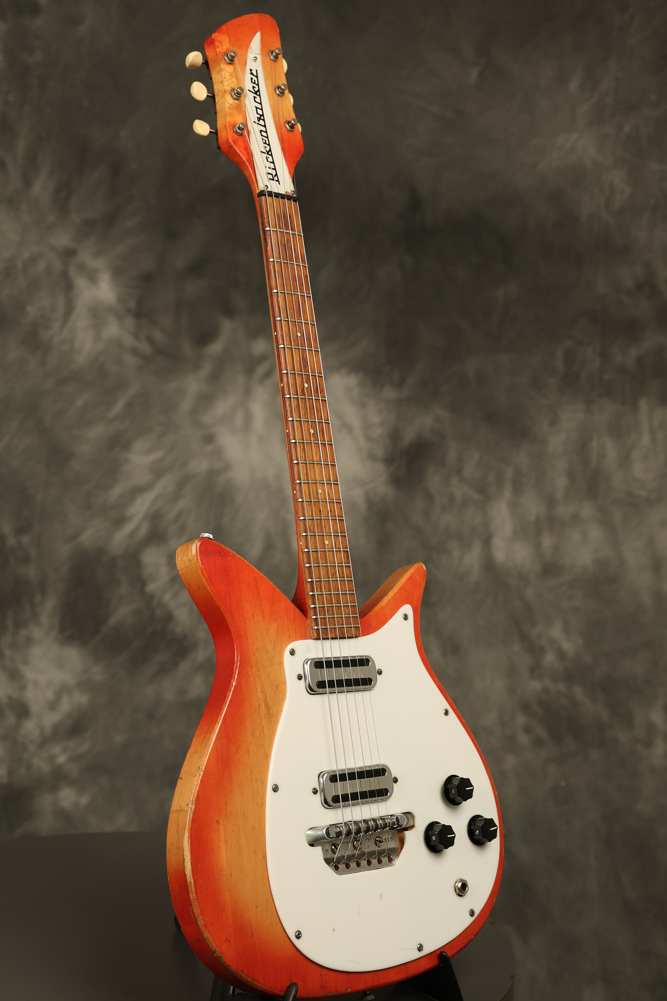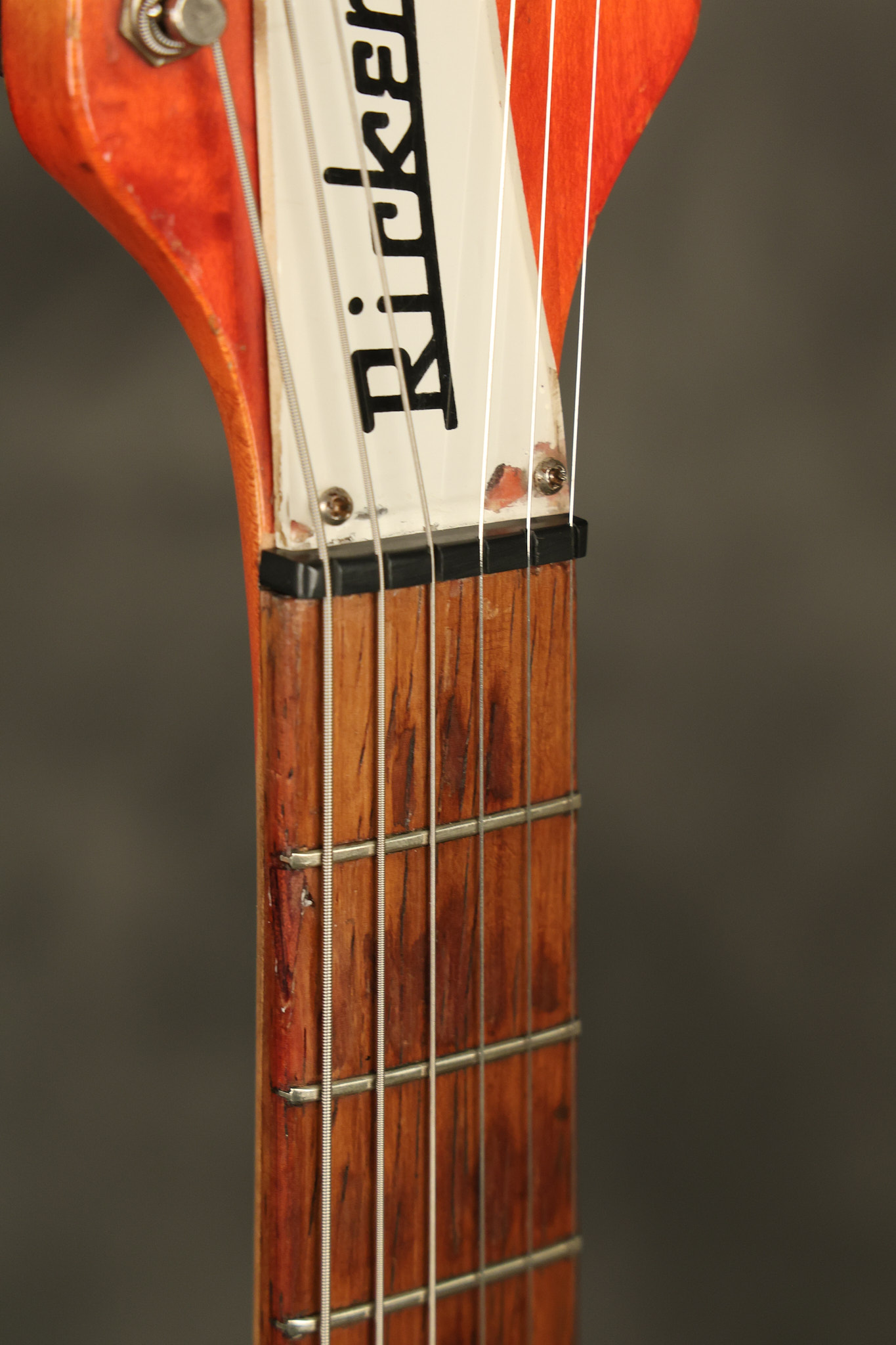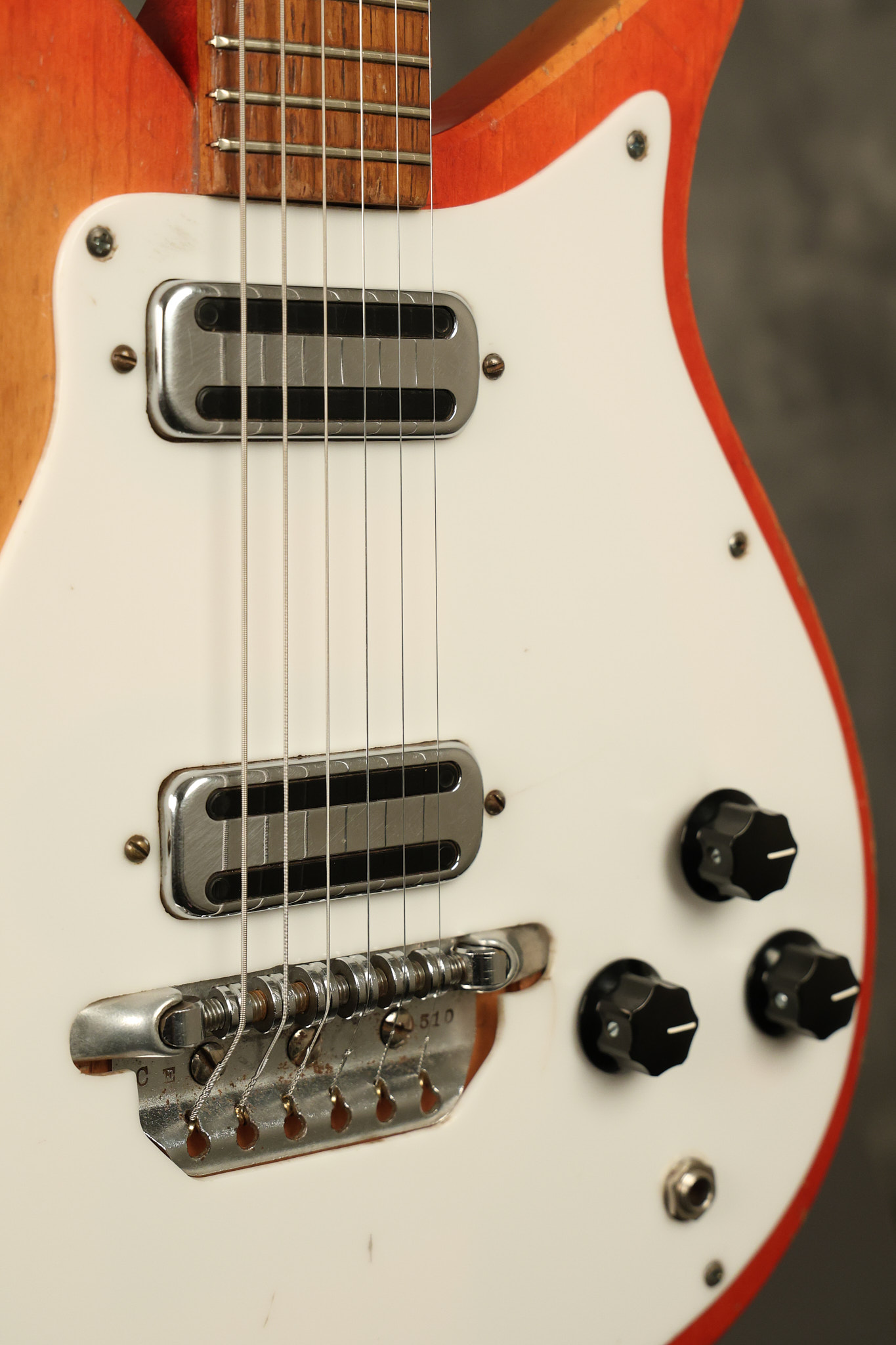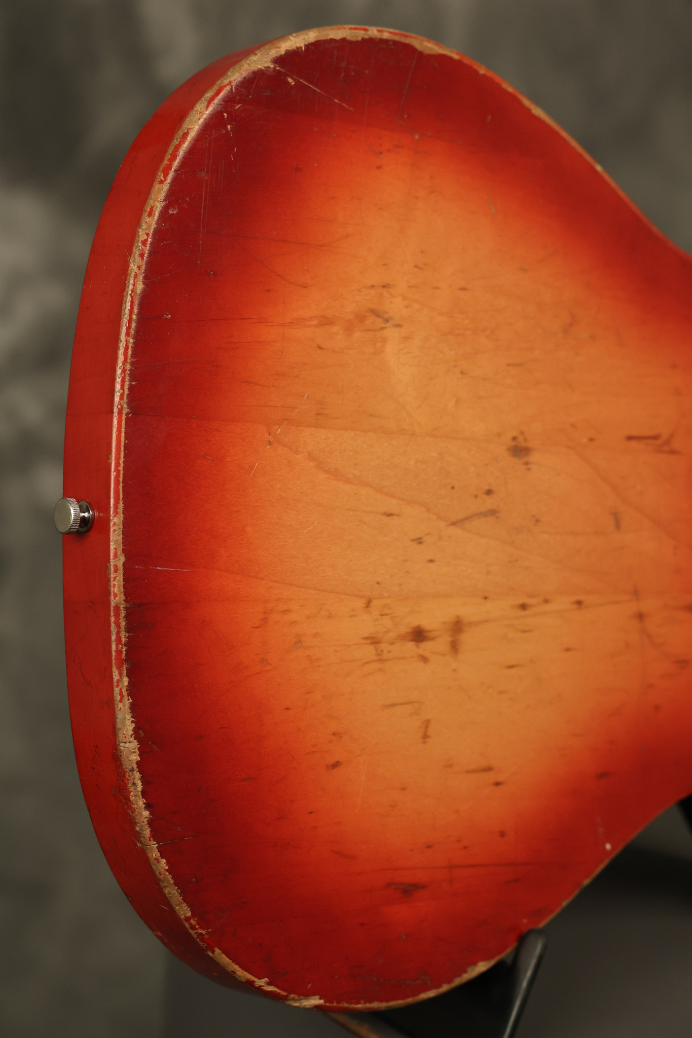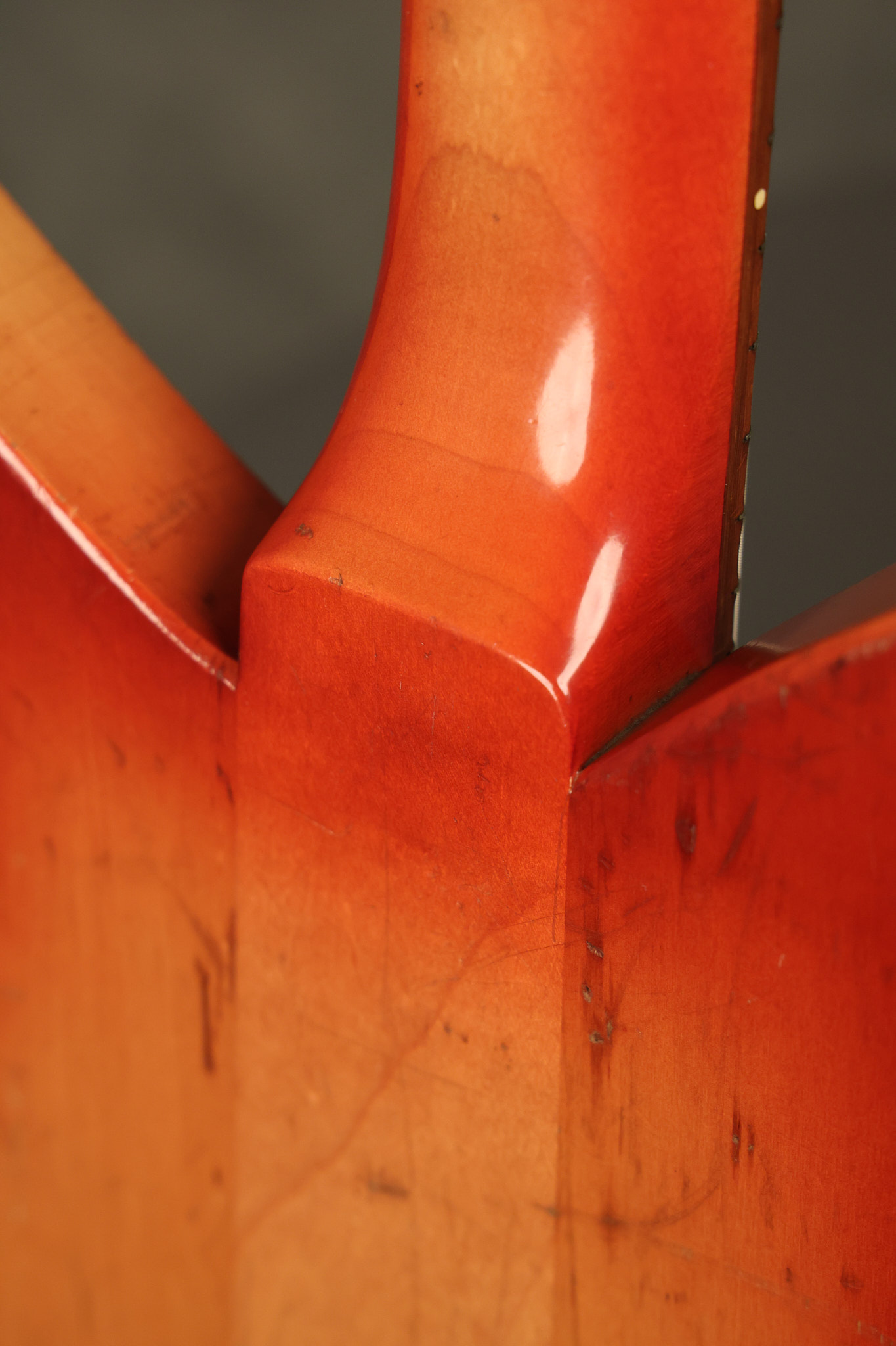 1963 Rickenbacker model 950 3/4 scale in its original Fireglo finish. It has a good playing neck with good frets. Parts that have been changed include the bridge, nut, pickguard screws, 2 tuning key screws, one pot, the capacitor, the jack and some of the wires. The pickups are original along with the 3-way rotary tone switch and a pot that dates to 1960. The original hardshell case is also included. A 3-digit number has been stamped into the back of the headstock. There are lots of nicks + dings, belt buckle wear, play wear and other cosmetic wear including some cracks in the pickguard. The guitar itself remains structurally sound. All electronics work and sound great.