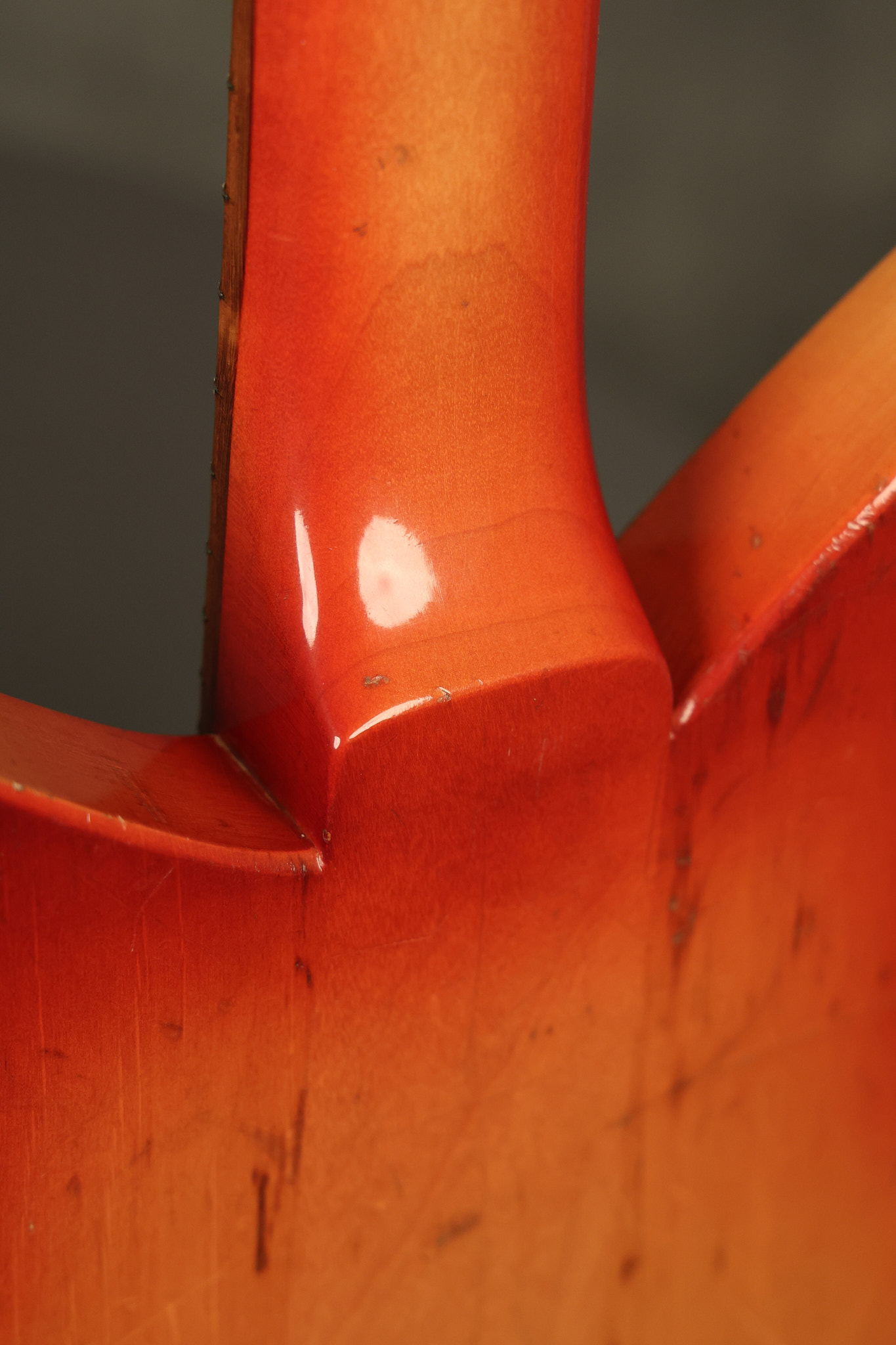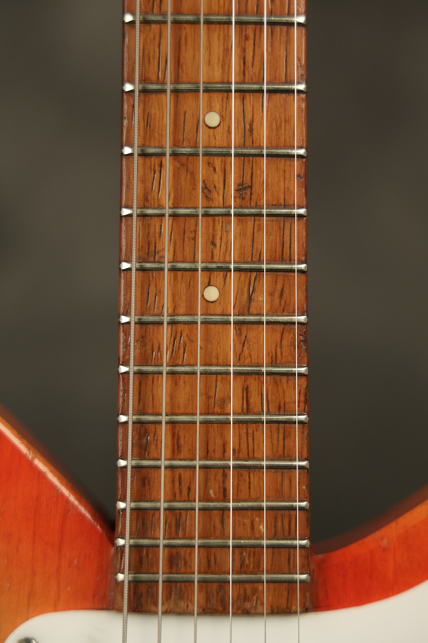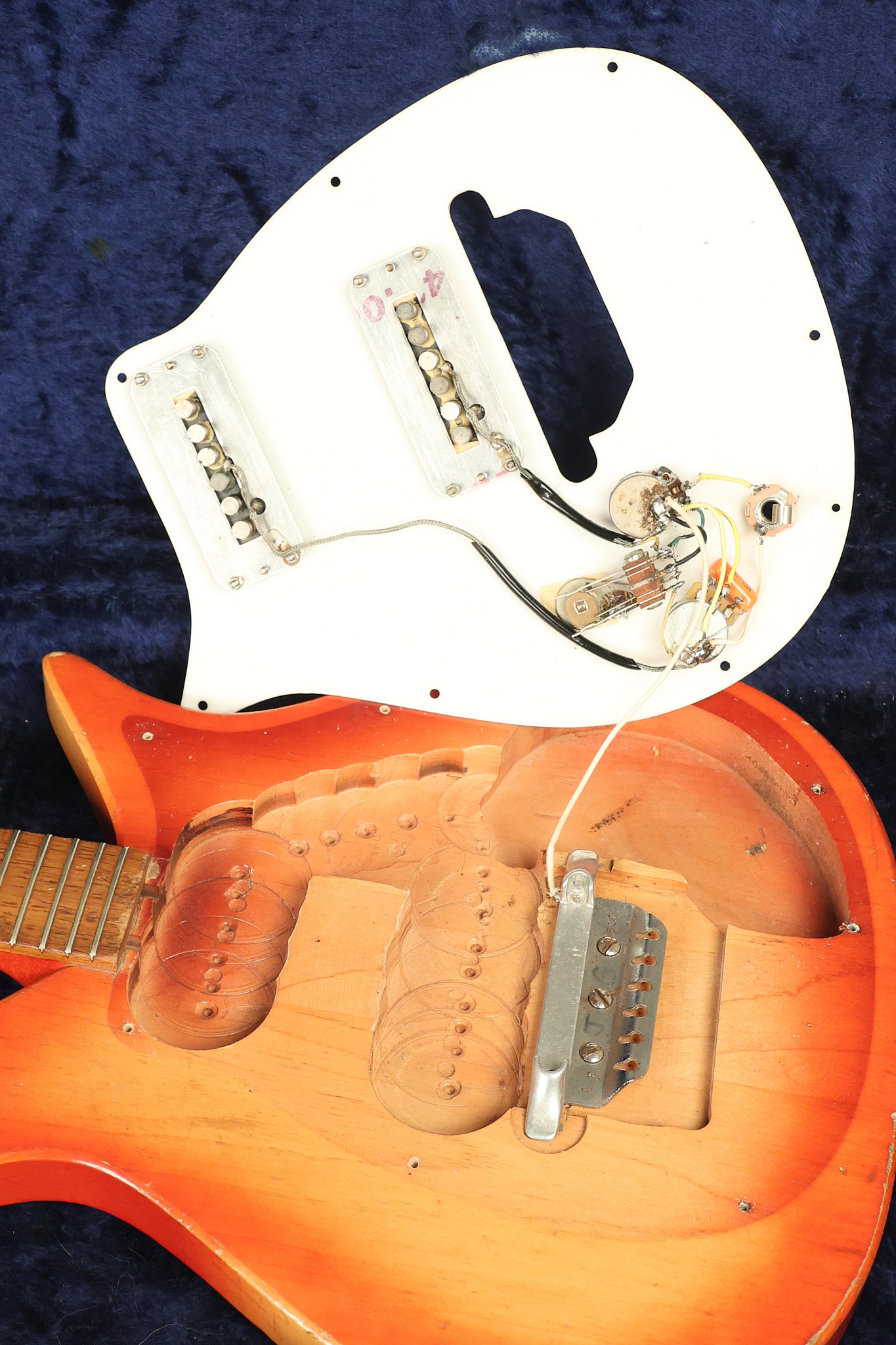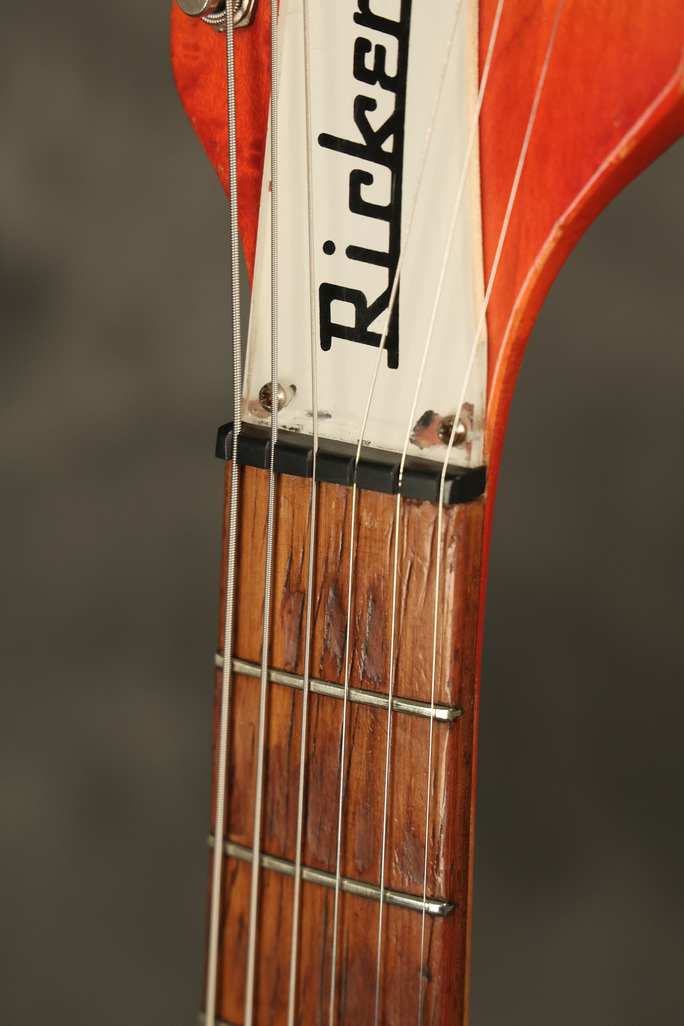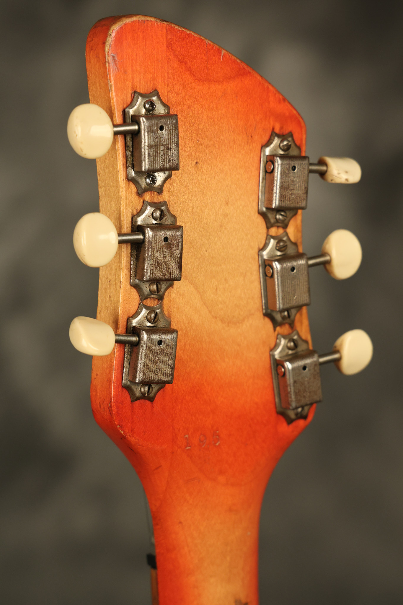 1963 Rickenbacker model 950 3/4 scale in its original Fireglo finish. It has a good playing neck with good frets. Parts that have been changed include the bridge, nut, pickguard screws, 2 tuning key screws, one pot, the capacitor, the jack and some of the wires. The pickups are original along with the 3-way rotary tone switch and a pot that dates to 1960. The original hardshell case is also included. A 3-digit number has been stamped into the back of the headstock. There are lots of nicks + dings, belt buckle wear, play wear and other cosmetic wear including some cracks in the pickguard. The guitar itself remains structurally sound. All electronics work and sound great.