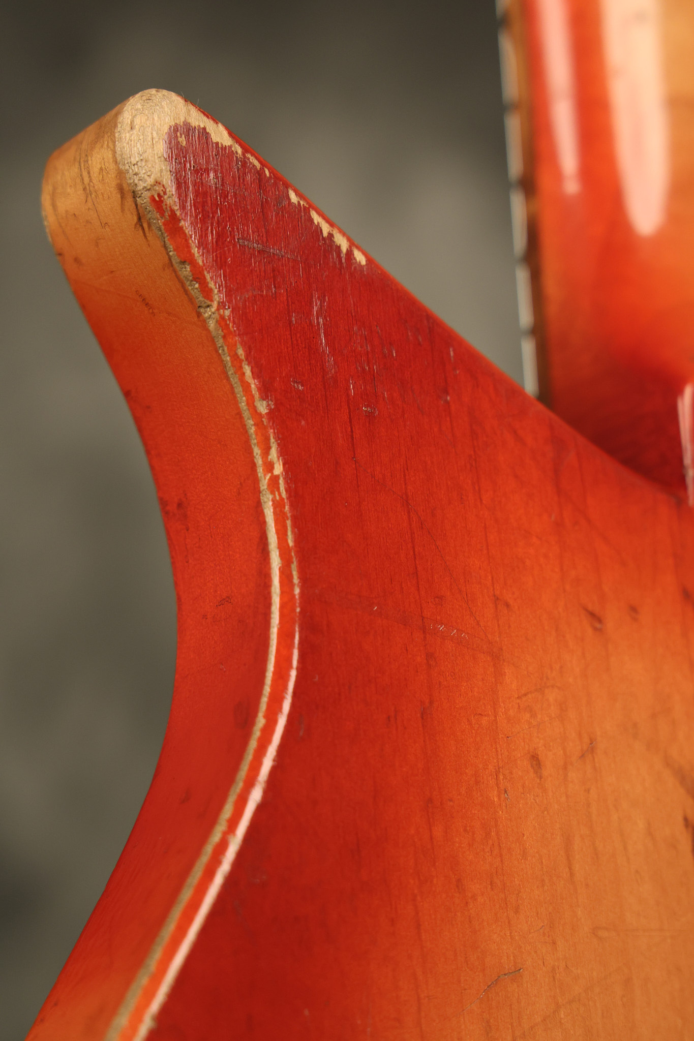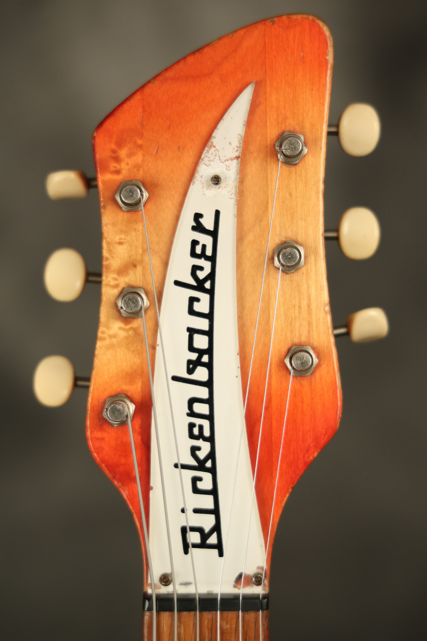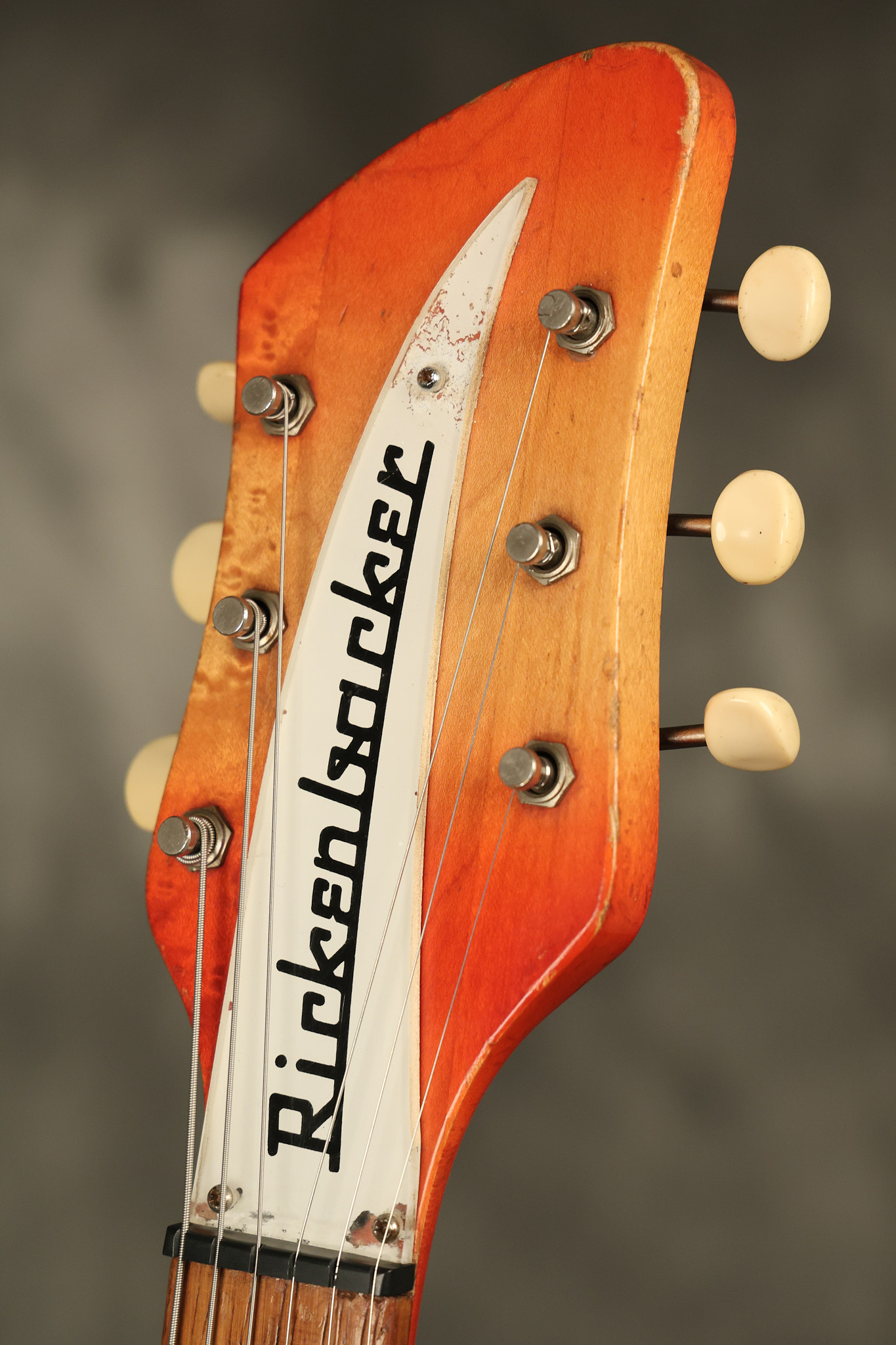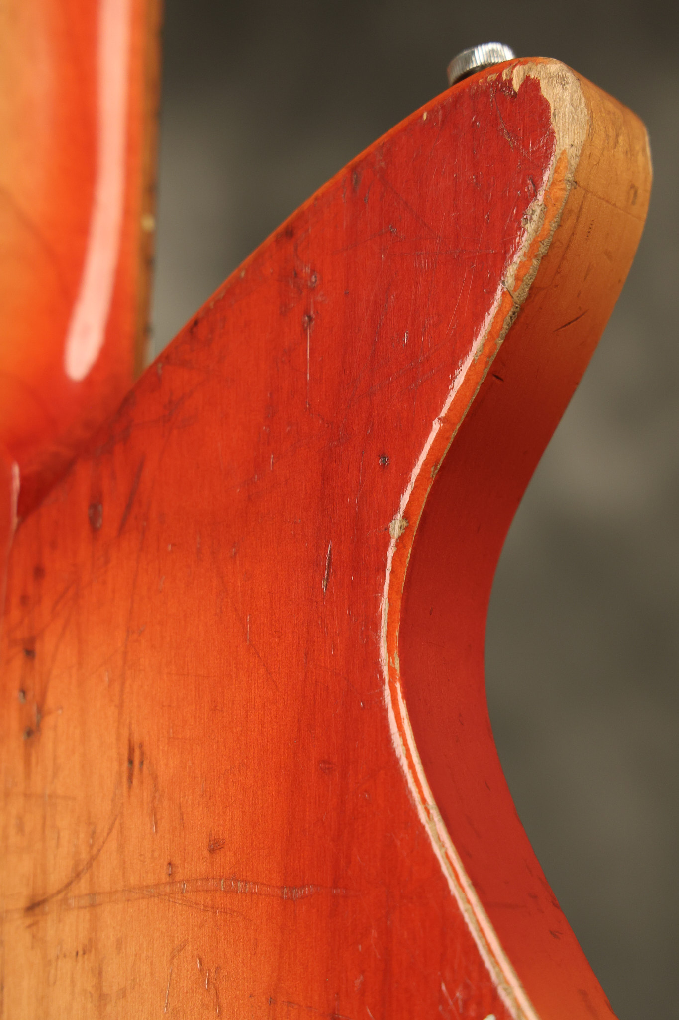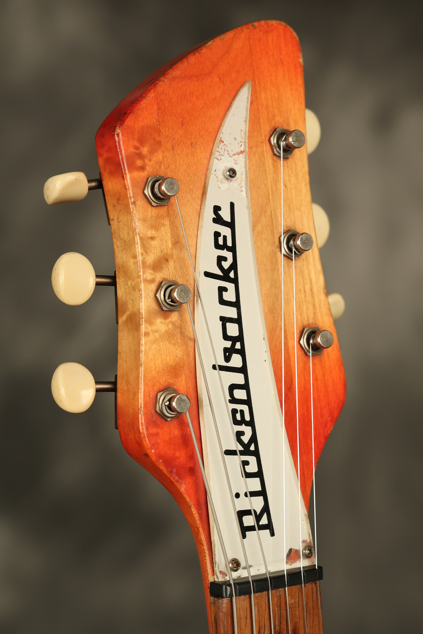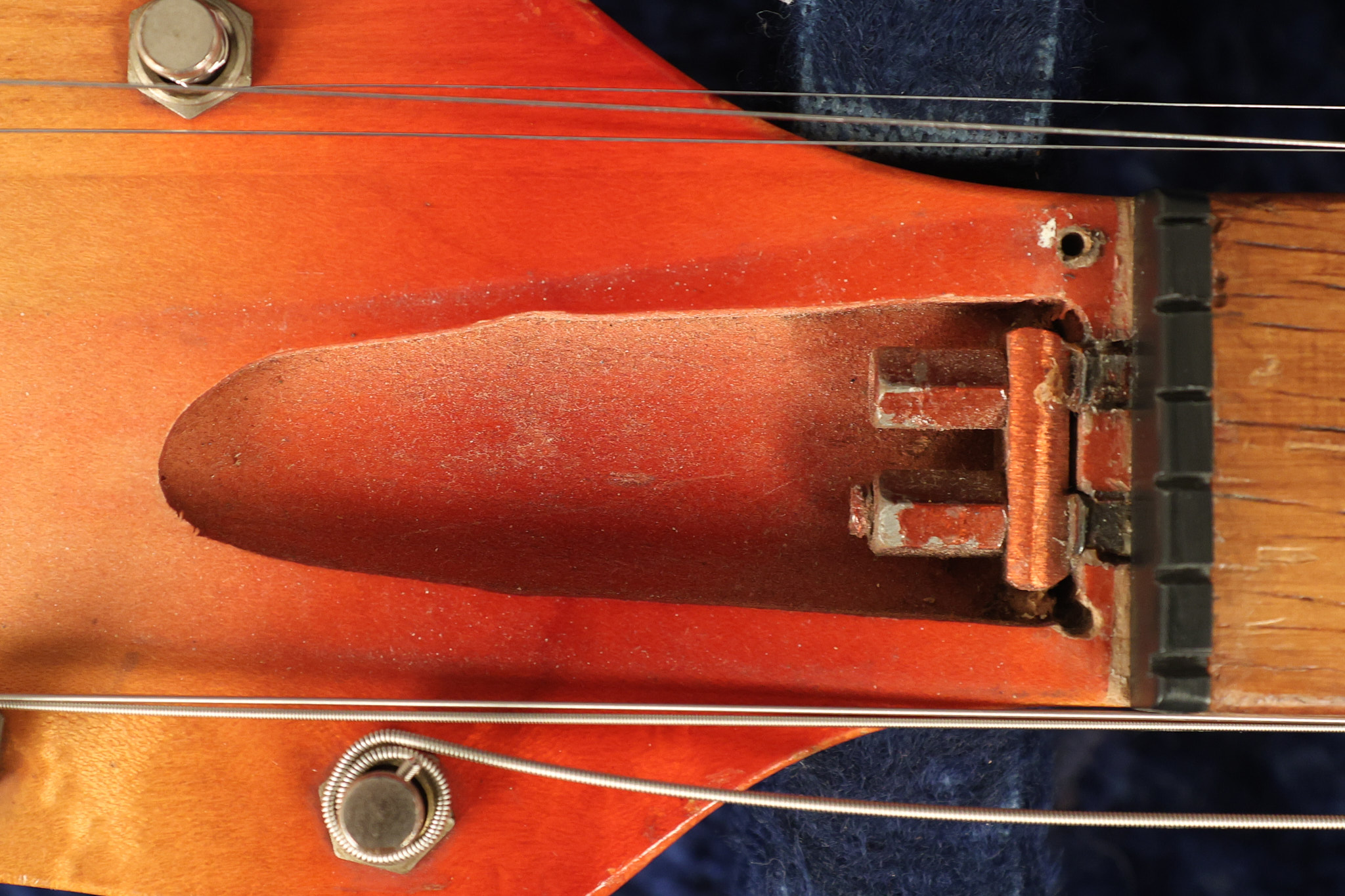 1963 Rickenbacker model 950 3/4 scale in its original Fireglo finish. It has a good playing neck with good frets. Parts that have been changed include the bridge, nut, pickguard screws, 2 tuning key screws, one pot, the capacitor, the jack and some of the wires. The pickups are original along with the 3-way rotary tone switch and a pot that dates to 1960. The original hardshell case is also included. A 3-digit number has been stamped into the back of the headstock. There are lots of nicks + dings, belt buckle wear, play wear and other cosmetic wear including some cracks in the pickguard. The guitar itself remains structurally sound. All electronics work and sound great.