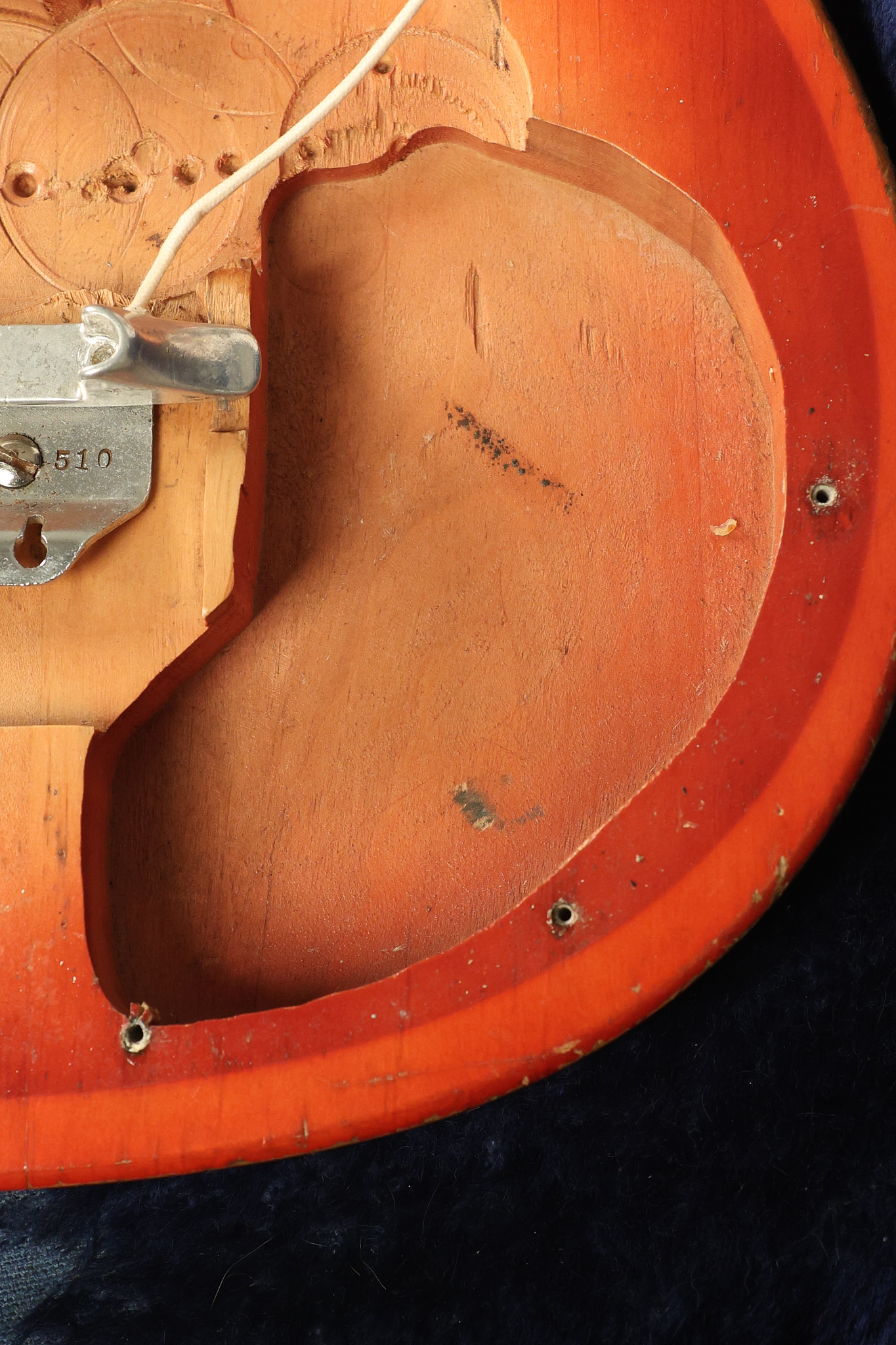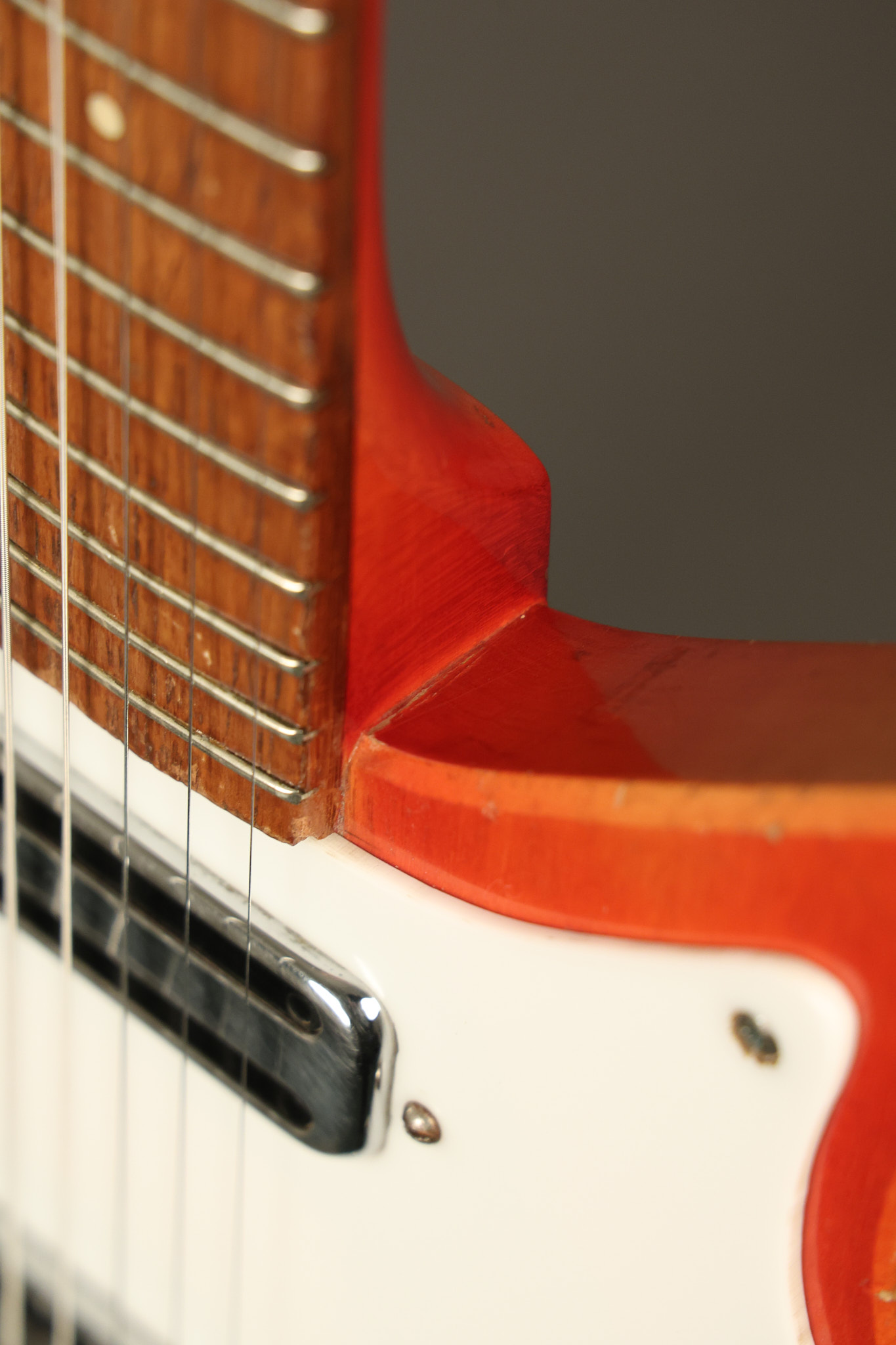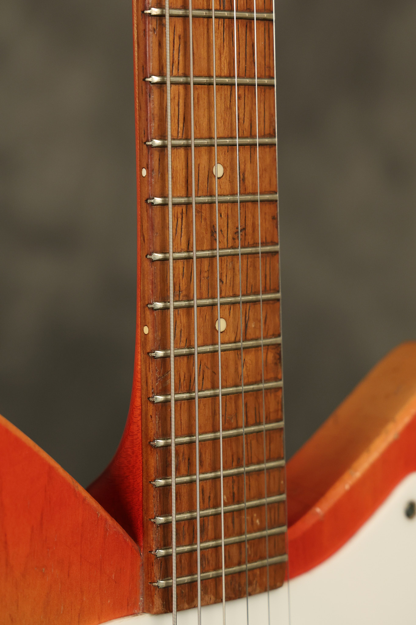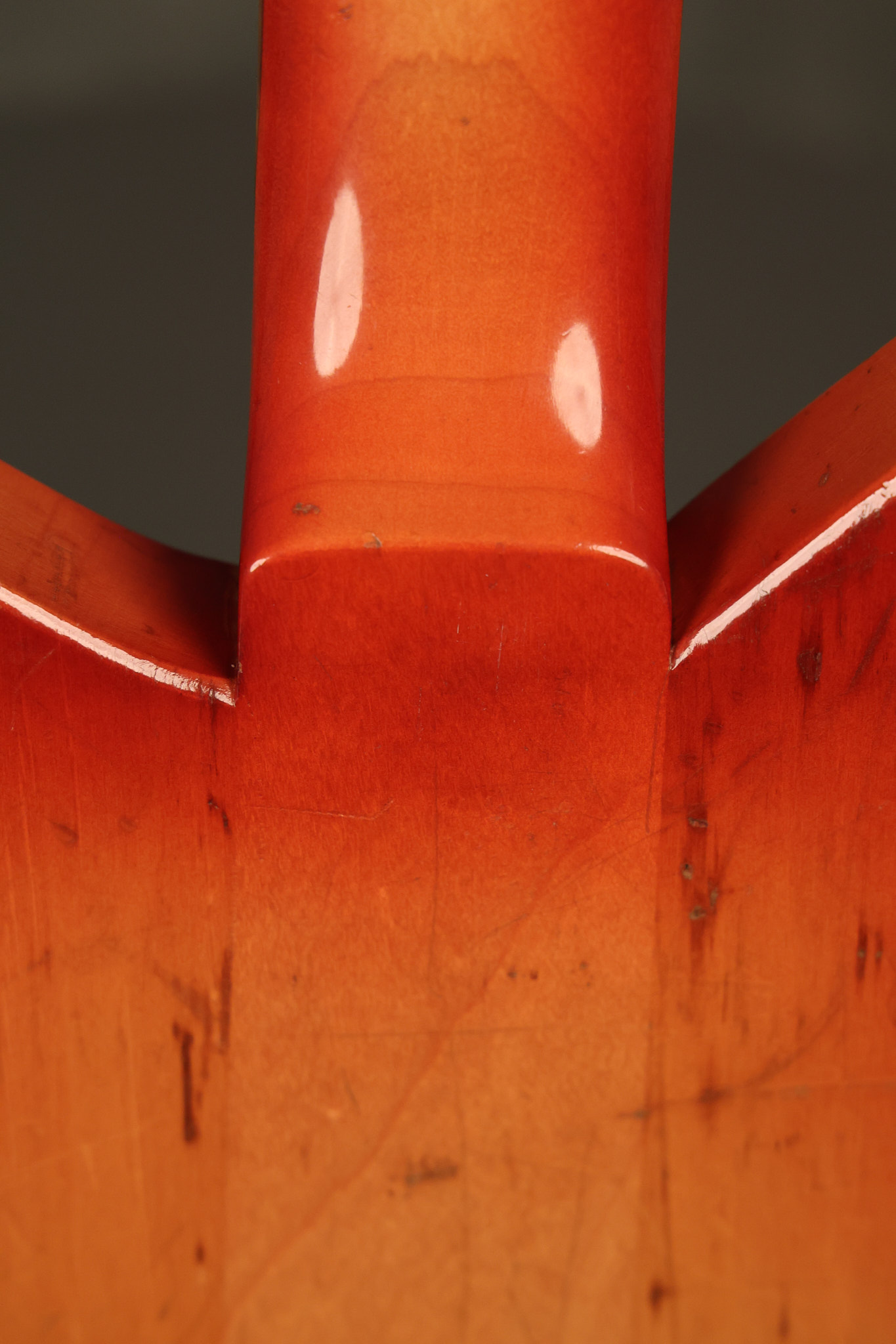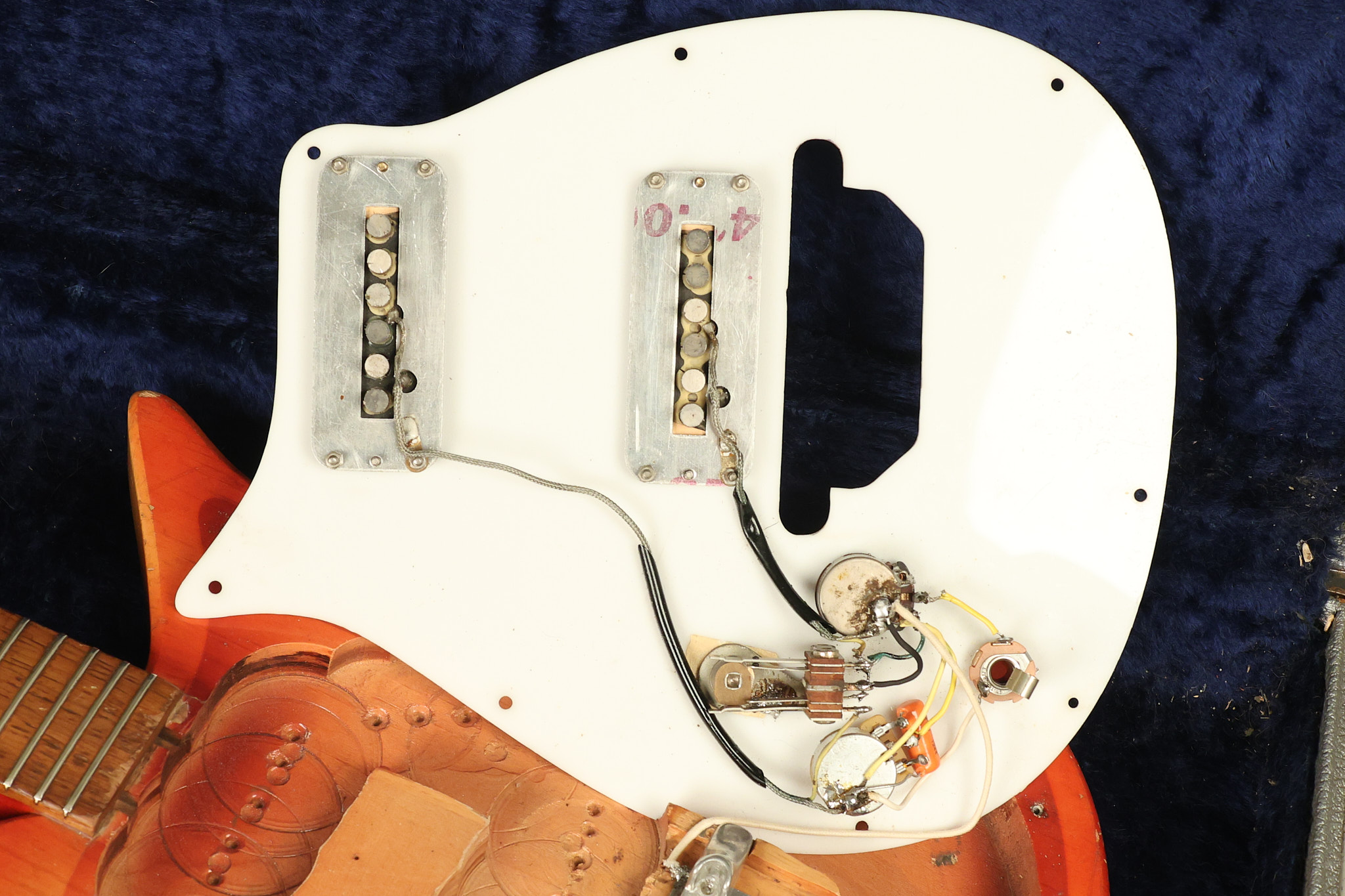 1963 Rickenbacker model 950 3/4 scale in its original Fireglo finish. It has a good playing neck with good frets. Parts that have been changed include the bridge, nut, pickguard screws, 2 tuning key screws, one pot, the capacitor, the jack and some of the wires. The pickups are original along with the 3-way rotary tone switch and a pot that dates to 1960. The original hardshell case is also included. A 3-digit number has been stamped into the back of the headstock. There are lots of nicks + dings, belt buckle wear, play wear and other cosmetic wear including some cracks in the pickguard. The guitar itself remains structurally sound. All electronics work and sound great.