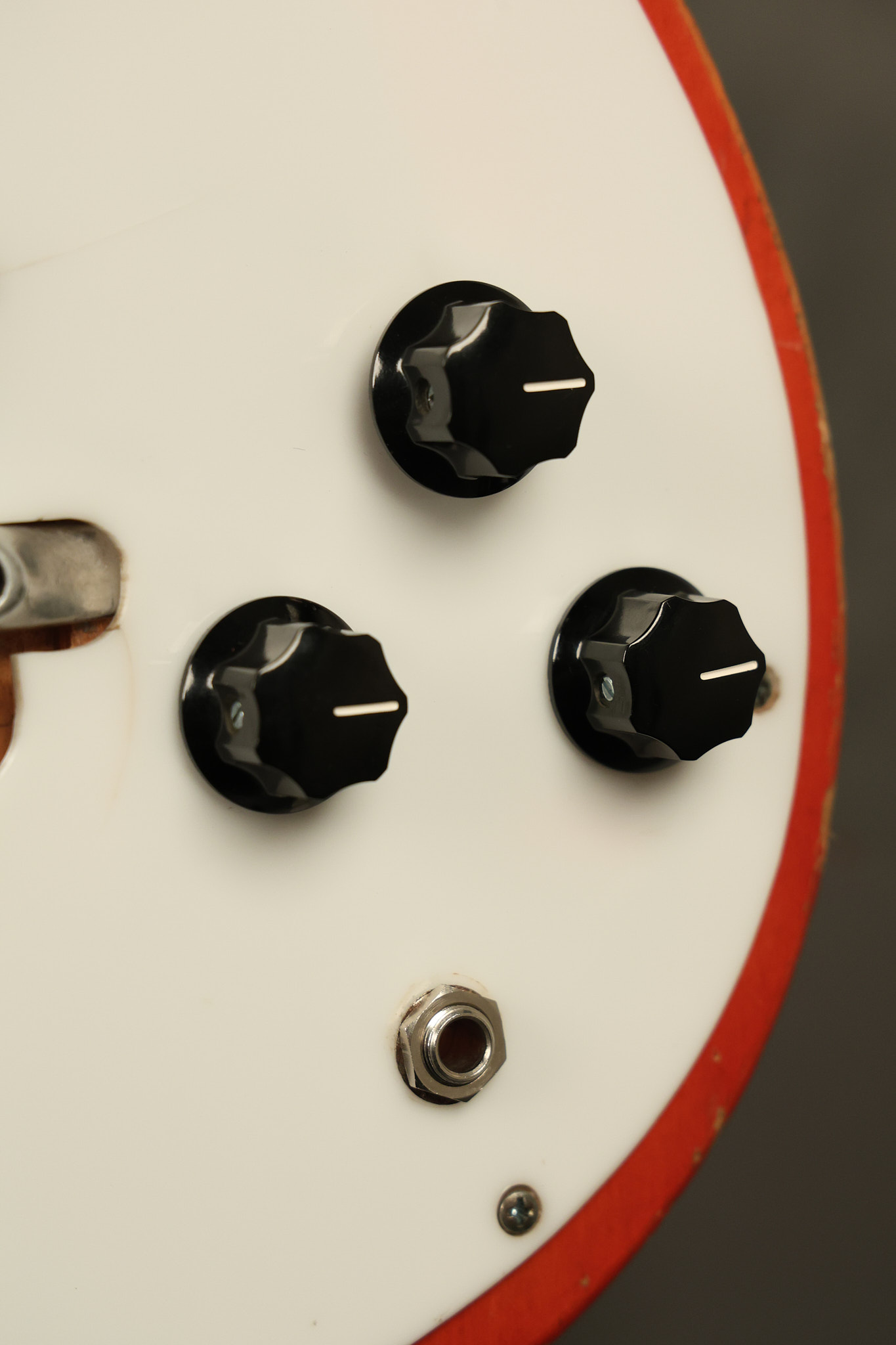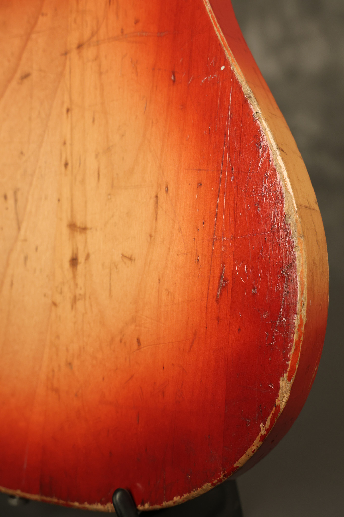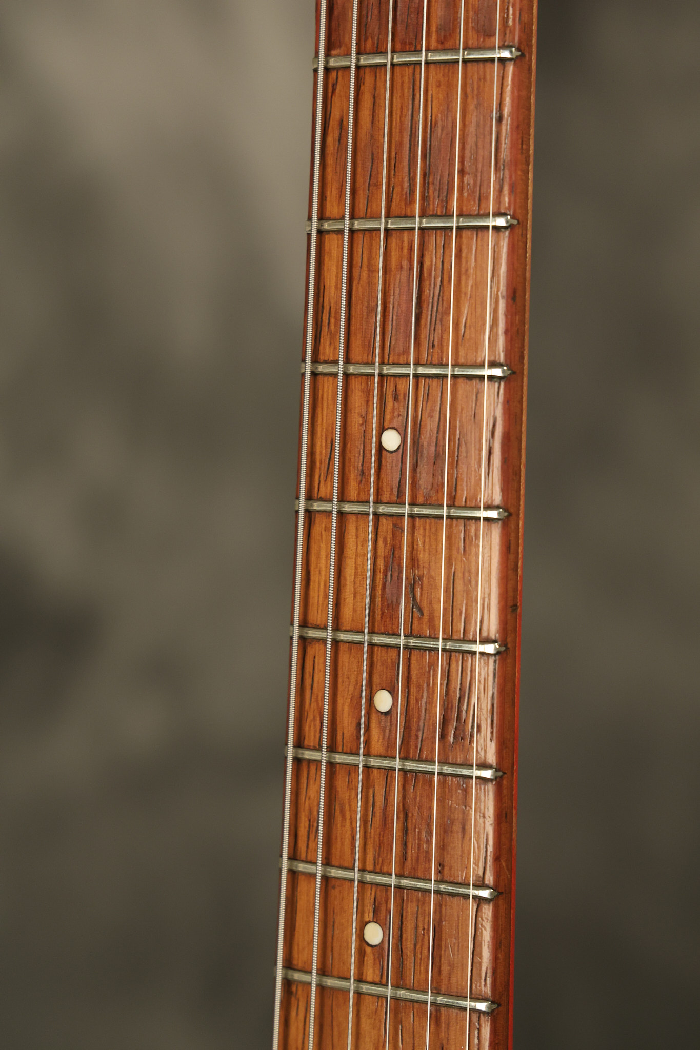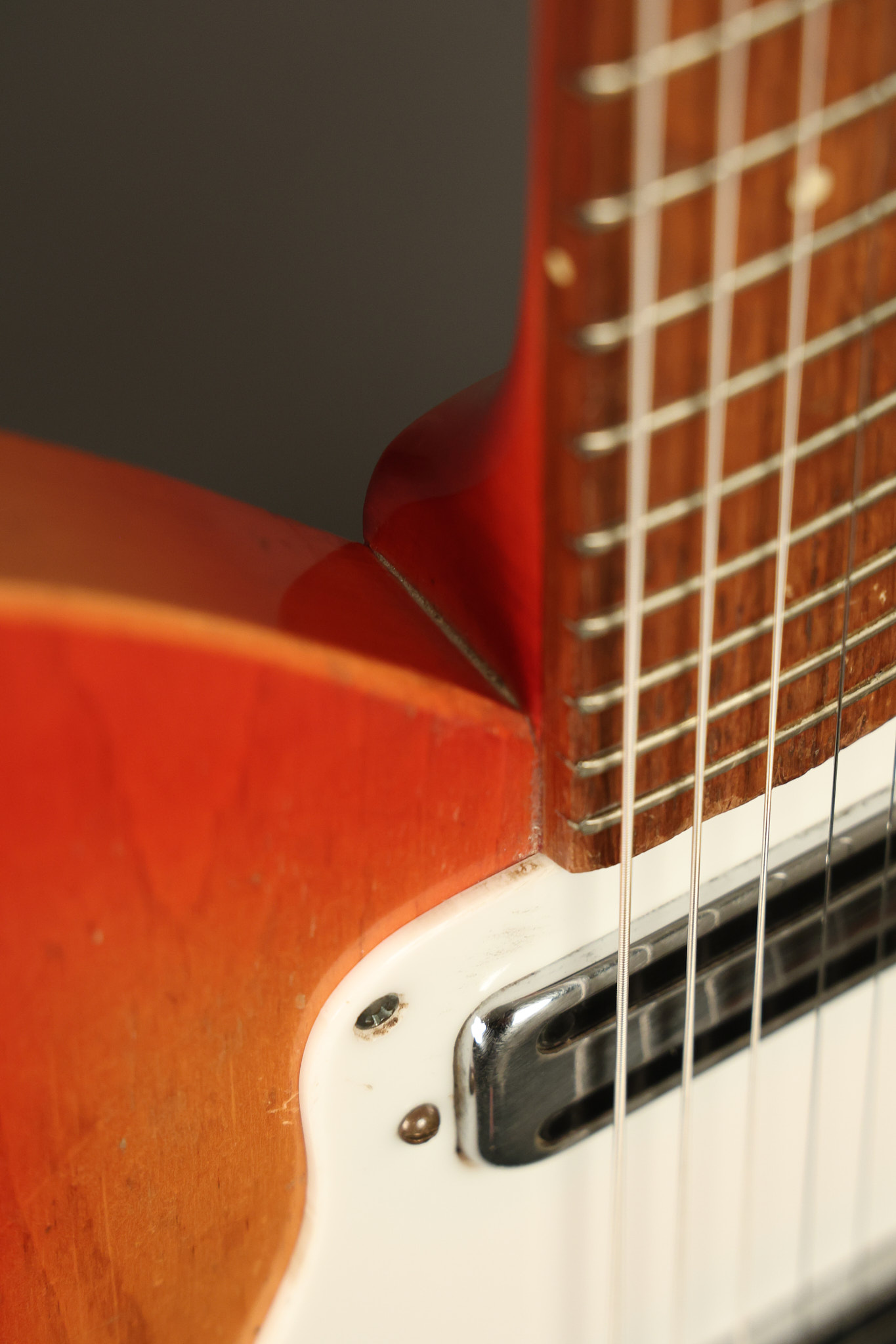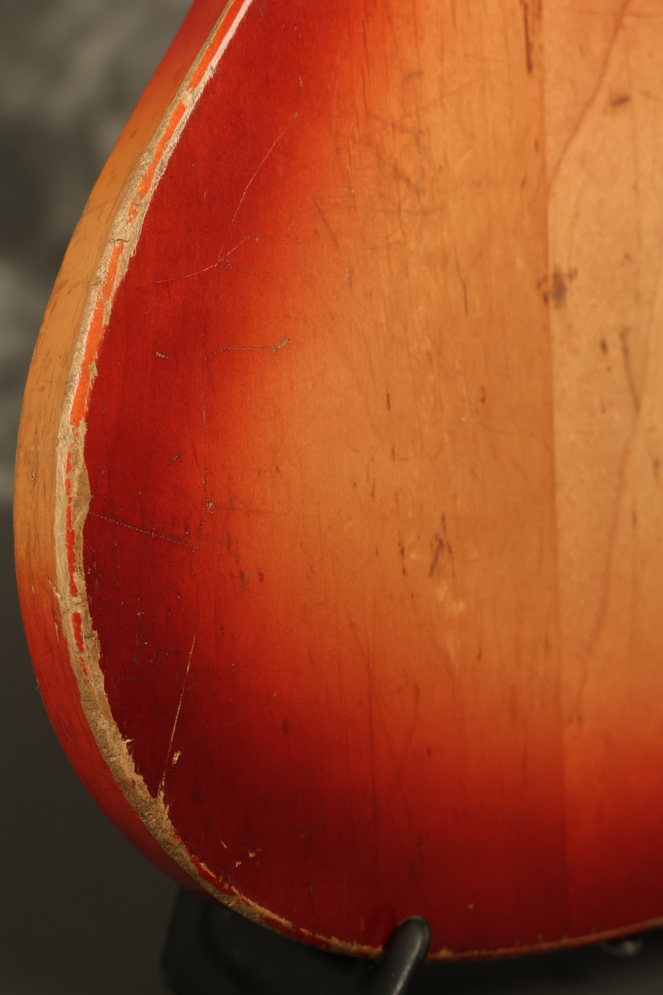 1963 Rickenbacker model 950 3/4 scale in its original Fireglo finish. It has a good playing neck with good frets. Parts that have been changed include the bridge, nut, pickguard screws, 2 tuning key screws, one pot, the capacitor, the jack and some of the wires. The pickups are original along with the 3-way rotary tone switch and a pot that dates to 1960. The original hardshell case is also included. A 3-digit number has been stamped into the back of the headstock. There are lots of nicks + dings, belt buckle wear, play wear and other cosmetic wear including some cracks in the pickguard. The guitar itself remains structurally sound. All electronics work and sound great.