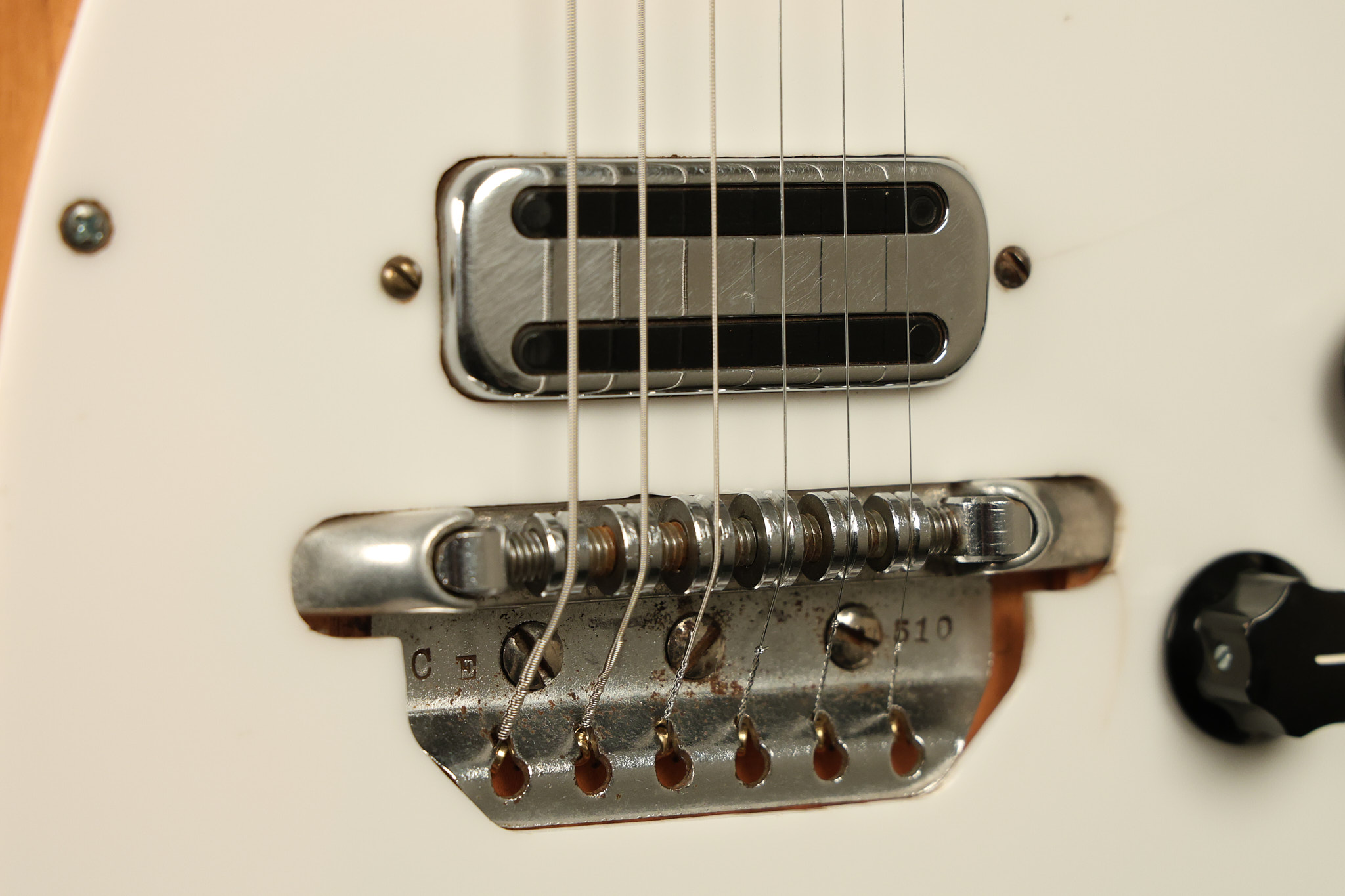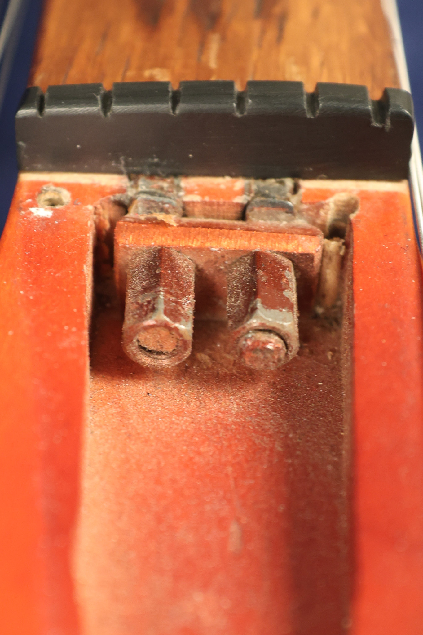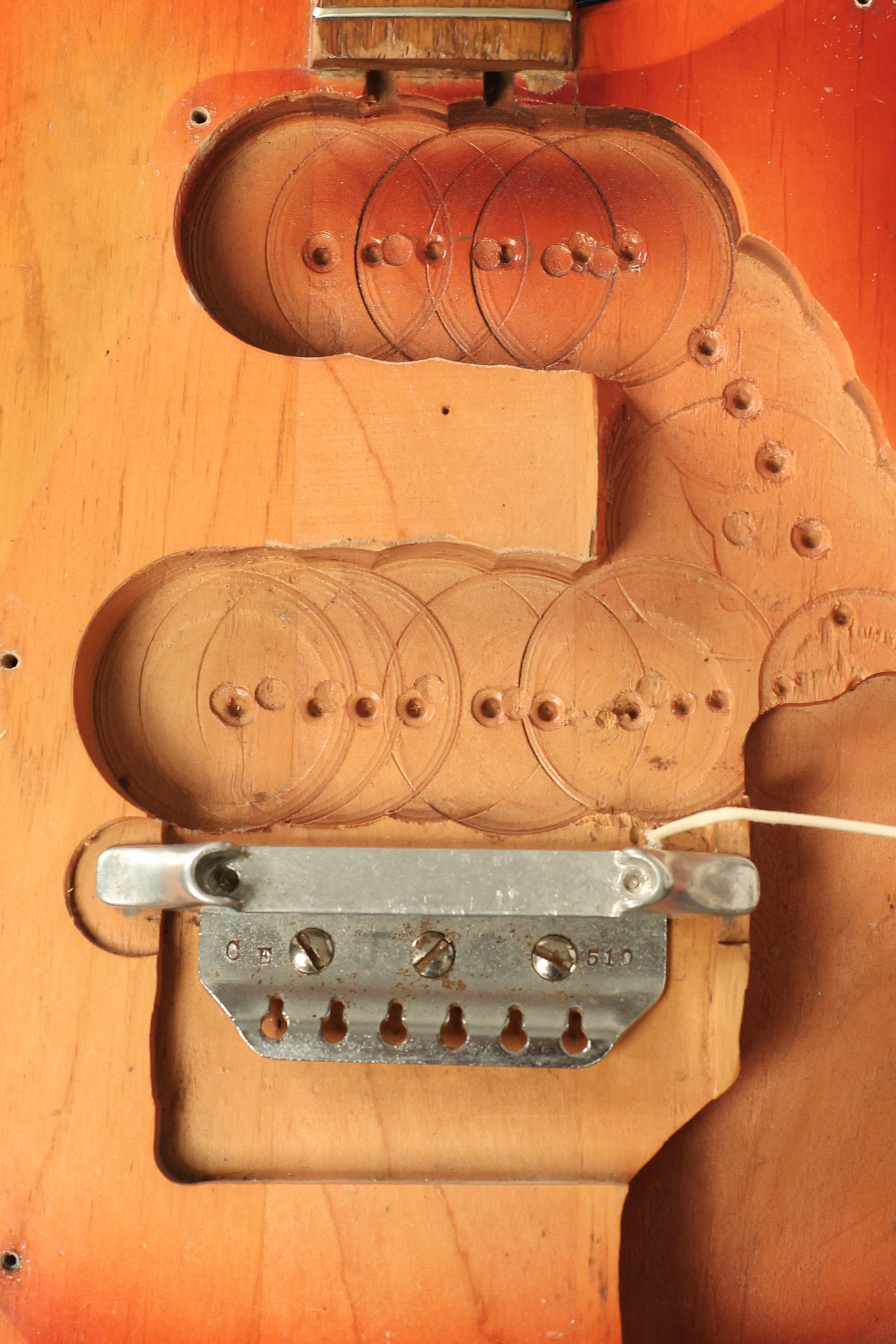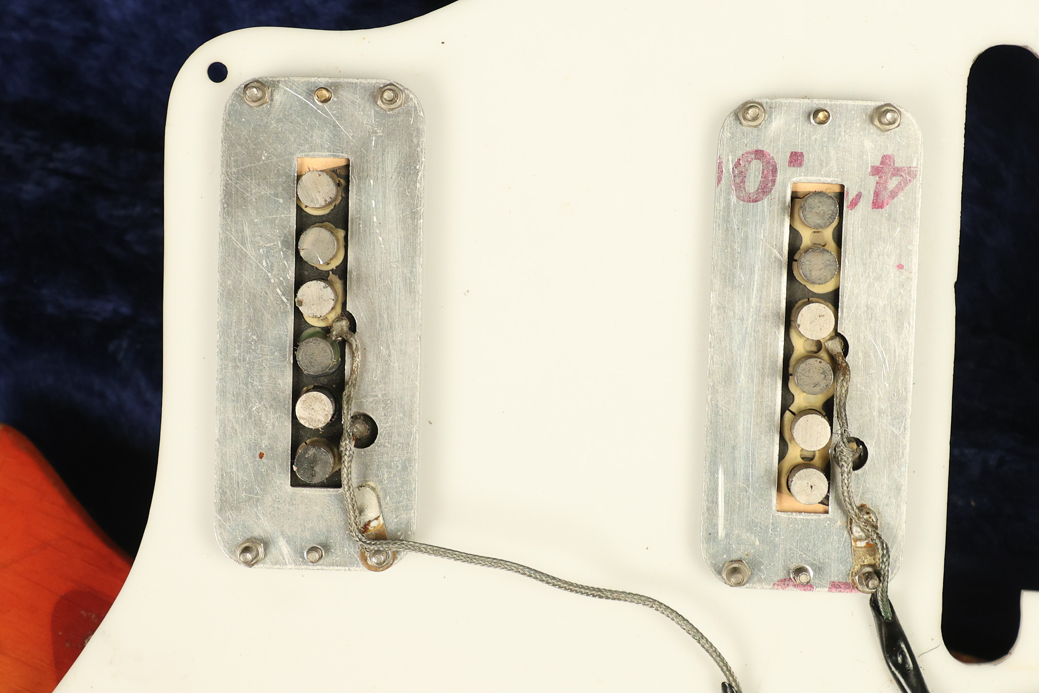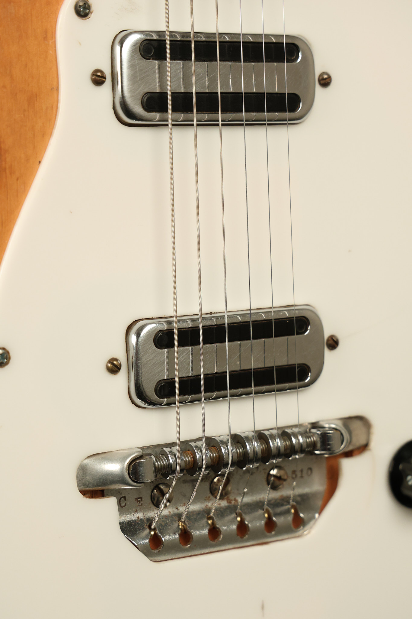 1963 Rickenbacker model 950 3/4 scale in its original Fireglo finish. It has a good playing neck with good frets. Parts that have been changed include the bridge, nut, pickguard screws, 2 tuning key screws, one pot, the capacitor, the jack and some of the wires. The pickups are original along with the 3-way rotary tone switch and a pot that dates to 1960. The original hardshell case is also included. A 3-digit number has been stamped into the back of the headstock. There are lots of nicks + dings, belt buckle wear, play wear and other cosmetic wear including some cracks in the pickguard. The guitar itself remains structurally sound. All electronics work and sound great.