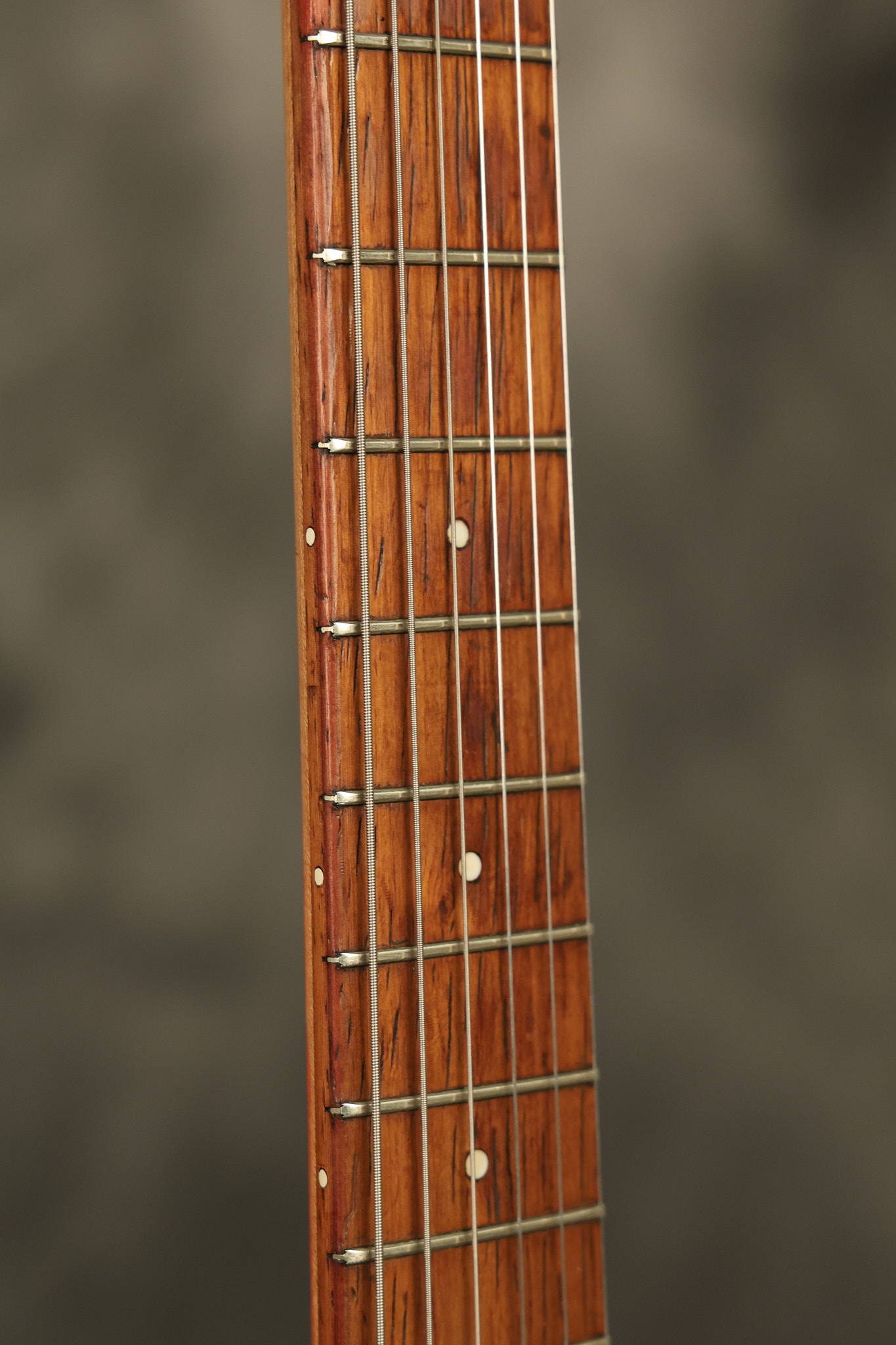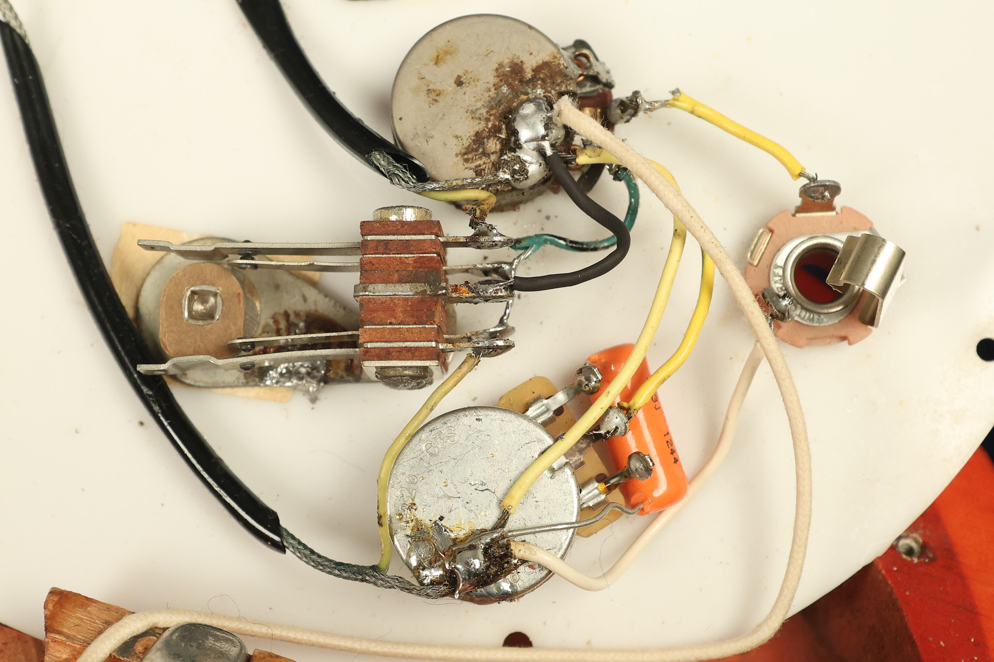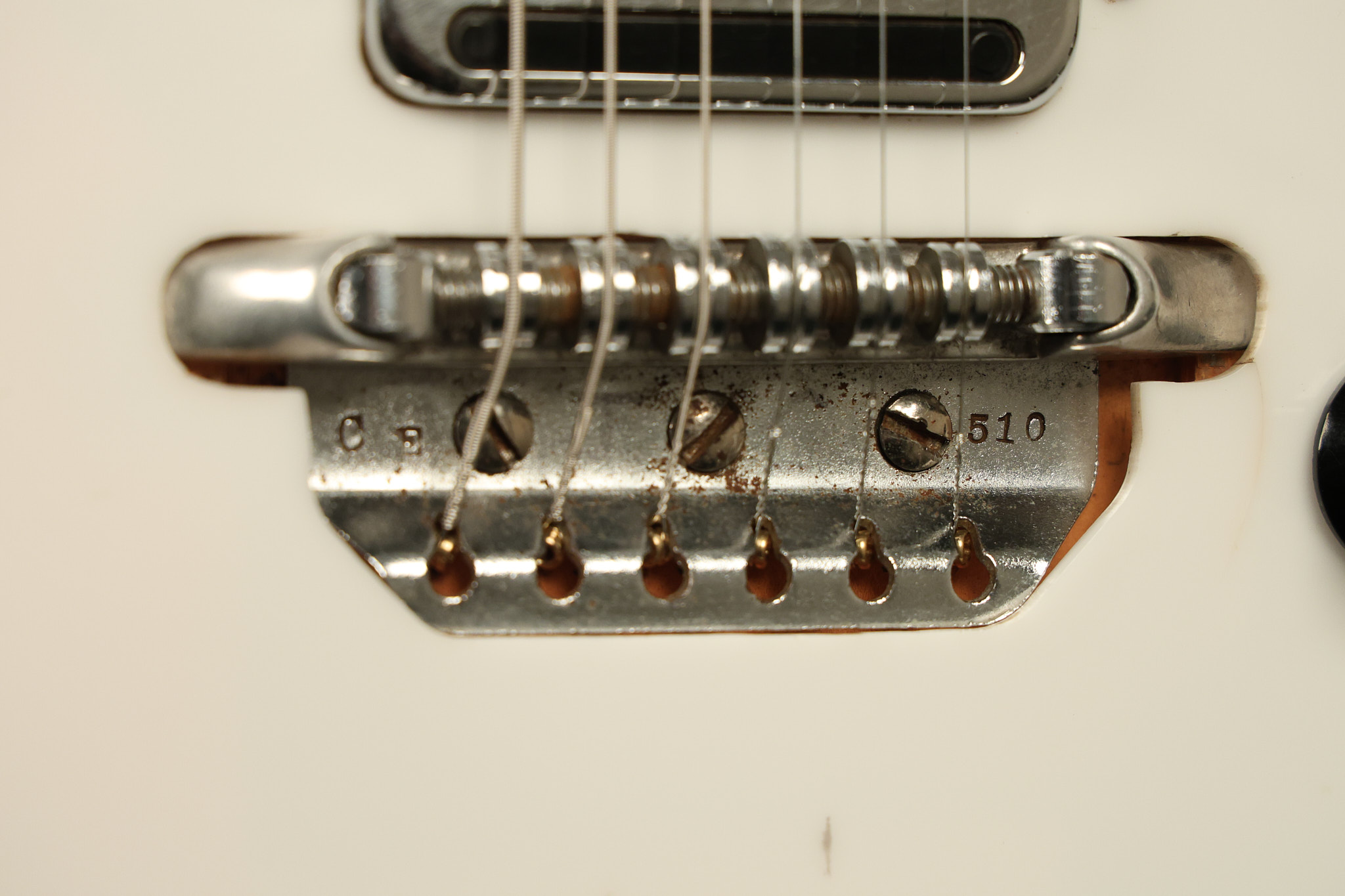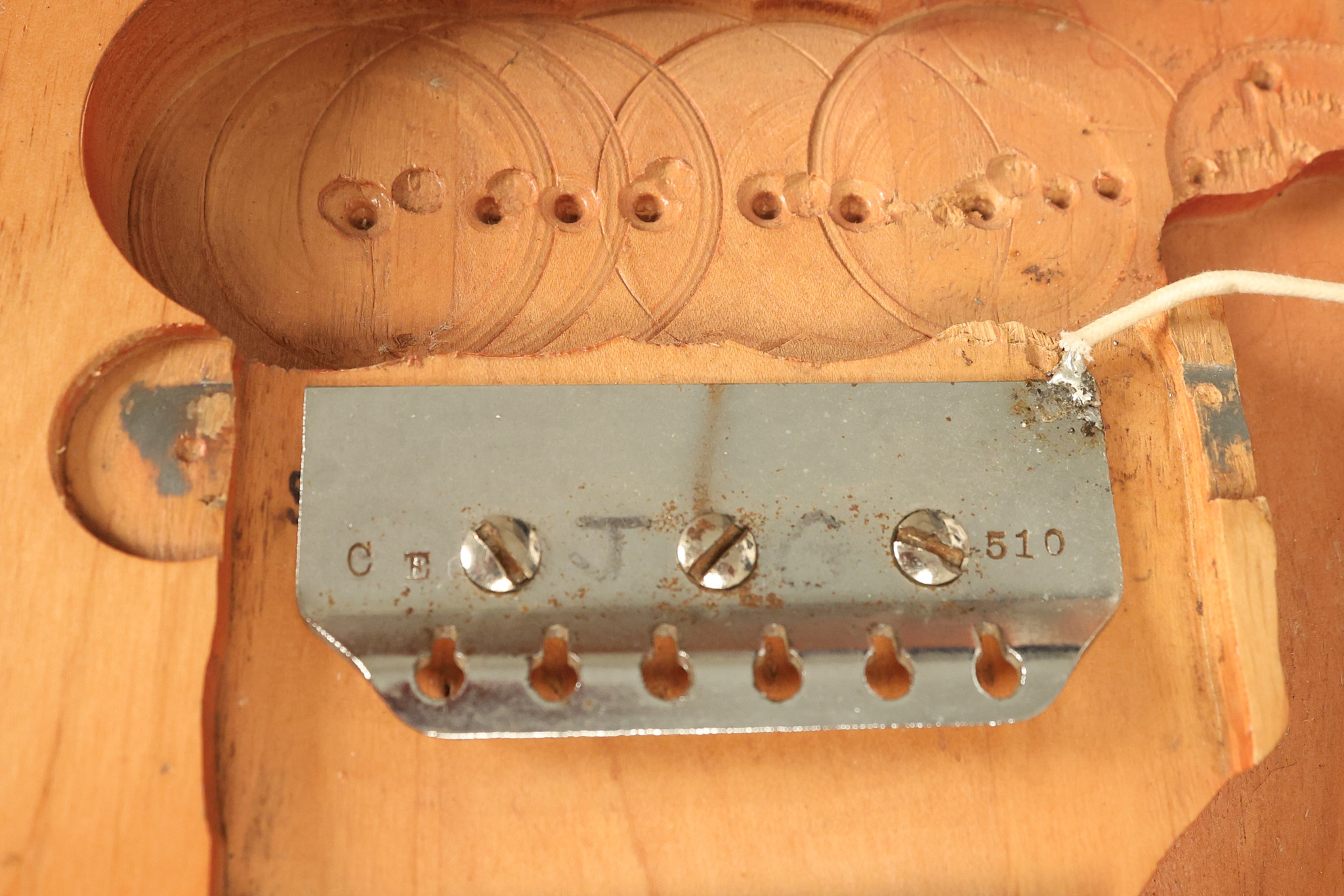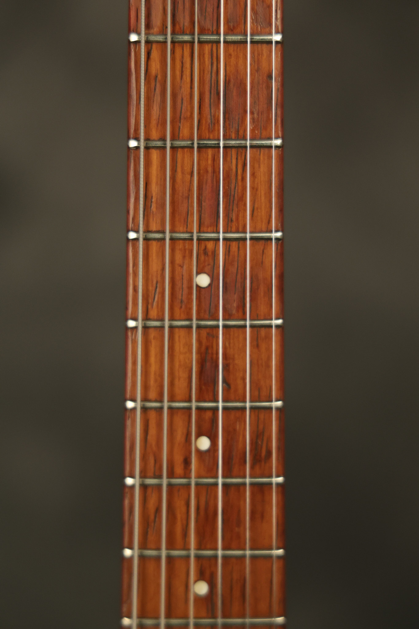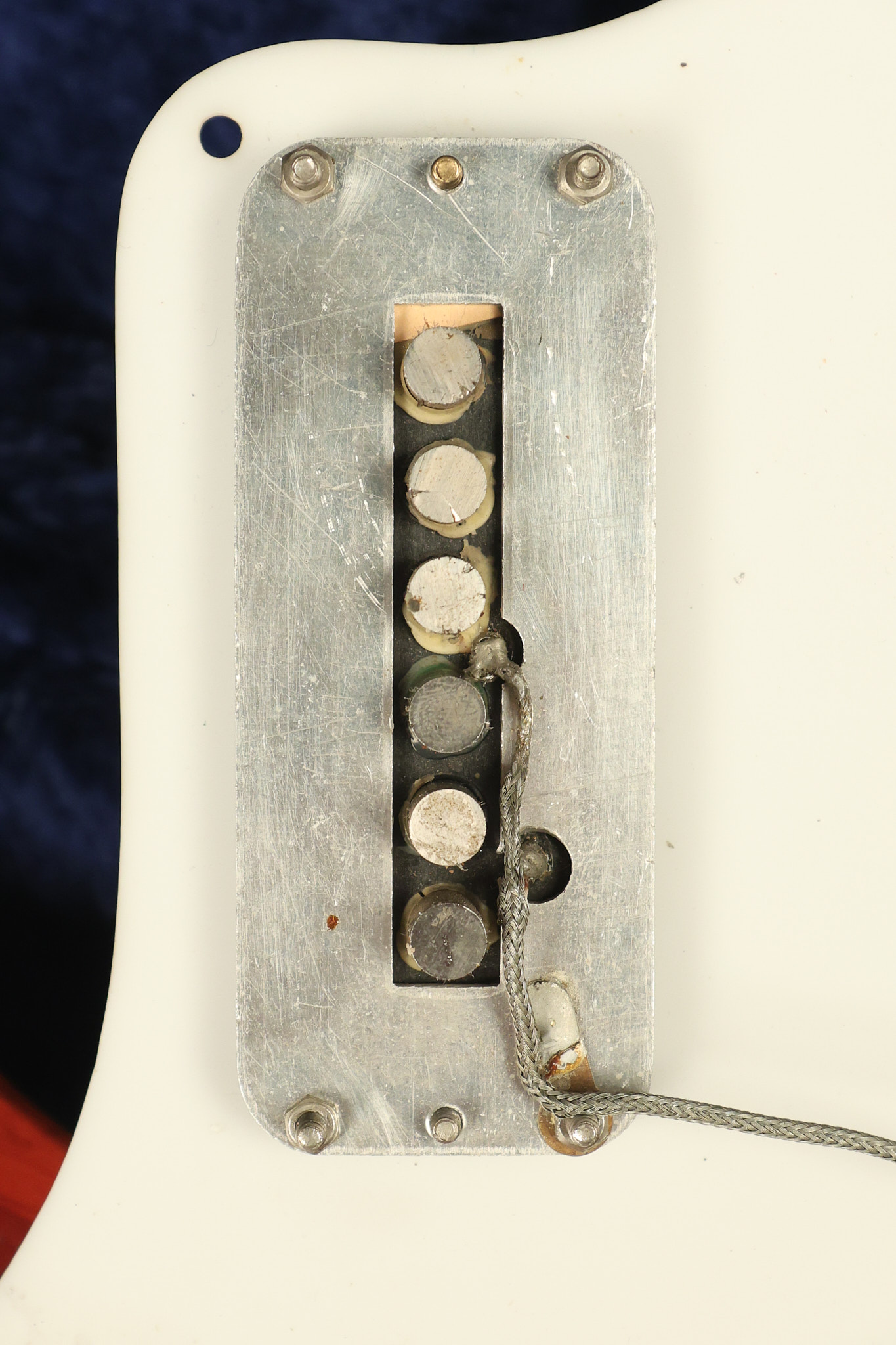 1963 Rickenbacker model 950 3/4 scale in its original Fireglo finish. It has a good playing neck with good frets. Parts that have been changed include the bridge, nut, pickguard screws, 2 tuning key screws, one pot, the capacitor, the jack and some of the wires. The pickups are original along with the 3-way rotary tone switch and a pot that dates to 1960. The original hardshell case is also included. A 3-digit number has been stamped into the back of the headstock. There are lots of nicks + dings, belt buckle wear, play wear and other cosmetic wear including some cracks in the pickguard. The guitar itself remains structurally sound. All electronics work and sound great.