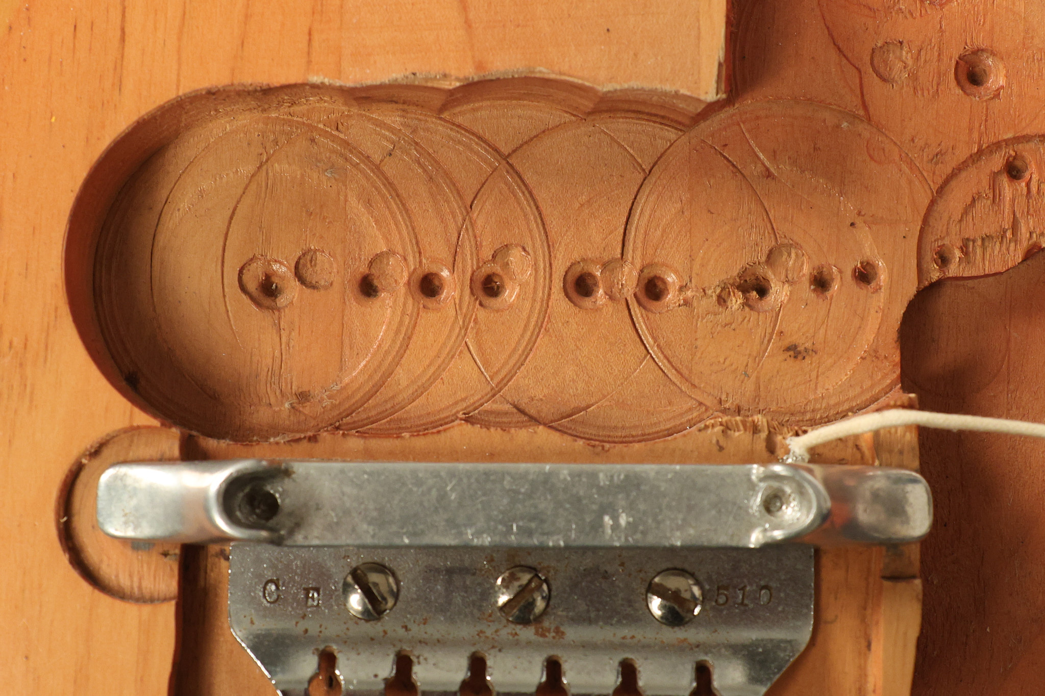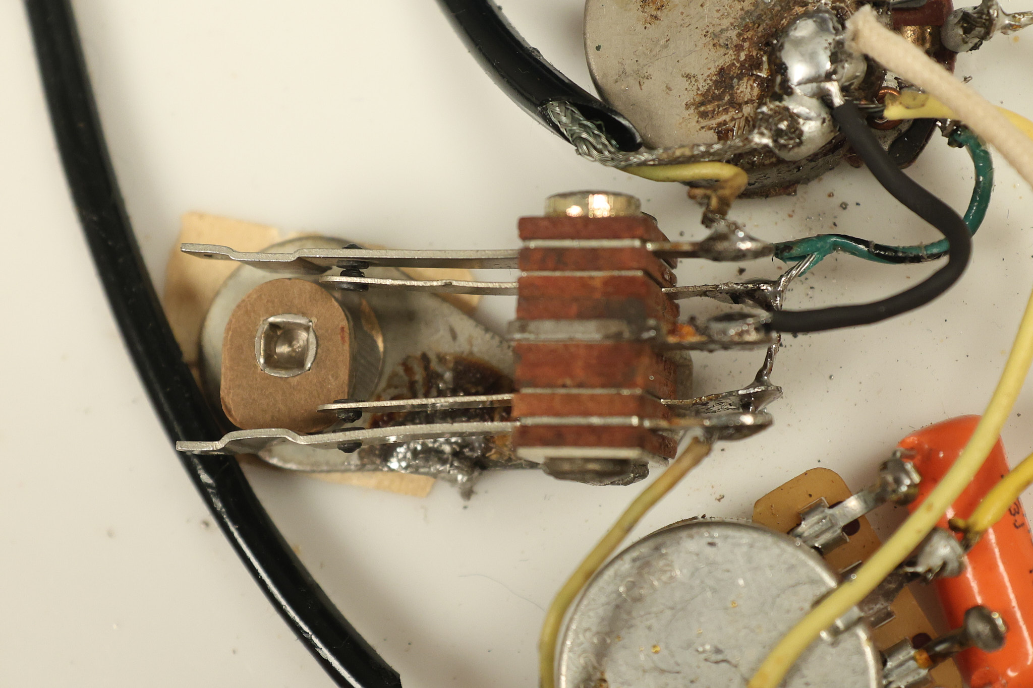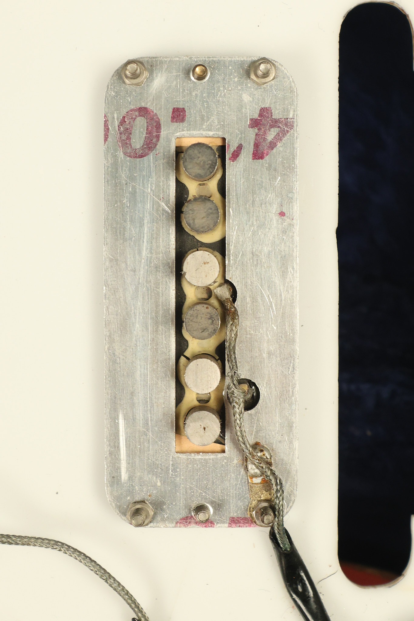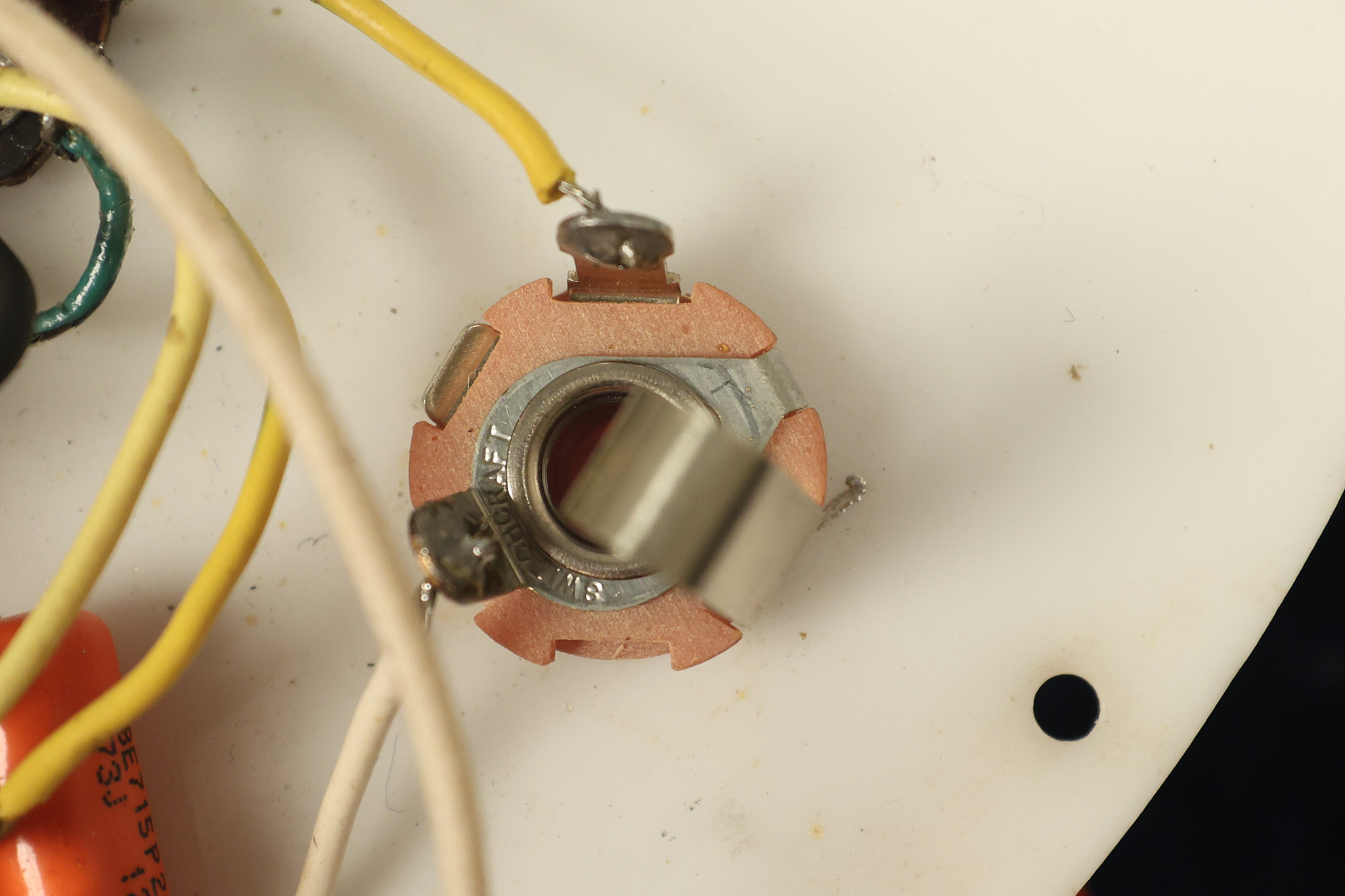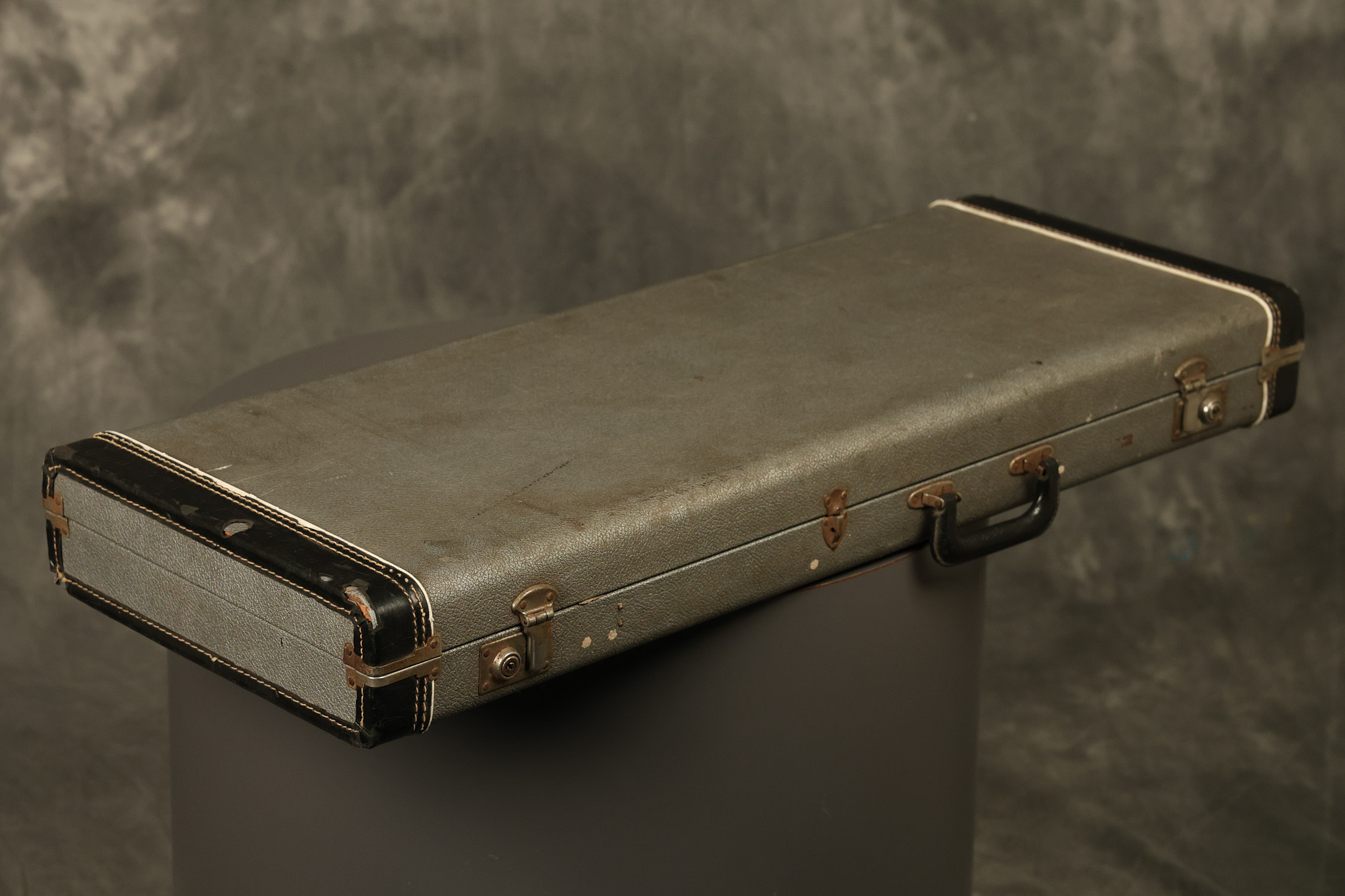 1963 Rickenbacker model 950 3/4 scale in its original Fireglo finish. It has a good playing neck with good frets. Parts that have been changed include the bridge, nut, pickguard screws, 2 tuning key screws, one pot, the capacitor, the jack and some of the wires. The pickups are original along with the 3-way rotary tone switch and a pot that dates to 1960. The original hardshell case is also included. A 3-digit number has been stamped into the back of the headstock. There are lots of nicks + dings, belt buckle wear, play wear and other cosmetic wear including some cracks in the pickguard. The guitar itself remains structurally sound. All electronics work and sound great.
