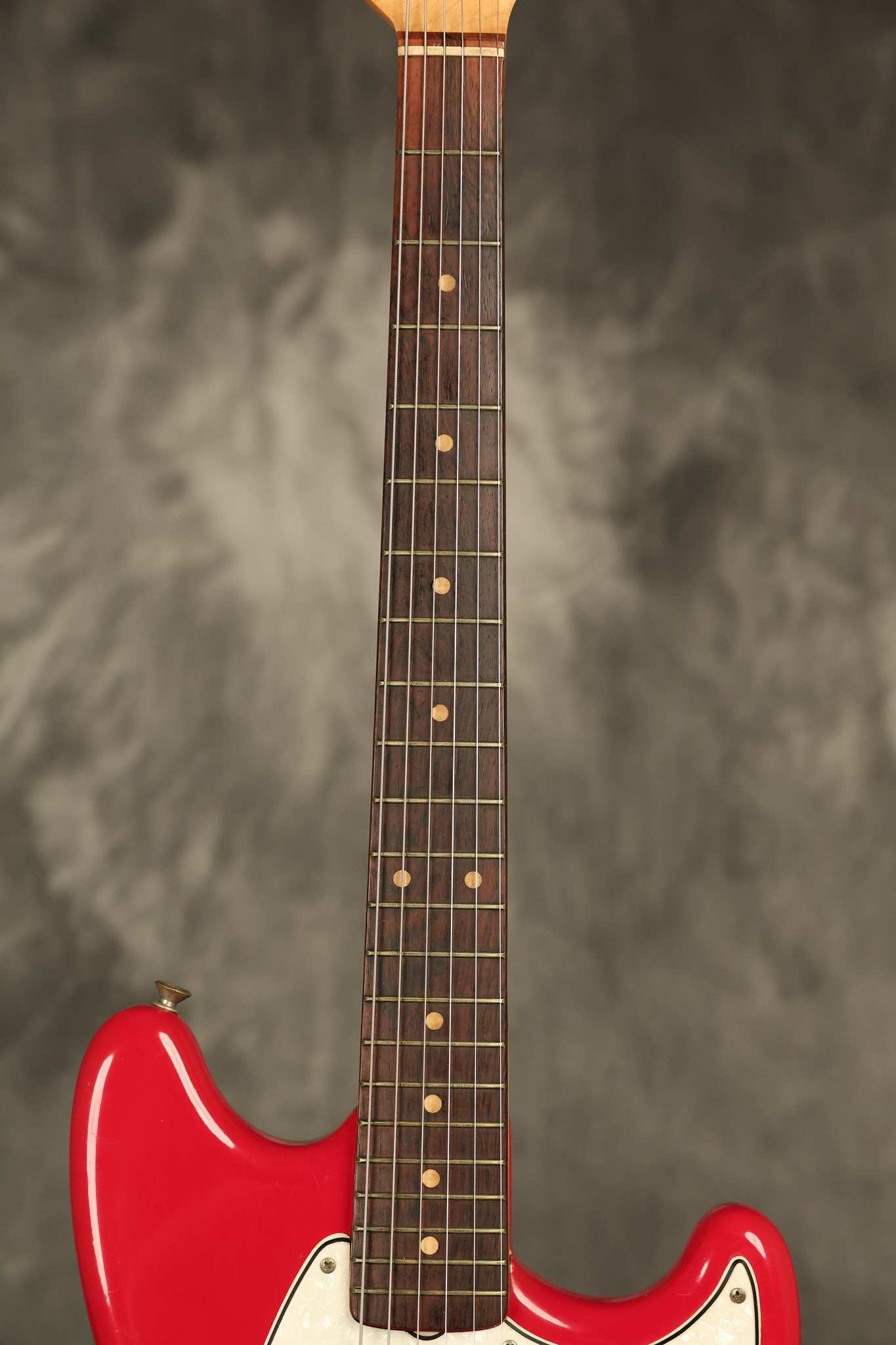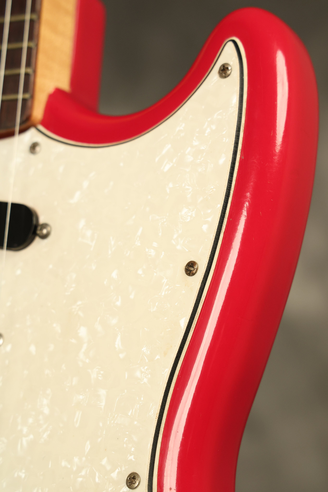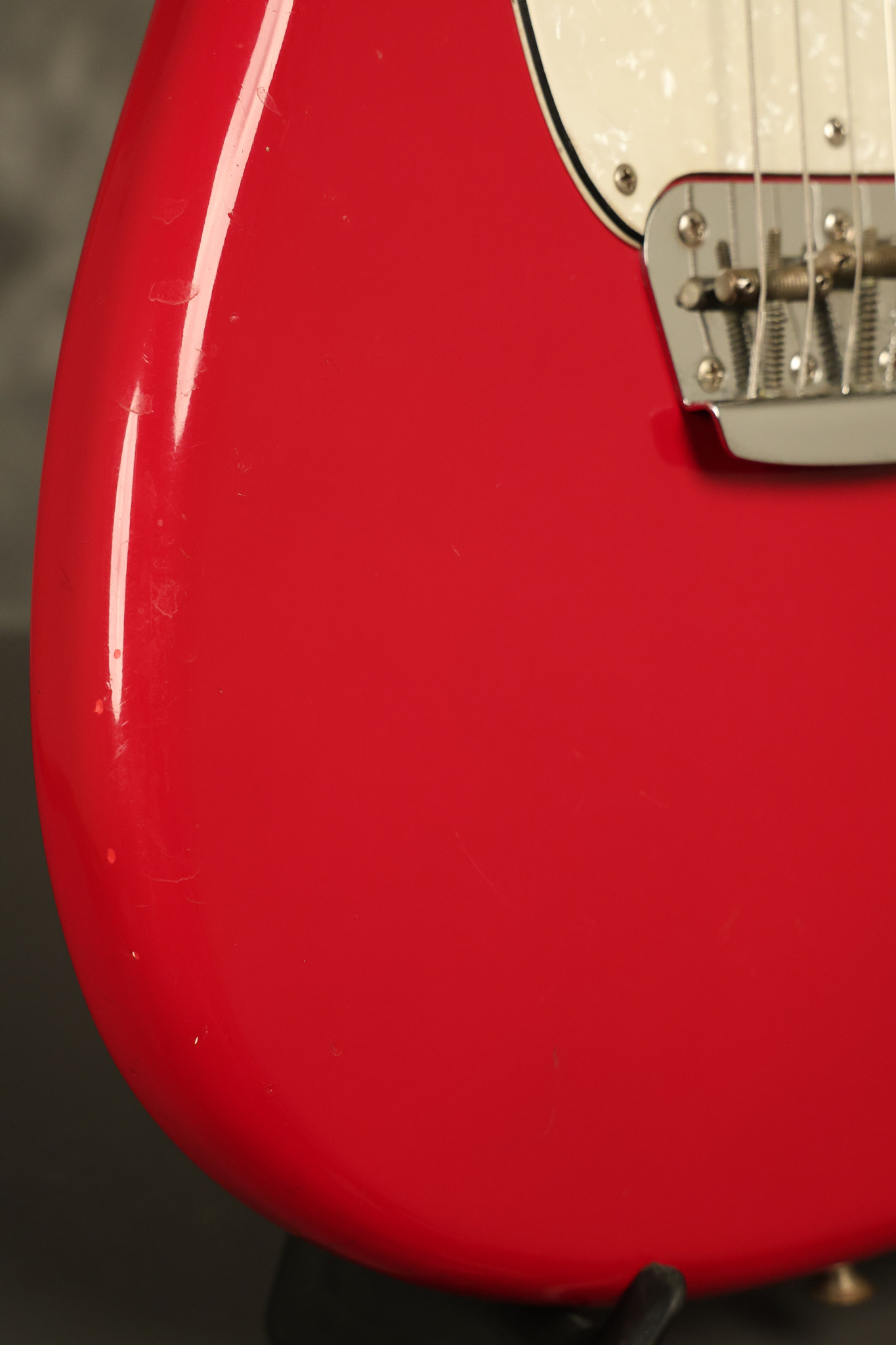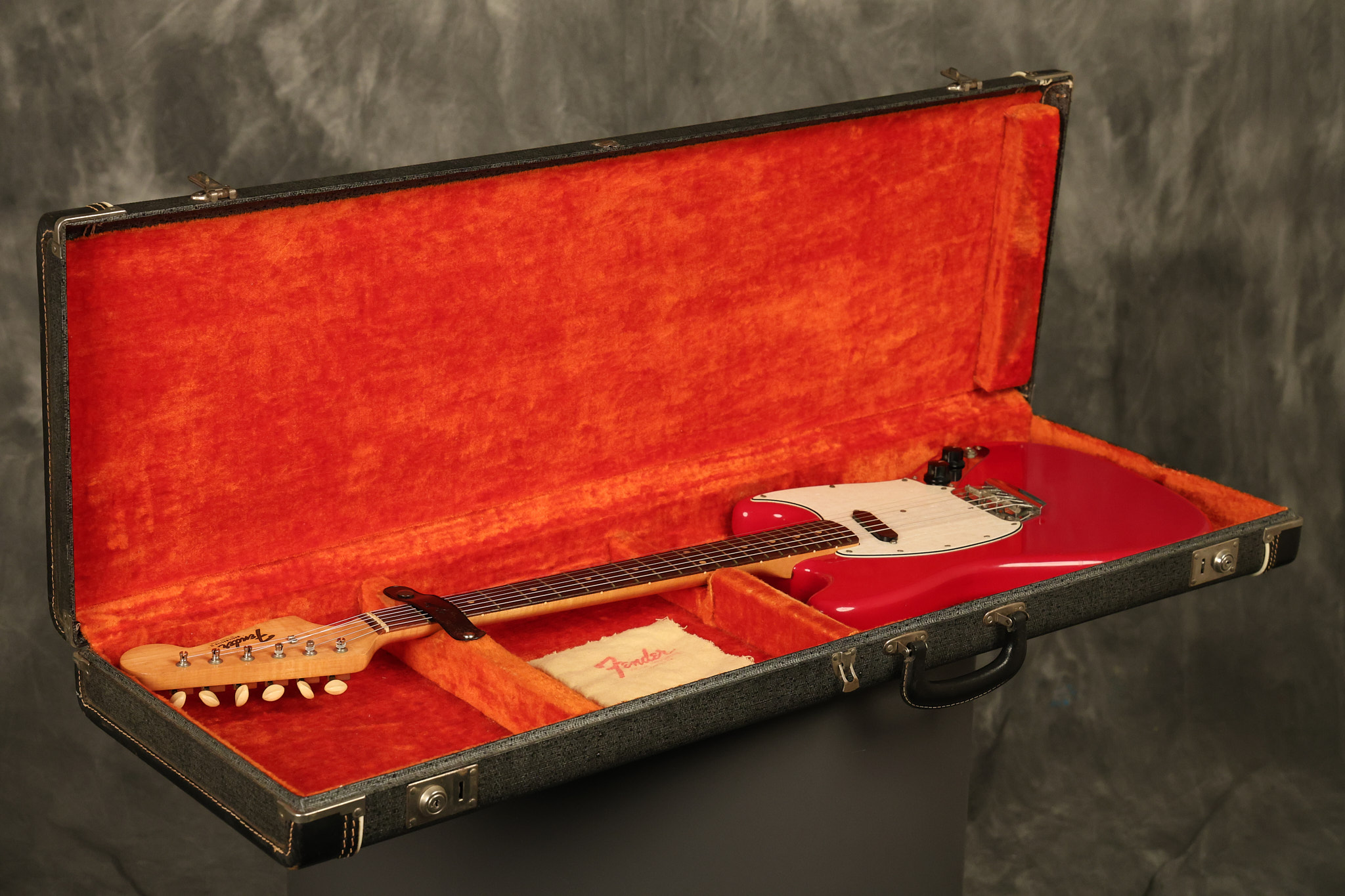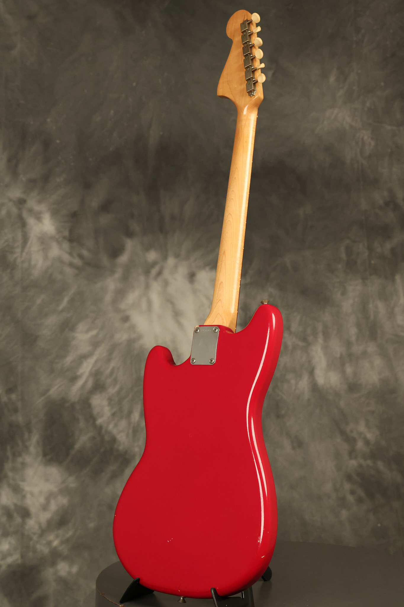 1964 Fender Musicmaster II in its original Red finish. It has a good playing neck with great frets. The 17th fret has significant fret buzz on the A string, but any other fret buzz is very minor. It's all original and 100% complete along with its original Fender polish cloth and original hardshell case. It's in very good condition with some nicks + dings, very minor finish checking and other minor cosmetic wear. Everything remains structurally sound with no cracks, breaks or repairs. All electronics work and sound great.