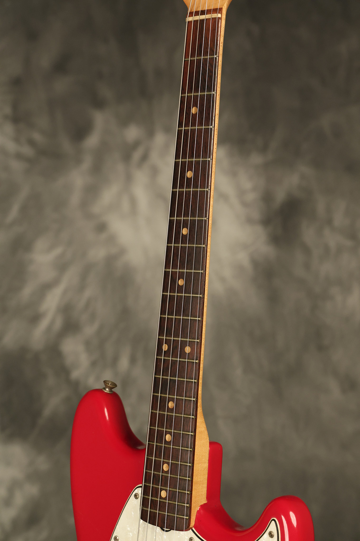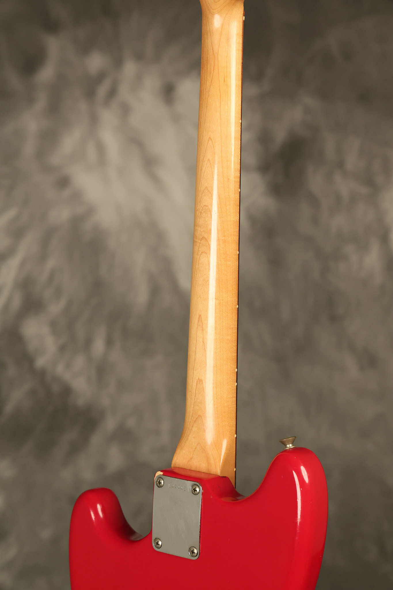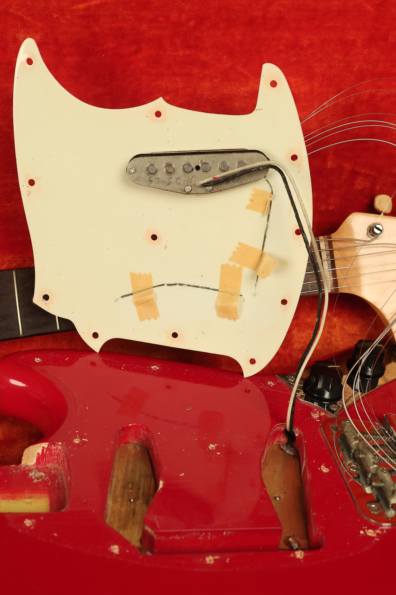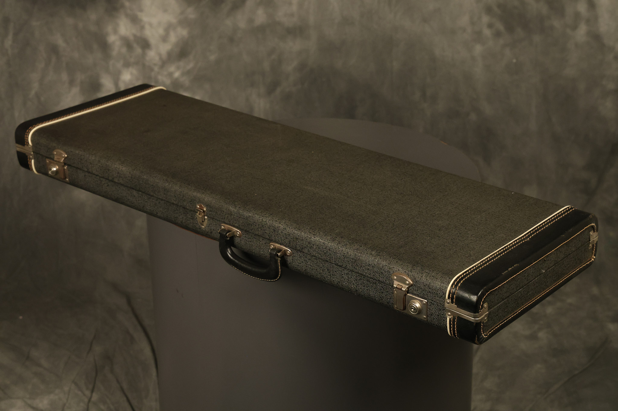 1964 Fender Musicmaster II in its original Red finish. It has a good playing neck with great frets. The 17th fret has significant fret buzz on the A string, but any other fret buzz is very minor. It's all original and 100% complete along with its original Fender polish cloth and original hardshell case. It's in very good condition with some nicks + dings, very minor finish checking and other minor cosmetic wear. Everything remains structurally sound with no cracks, breaks or repairs. All electronics work and sound great.