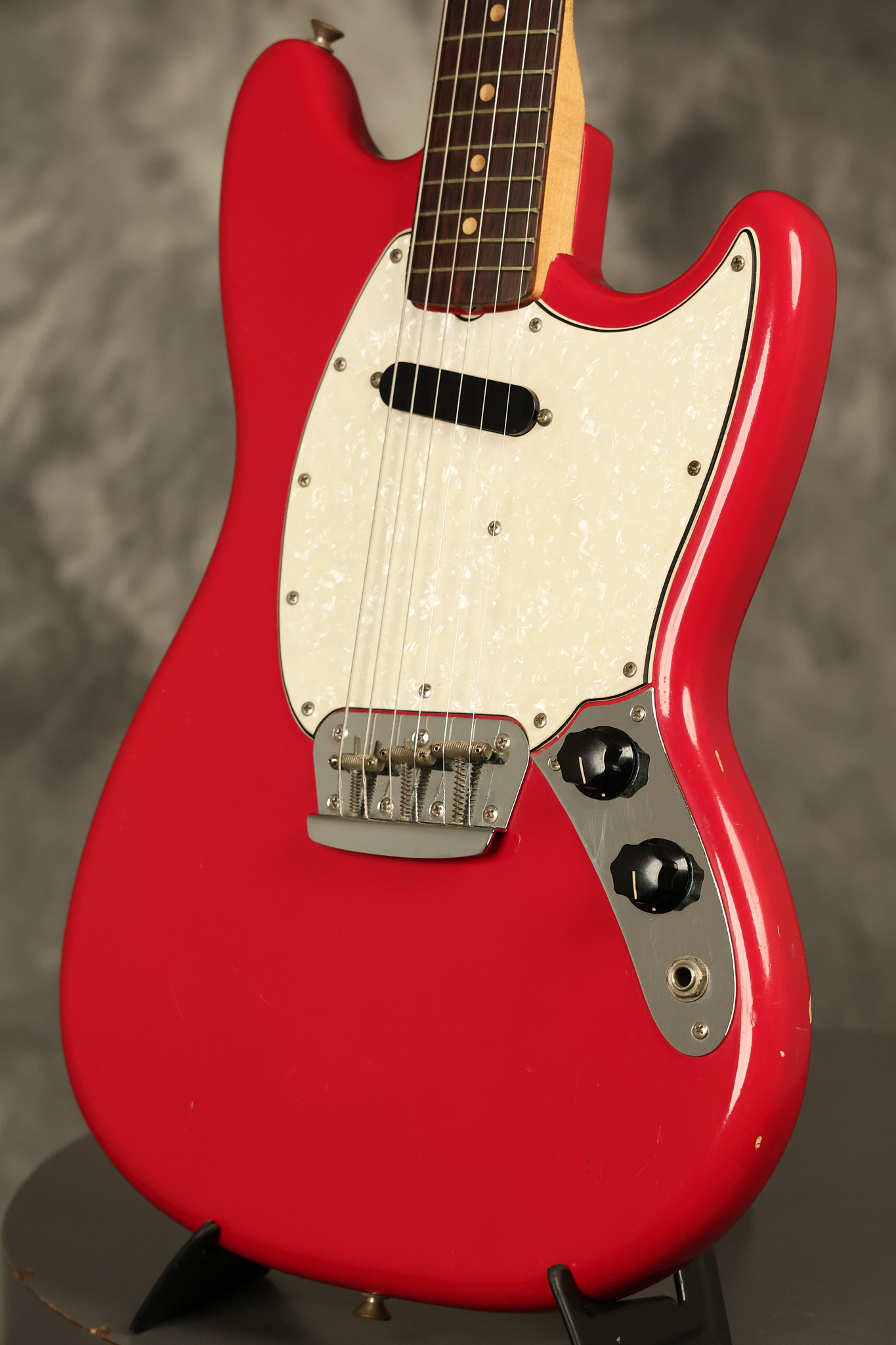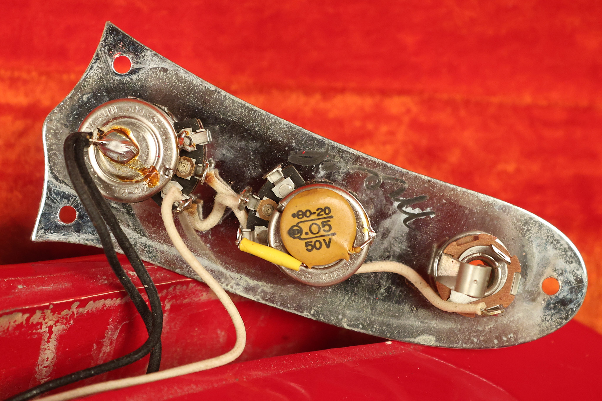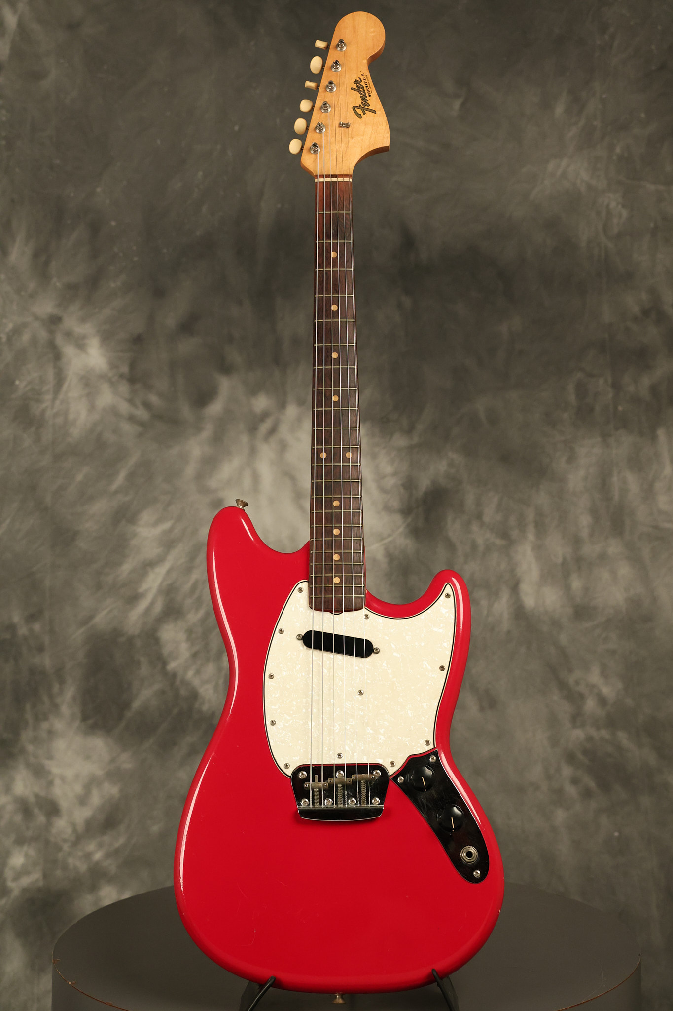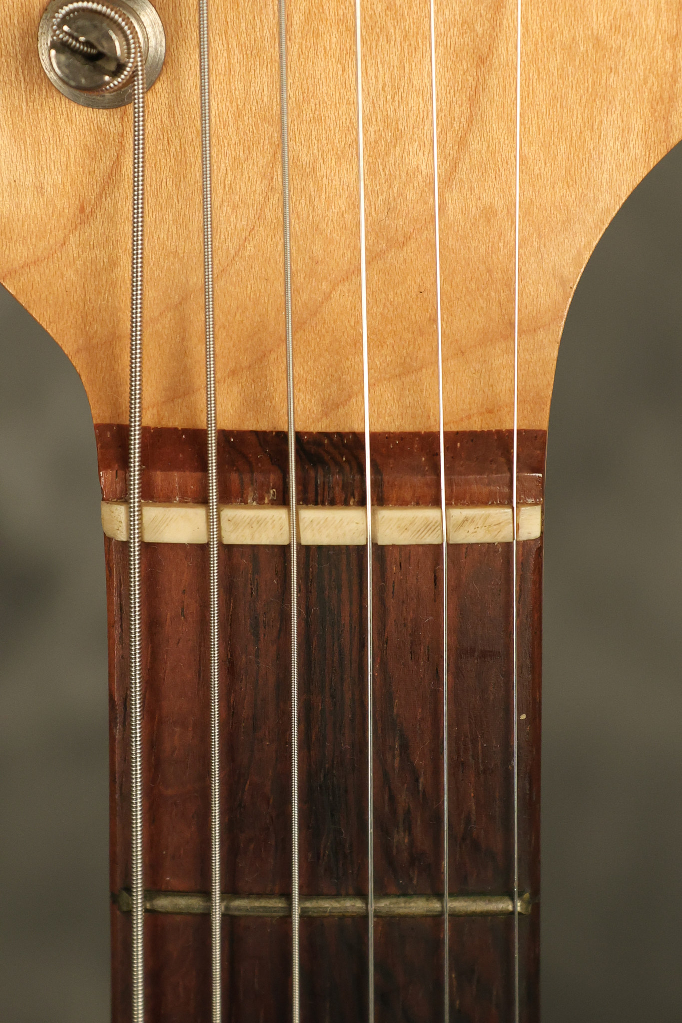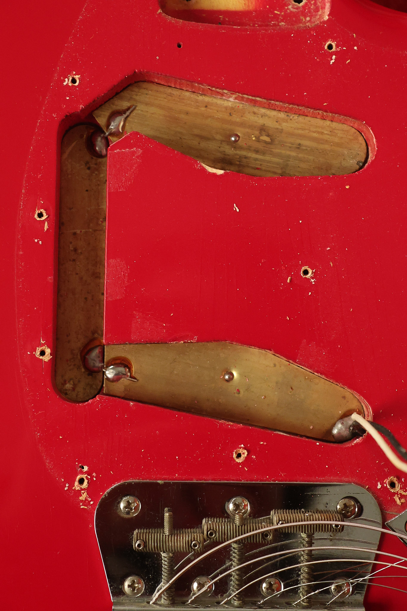 1964 Fender Musicmaster II in its original Red finish. It has a good playing neck with great frets. The 17th fret has significant fret buzz on the A string, but any other fret buzz is very minor. It's all original and 100% complete along with its original Fender polish cloth and original hardshell case. It's in very good condition with some nicks + dings, very minor finish checking and other minor cosmetic wear. Everything remains structurally sound with no cracks, breaks or repairs. All electronics work and sound great.
