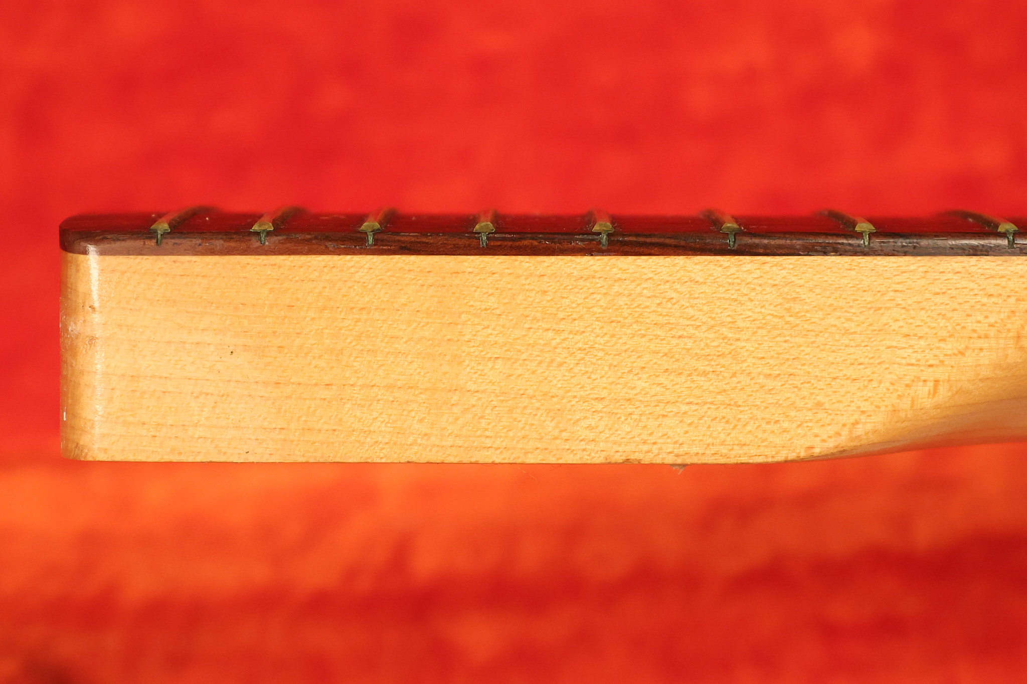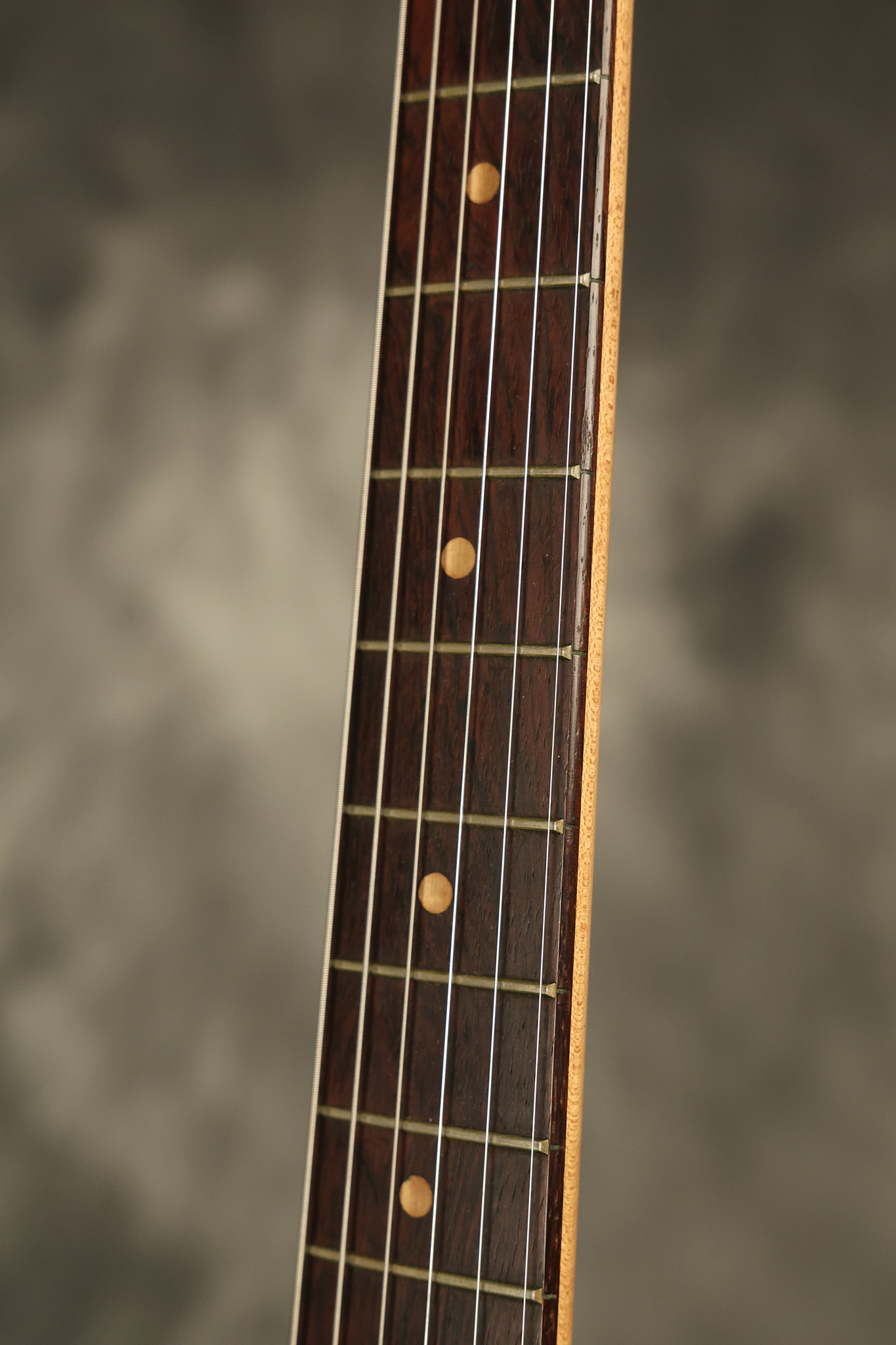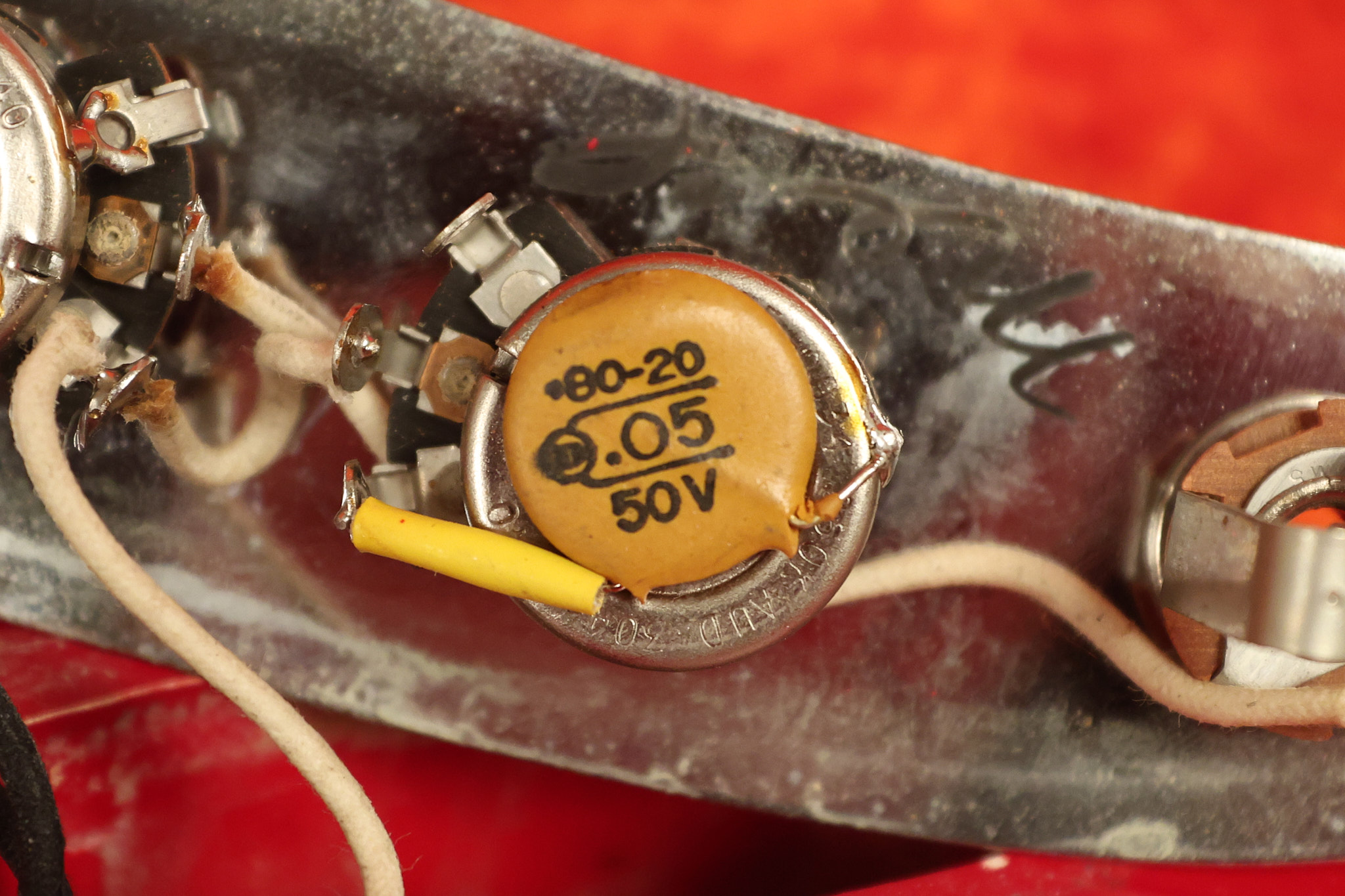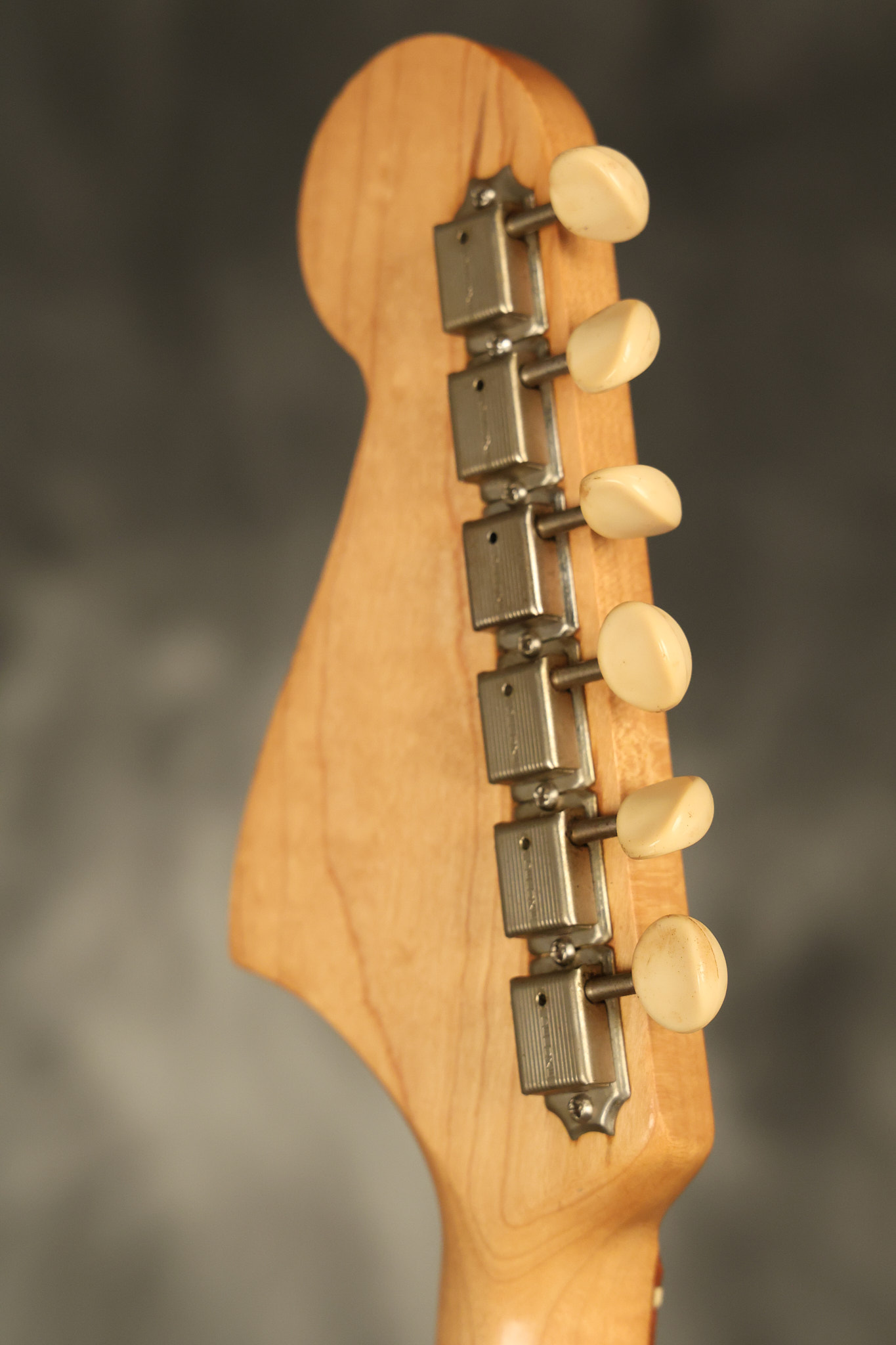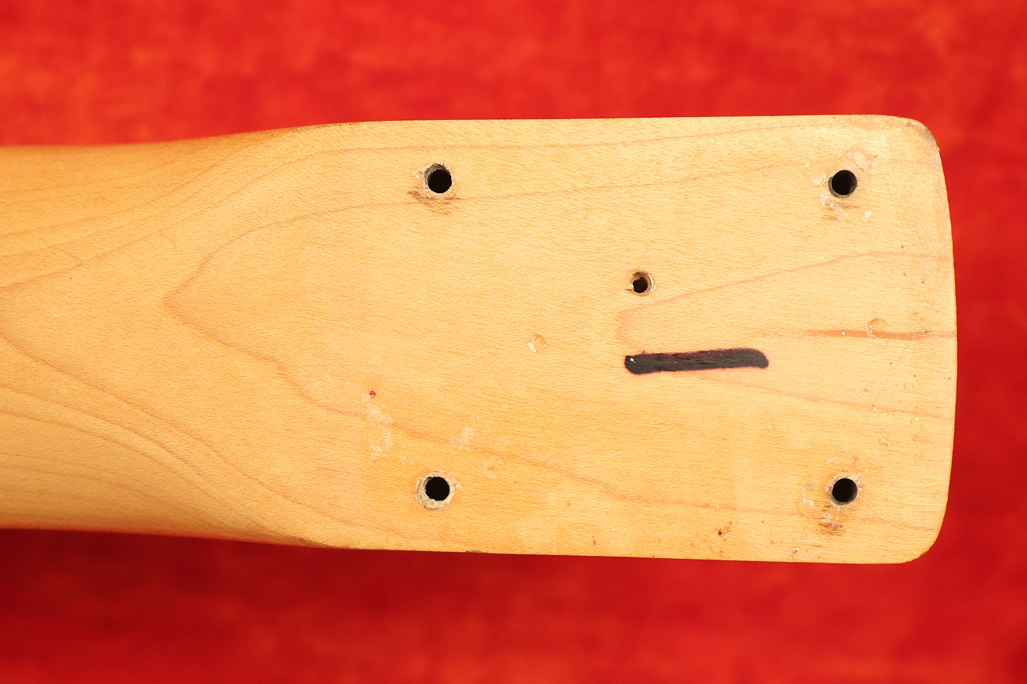1964 Fender Musicmaster II in its original Red finish. It has a good playing neck with great frets. The 17th fret has significant fret buzz on the A string, but any other fret buzz is very minor. It's all original and 100% complete along with its original Fender polish cloth and original hardshell case. It's in very good condition with some nicks + dings, very minor finish checking and other minor cosmetic wear. Everything remains structurally sound with no cracks, breaks or repairs. All electronics work and sound great.
