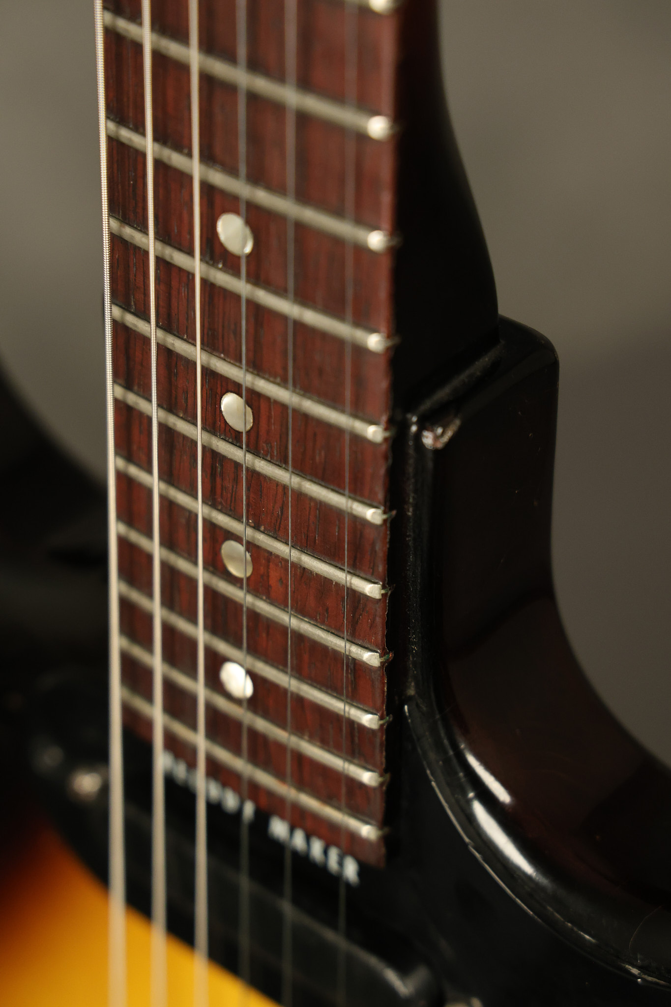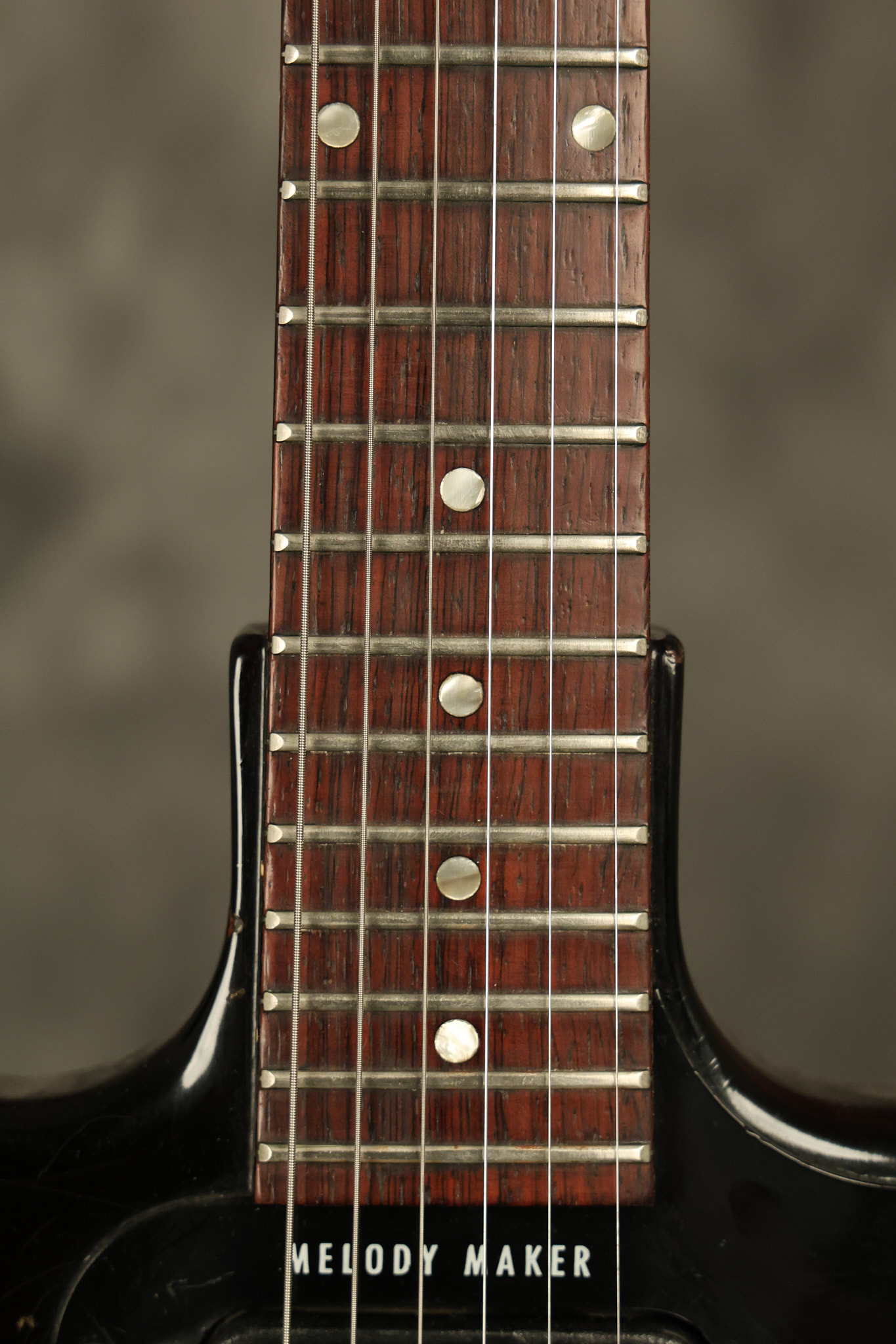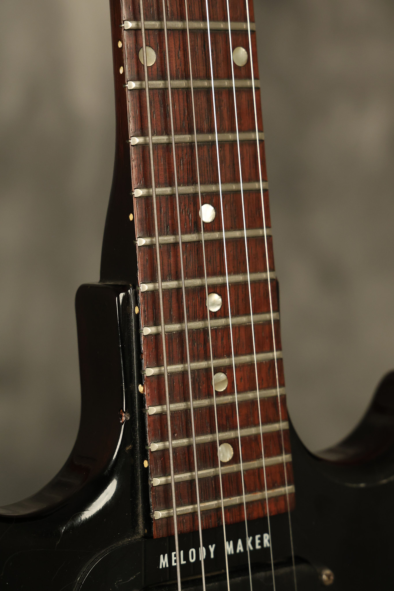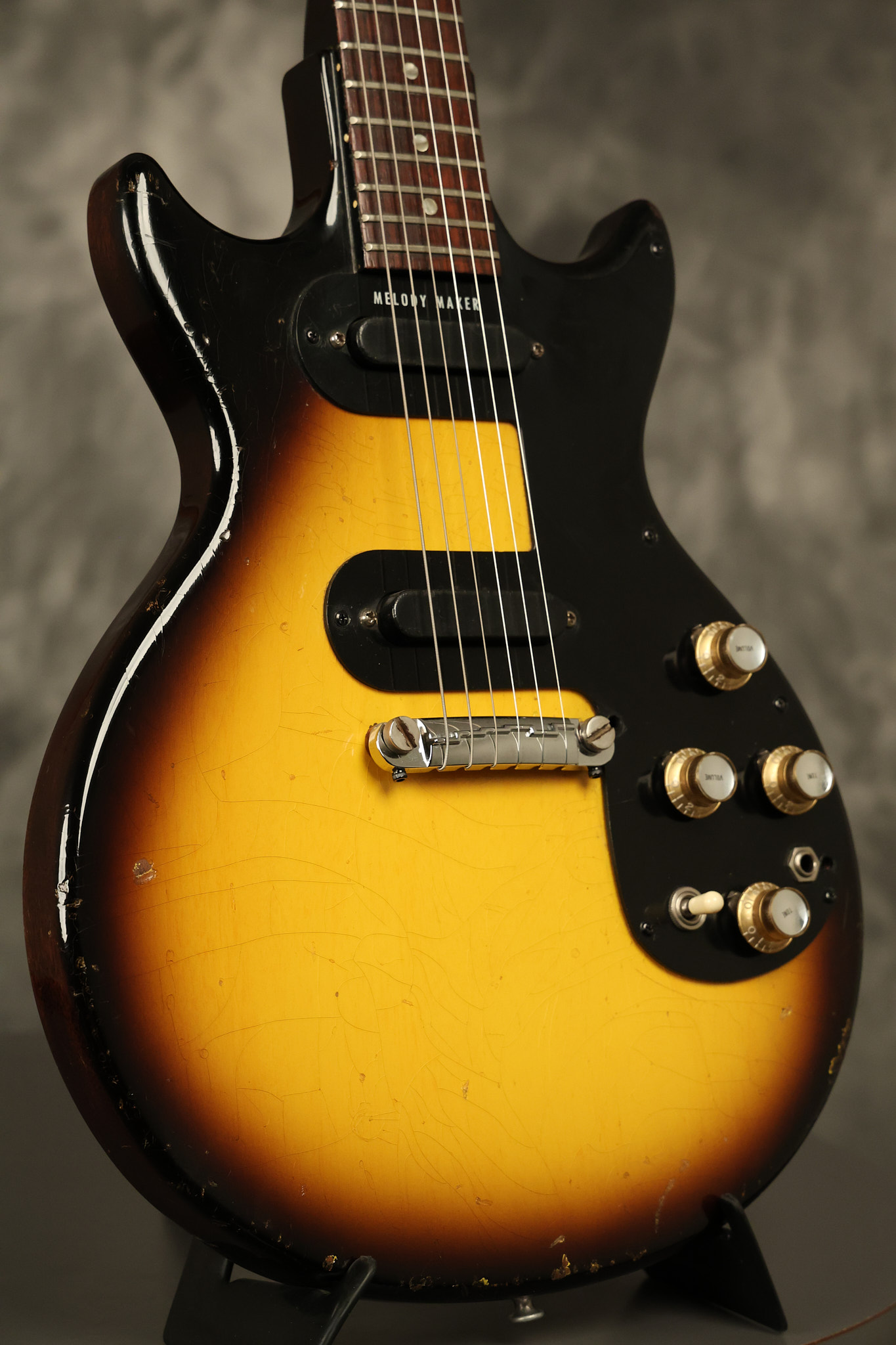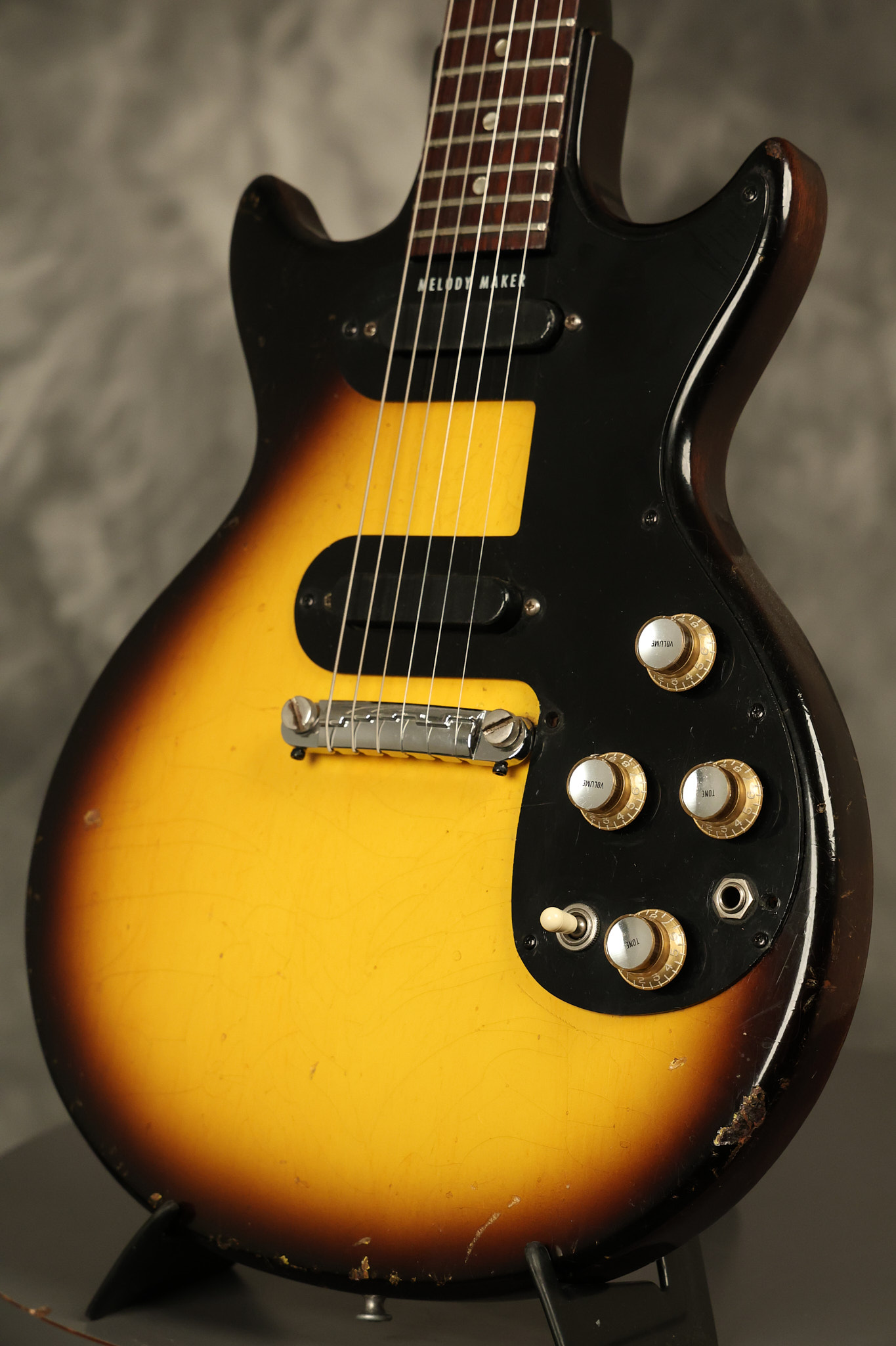1964 Gibson Melody Maker D in sunburst. It has a great playing C-shaped neck, that is .845" at the 1st fret, and 1.050" at the 12th. The original frets still have a good amount of life left. The pickups are original and sound great, but there have been several changes made to this guitar, which include a changed capacitor, along with some changed wiring, the tailpiece (it is a chrome late '60's with changed adjustment screws), pickguard screws, along with some extra holes in the pickguard, the switch tip, nut, knobs, strap buttons, truss rod cover screws, and tuning key screws. The tuning keys are original, but the D and G tuners are slightly bent, but still function well. The body underneath the pickguard has chipped in a couple of places, hence the extra holes in the pickguard. Everything functions well and properly. There have been no cracks, breaks, repairs. Comes with a non-original vintage chipboard case.