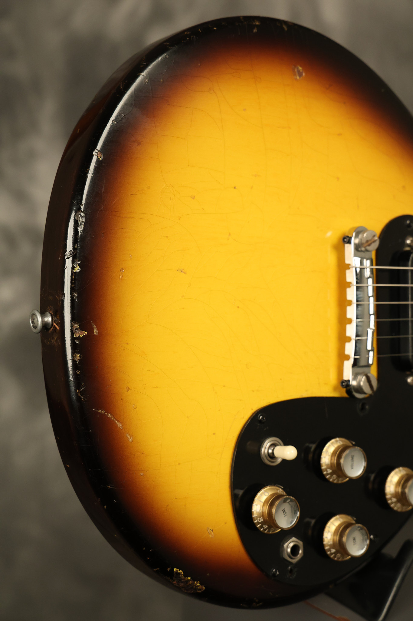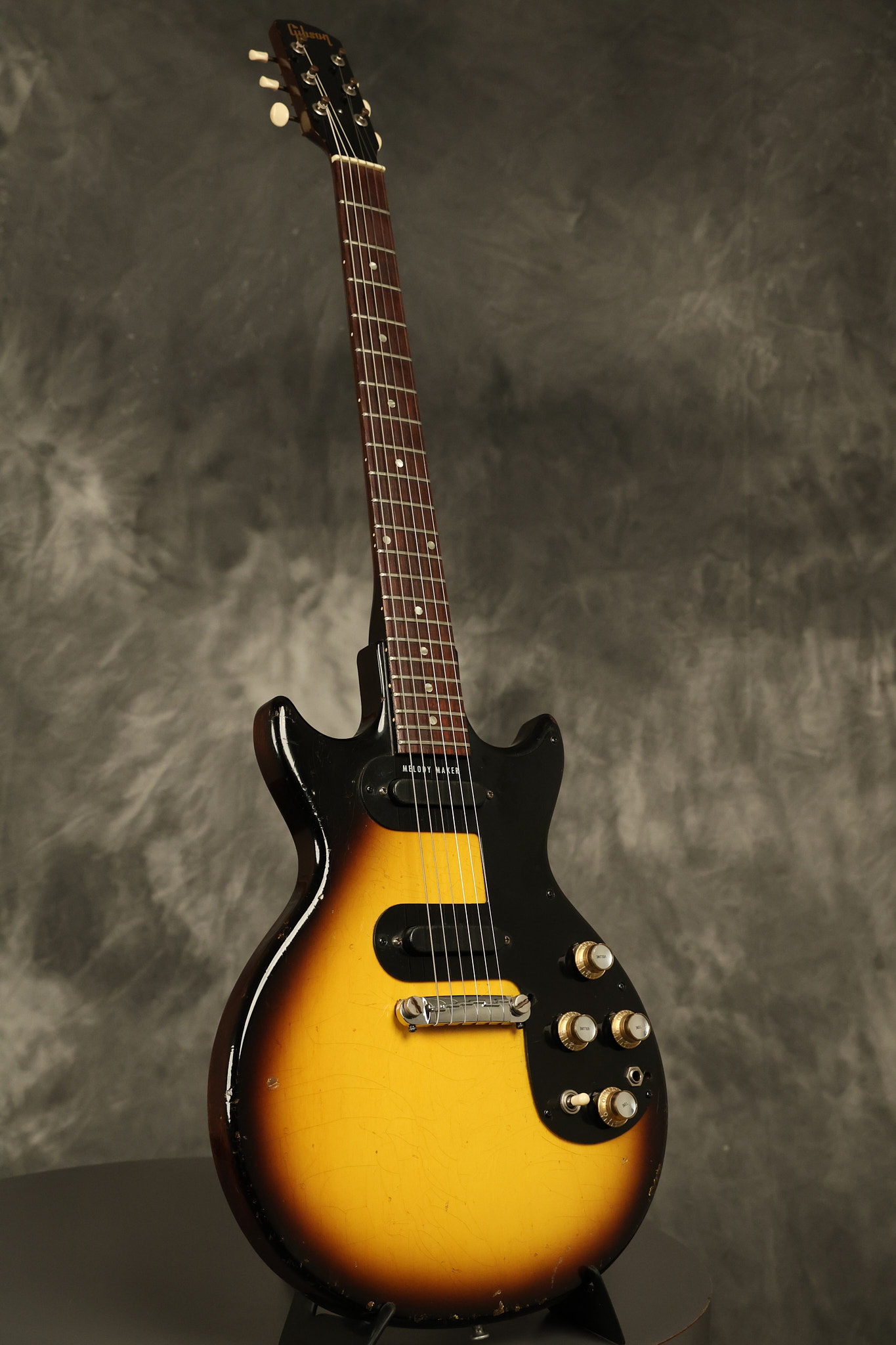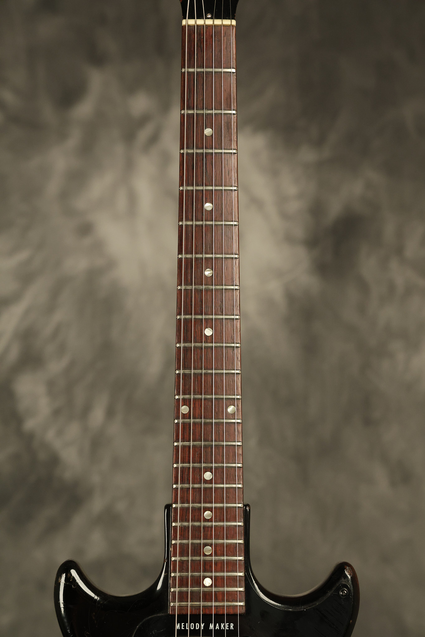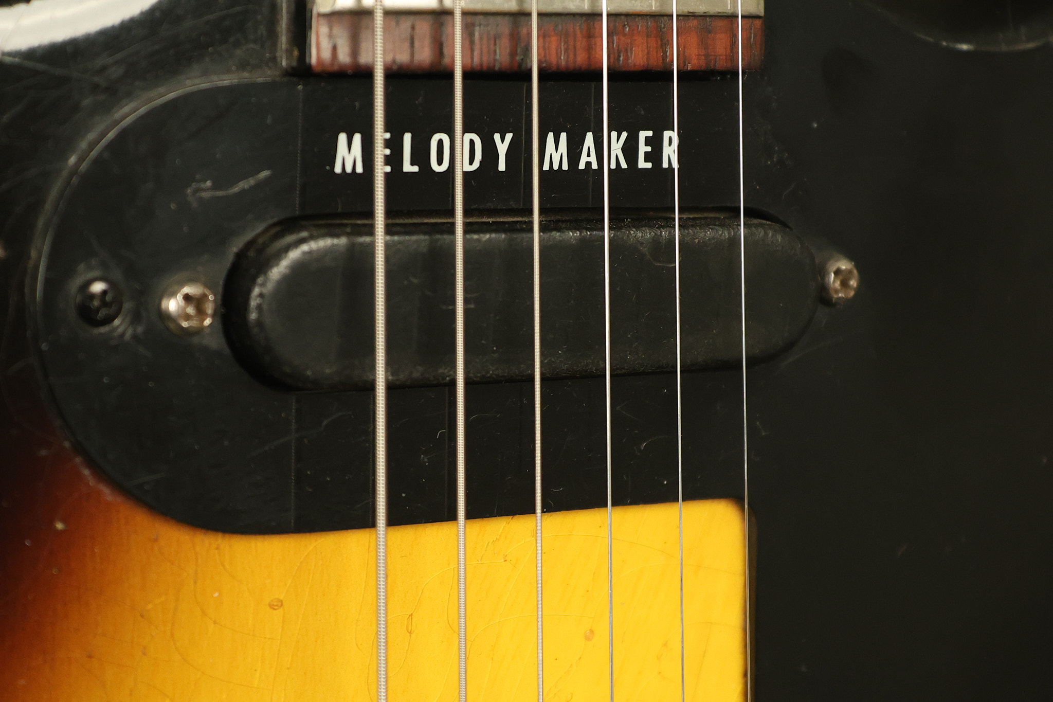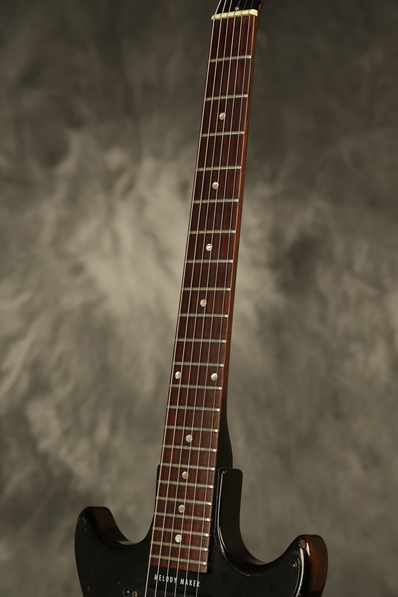1964 Gibson Melody Maker D in sunburst. It has a great playing C-shaped neck, that is .845" at the 1st fret, and 1.050" at the 12th. The original frets still have a good amount of life left. The pickups are original and sound great, but there have been several changes made to this guitar, which include a changed capacitor, along with some changed wiring, the tailpiece (it is a chrome late '60's with changed adjustment screws), pickguard screws, along with some extra holes in the pickguard, the switch tip, nut, knobs, strap buttons, truss rod cover screws, and tuning key screws. The tuning keys are original, but the D and G tuners are slightly bent, but still function well. The body underneath the pickguard has chipped in a couple of places, hence the extra holes in the pickguard. Everything functions well and properly. There have been no cracks, breaks, repairs. Comes with a non-original vintage chipboard case.