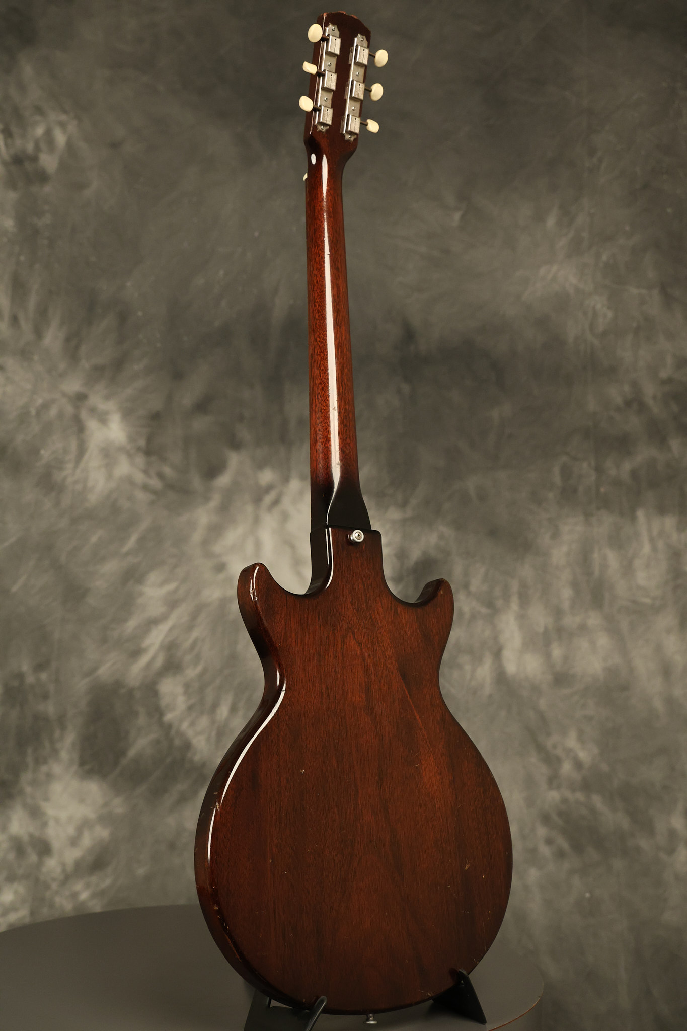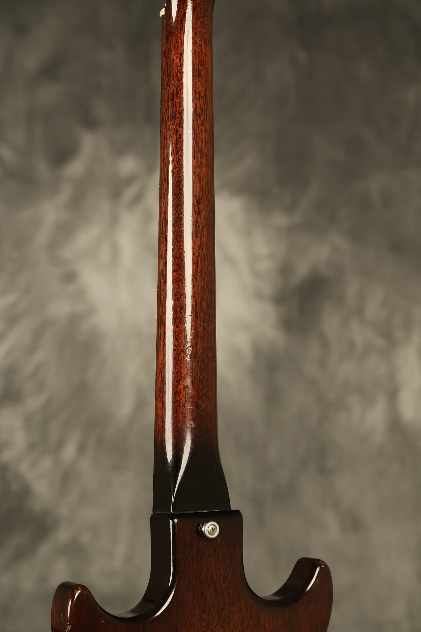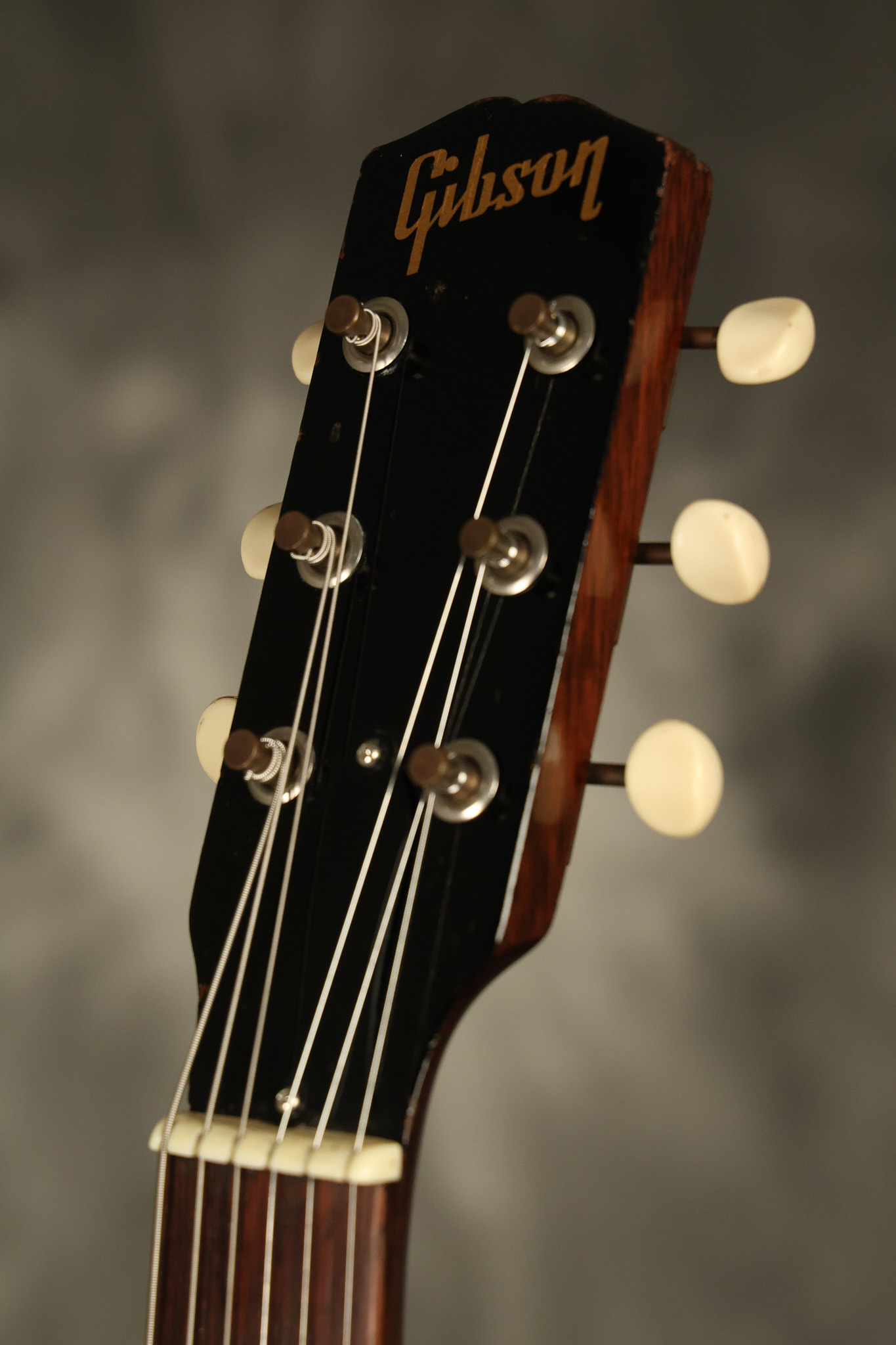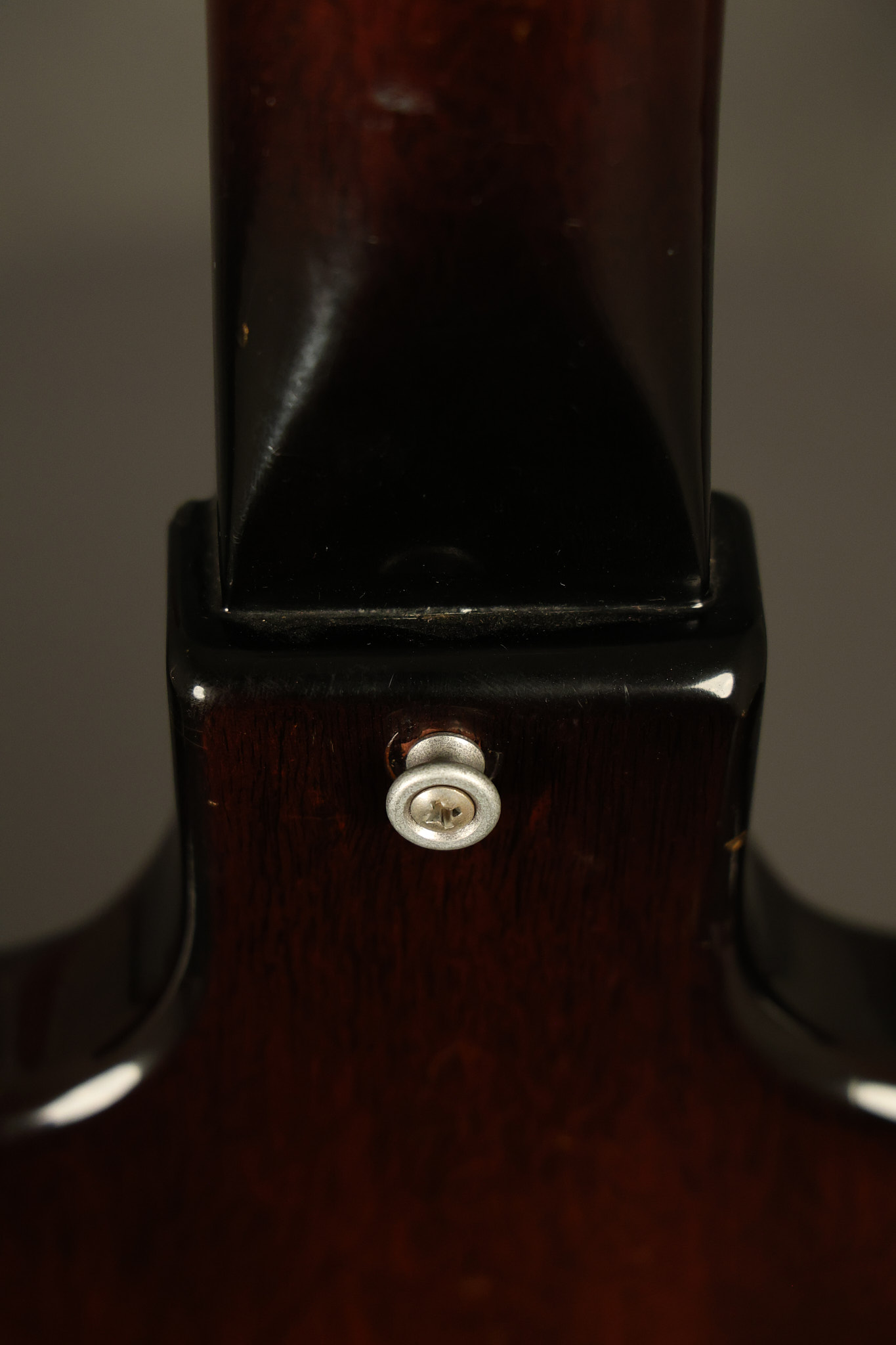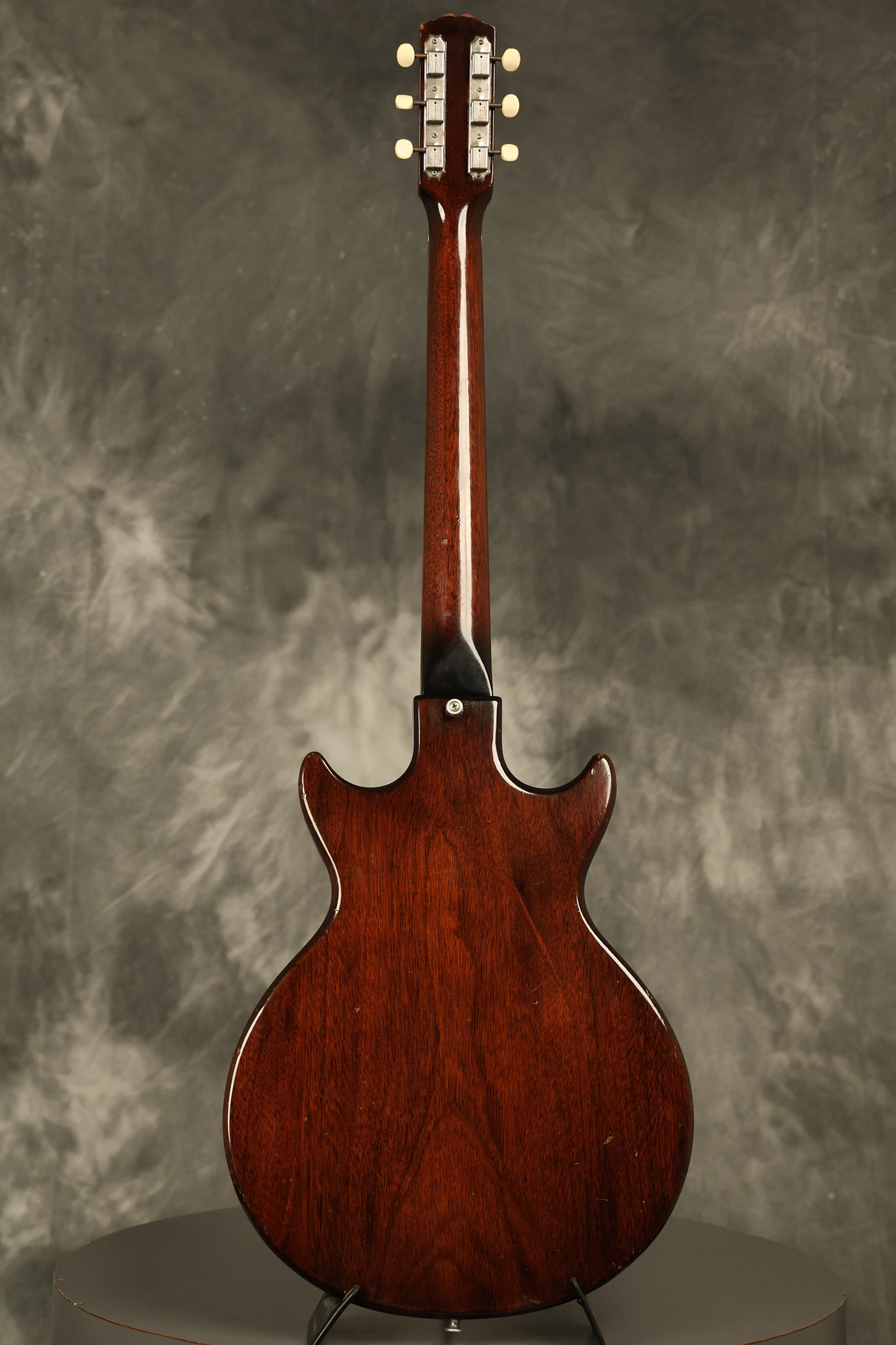 1964 Gibson Melody Maker D in sunburst. It has a great playing C-shaped neck, that is .845" at the 1st fret, and 1.050" at the 12th. The original frets still have a good amount of life left. The pickups are original and sound great, but there have been several changes made to this guitar, which include a changed capacitor, along with some changed wiring, the tailpiece (it is a chrome late '60's with changed adjustment screws), pickguard screws, along with some extra holes in the pickguard, the switch tip, nut, knobs, strap buttons, truss rod cover screws, and tuning key screws. The tuning keys are original, but the D and G tuners are slightly bent, but still function well. The body underneath the pickguard has chipped in a couple of places, hence the extra holes in the pickguard. Everything functions well and properly. There have been no cracks, breaks, repairs. Comes with a non-original vintage chipboard case.