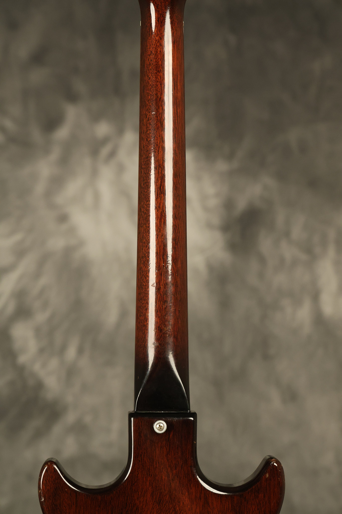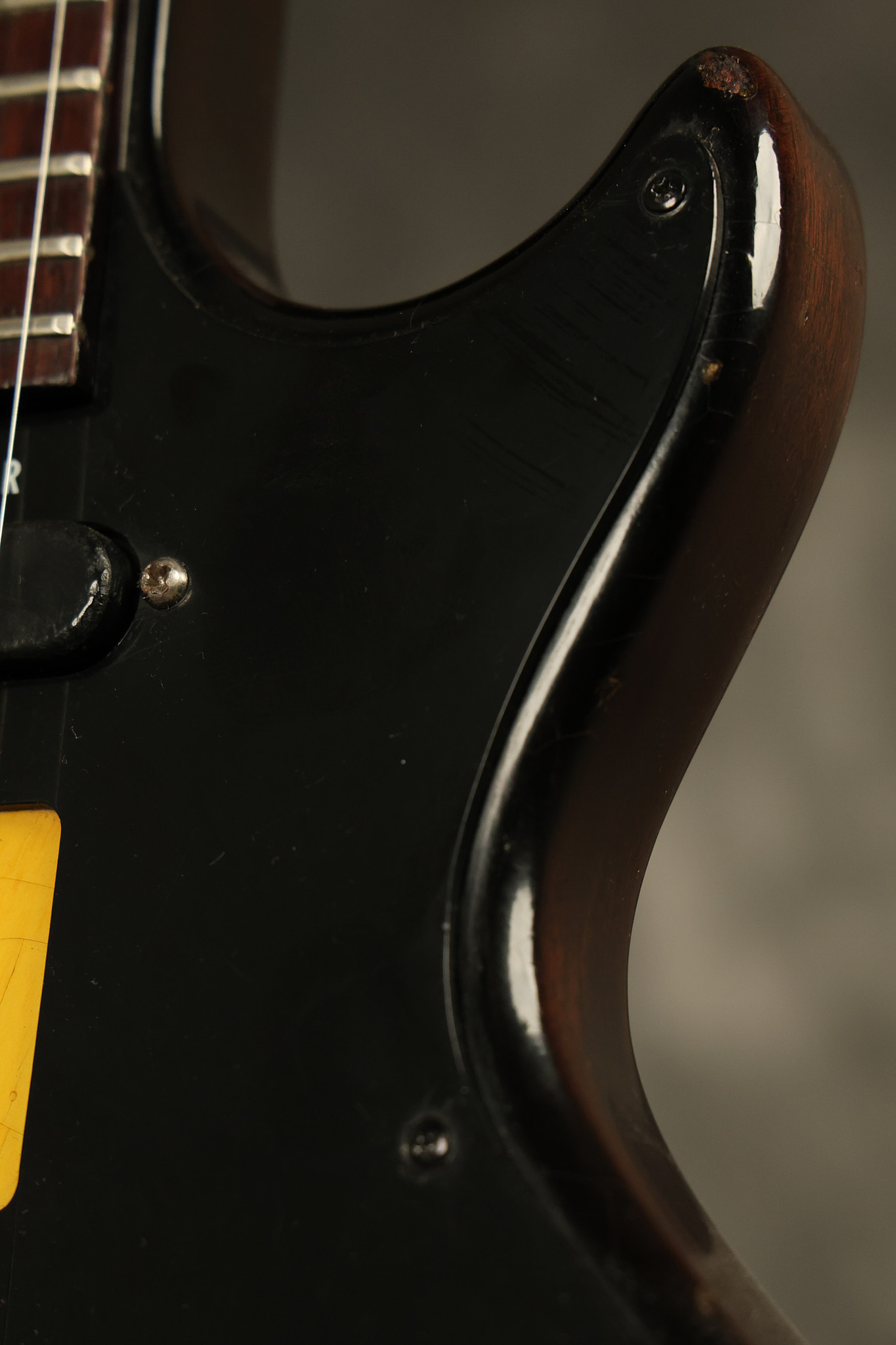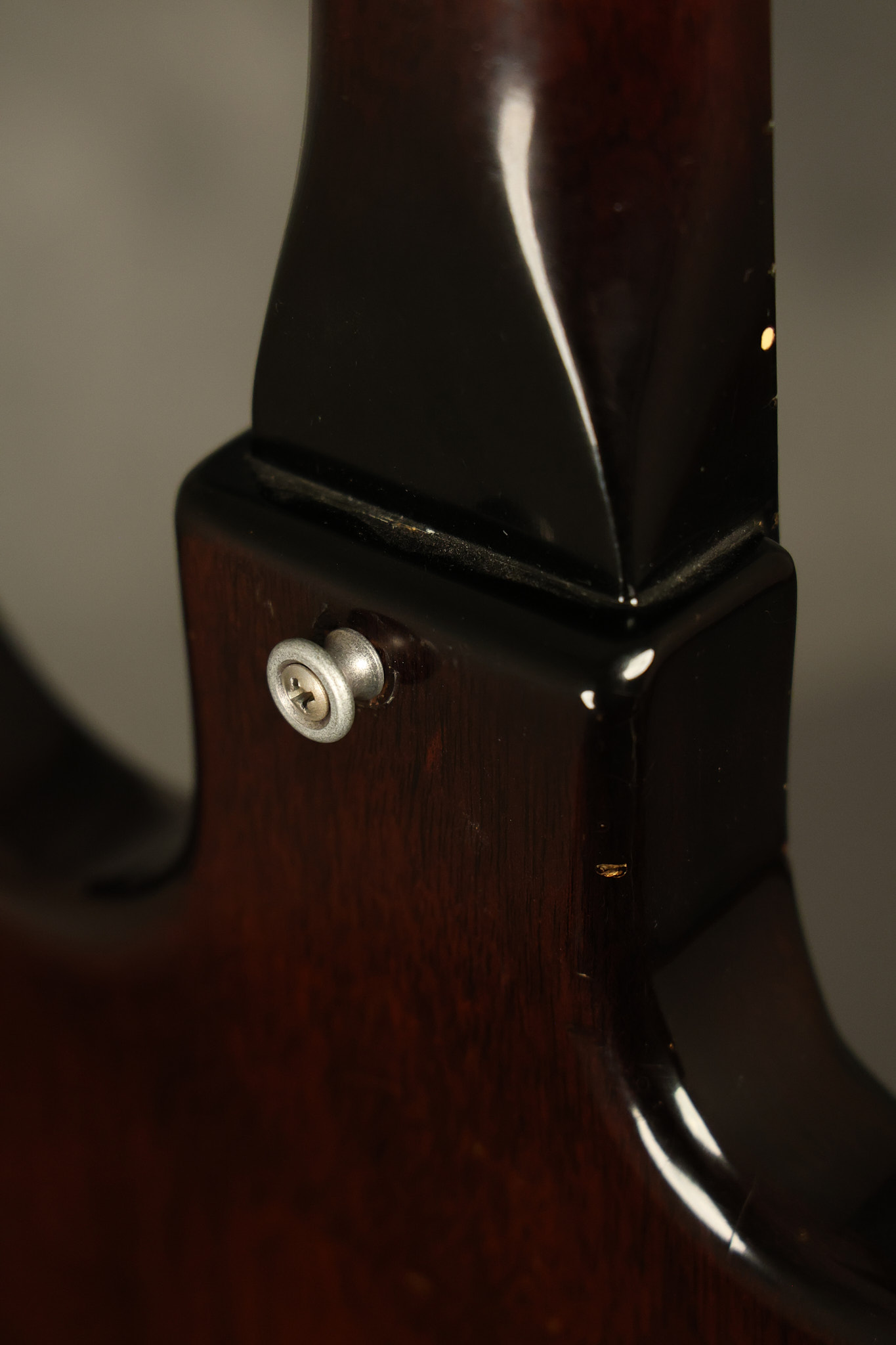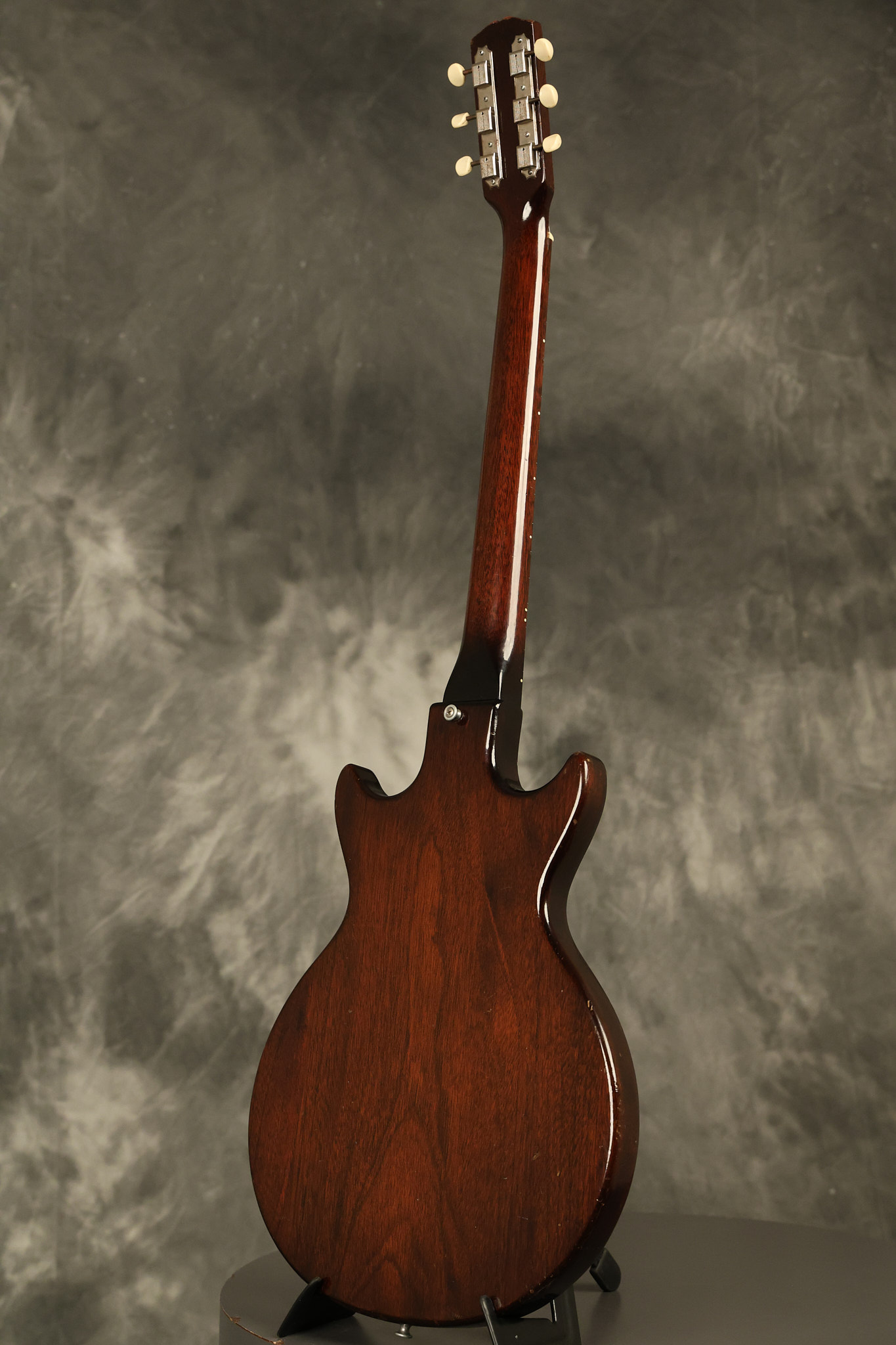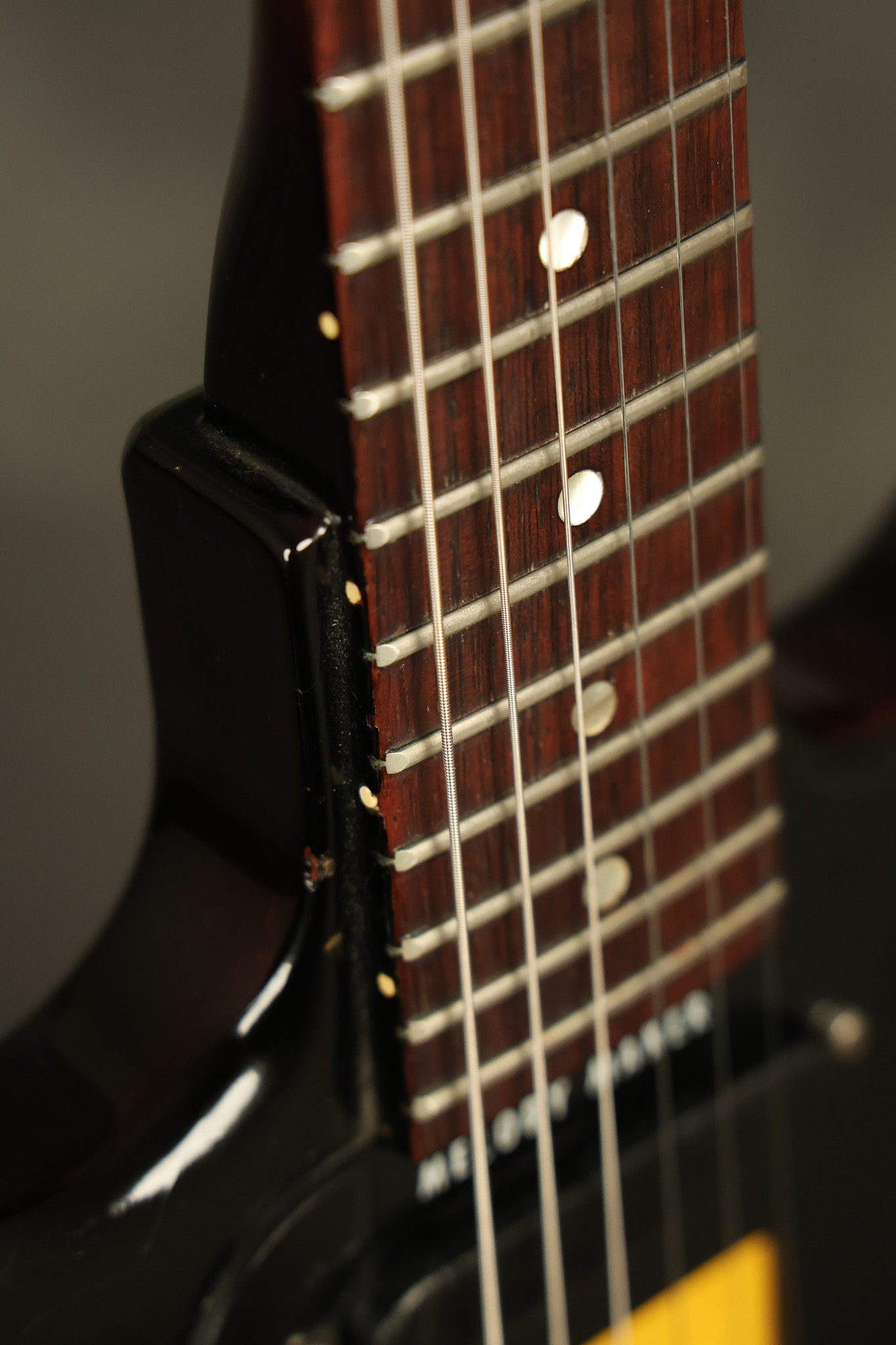 1964 Gibson Melody Maker D in sunburst. It has a great playing C-shaped neck, that is .845" at the 1st fret, and 1.050" at the 12th. The original frets still have a good amount of life left. The pickups are original and sound great, but there have been several changes made to this guitar, which include a changed capacitor, along with some changed wiring, the tailpiece (it is a chrome late '60's with changed adjustment screws), pickguard screws, along with some extra holes in the pickguard, the switch tip, nut, knobs, strap buttons, truss rod cover screws, and tuning key screws. The tuning keys are original, but the D and G tuners are slightly bent, but still function well. The body underneath the pickguard has chipped in a couple of places, hence the extra holes in the pickguard. Everything functions well and properly. There have been no cracks, breaks, repairs. Comes with a non-original vintage chipboard case.