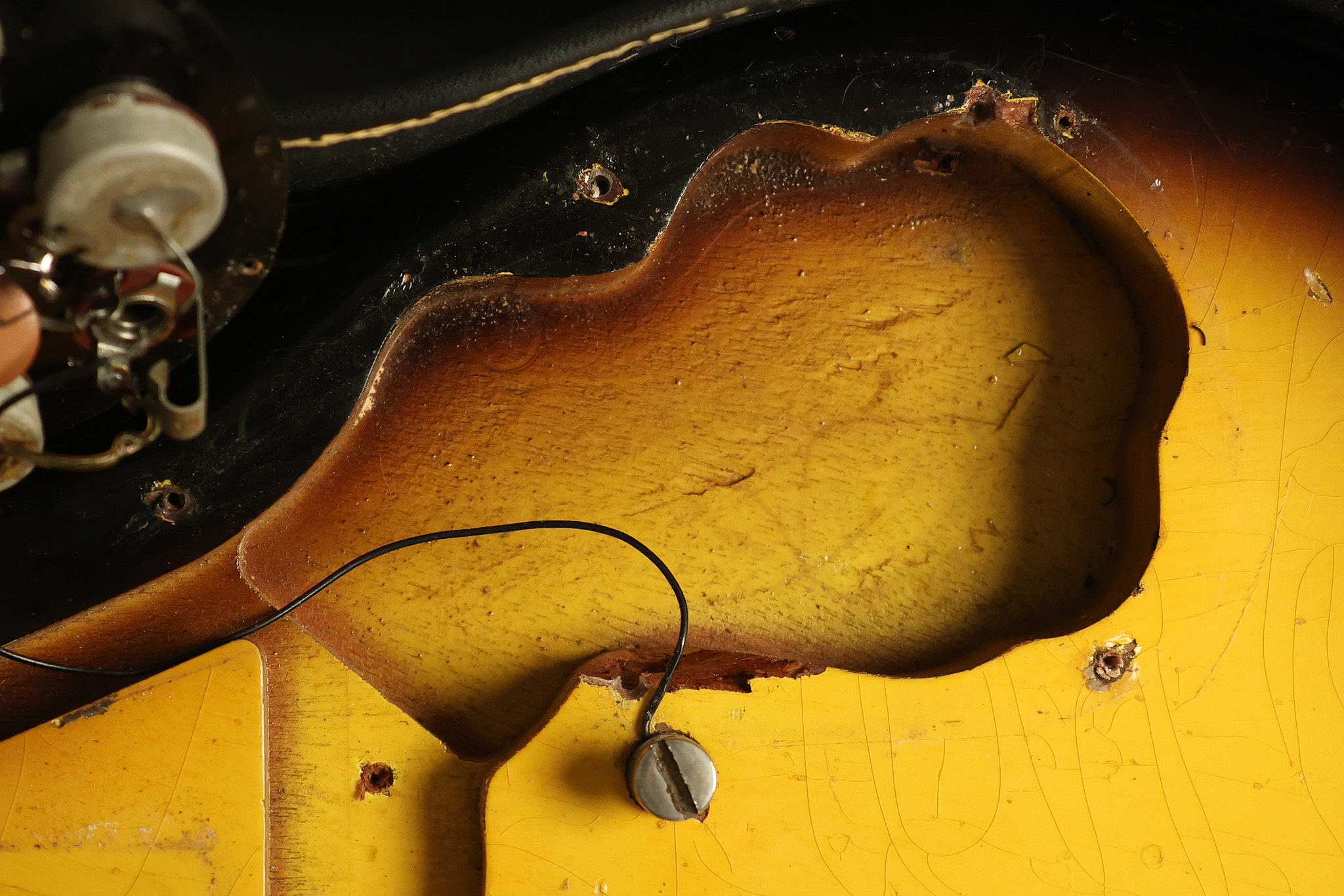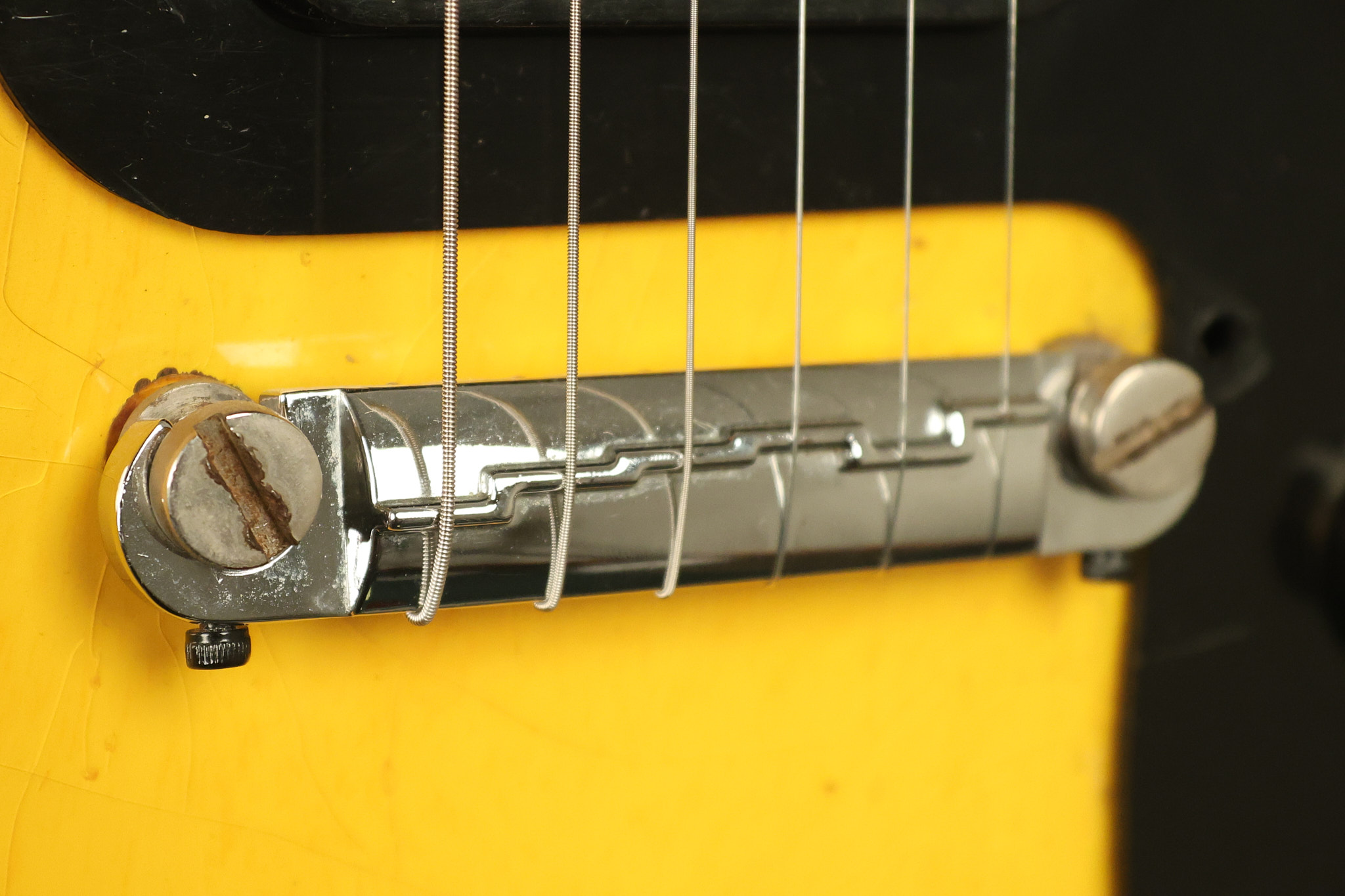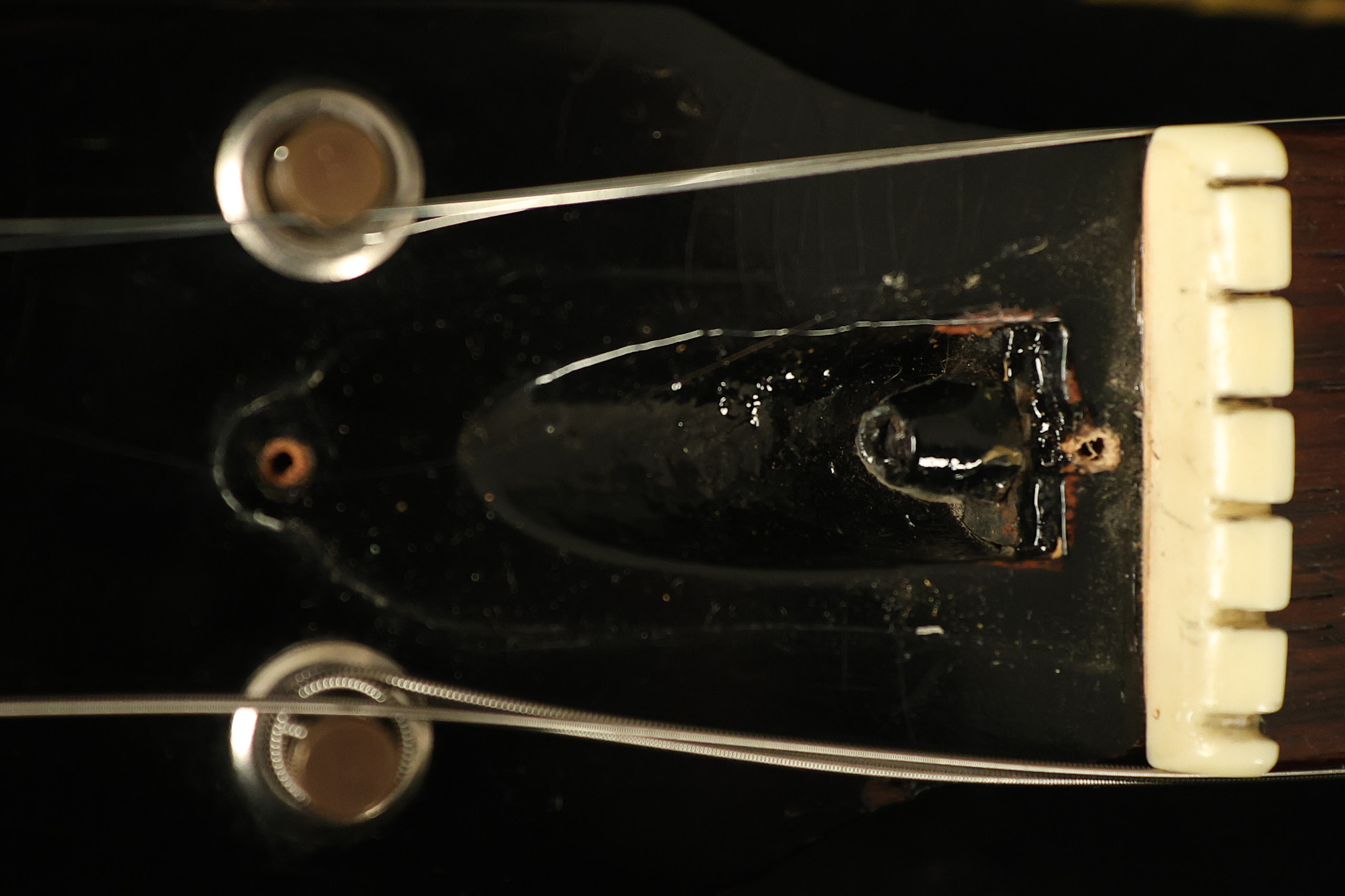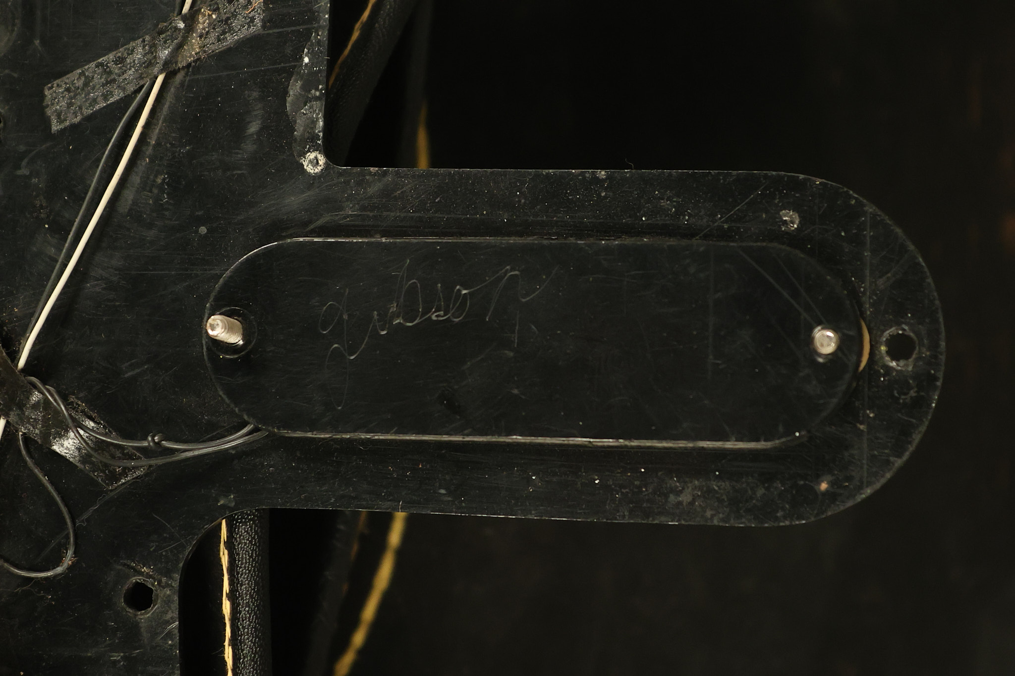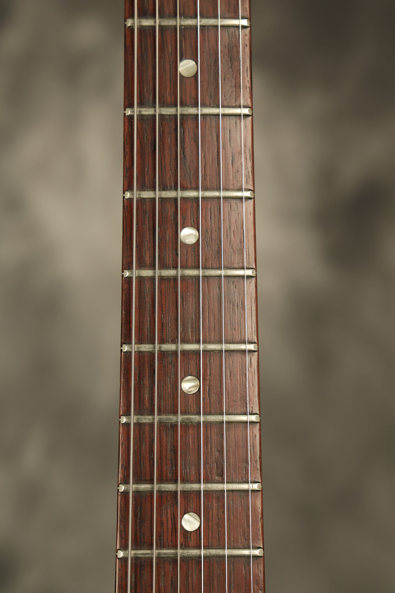 1964 Gibson Melody Maker D in sunburst. It has a great playing C-shaped neck, that is .845" at the 1st fret, and 1.050" at the 12th. The original frets still have a good amount of life left. The pickups are original and sound great, but there have been several changes made to this guitar, which include a changed capacitor, along with some changed wiring, the tailpiece (it is a chrome late '60's with changed adjustment screws), pickguard screws, along with some extra holes in the pickguard, the switch tip, nut, knobs, strap buttons, truss rod cover screws, and tuning key screws. The tuning keys are original, but the D and G tuners are slightly bent, but still function well. The body underneath the pickguard has chipped in a couple of places, hence the extra holes in the pickguard. Everything functions well and properly. There have been no cracks, breaks, repairs. Comes with a non-original vintage chipboard case.
