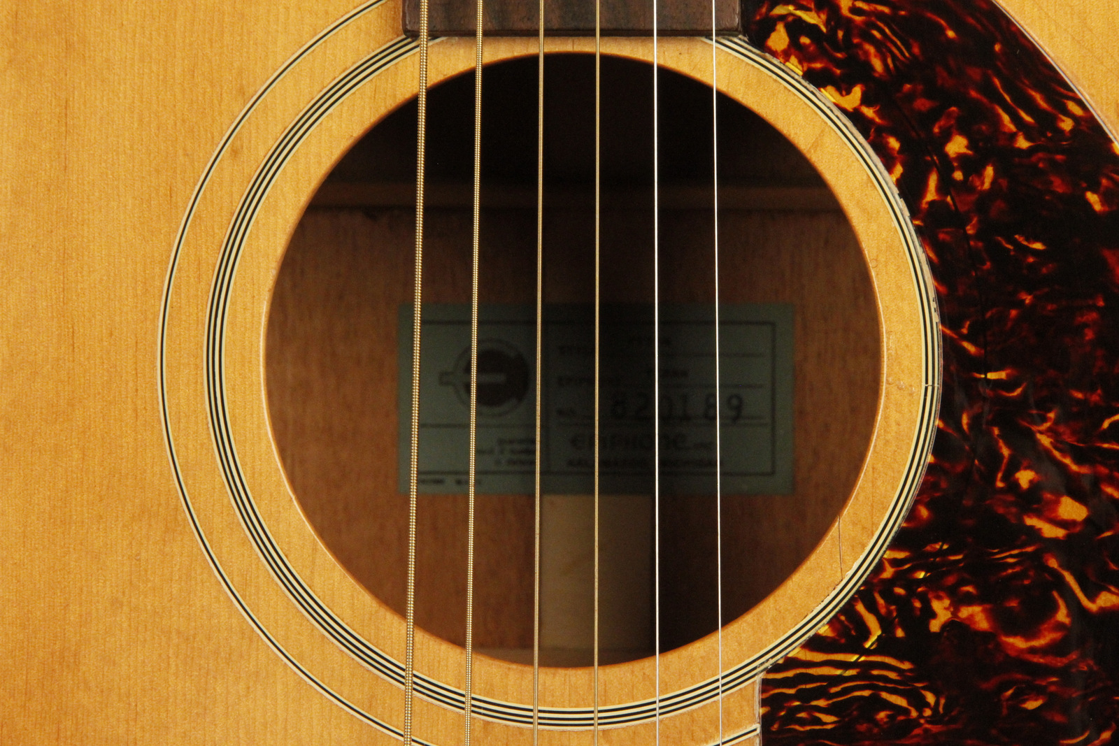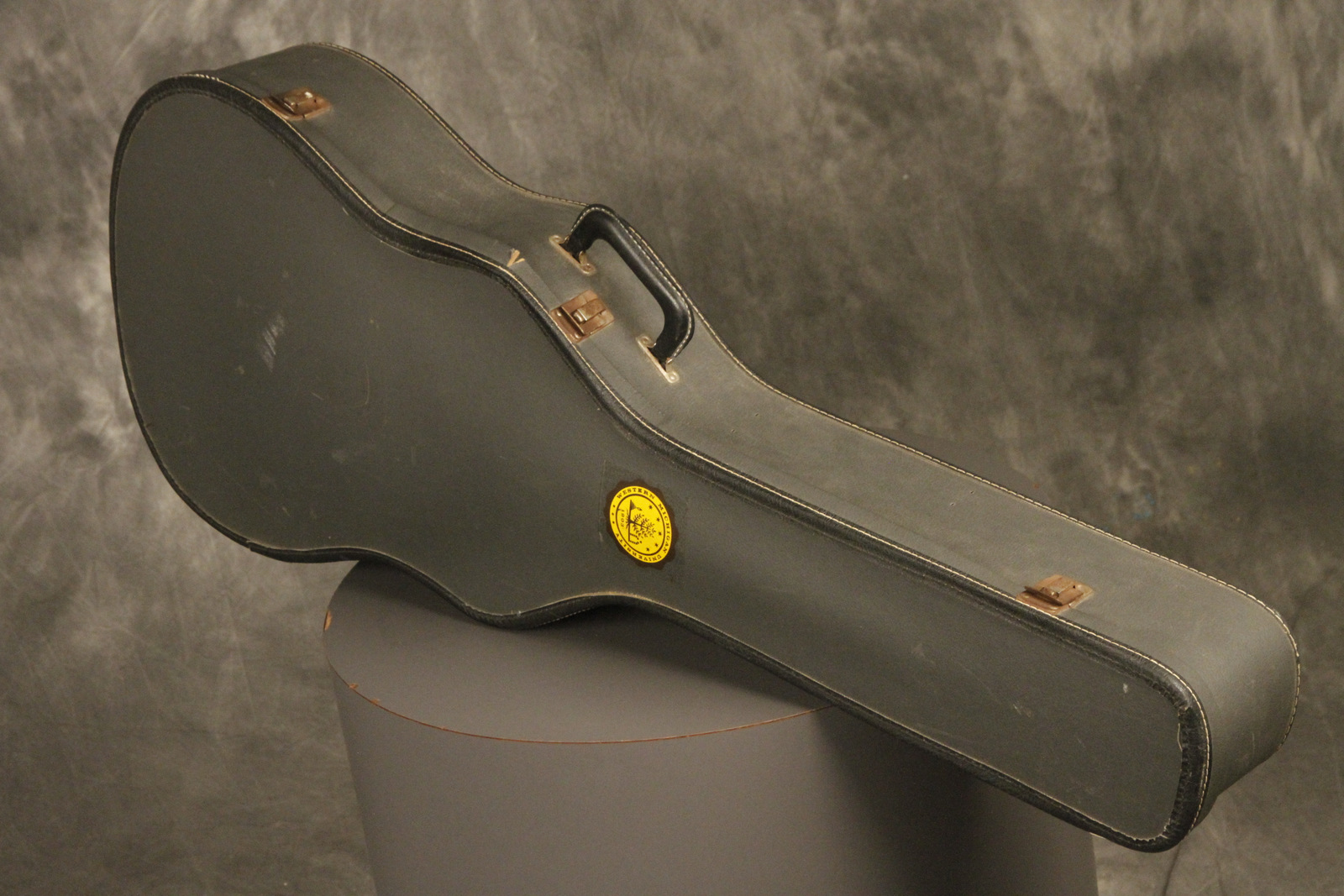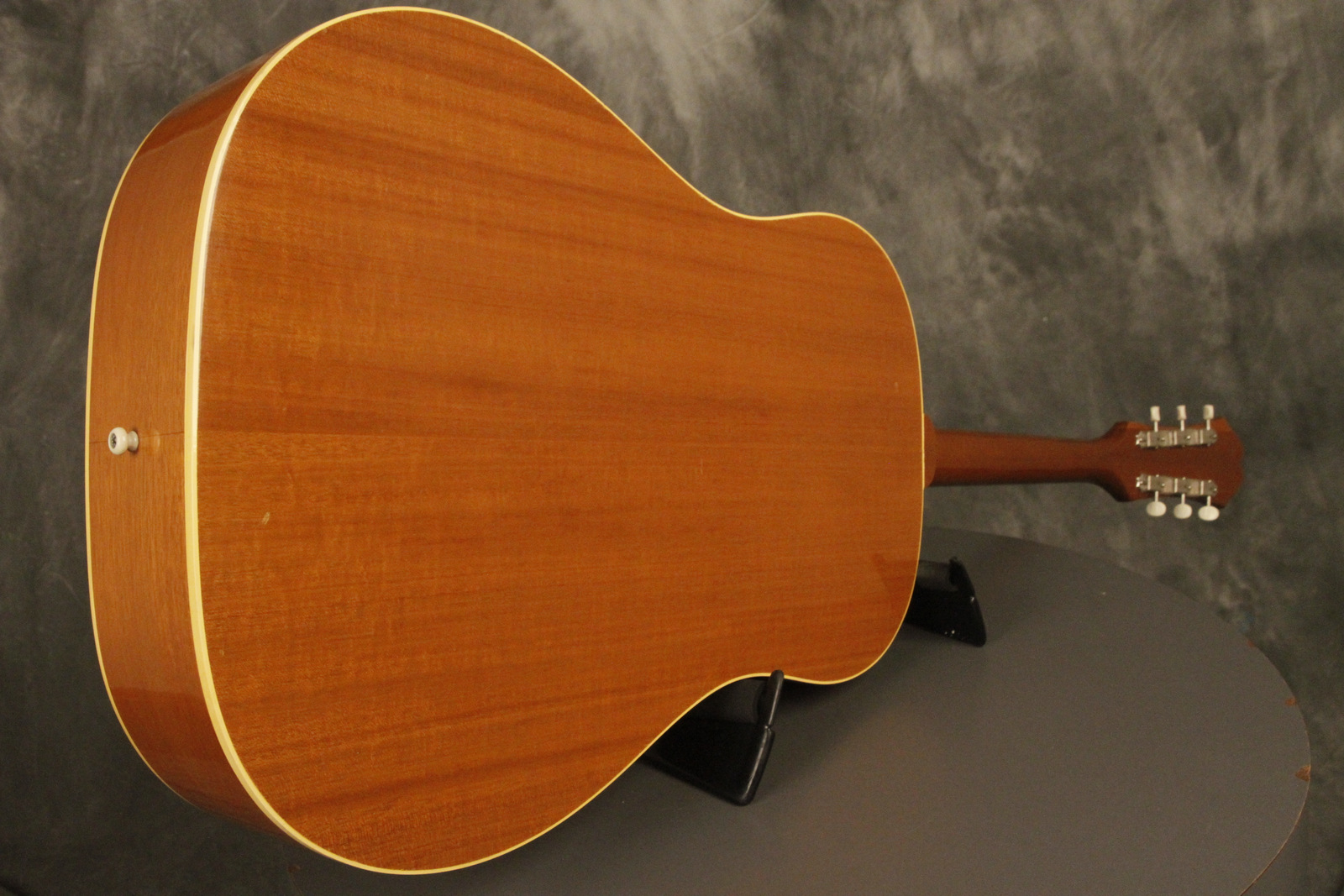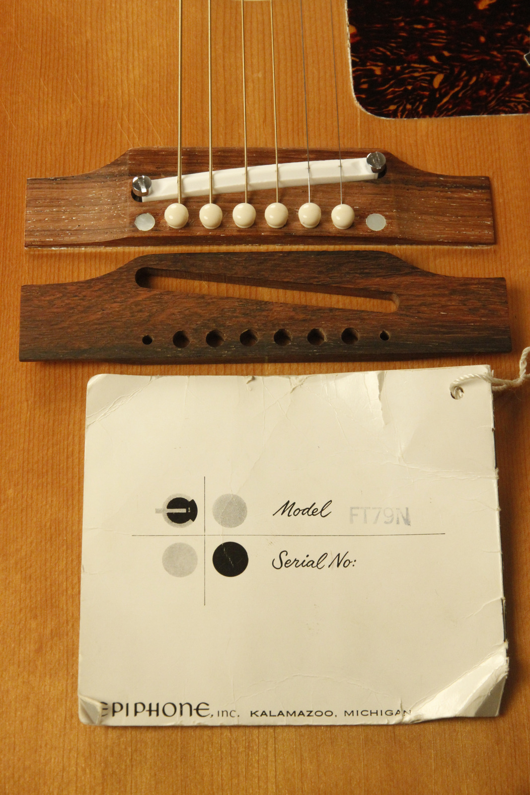 1966 Epiphone FT-79N Texan in its original Natural finish. It has a great playing neck with great frets. The original soft-shell case is included along with its original hang tag and an additional bridge. There is a hairline crack in the top from pickguard shrinkage running along the inner edge of the pickguard between the soundhole and the bridge. There is another very short crack running over the edge of the soundhole to the rosette. These are both more of a cosmetic issue as the guitar itself remains structurally sound. This Texan looks very clean with some nicks + dings and other cosmetic wear including some finish worn off the treble side edge of the neck around the first several frets.