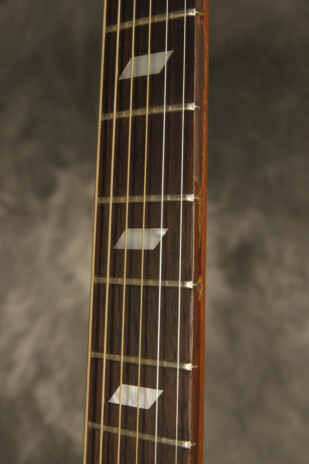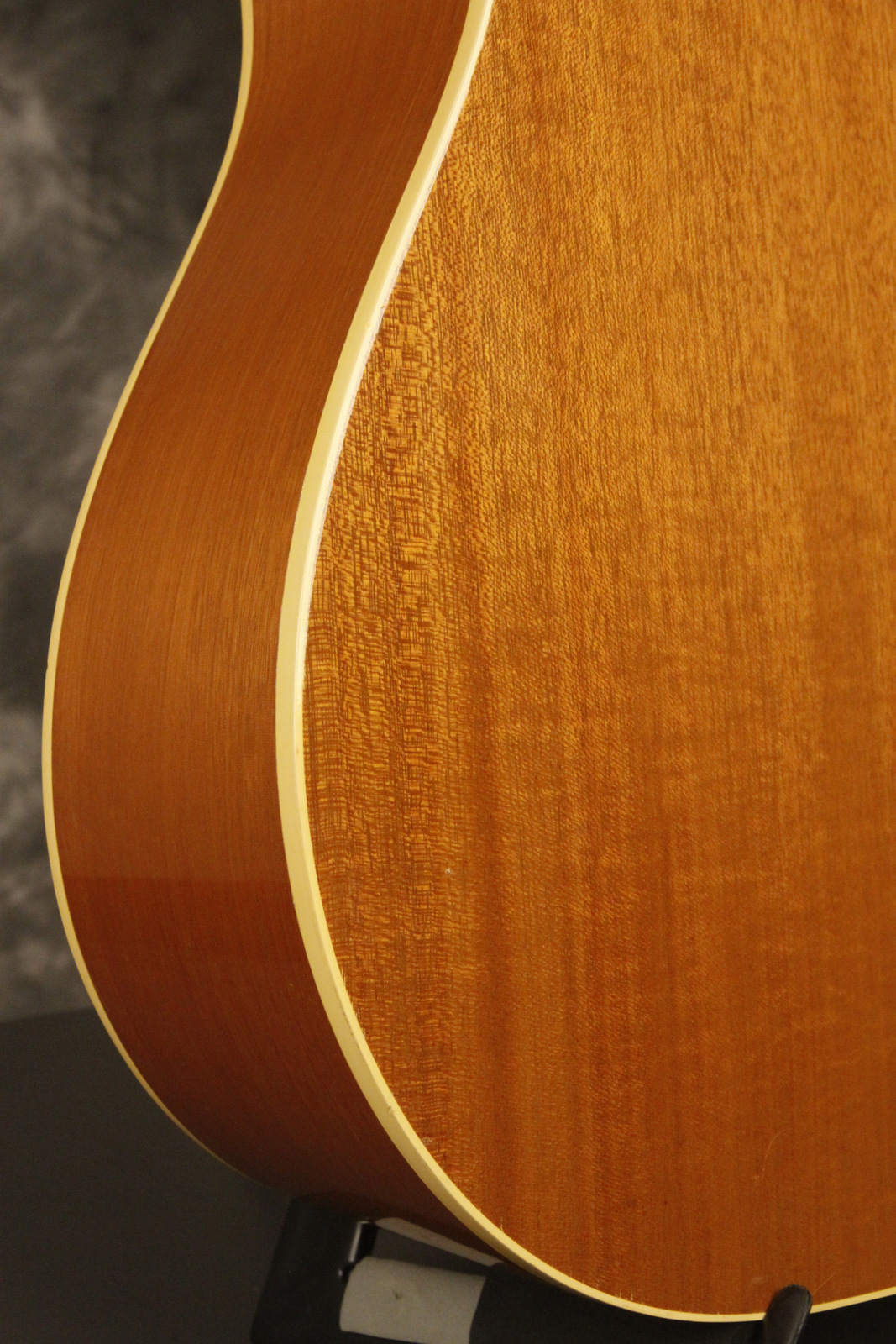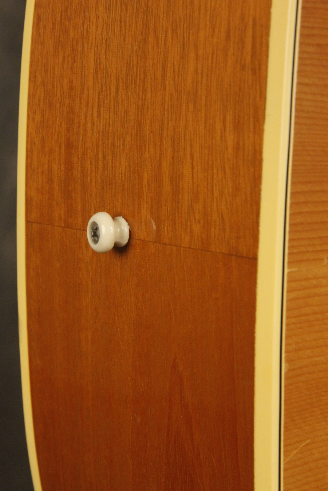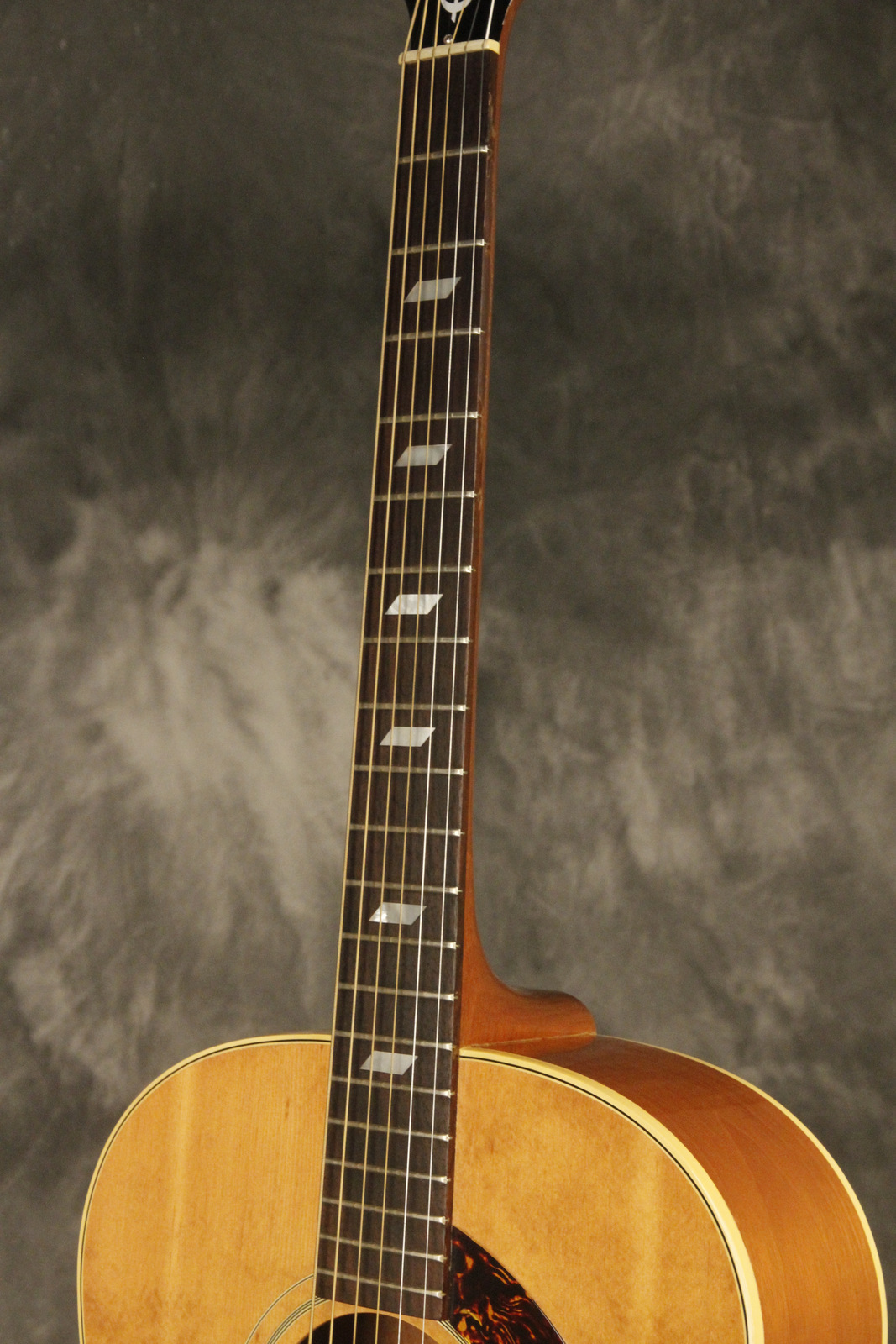 1966 Epiphone FT-79N Texan in its original Natural finish. It has a great playing neck with great frets. The original soft-shell case is included along with its original hang tag and an additional bridge. There is a hairline crack in the top from pickguard shrinkage running along the inner edge of the pickguard between the soundhole and the bridge. There is another very short crack running over the edge of the soundhole to the rosette. These are both more of a cosmetic issue as the guitar itself remains structurally sound. This Texan looks very clean with some nicks + dings and other cosmetic wear including some finish worn off the treble side edge of the neck around the first several frets.