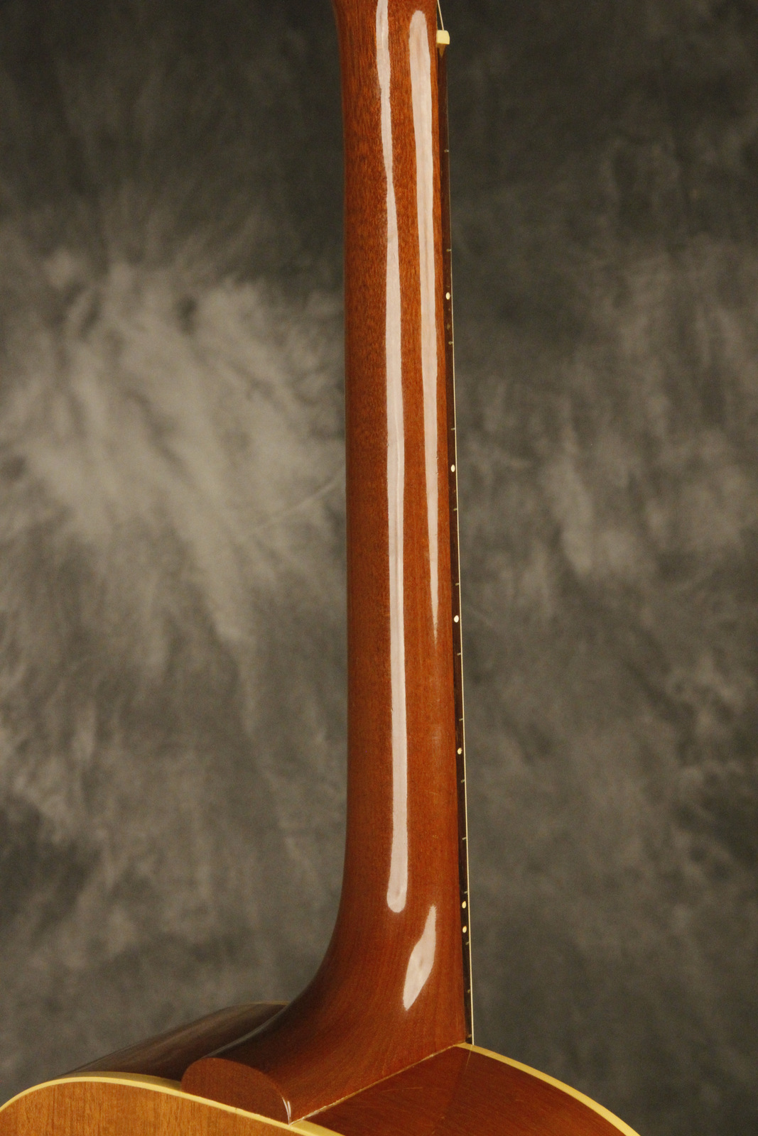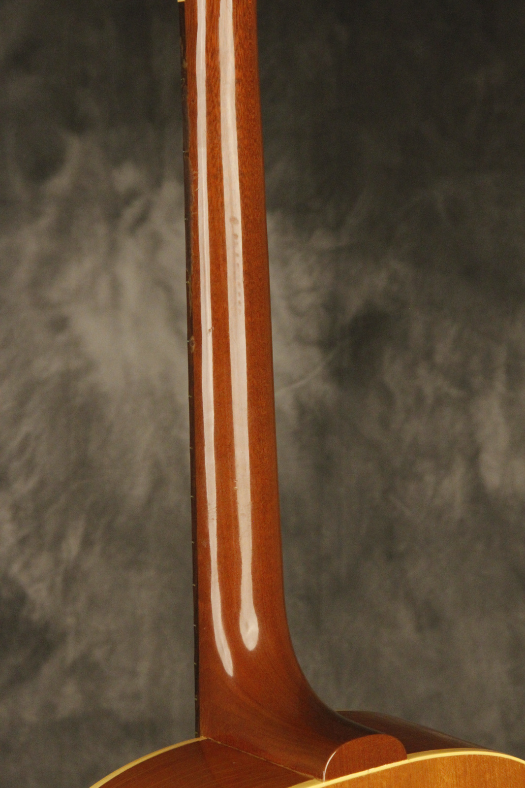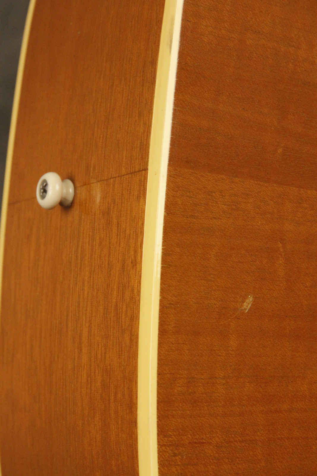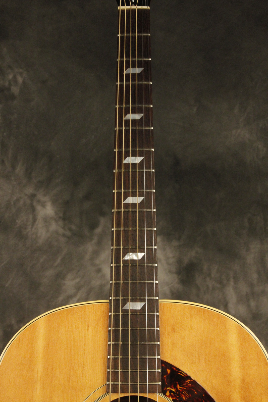 1966 Epiphone FT-79N Texan in its original Natural finish. It has a great playing neck with great frets. The original soft-shell case is included along with its original hang tag and an additional bridge. There is a hairline crack in the top from pickguard shrinkage running along the inner edge of the pickguard between the soundhole and the bridge. There is another very short crack running over the edge of the soundhole to the rosette. These are both more of a cosmetic issue as the guitar itself remains structurally sound. This Texan looks very clean with some nicks + dings and other cosmetic wear including some finish worn off the treble side edge of the neck around the first several frets.