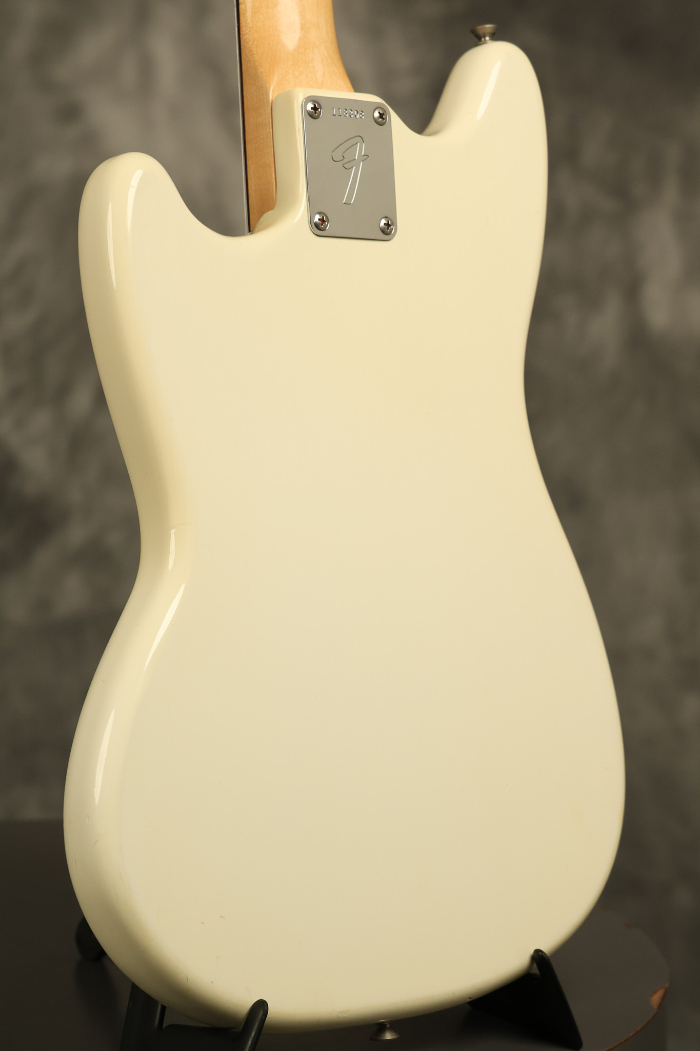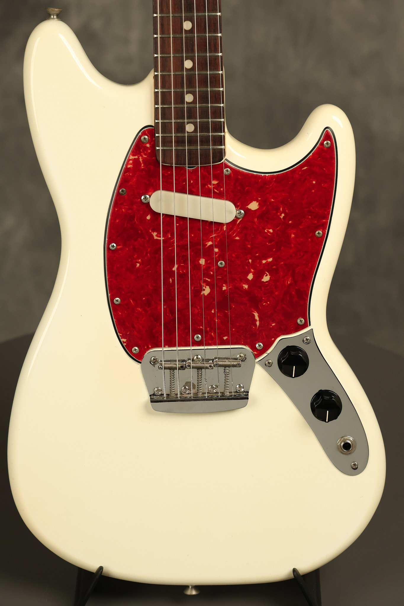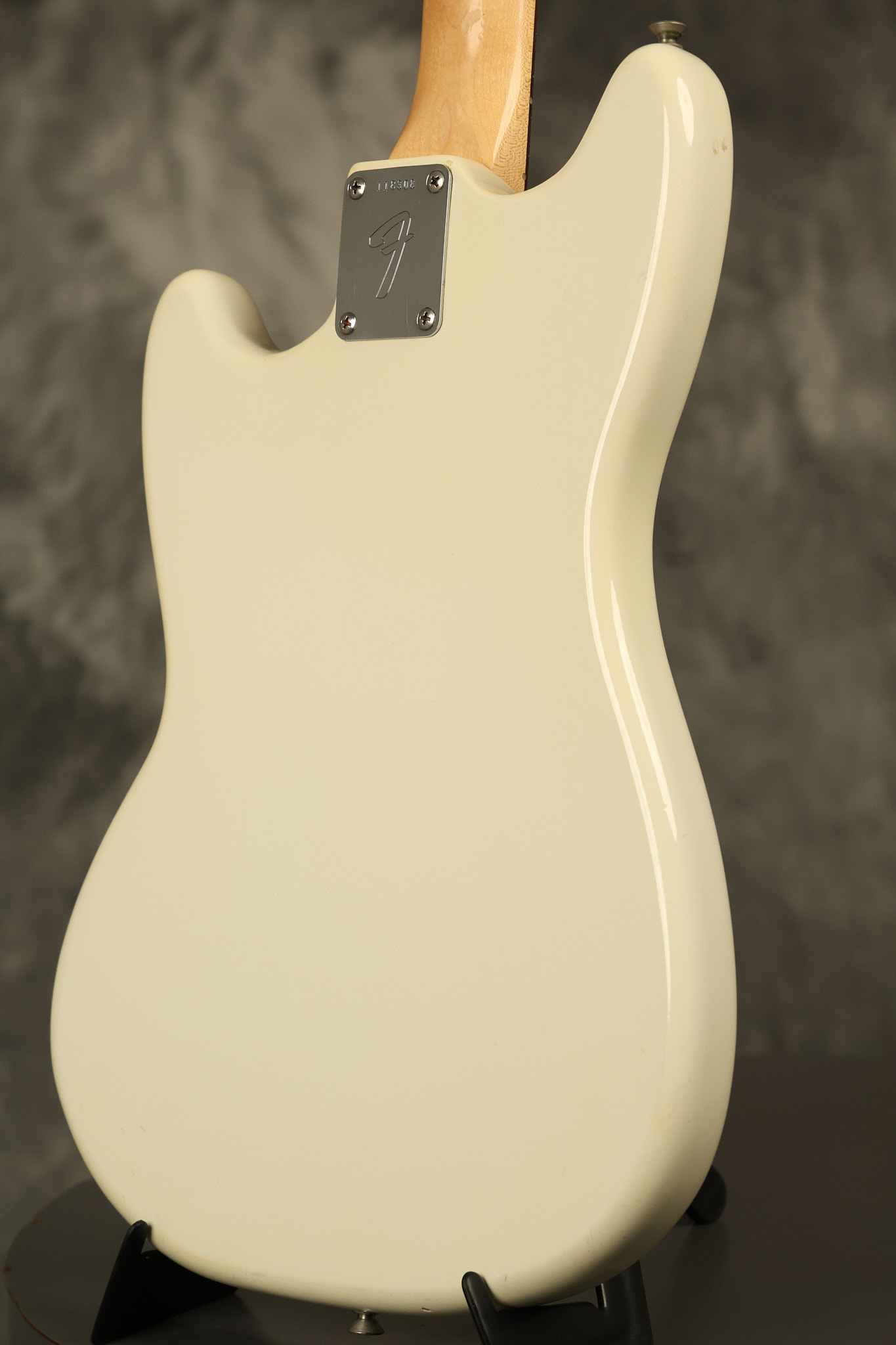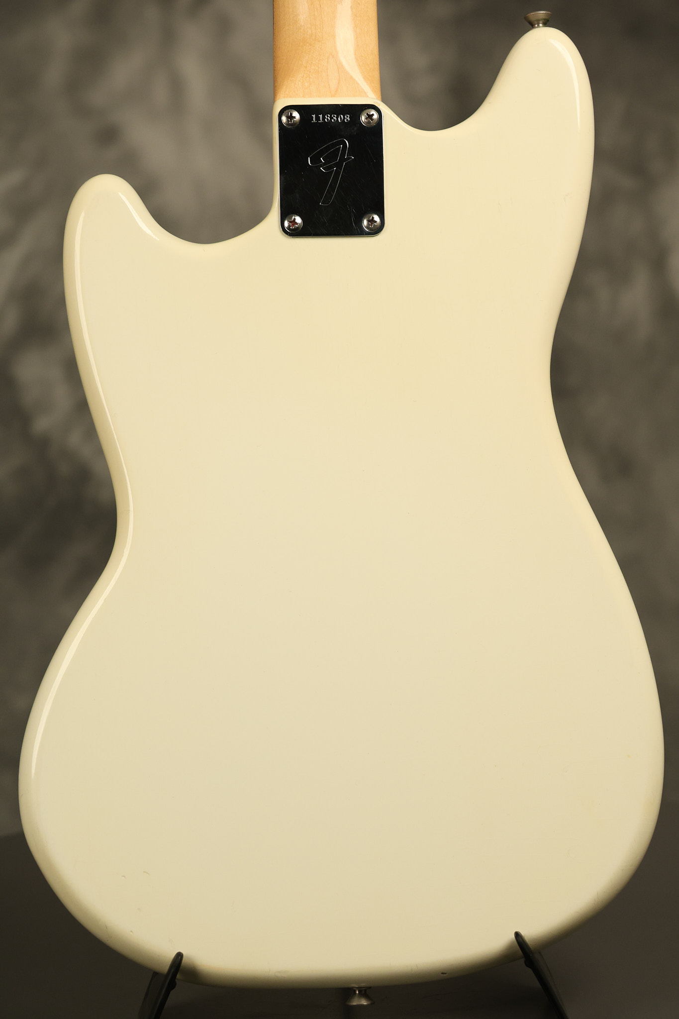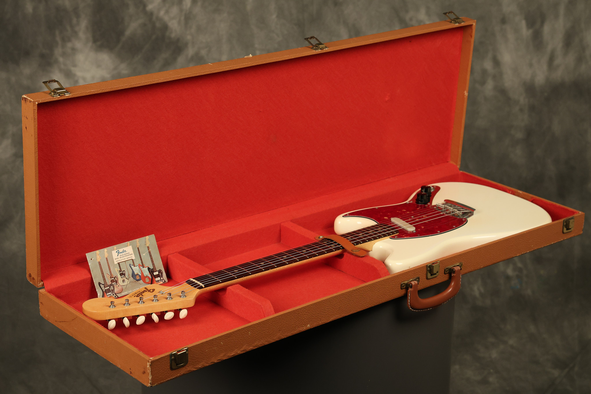1966 Fender Musicmaster II in its original White finish. It has a great playing SLAB BOARD neck with great frets. It's all original with the exception of the jack and an added ground wire. It's also 100% complete along with it its original hardshell case and HANG TAG with the matching serial number. It's in EXCELLENT condition with only a few nicks + dings, very light finish checking and other cosmetic wear. Everything remains structurally sound with no cracks, breaks or repairs. All electronics work and sound great.