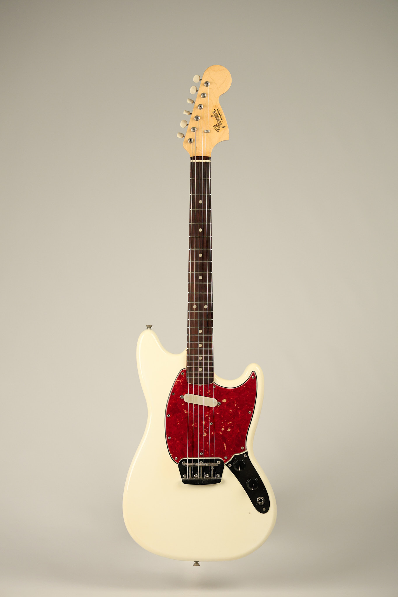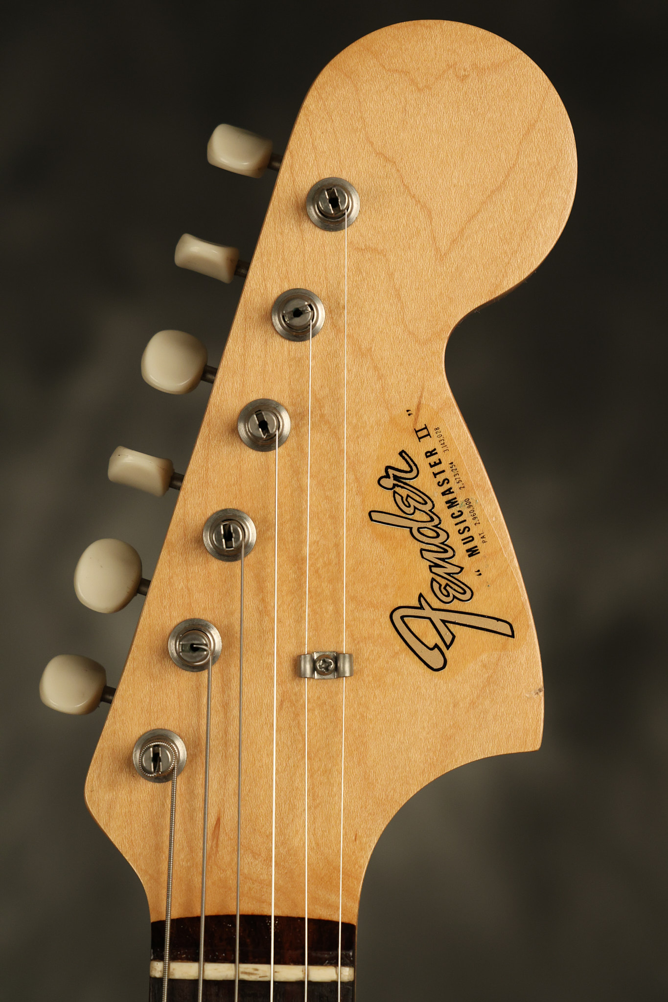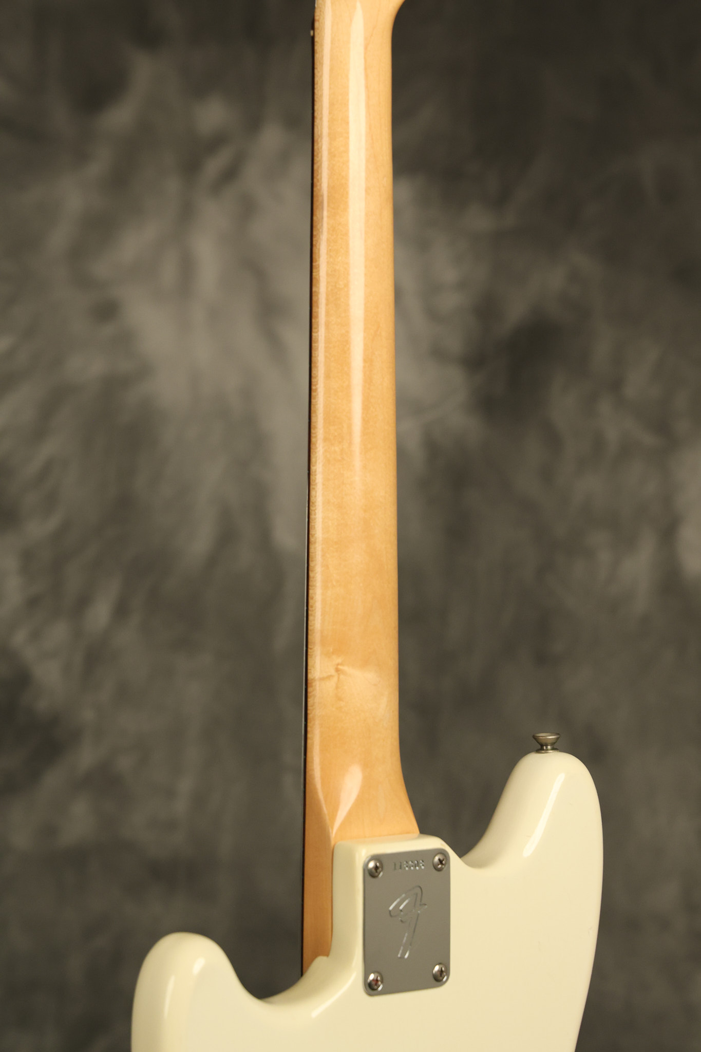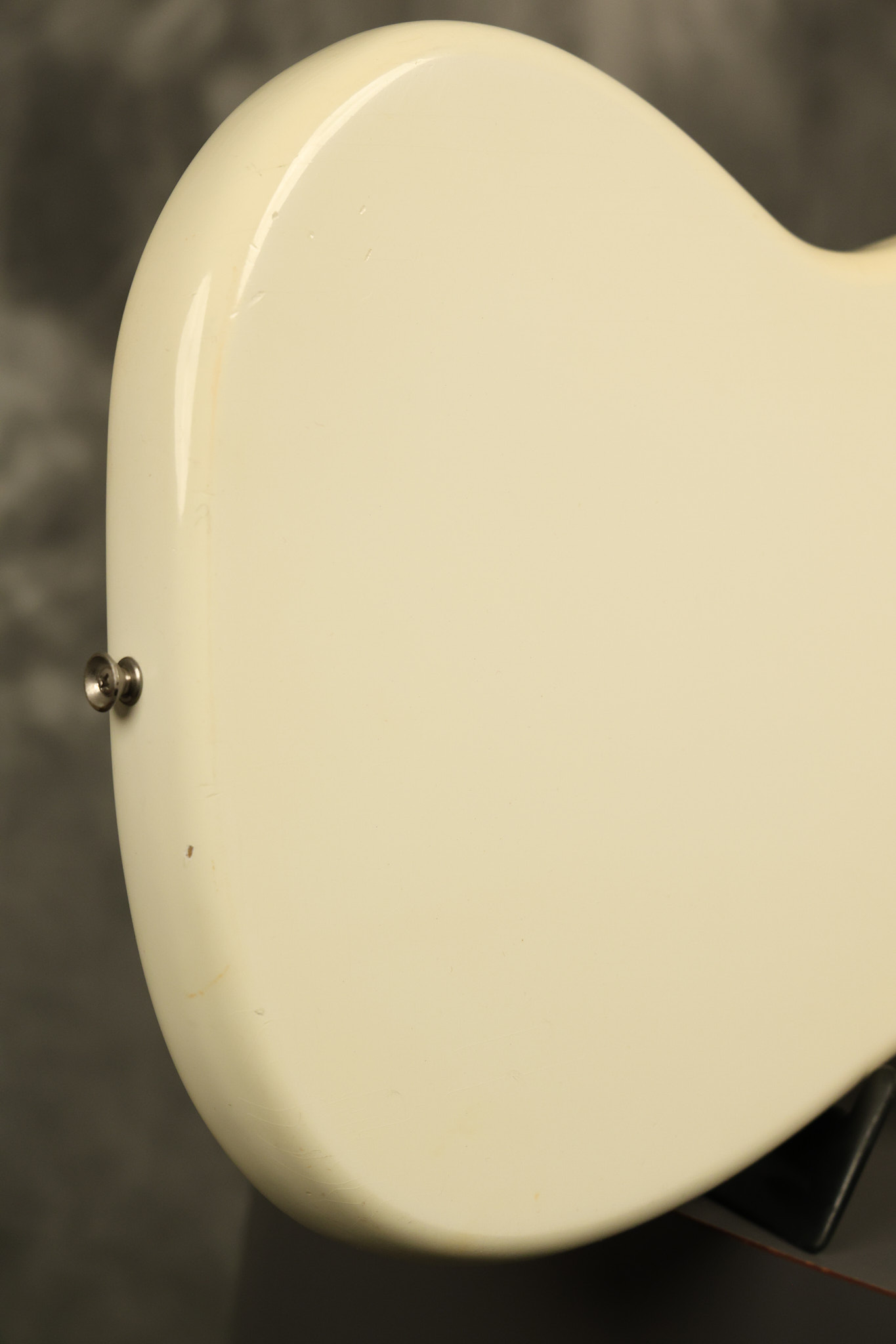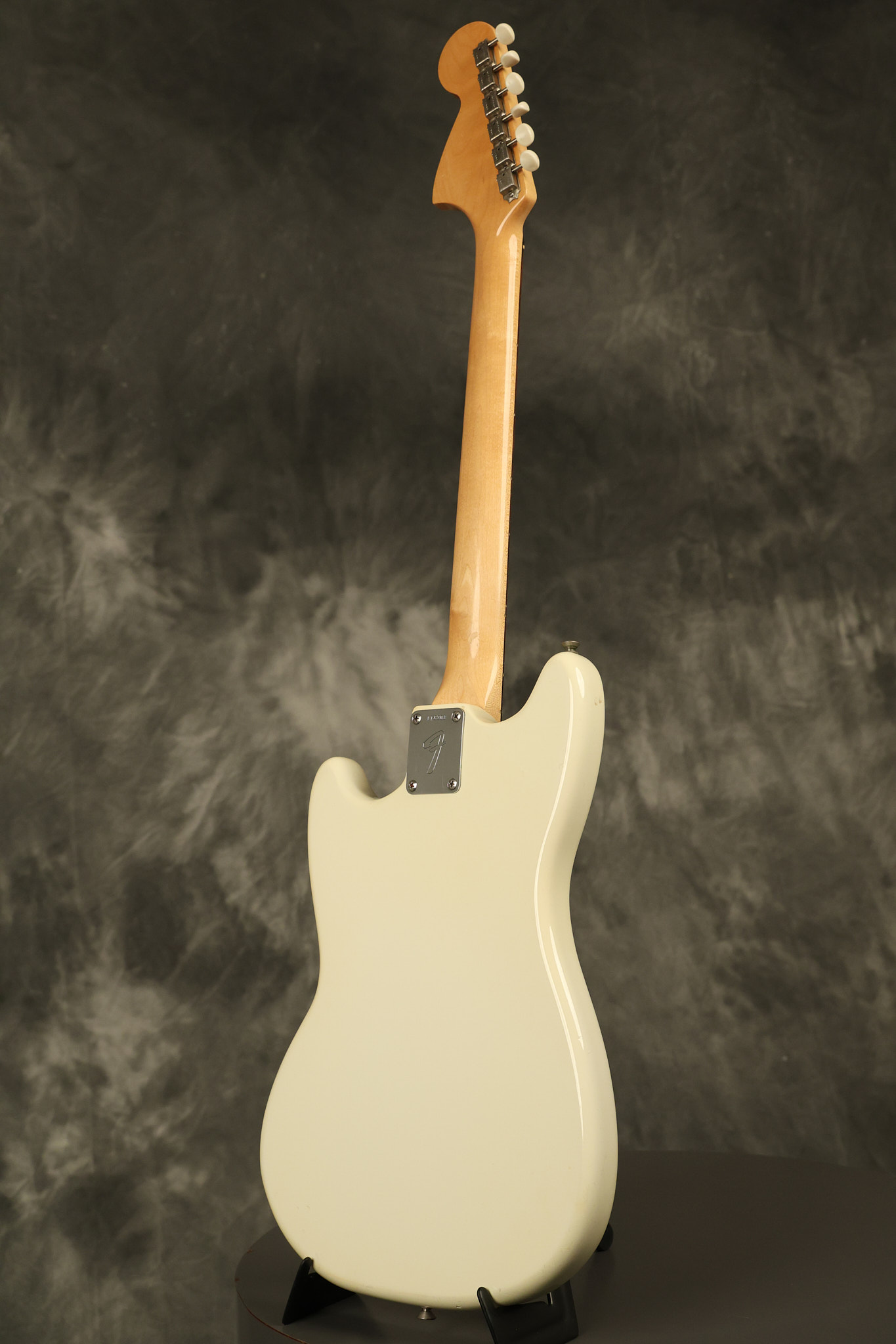 1966 Fender Musicmaster II in its original White finish. It has a great playing SLAB BOARD neck with great frets. It's all original with the exception of the jack and an added ground wire. It's also 100% complete along with it its original hardshell case and HANG TAG with the matching serial number. It's in EXCELLENT condition with only a few nicks + dings, very light finish checking and other cosmetic wear. Everything remains structurally sound with no cracks, breaks or repairs. All electronics work and sound great.