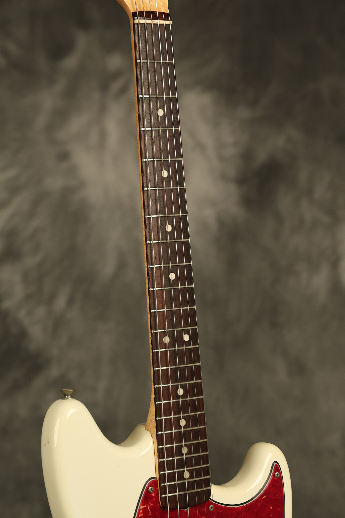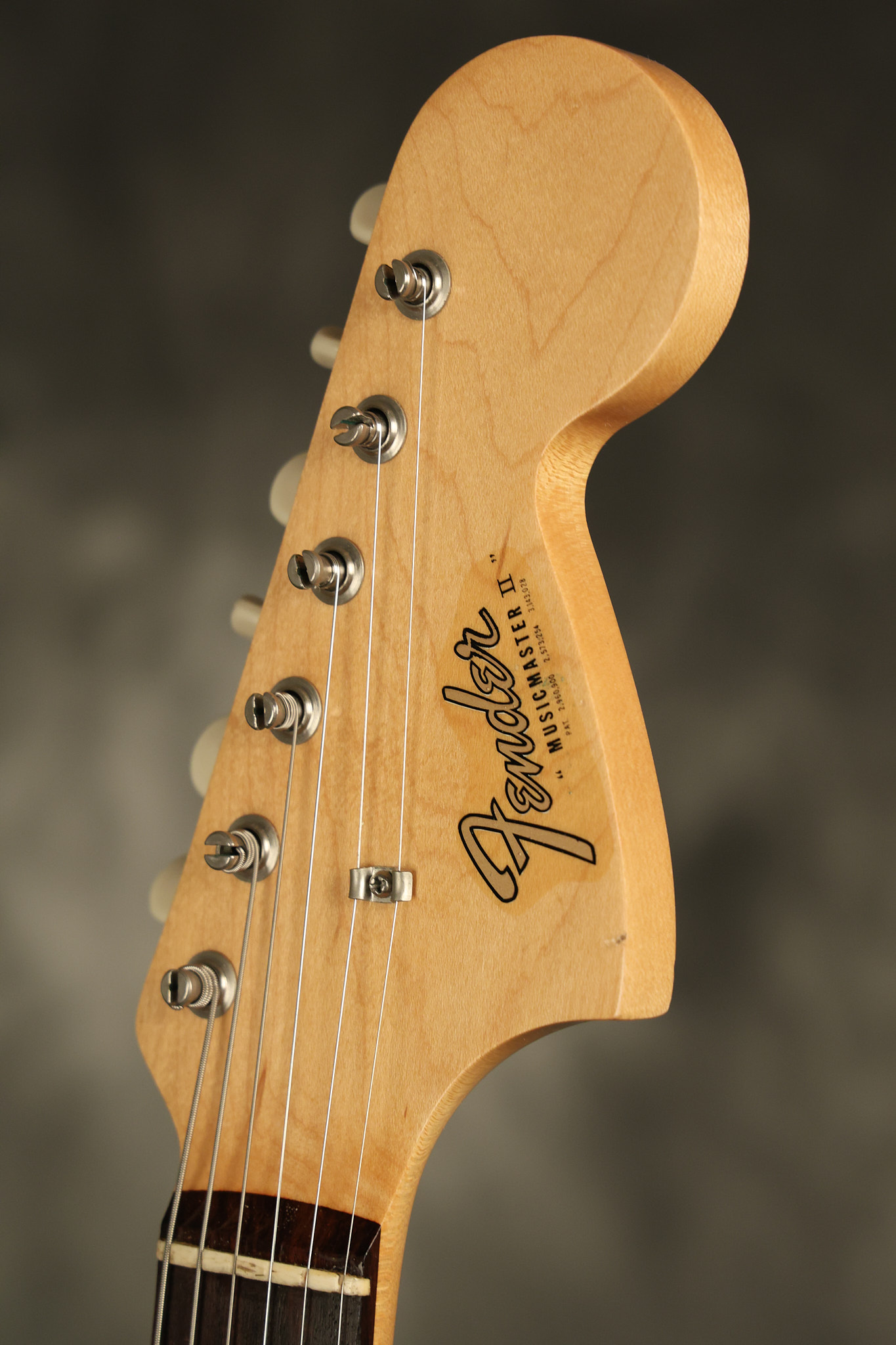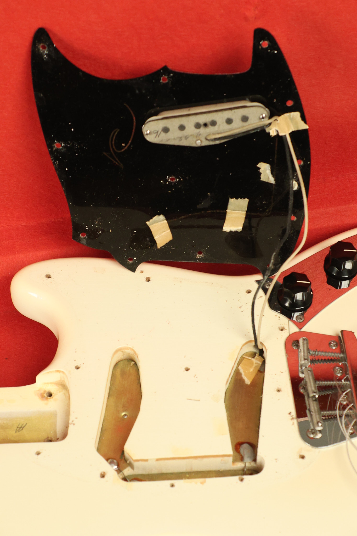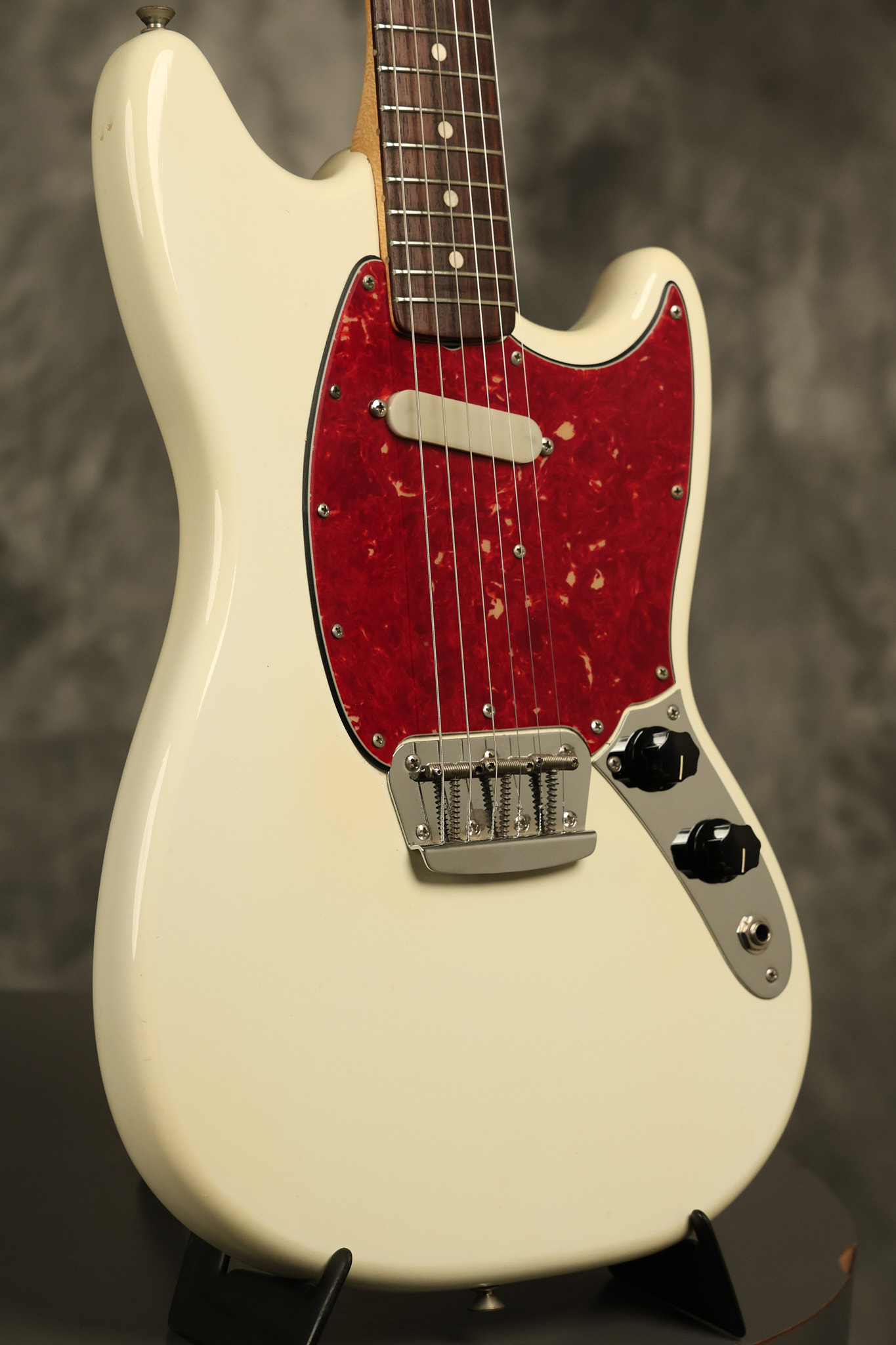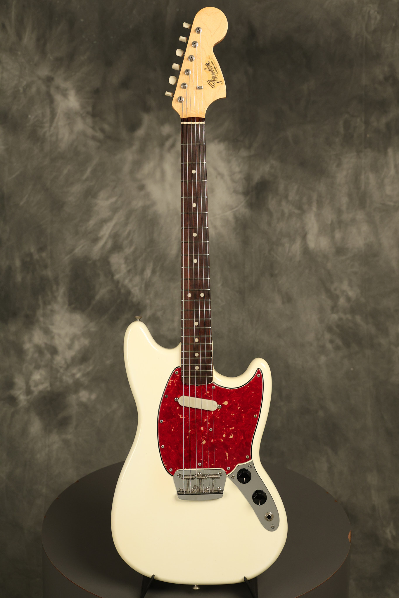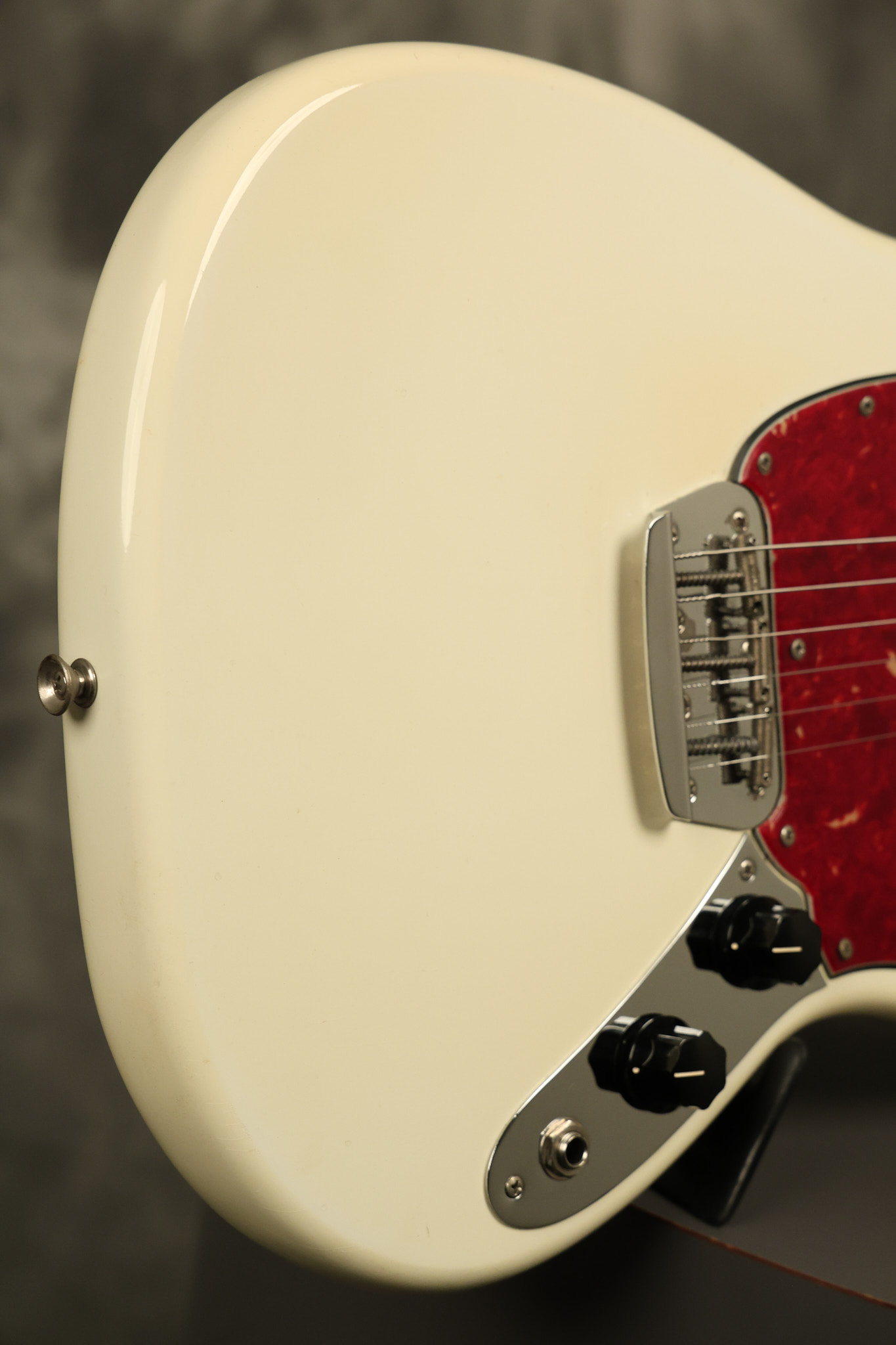 1966 Fender Musicmaster II in its original White finish. It has a great playing SLAB BOARD neck with great frets. It's all original with the exception of the jack and an added ground wire. It's also 100% complete along with it its original hardshell case and HANG TAG with the matching serial number. It's in EXCELLENT condition with only a few nicks + dings, very light finish checking and other cosmetic wear. Everything remains structurally sound with no cracks, breaks or repairs. All electronics work and sound great.