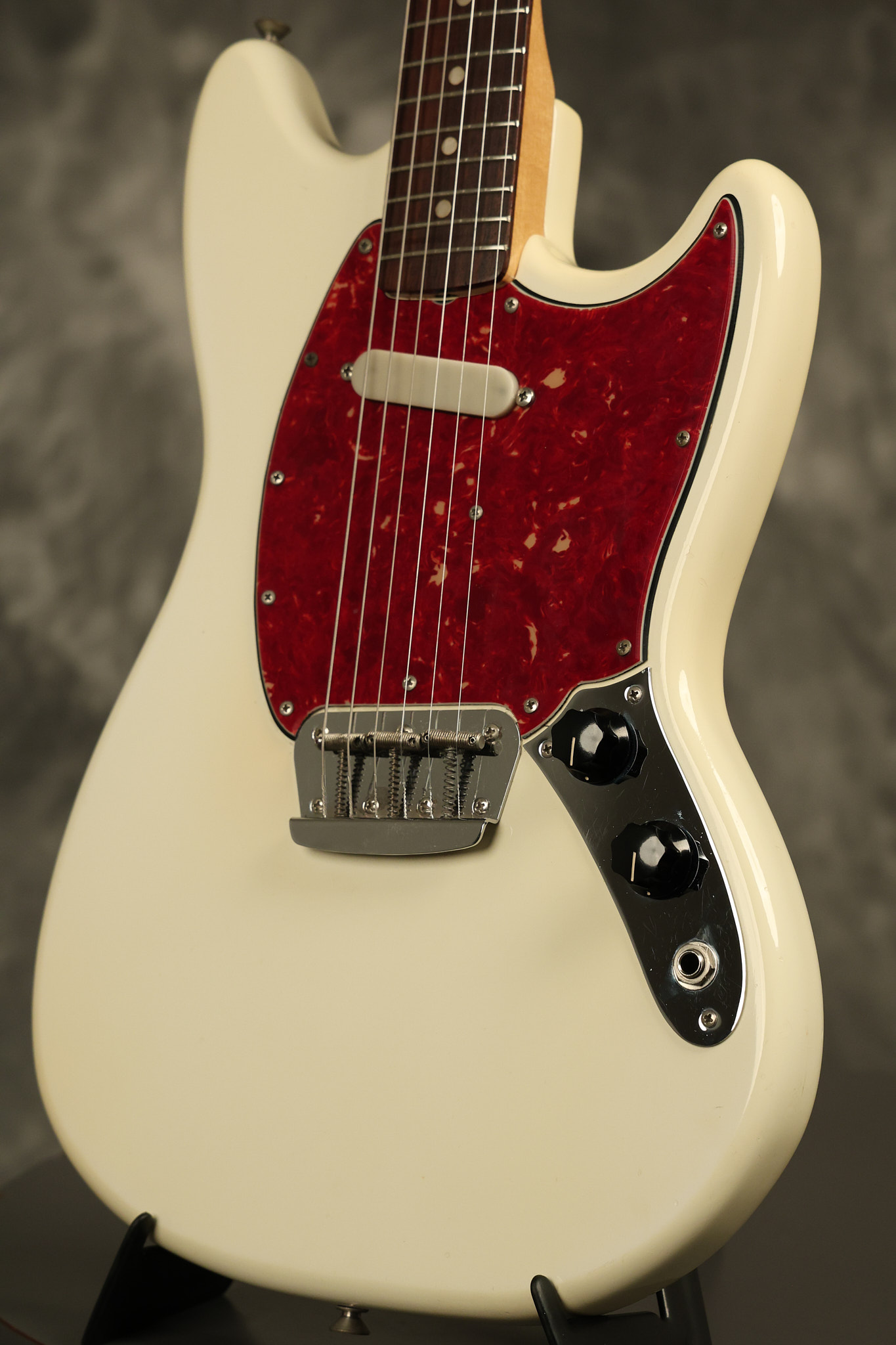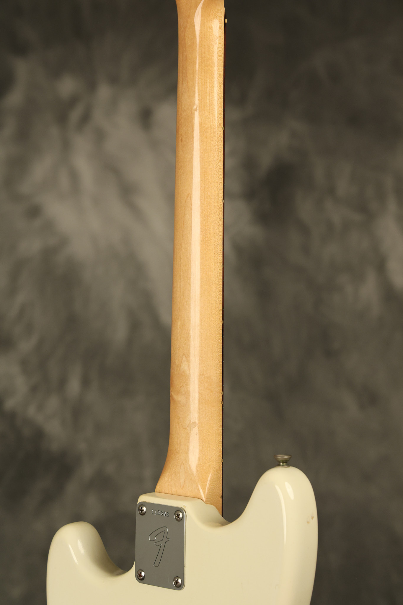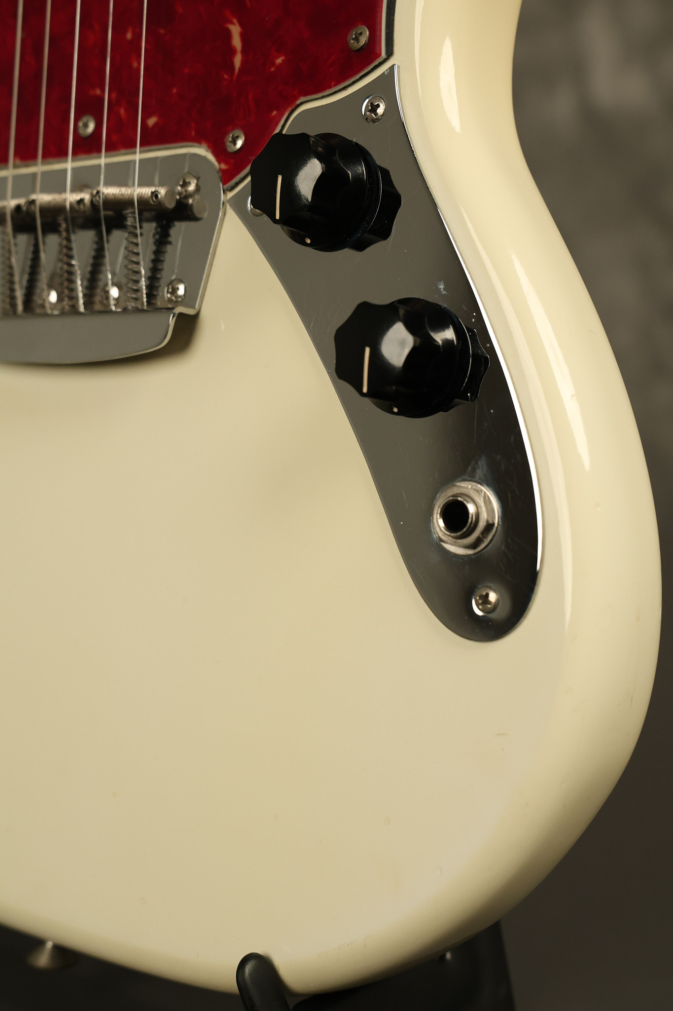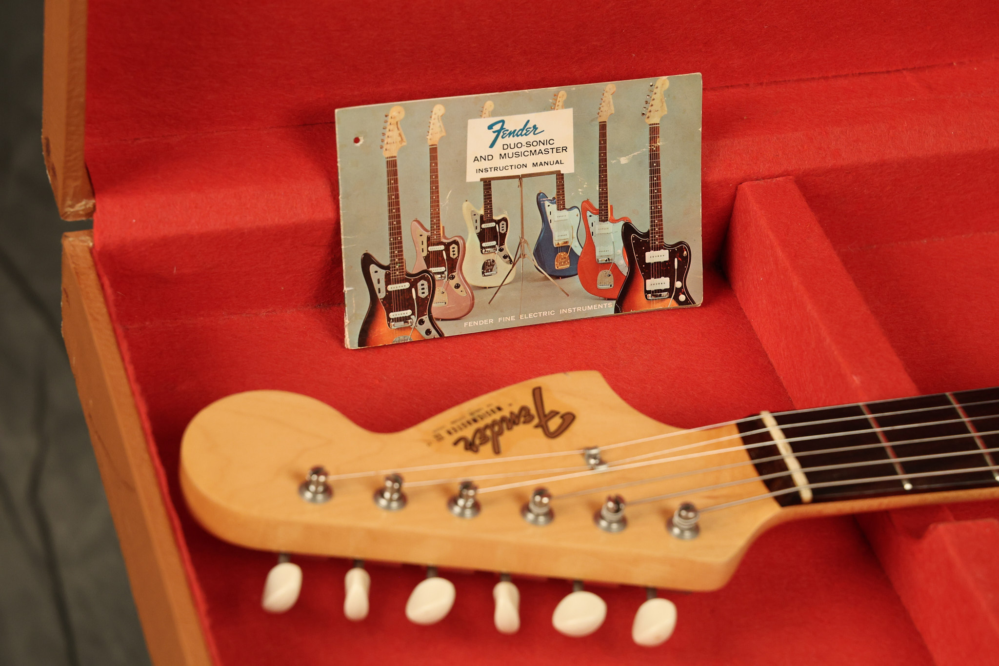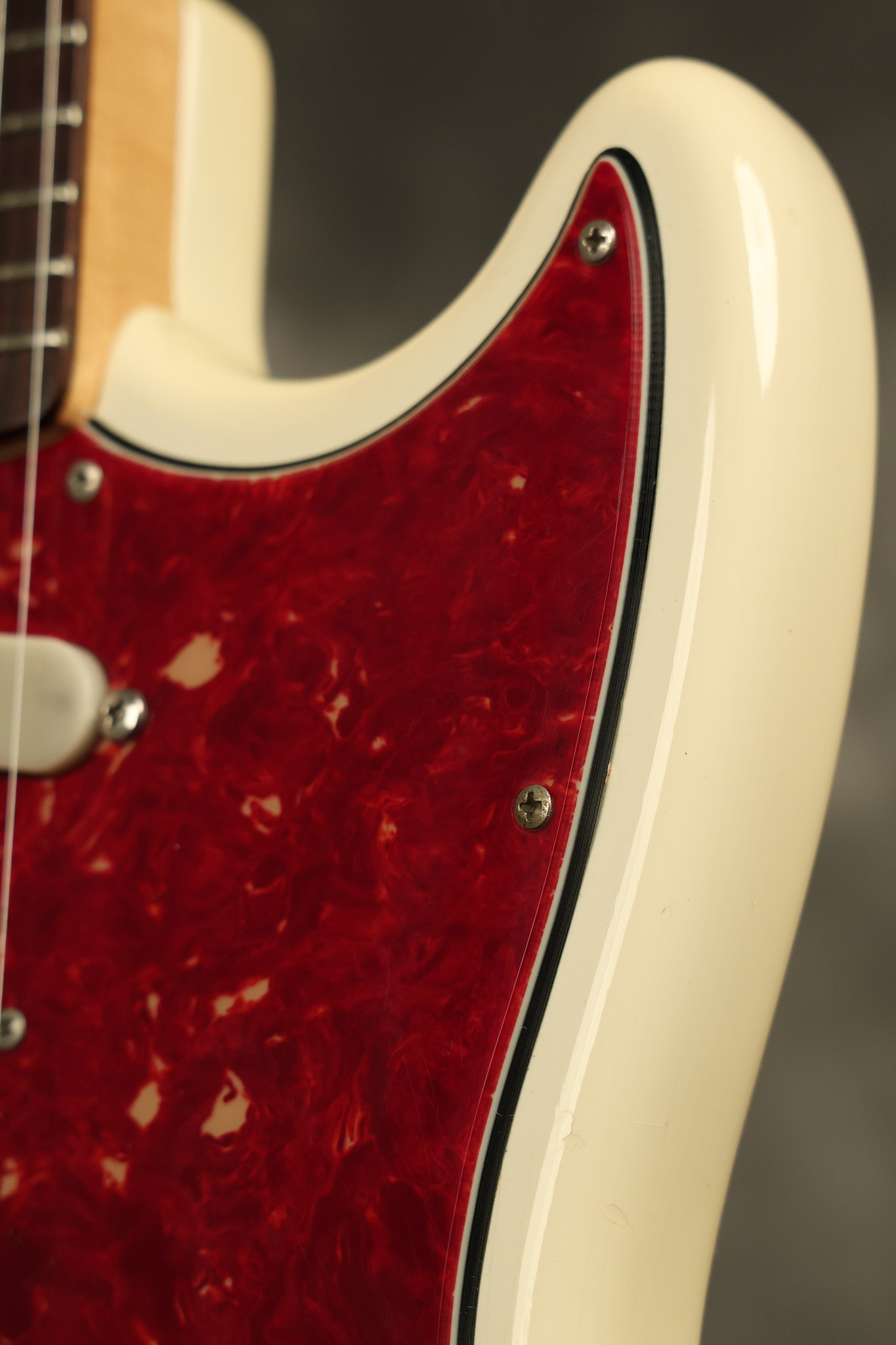 1966 Fender Musicmaster II in its original White finish. It has a great playing SLAB BOARD neck with great frets. It's all original with the exception of the jack and an added ground wire. It's also 100% complete along with it its original hardshell case and HANG TAG with the matching serial number. It's in EXCELLENT condition with only a few nicks + dings, very light finish checking and other cosmetic wear. Everything remains structurally sound with no cracks, breaks or repairs. All electronics work and sound great.
