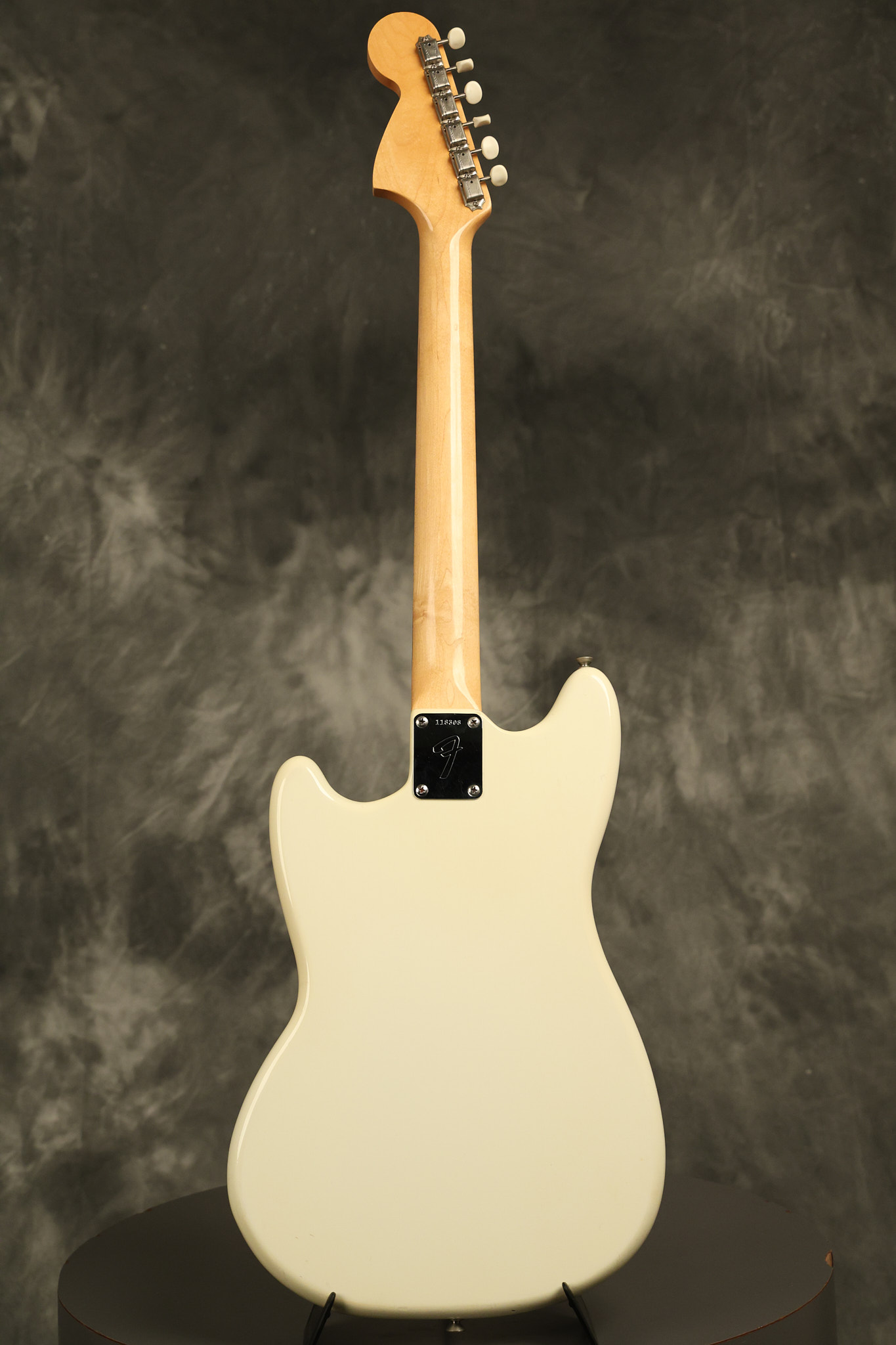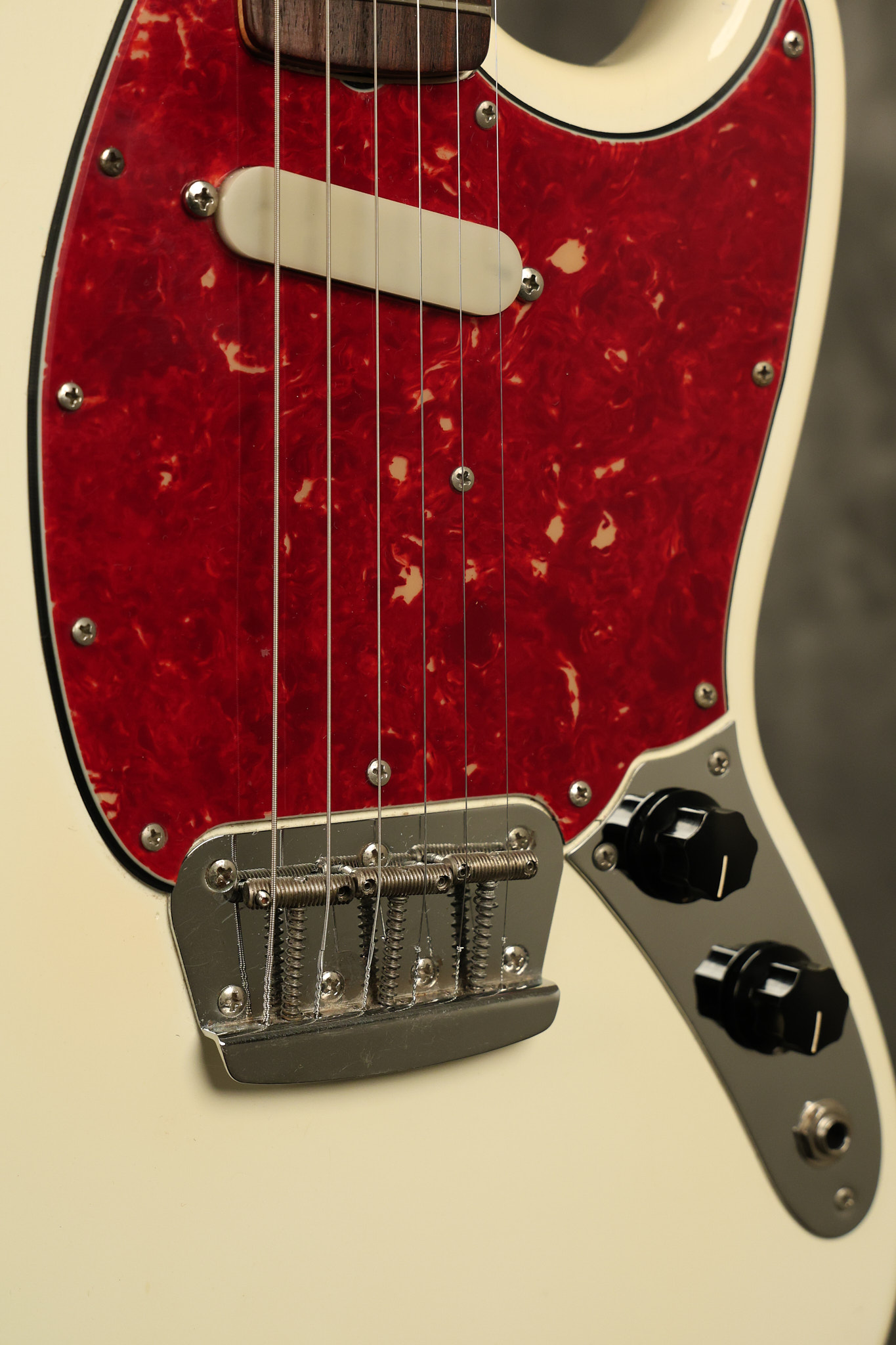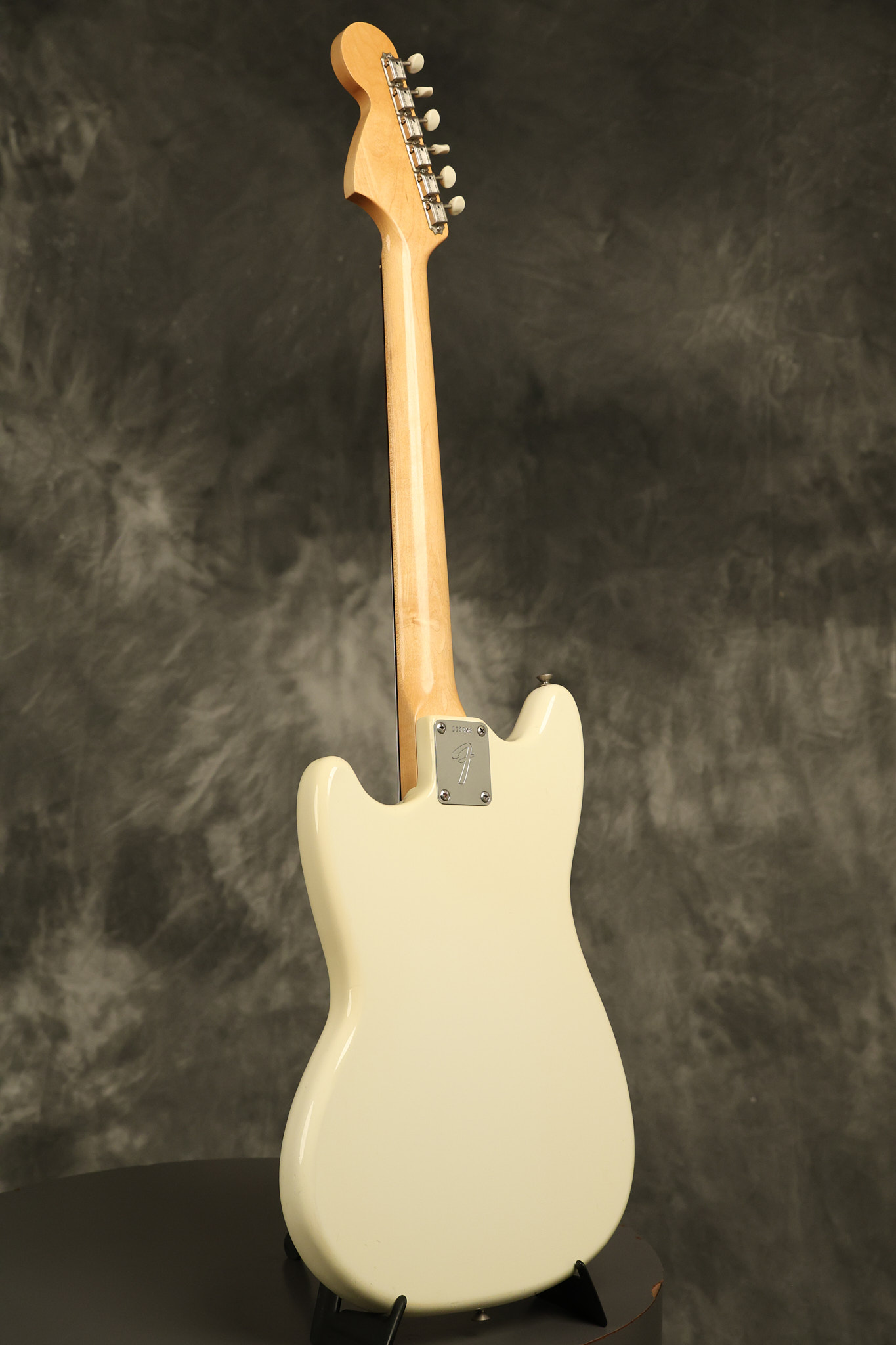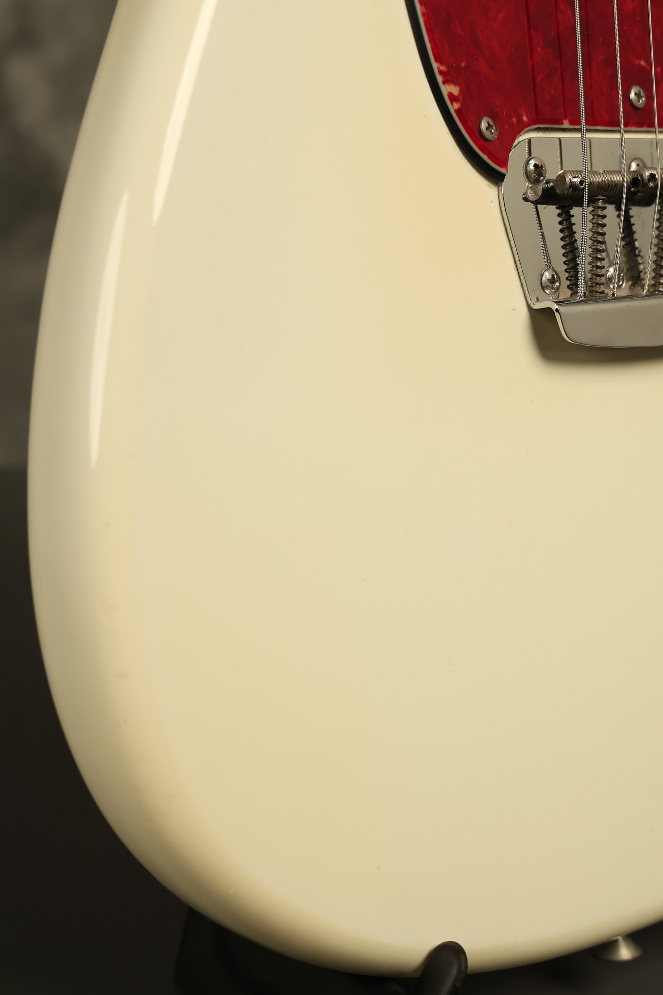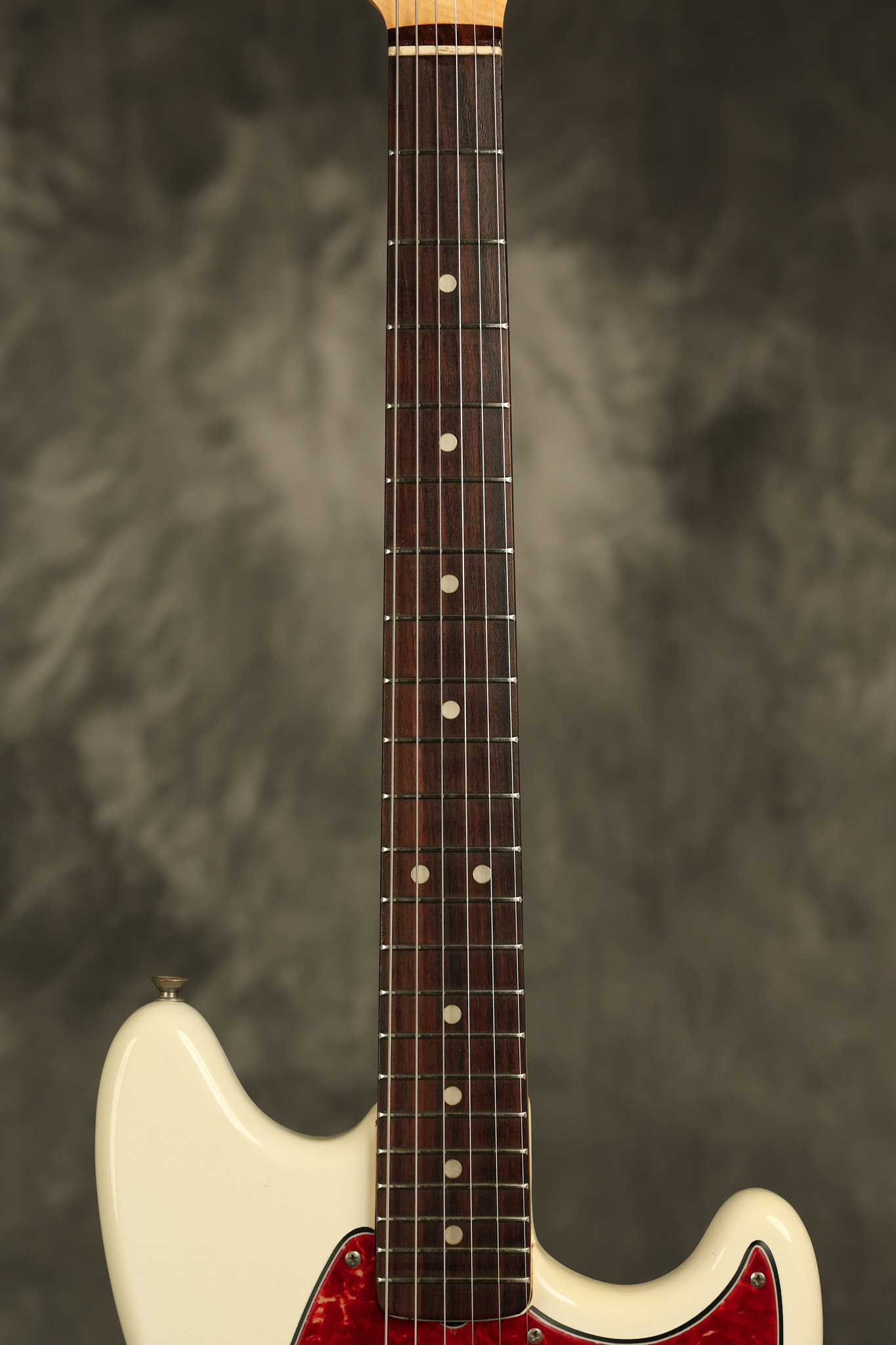 1966 Fender Musicmaster II in its original White finish. It has a great playing SLAB BOARD neck with great frets. It's all original with the exception of the jack and an added ground wire. It's also 100% complete along with it its original hardshell case and HANG TAG with the matching serial number. It's in EXCELLENT condition with only a few nicks + dings, very light finish checking and other cosmetic wear. Everything remains structurally sound with no cracks, breaks or repairs. All electronics work and sound great.