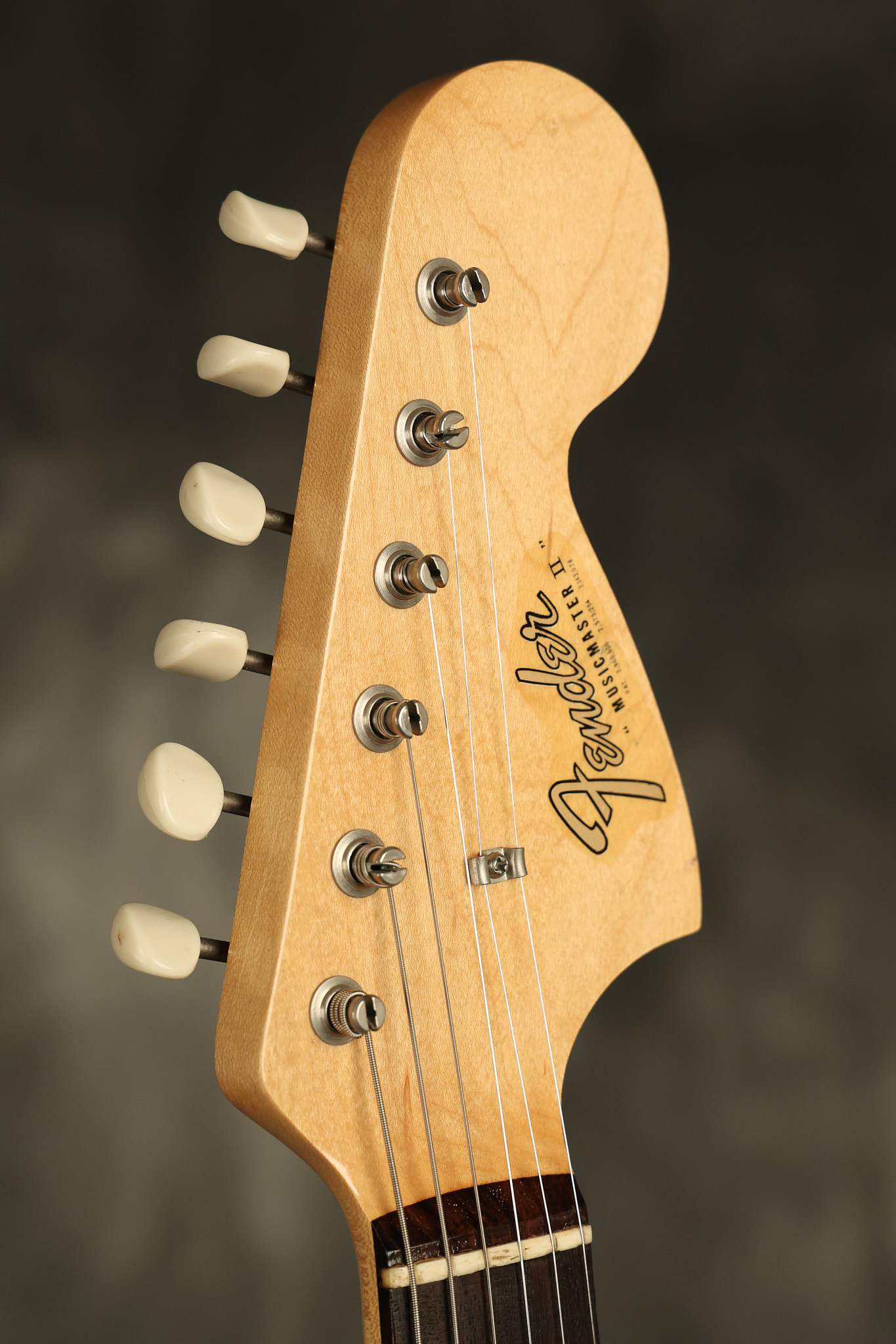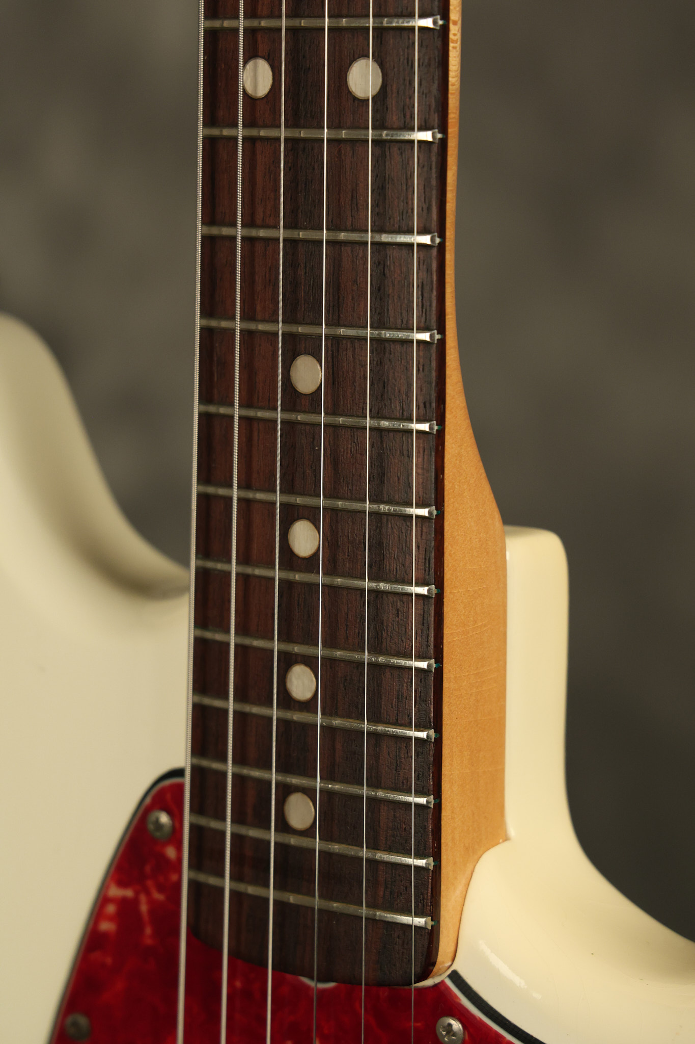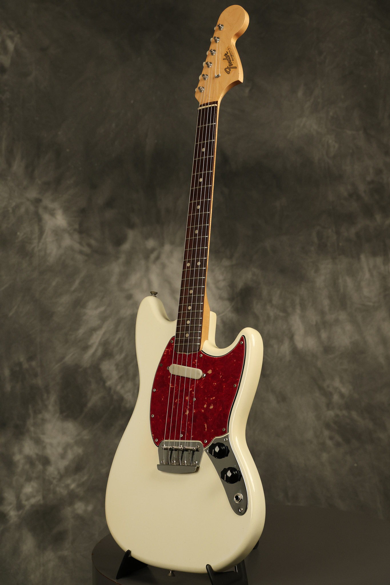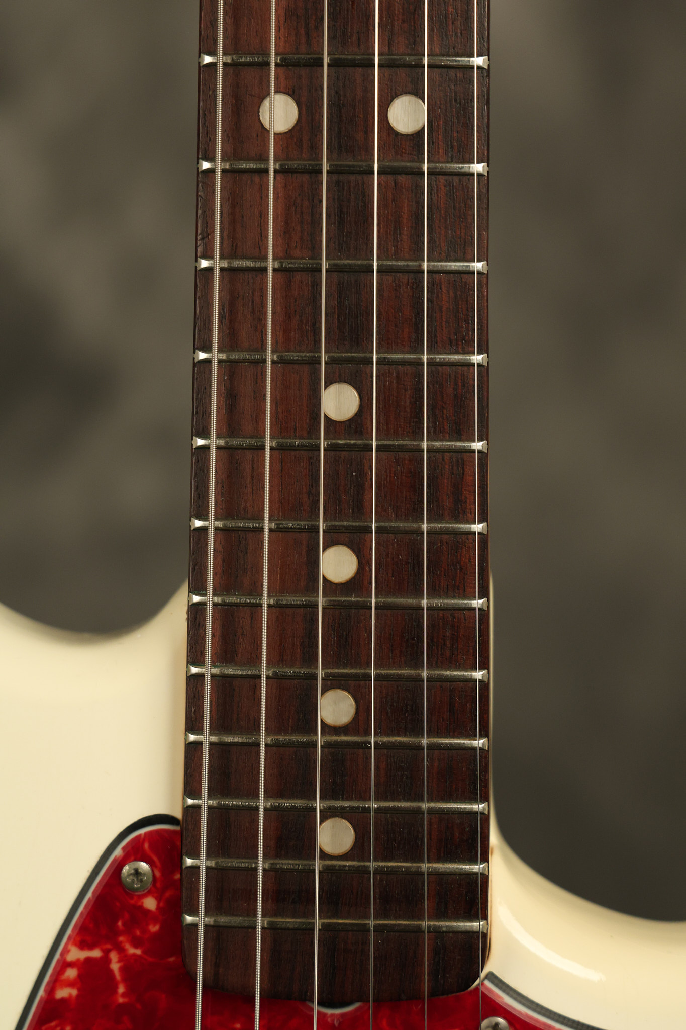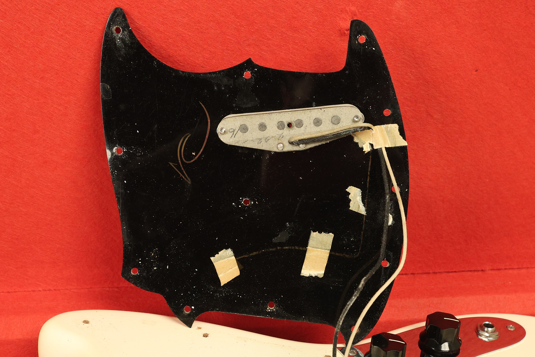 1966 Fender Musicmaster II in its original White finish. It has a great playing SLAB BOARD neck with great frets. It's all original with the exception of the jack and an added ground wire. It's also 100% complete along with it its original hardshell case and HANG TAG with the matching serial number. It's in EXCELLENT condition with only a few nicks + dings, very light finish checking and other cosmetic wear. Everything remains structurally sound with no cracks, breaks or repairs. All electronics work and sound great.