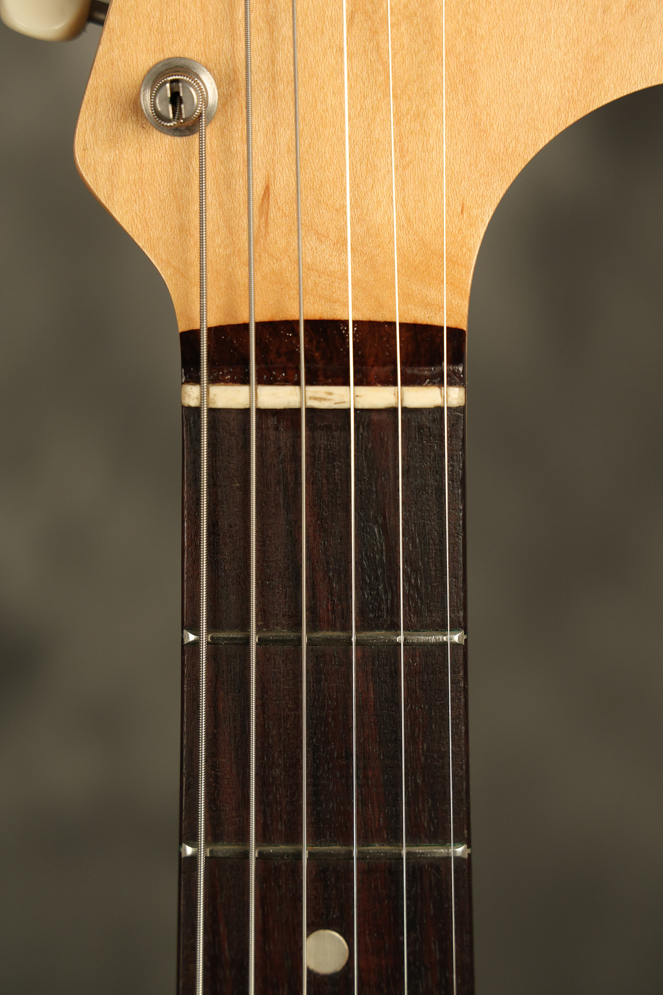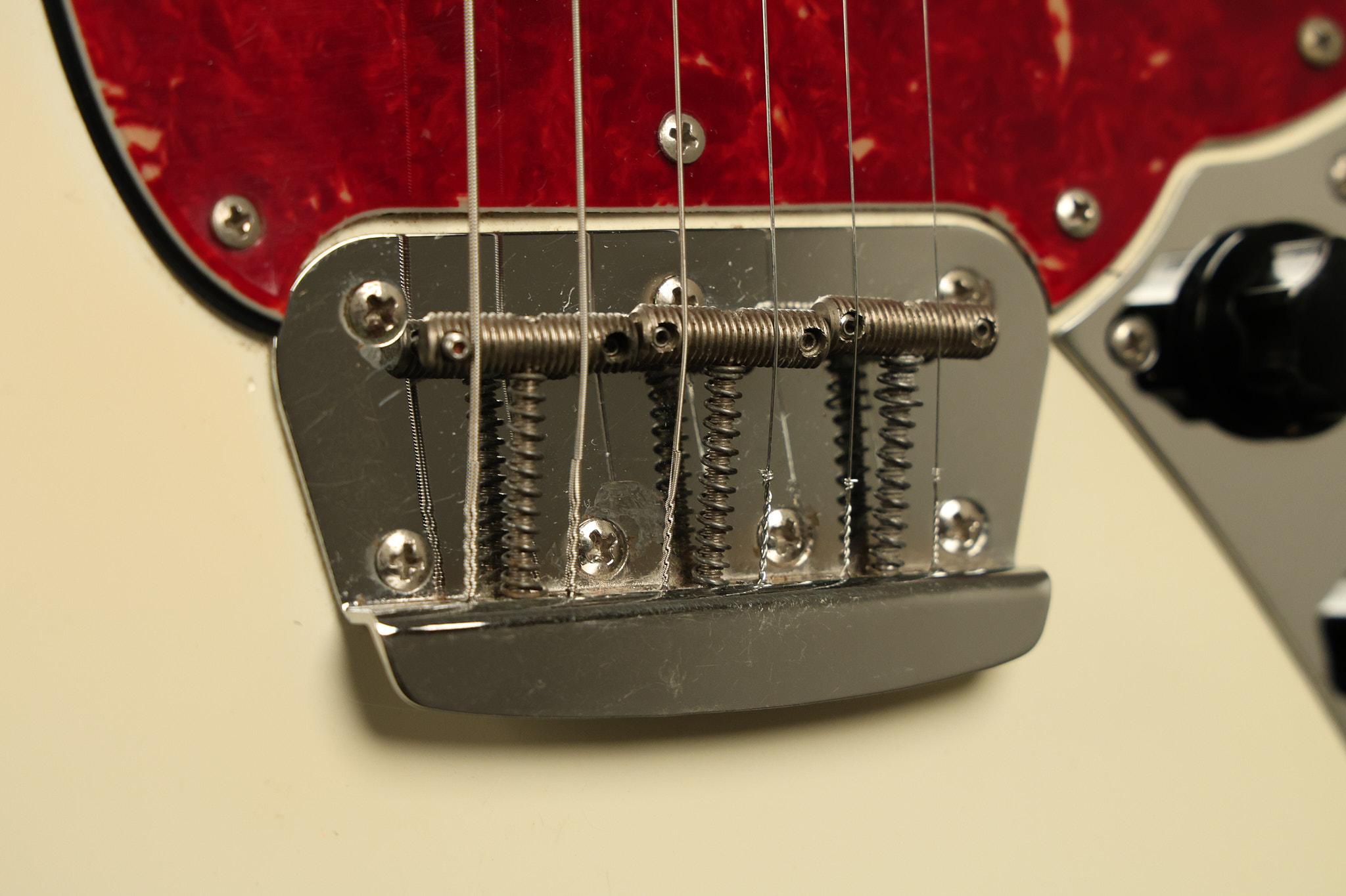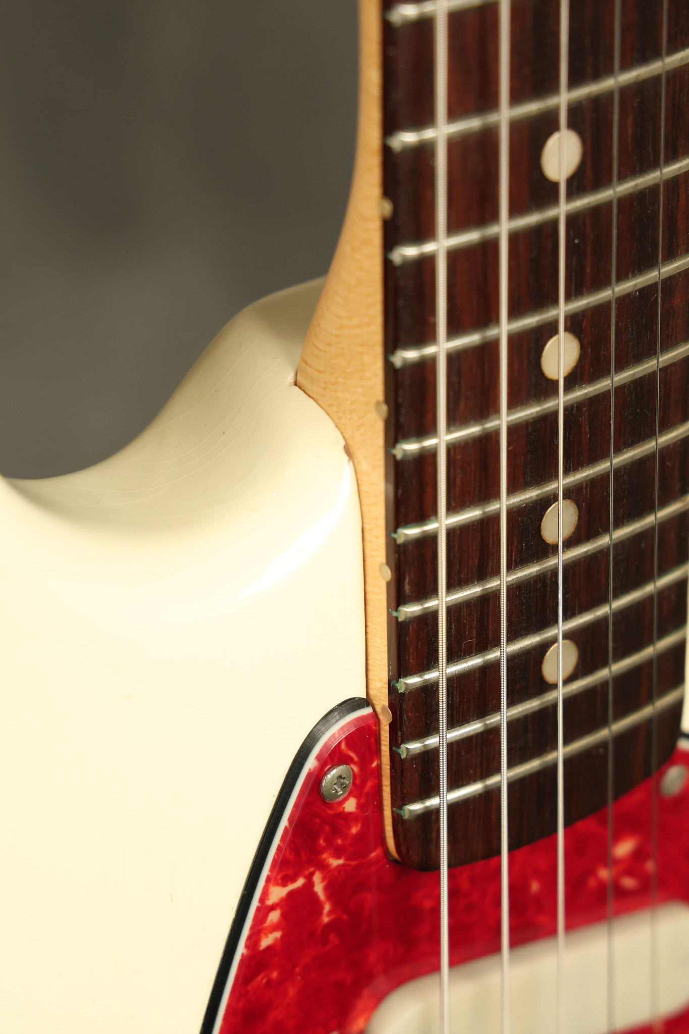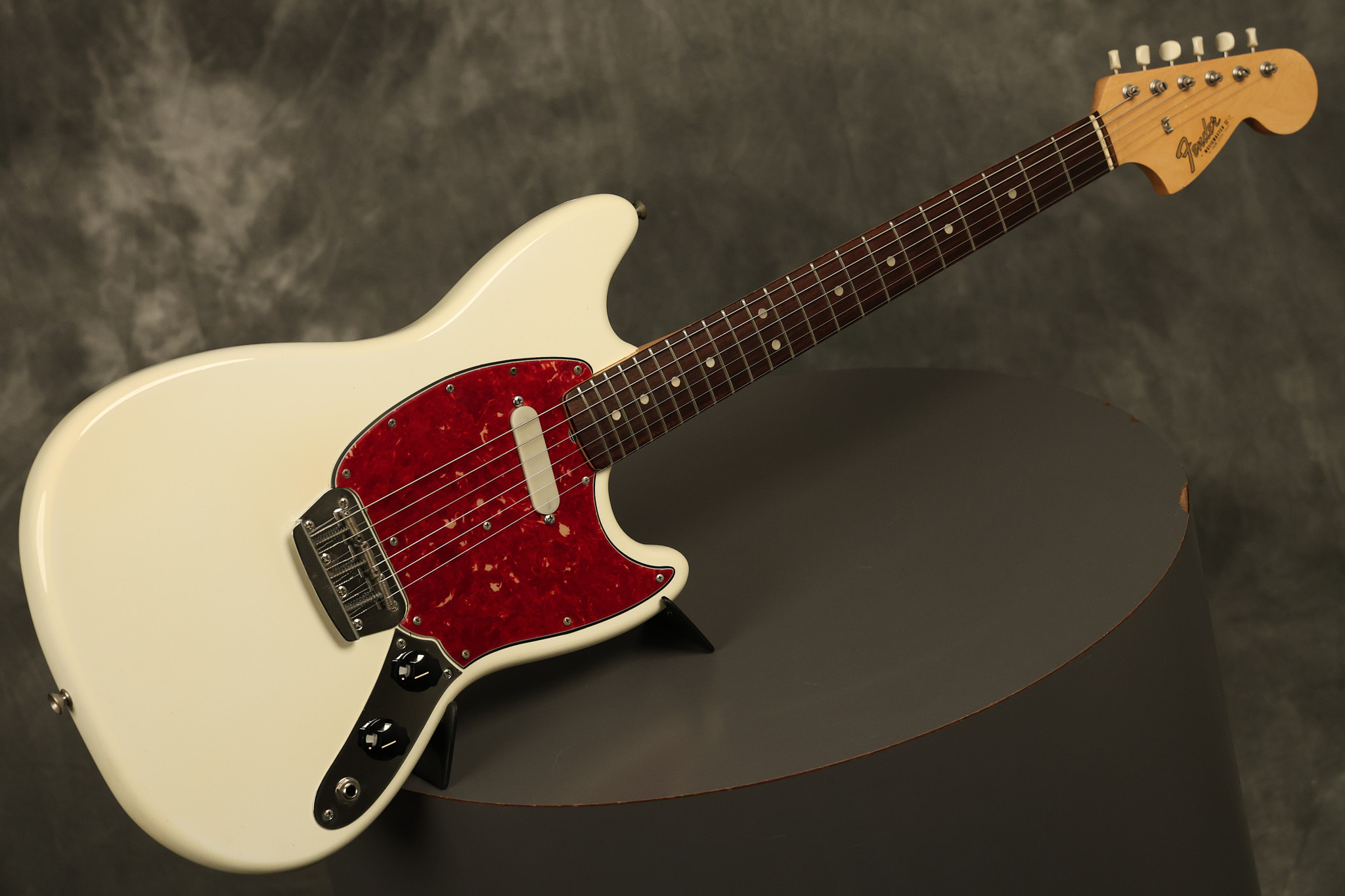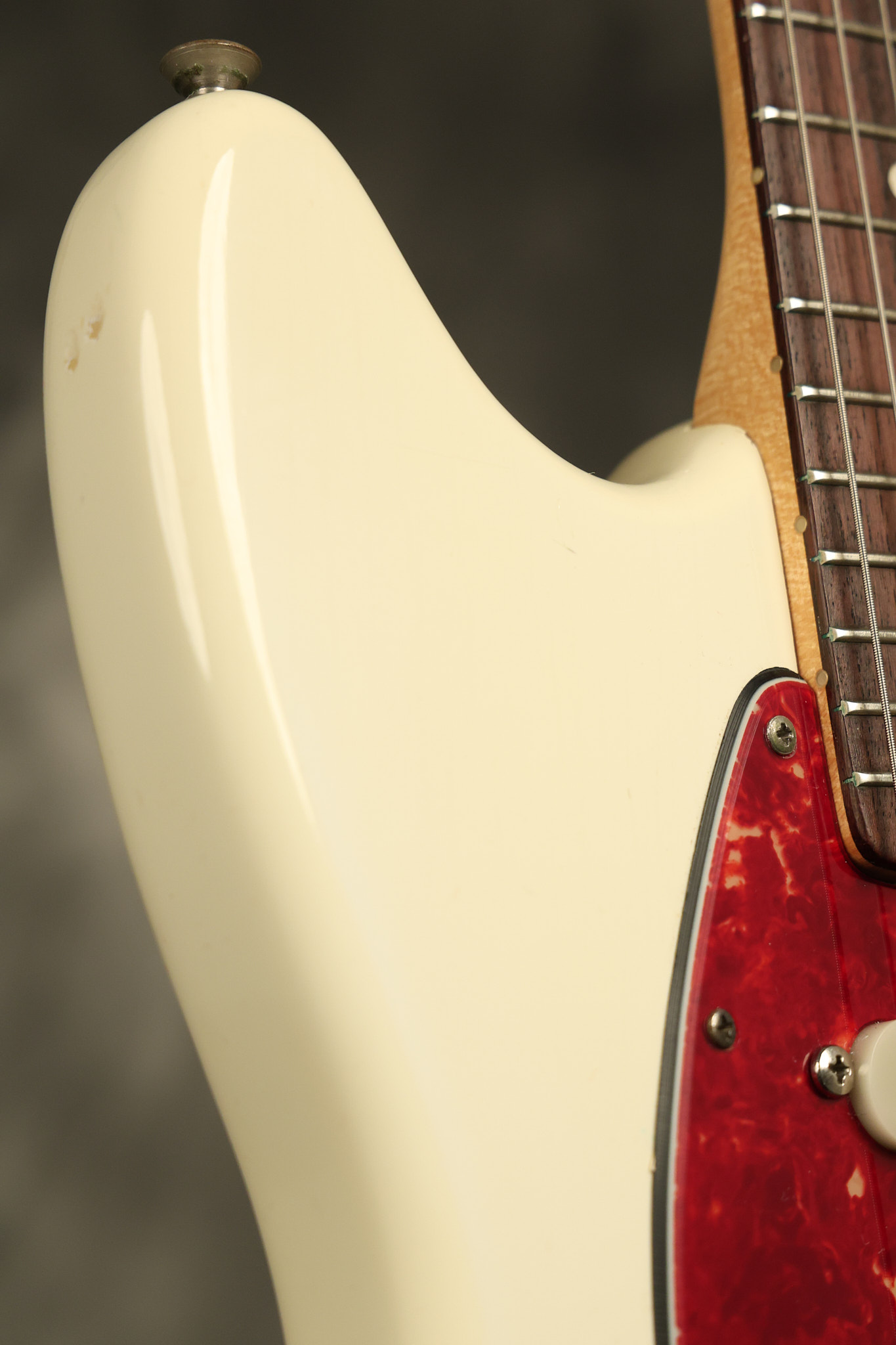 1966 Fender Musicmaster II in its original White finish. It has a great playing SLAB BOARD neck with great frets. It's all original with the exception of the jack and an added ground wire. It's also 100% complete along with it its original hardshell case and HANG TAG with the matching serial number. It's in EXCELLENT condition with only a few nicks + dings, very light finish checking and other cosmetic wear. Everything remains structurally sound with no cracks, breaks or repairs. All electronics work and sound great.