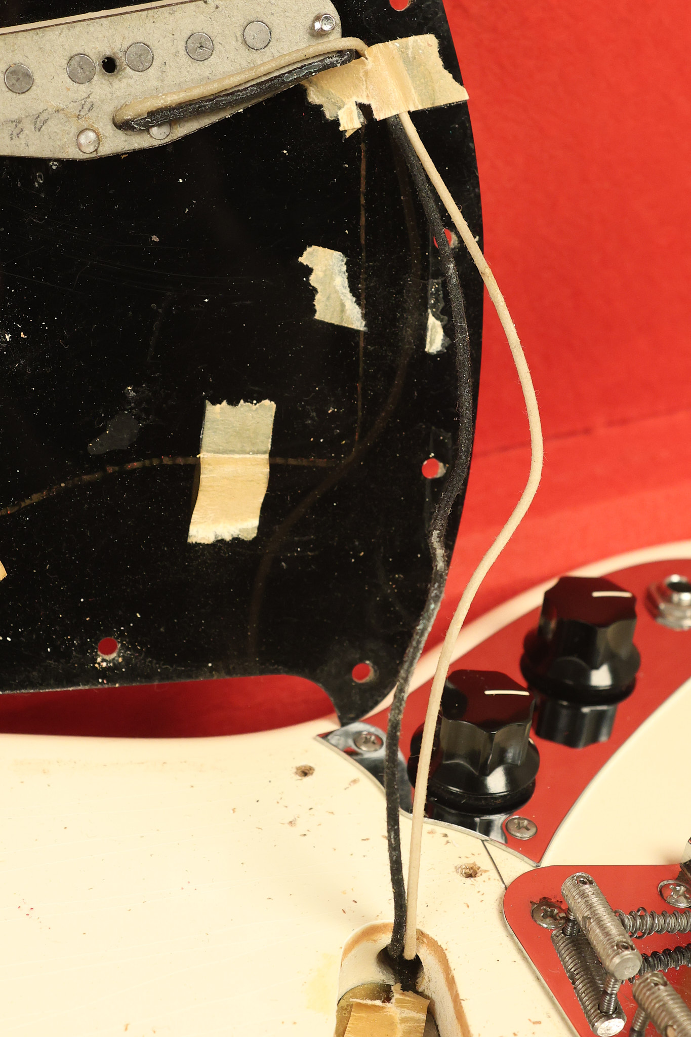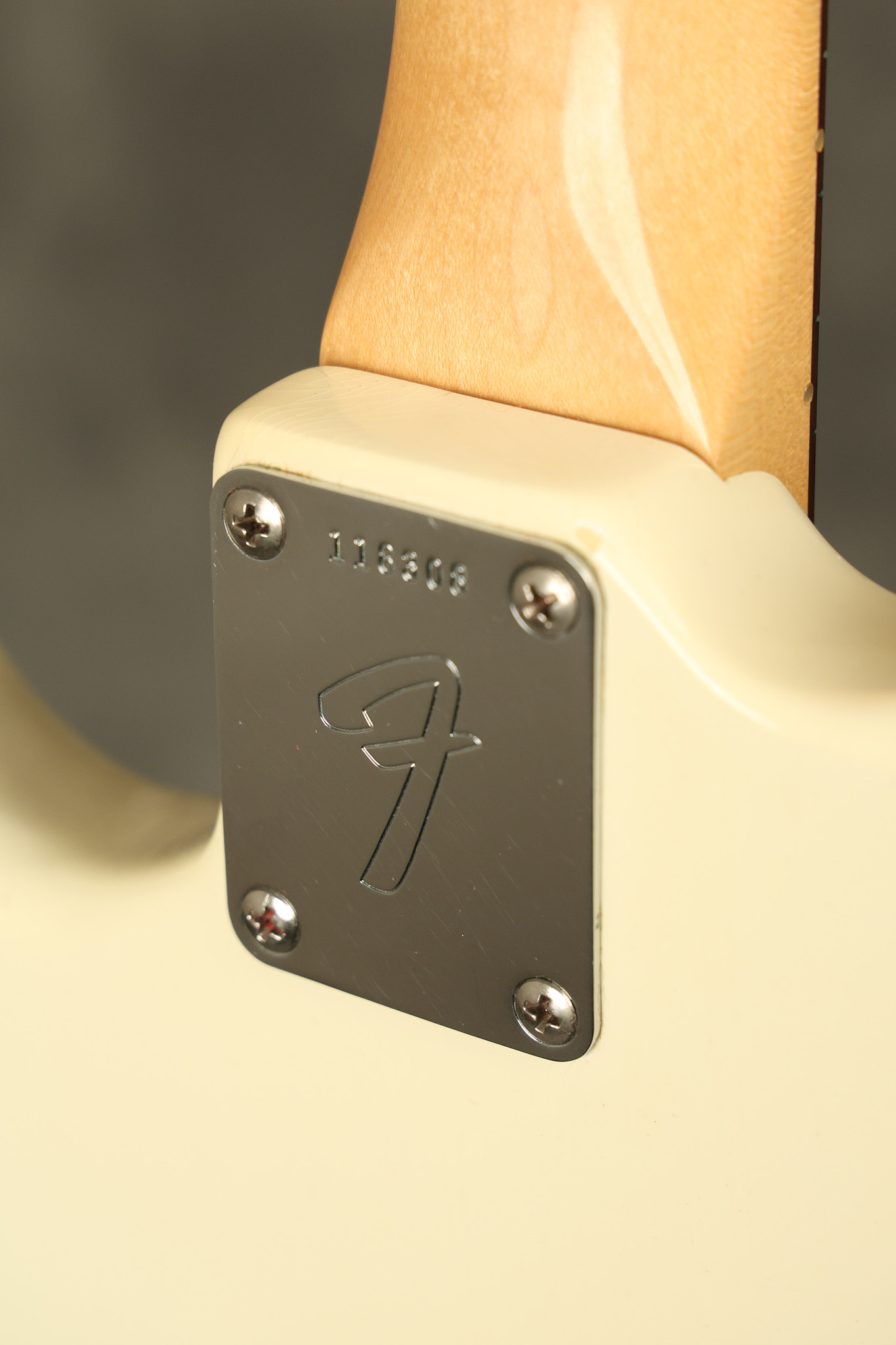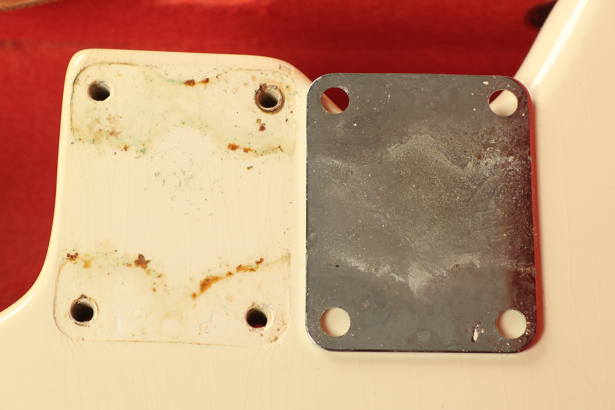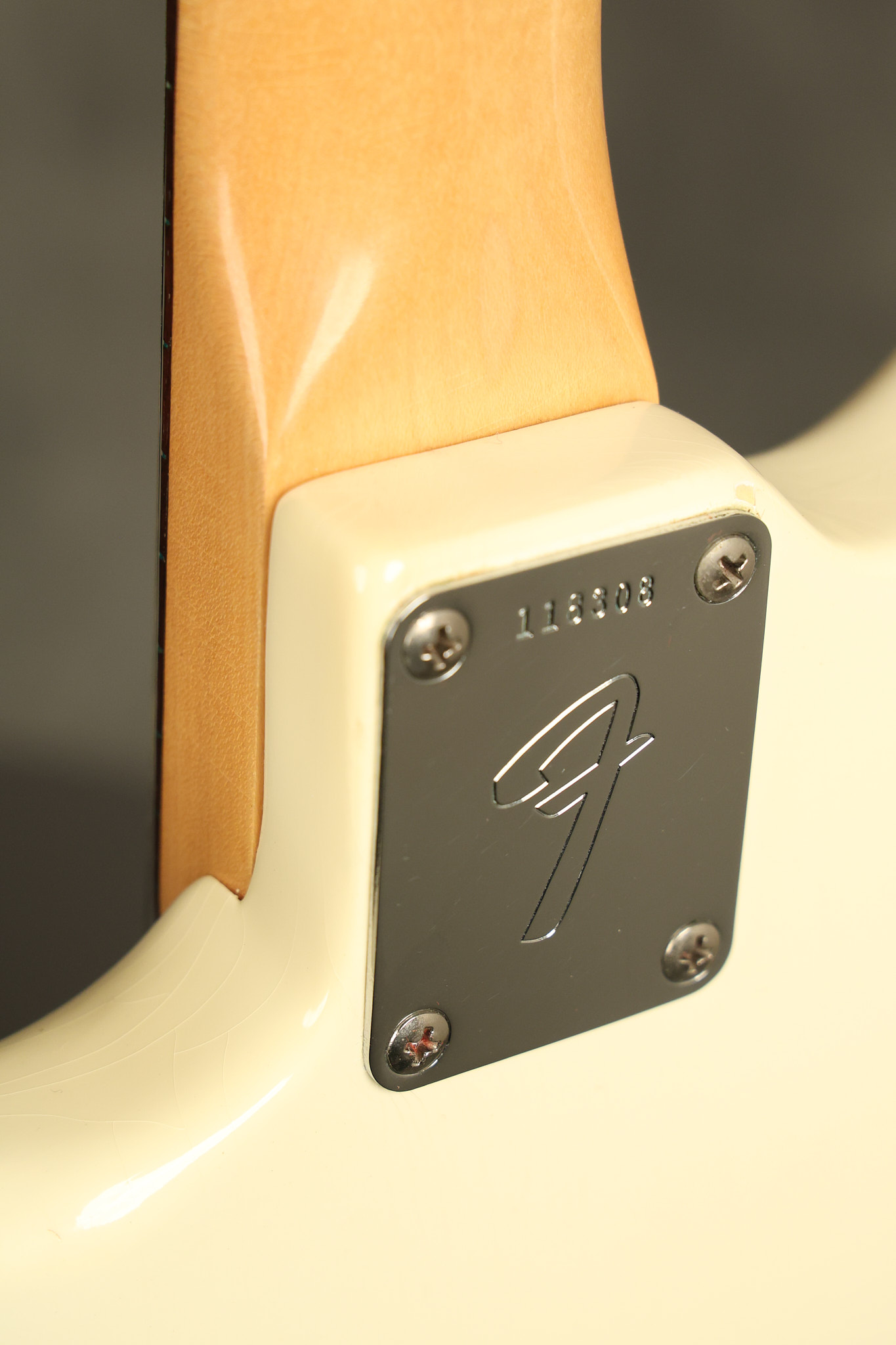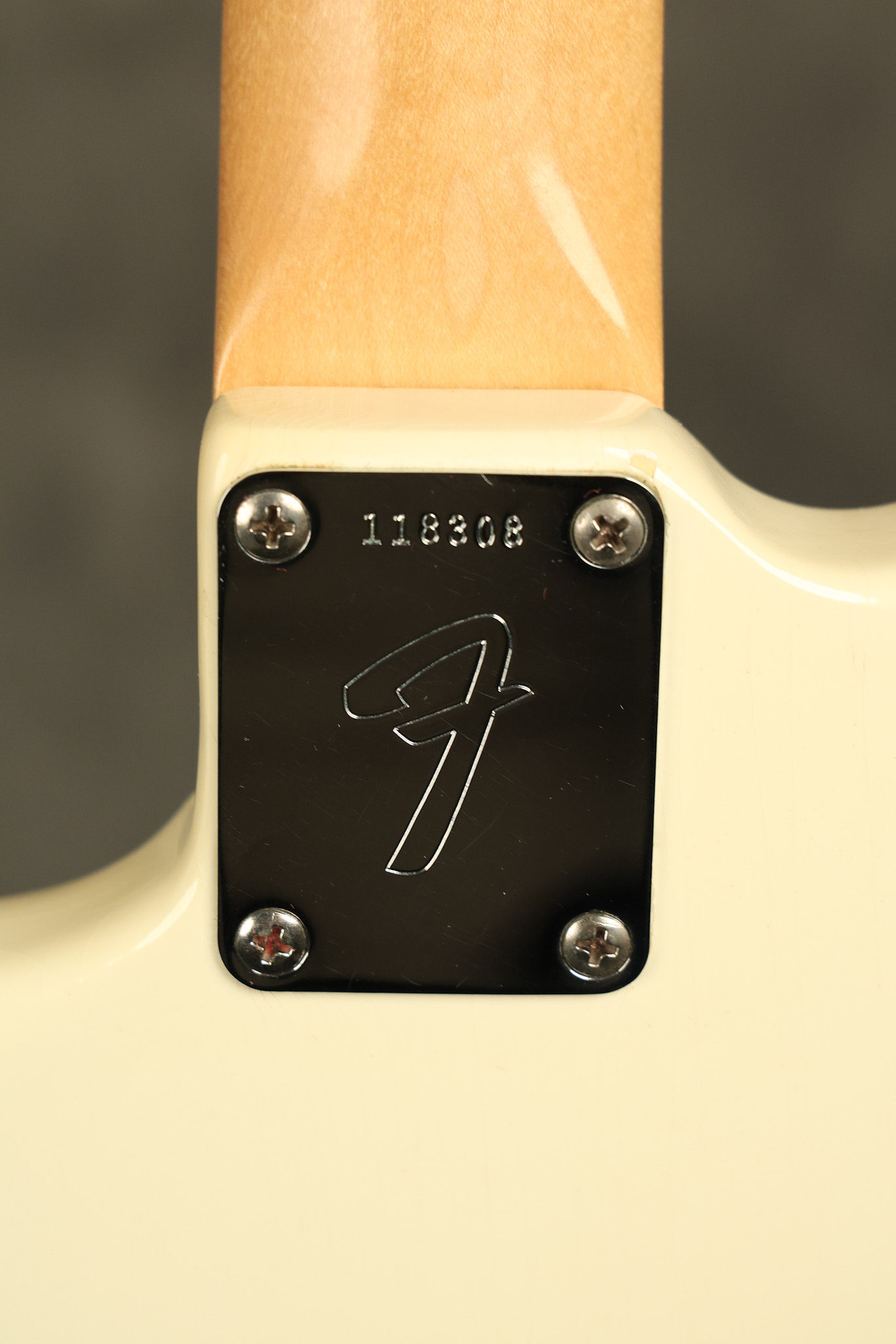 1966 Fender Musicmaster II in its original White finish. It has a great playing SLAB BOARD neck with great frets. It's all original with the exception of the jack and an added ground wire. It's also 100% complete along with it its original hardshell case and HANG TAG with the matching serial number. It's in EXCELLENT condition with only a few nicks + dings, very light finish checking and other cosmetic wear. Everything remains structurally sound with no cracks, breaks or repairs. All electronics work and sound great.