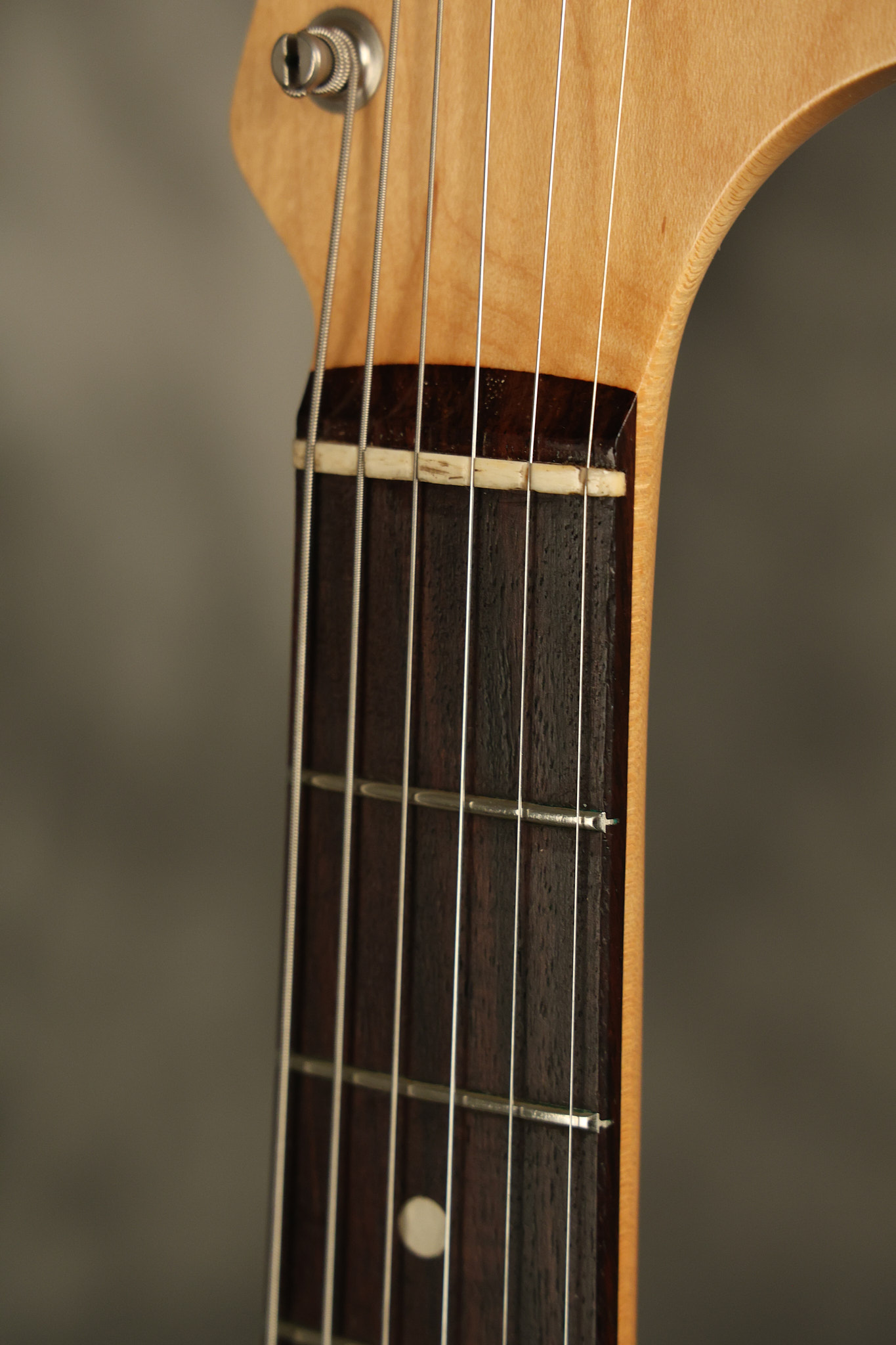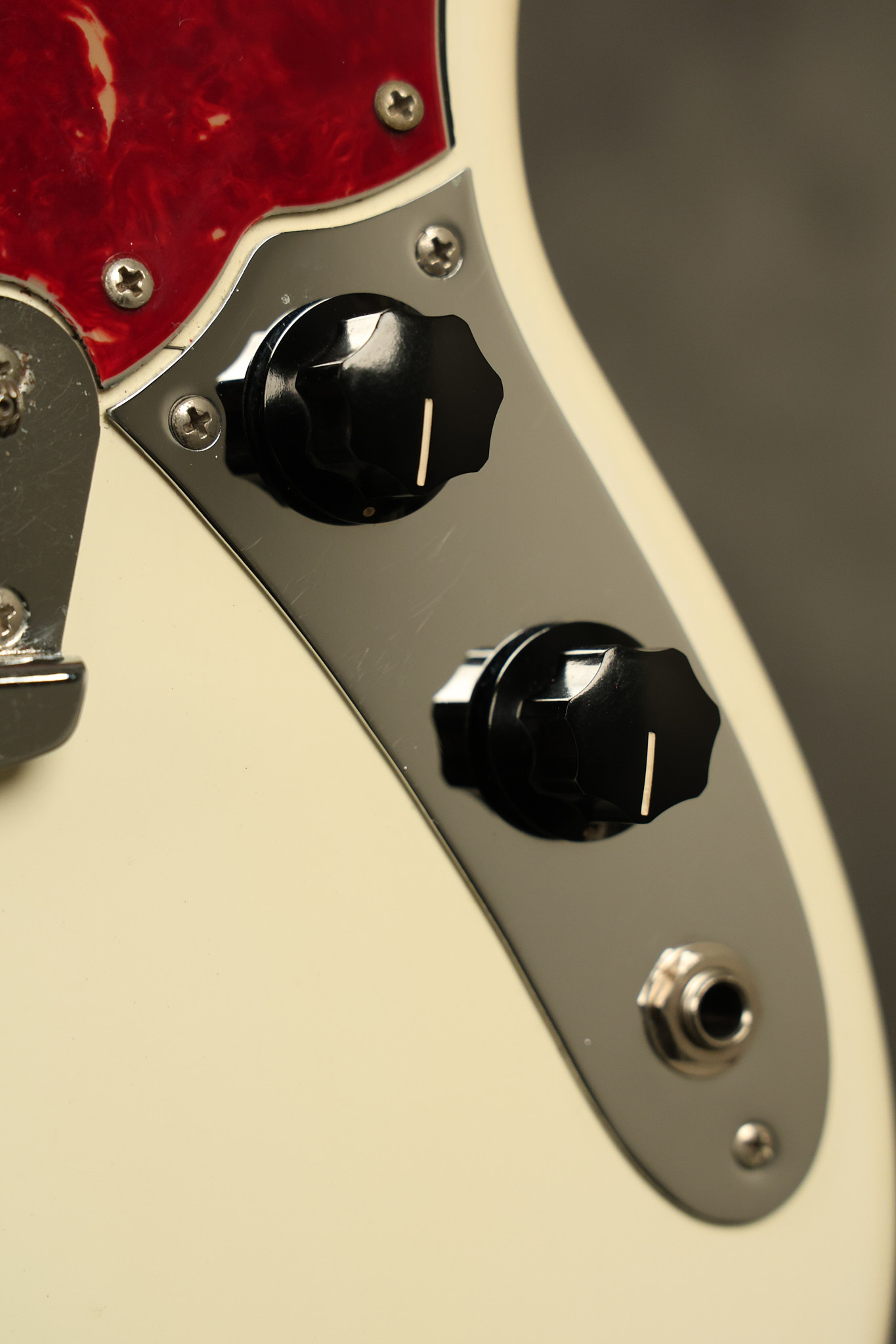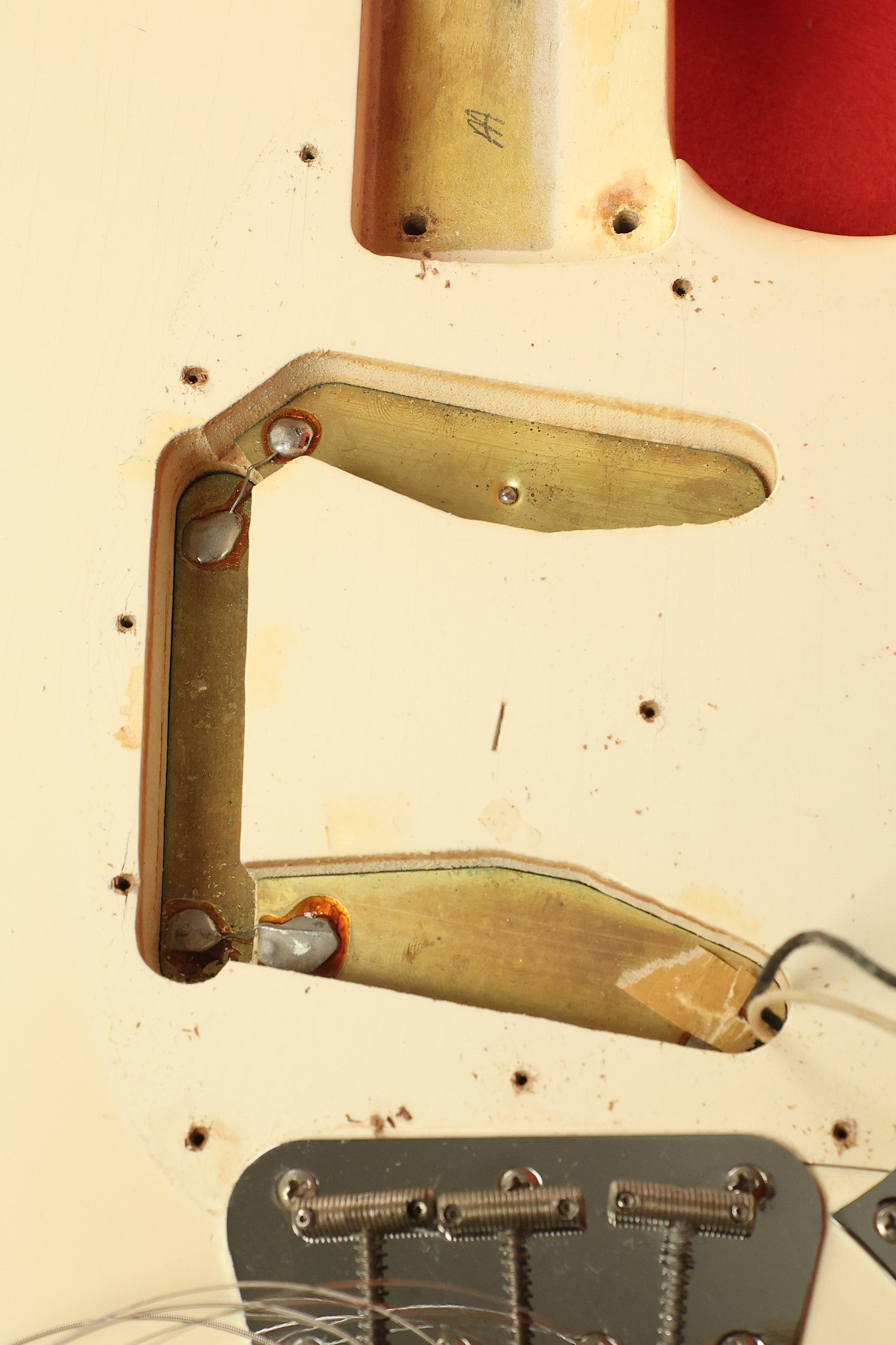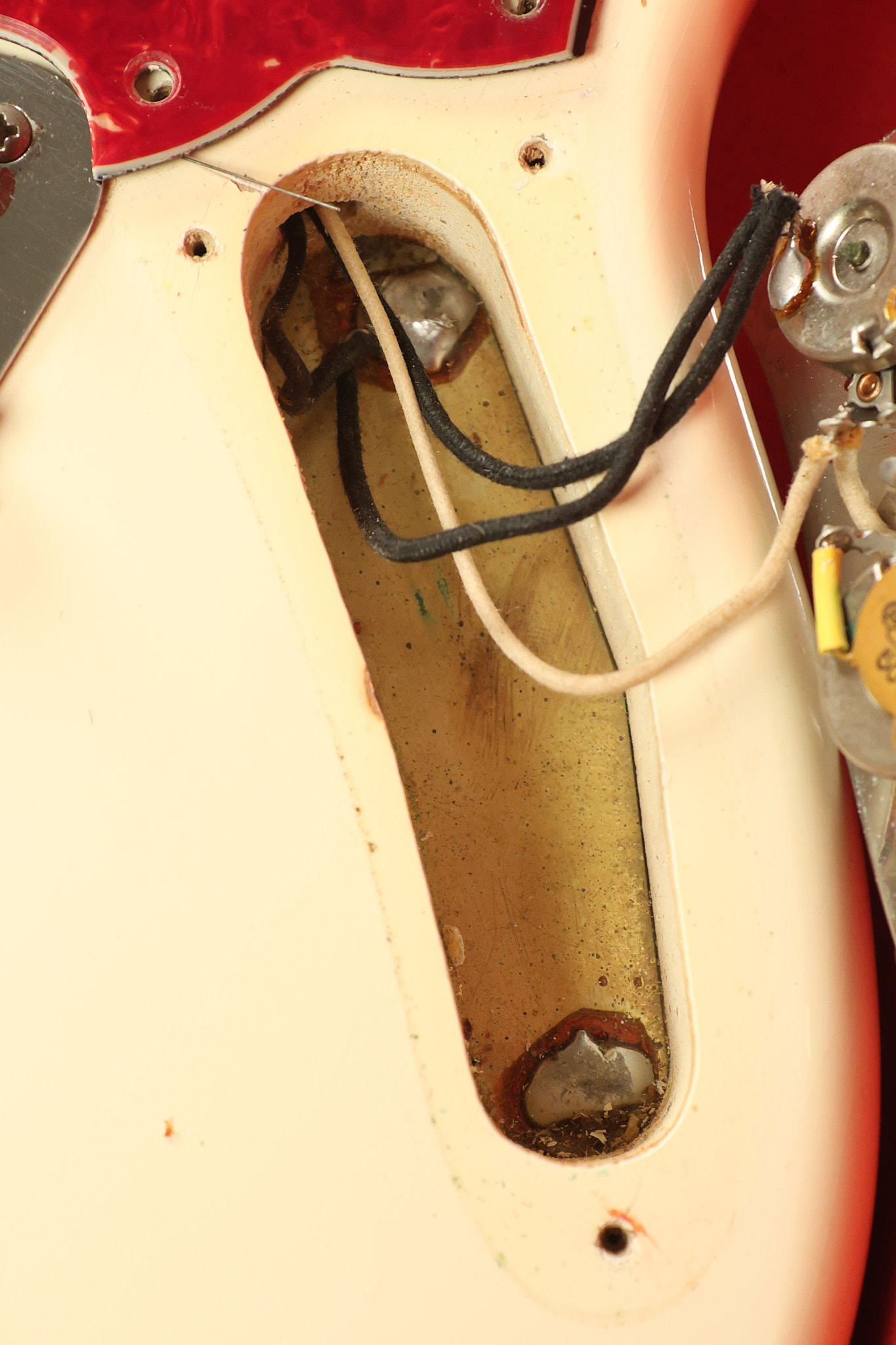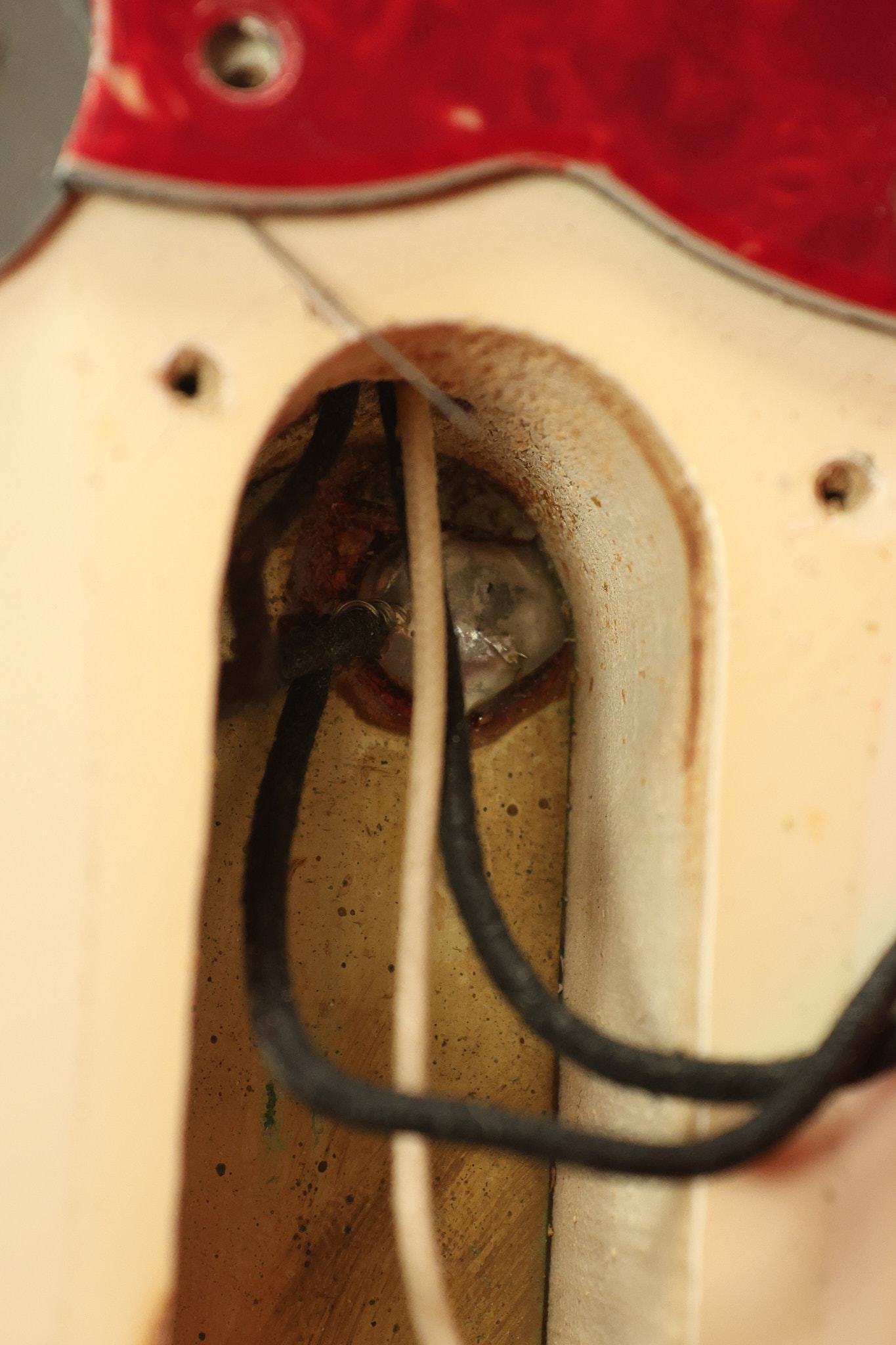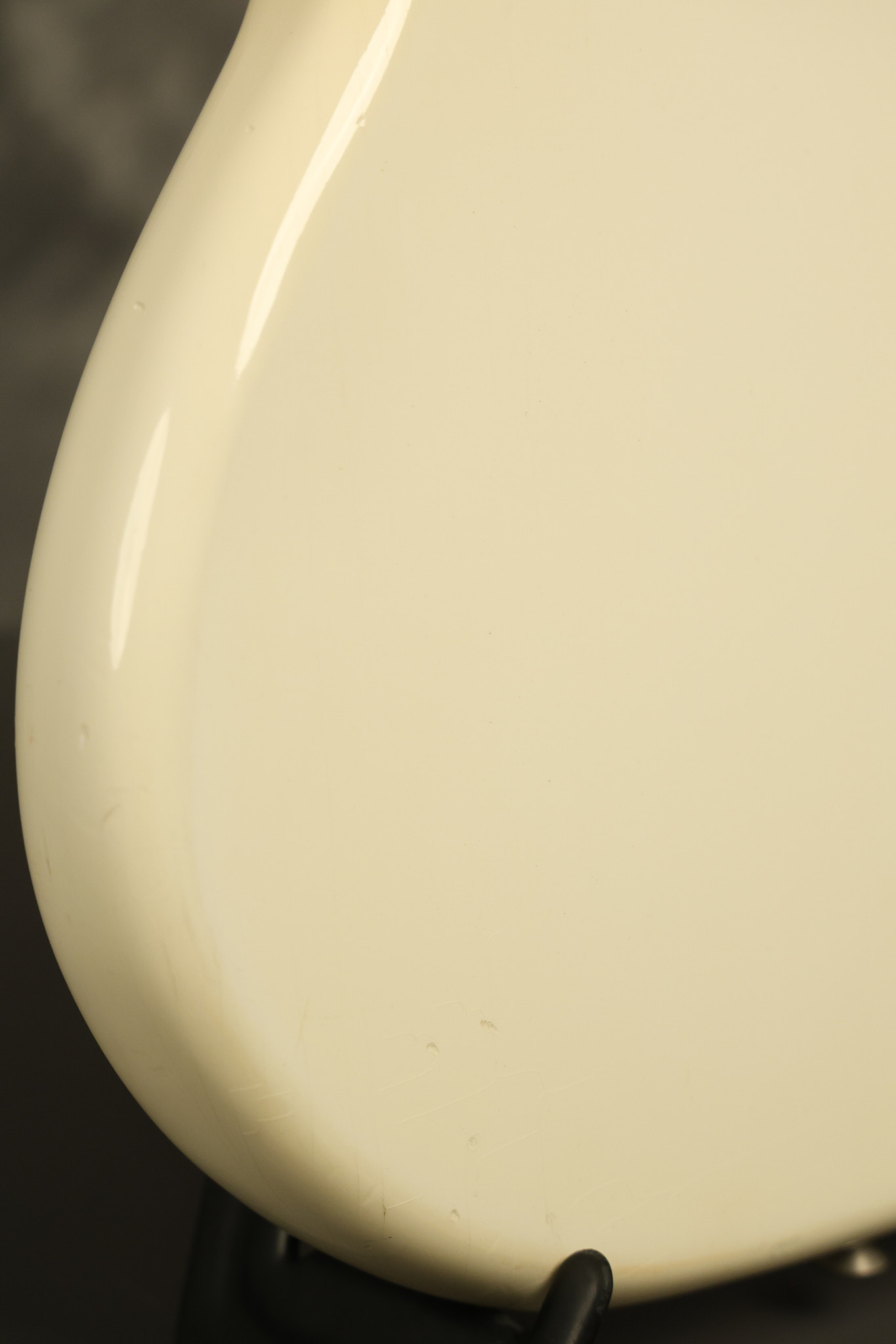 1966 Fender Musicmaster II in its original White finish. It has a great playing SLAB BOARD neck with great frets. It's all original with the exception of the jack and an added ground wire. It's also 100% complete along with it its original hardshell case and HANG TAG with the matching serial number. It's in EXCELLENT condition with only a few nicks + dings, very light finish checking and other cosmetic wear. Everything remains structurally sound with no cracks, breaks or repairs. All electronics work and sound great.