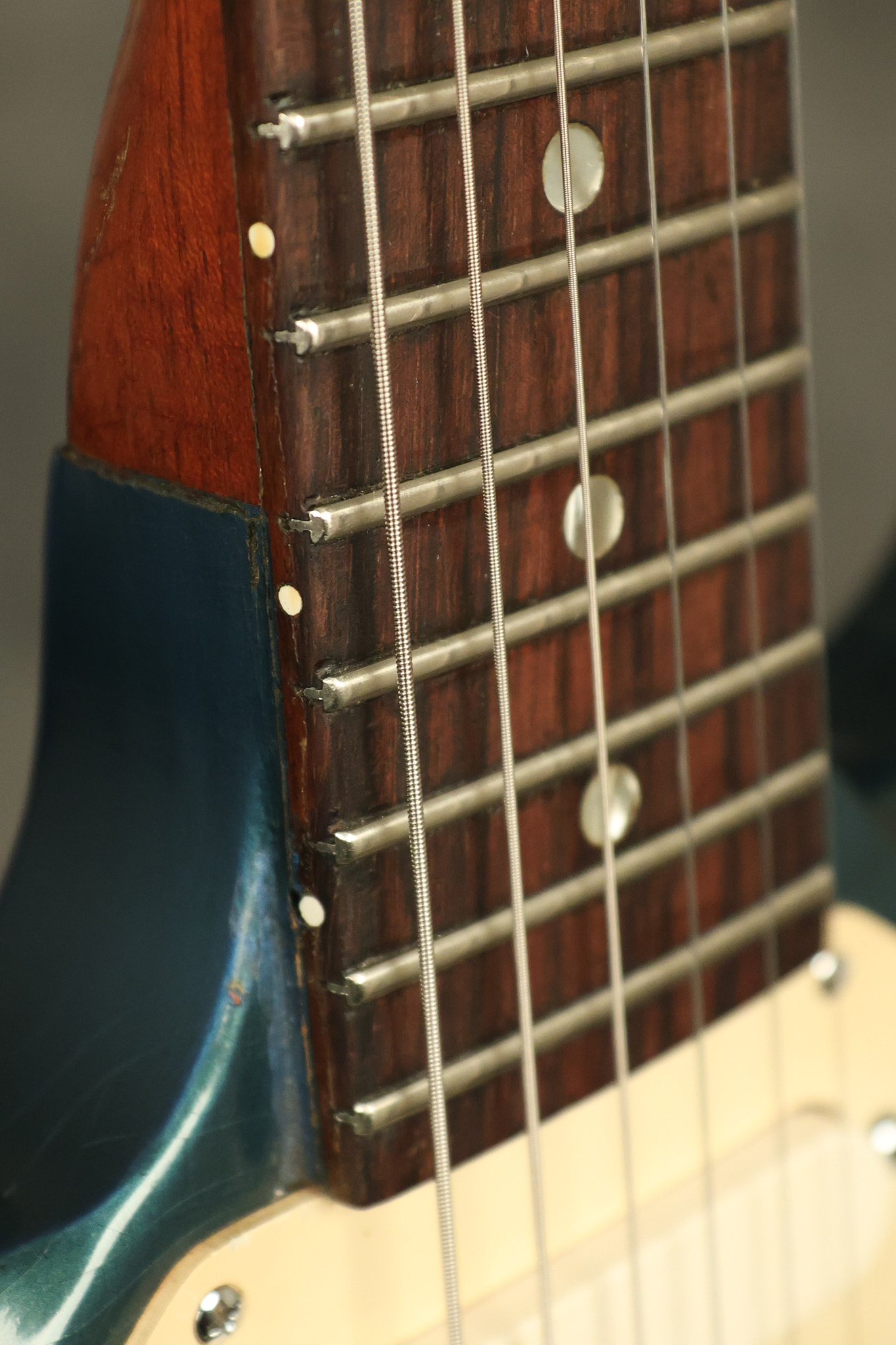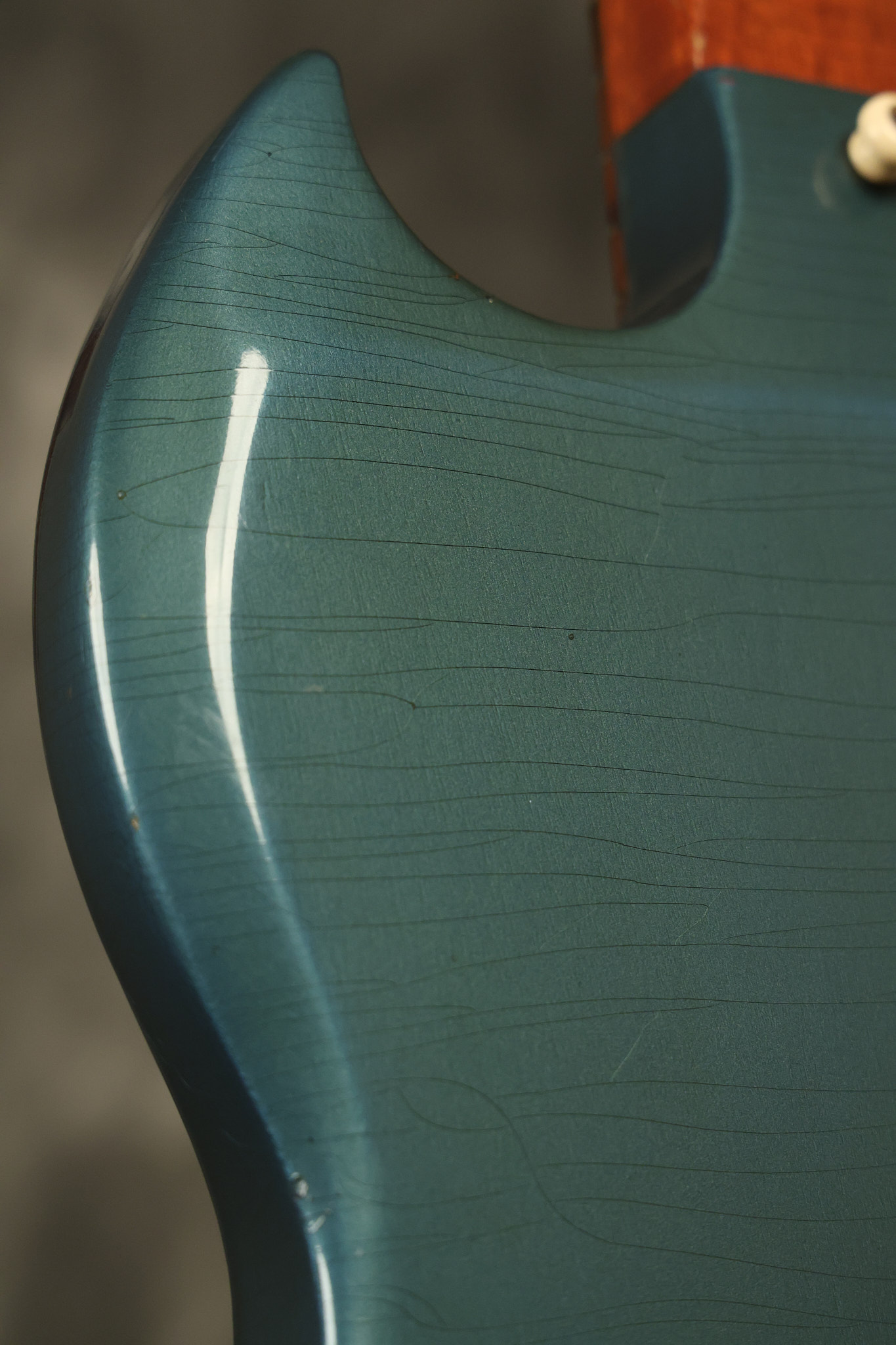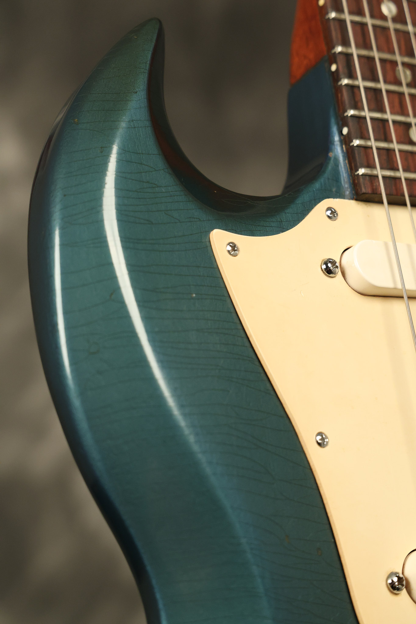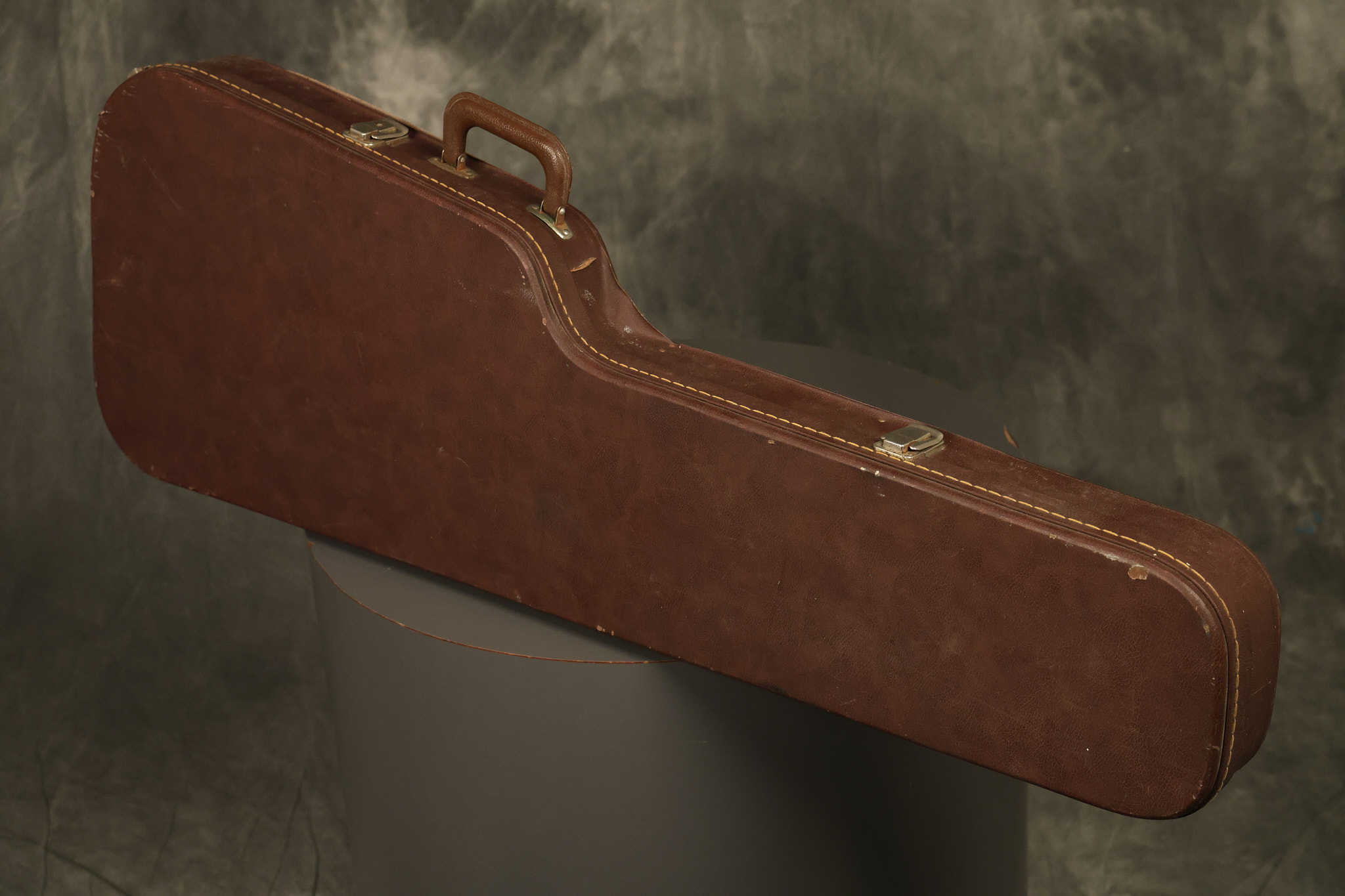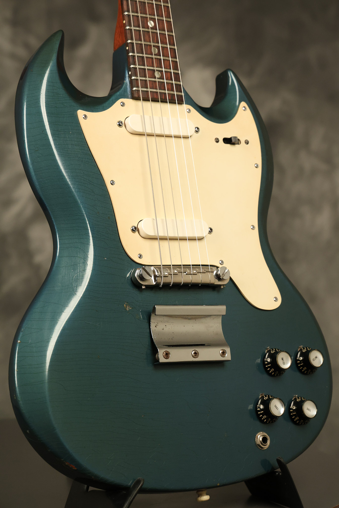 1966 Gibson Melody Maker II in its original Pelham Blue finish. It has a good playing neck as it has been re-fretted with a Plek machine by Wolff Guitars and includes the Plek certificate. It's all original with the exception of the switch and the frets (the original frets are included). The Vibrato arm and claw are included, but not recommended for use as it prevents a proper break angle over the bridge. A later non-original hardshell case is included. There are lots of nicks + dings, finish checking and other cosmetic wear. The guitar itself remains structurally sound with no cracks, breaks or repairs. All electronics work and sound great. There is a name etched on the underside of the back control cavity cover.