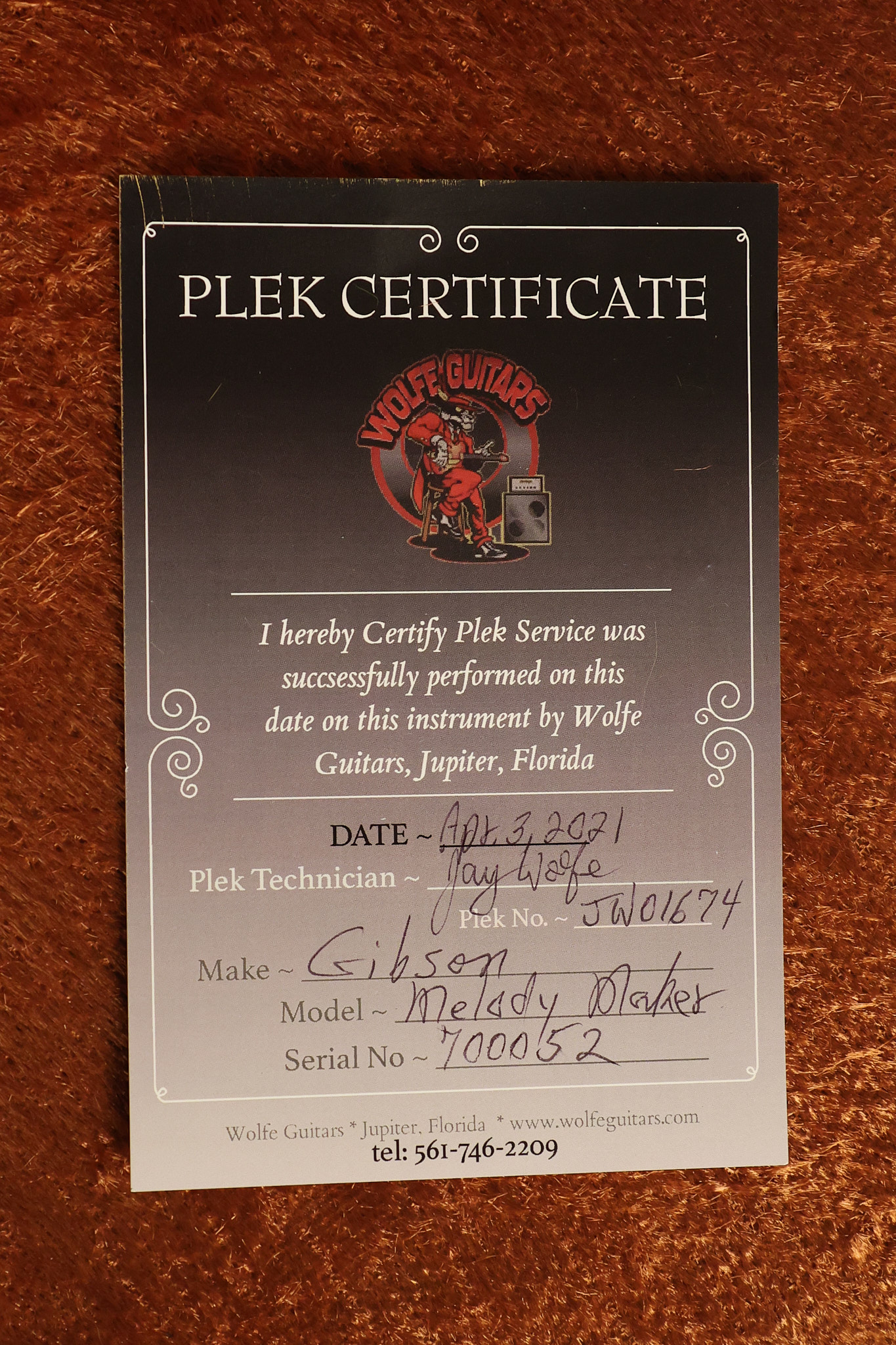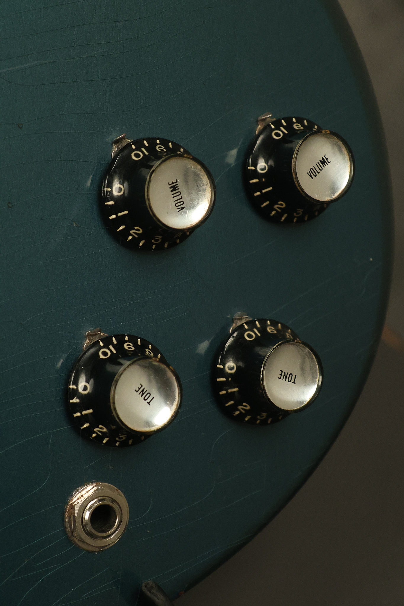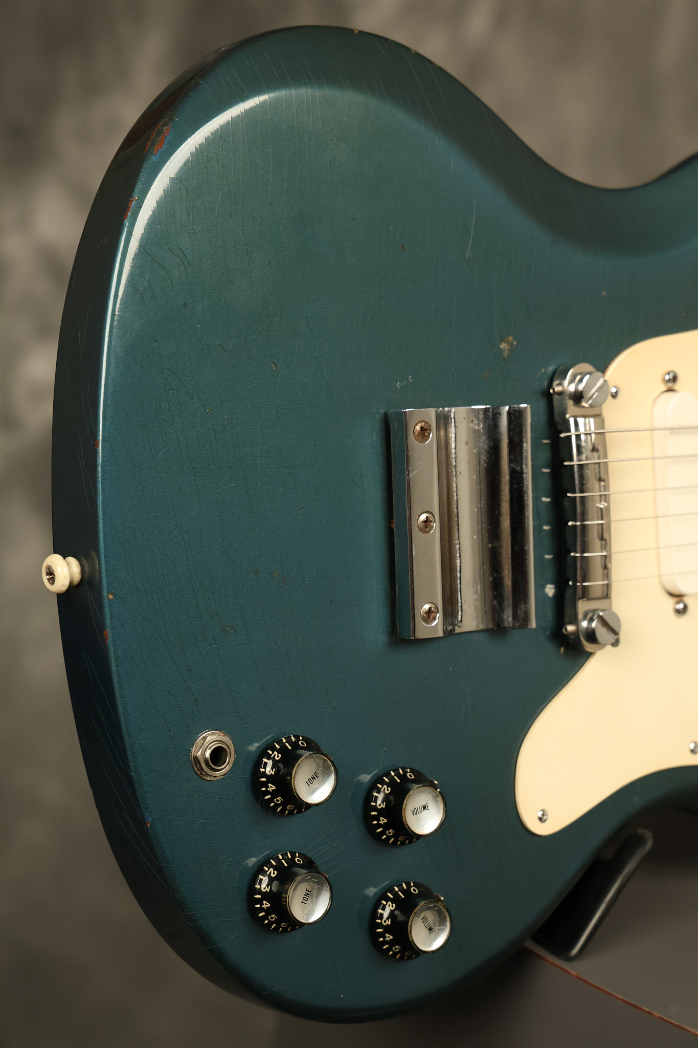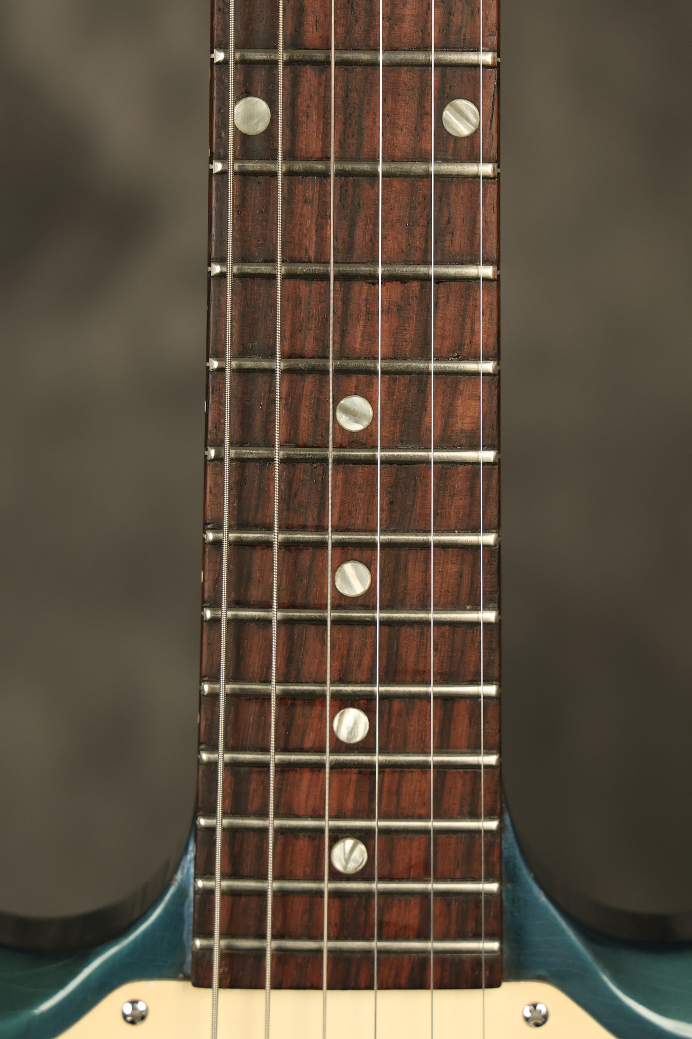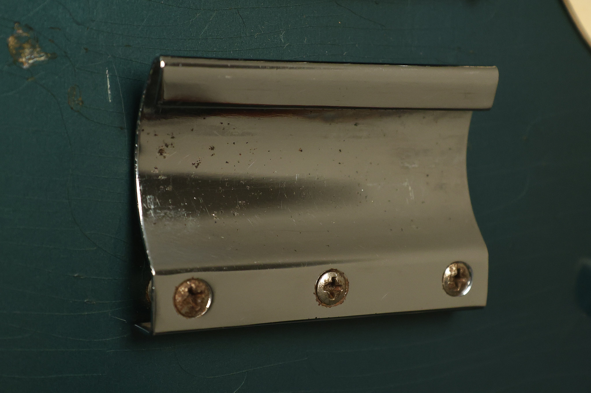 1966 Gibson Melody Maker II in its original Pelham Blue finish. It has a good playing neck as it has been re-fretted with a Plek machine by Wolff Guitars and includes the Plek certificate. It's all original with the exception of the switch and the frets (the original frets are included). The Vibrato arm and claw are included, but not recommended for use as it prevents a proper break angle over the bridge. A later non-original hardshell case is included. There are lots of nicks + dings, finish checking and other cosmetic wear. The guitar itself remains structurally sound with no cracks, breaks or repairs. All electronics work and sound great. There is a name etched on the underside of the back control cavity cover.
