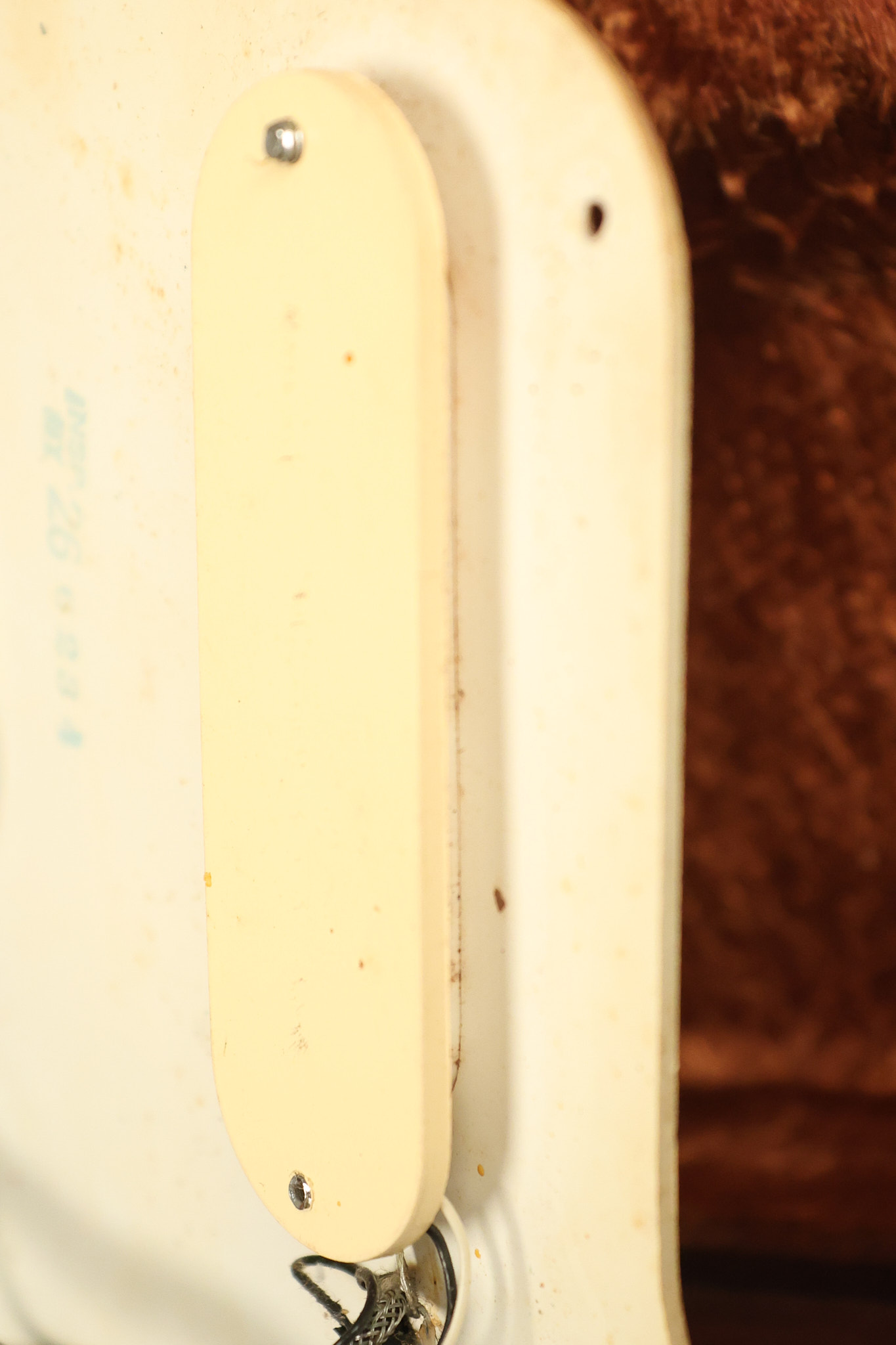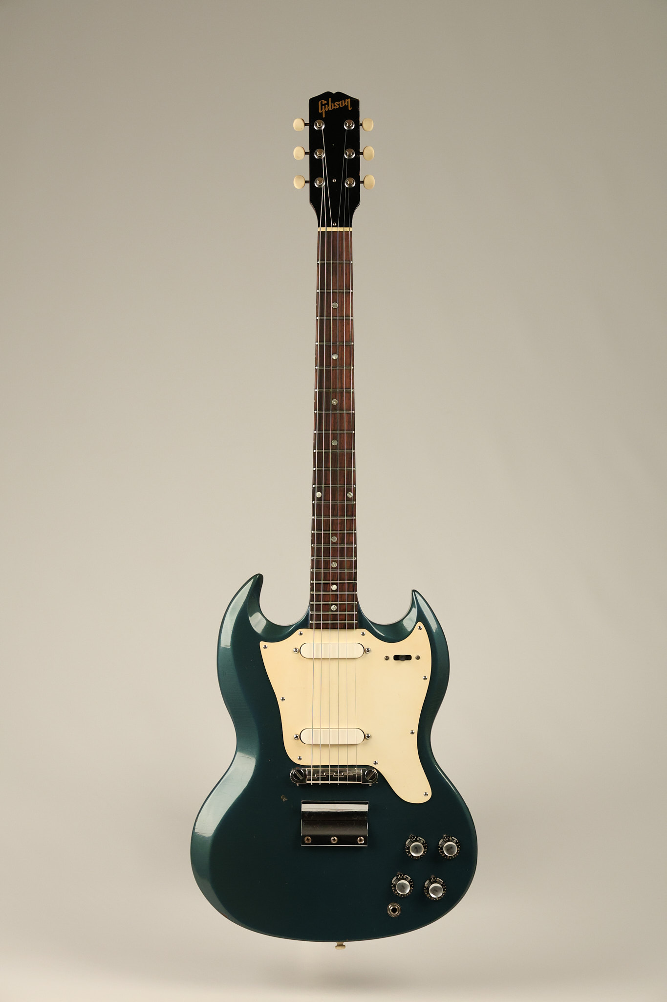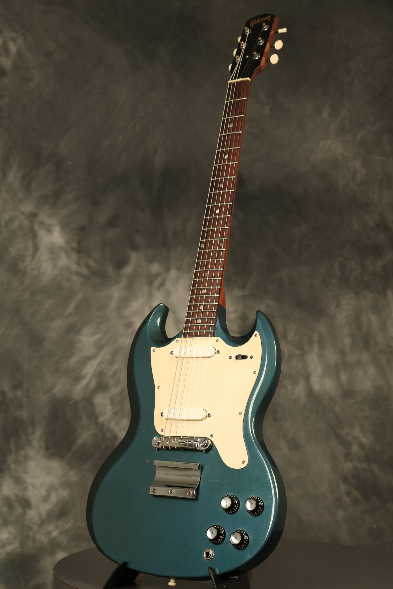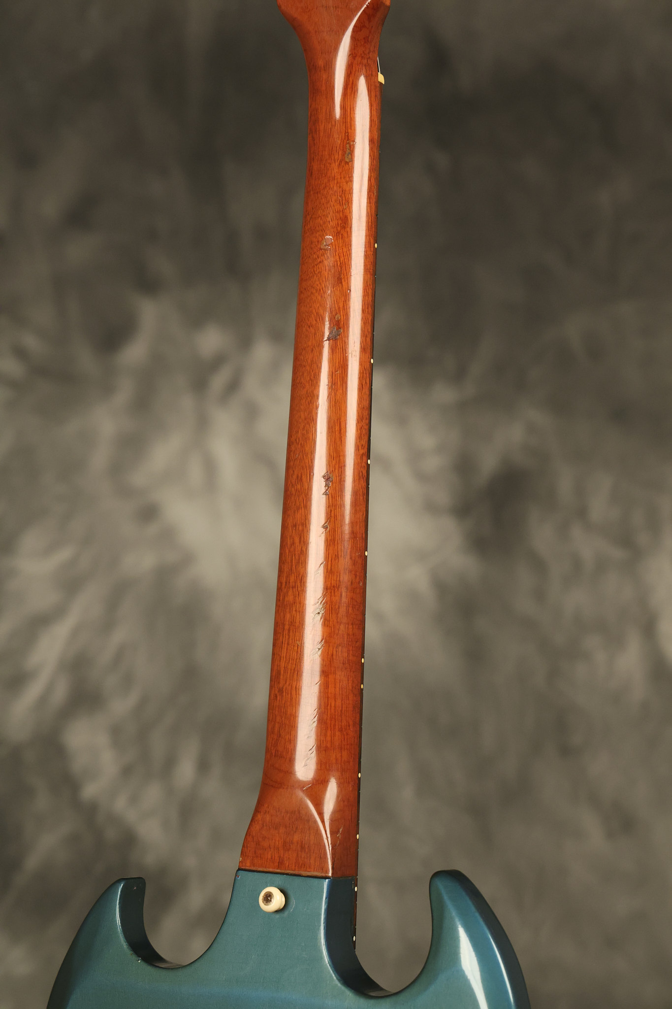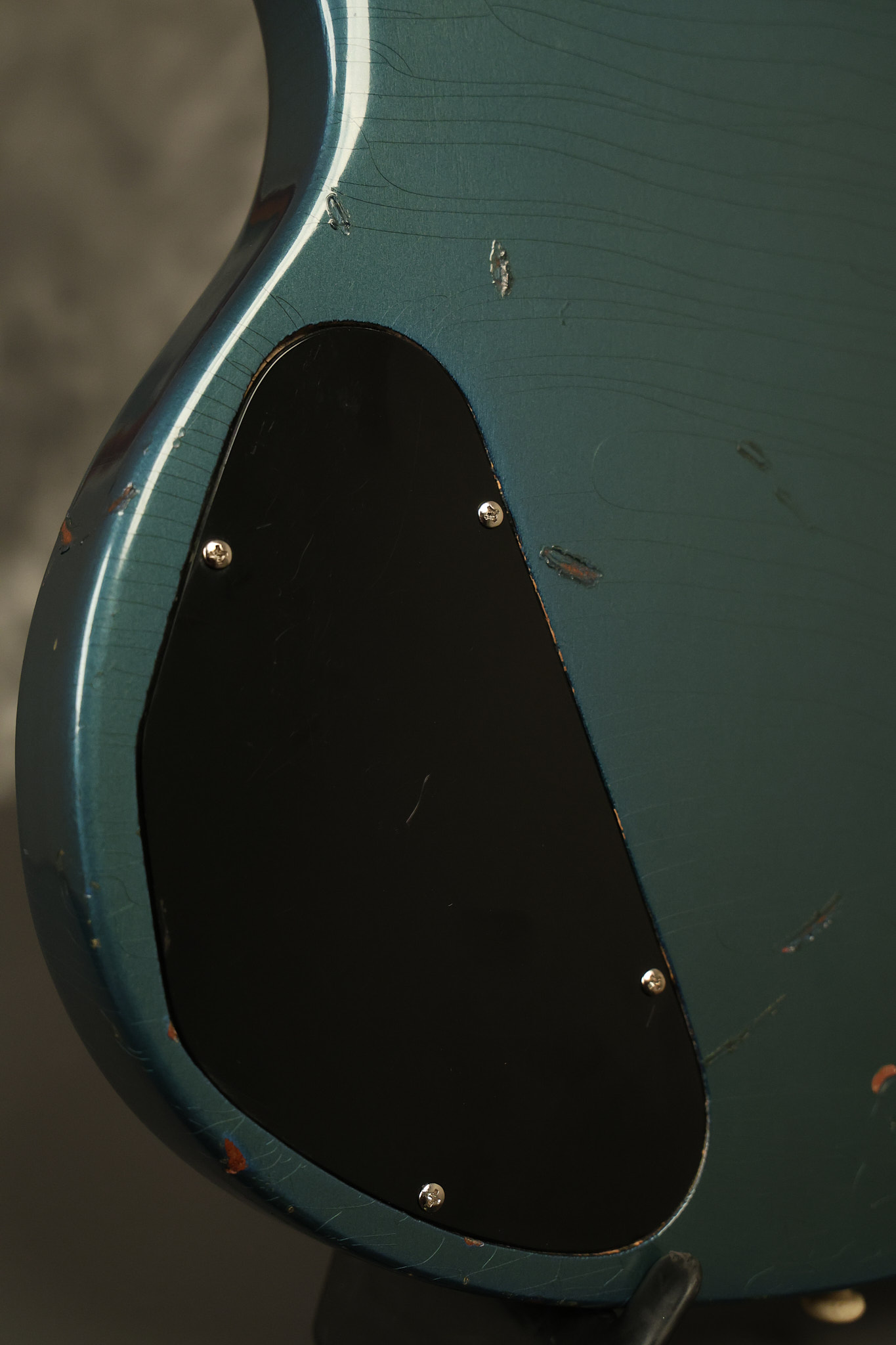 1966 Gibson Melody Maker II in its original Pelham Blue finish. It has a good playing neck as it has been re-fretted with a Plek machine by Wolff Guitars and includes the Plek certificate. It's all original with the exception of the switch and the frets (the original frets are included). The Vibrato arm and claw are included, but not recommended for use as it prevents a proper break angle over the bridge. A later non-original hardshell case is included. There are lots of nicks + dings, finish checking and other cosmetic wear. The guitar itself remains structurally sound with no cracks, breaks or repairs. All electronics work and sound great. There is a name etched on the underside of the back control cavity cover.