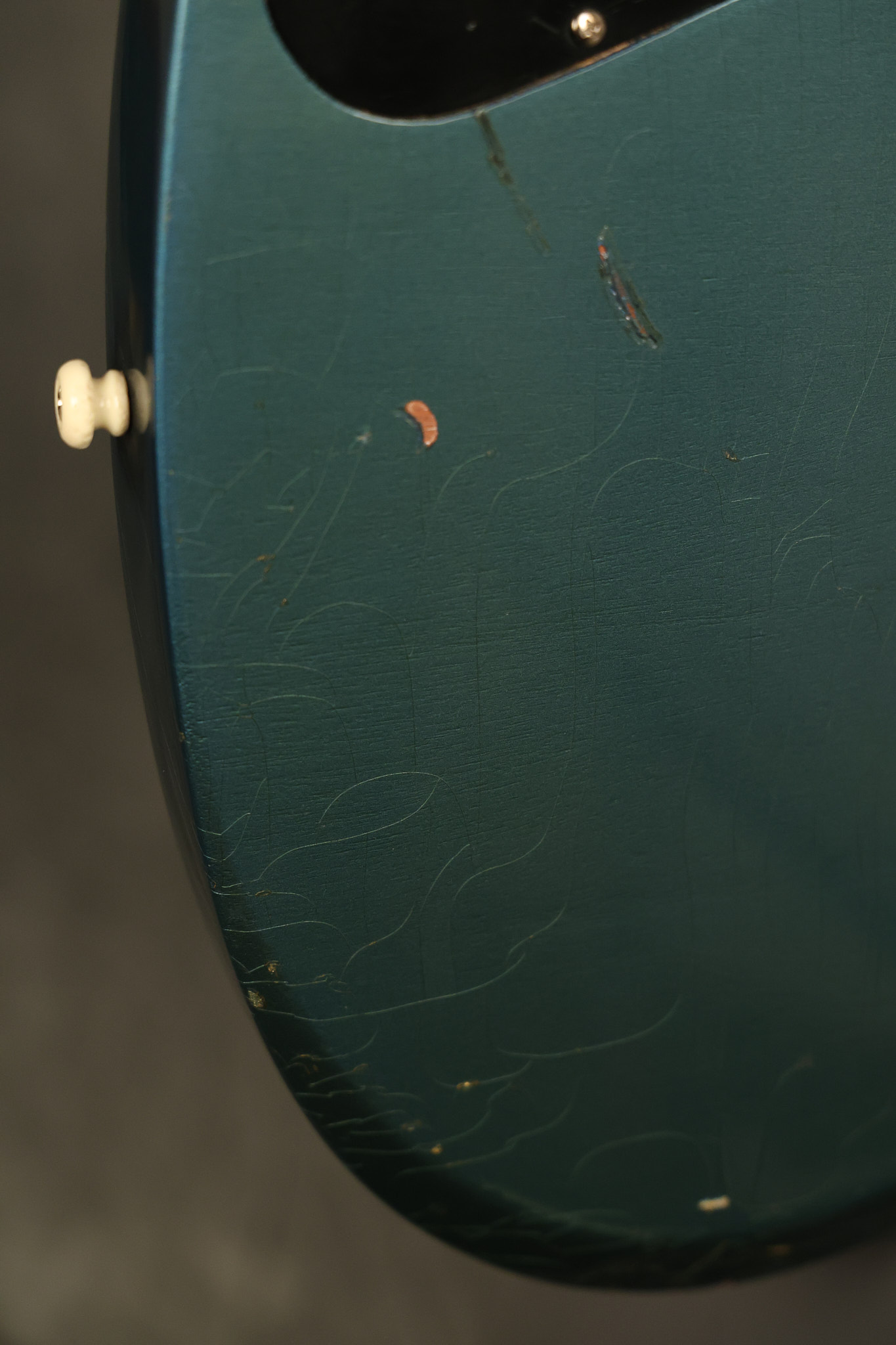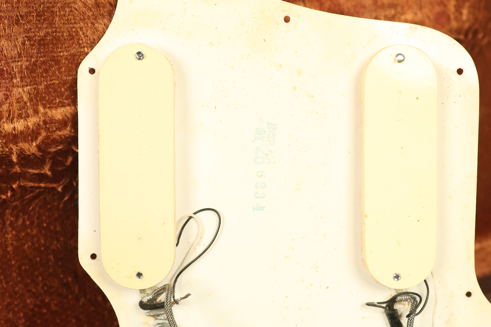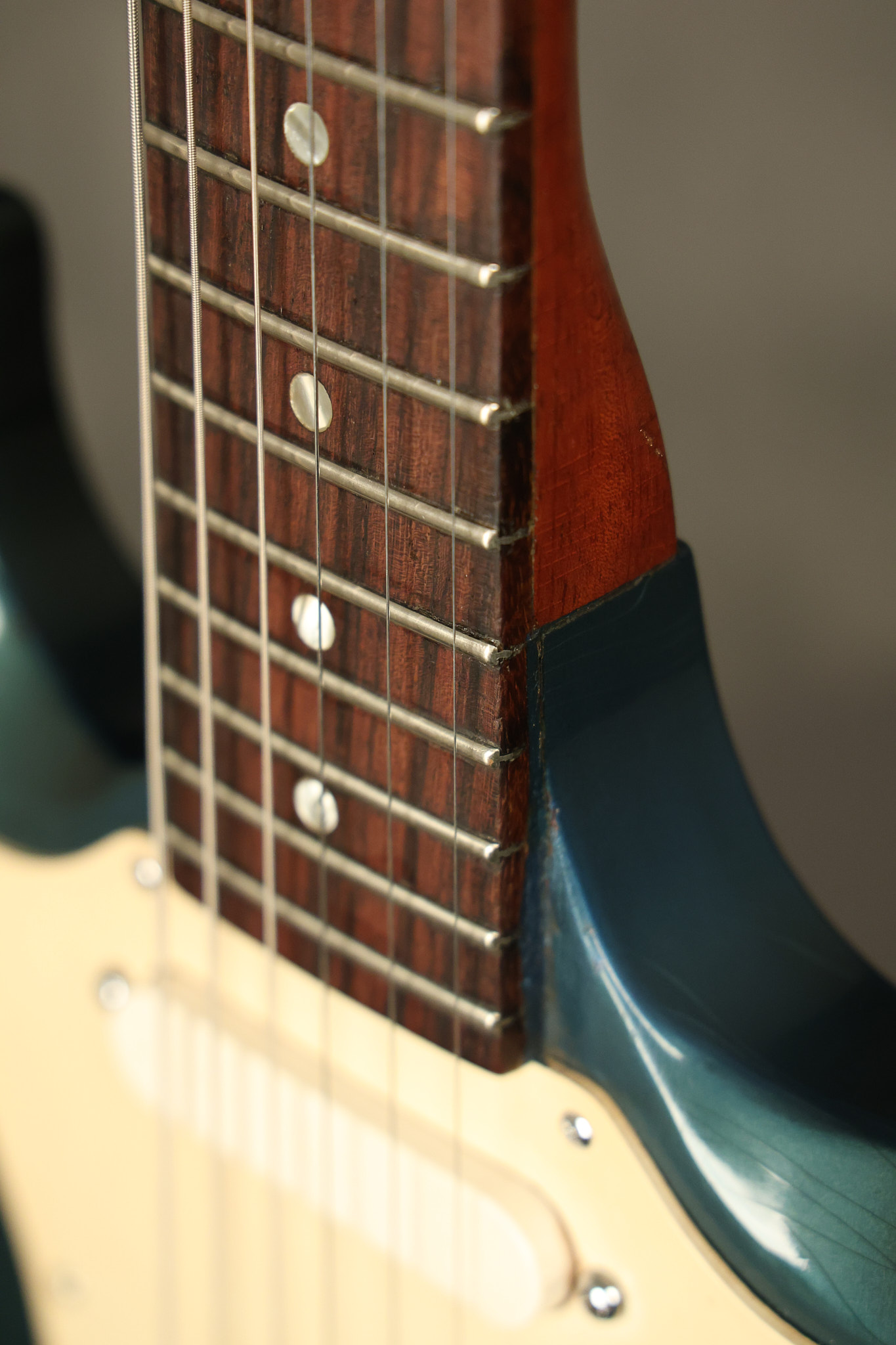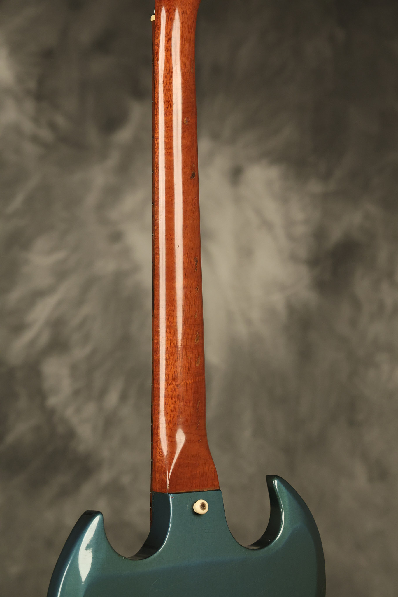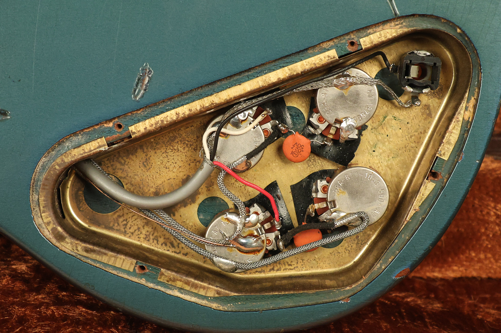 1966 Gibson Melody Maker II in its original Pelham Blue finish. It has a good playing neck as it has been re-fretted with a Plek machine by Wolff Guitars and includes the Plek certificate. It's all original with the exception of the switch and the frets (the original frets are included). The Vibrato arm and claw are included, but not recommended for use as it prevents a proper break angle over the bridge. A later non-original hardshell case is included. There are lots of nicks + dings, finish checking and other cosmetic wear. The guitar itself remains structurally sound with no cracks, breaks or repairs. All electronics work and sound great. There is a name etched on the underside of the back control cavity cover.