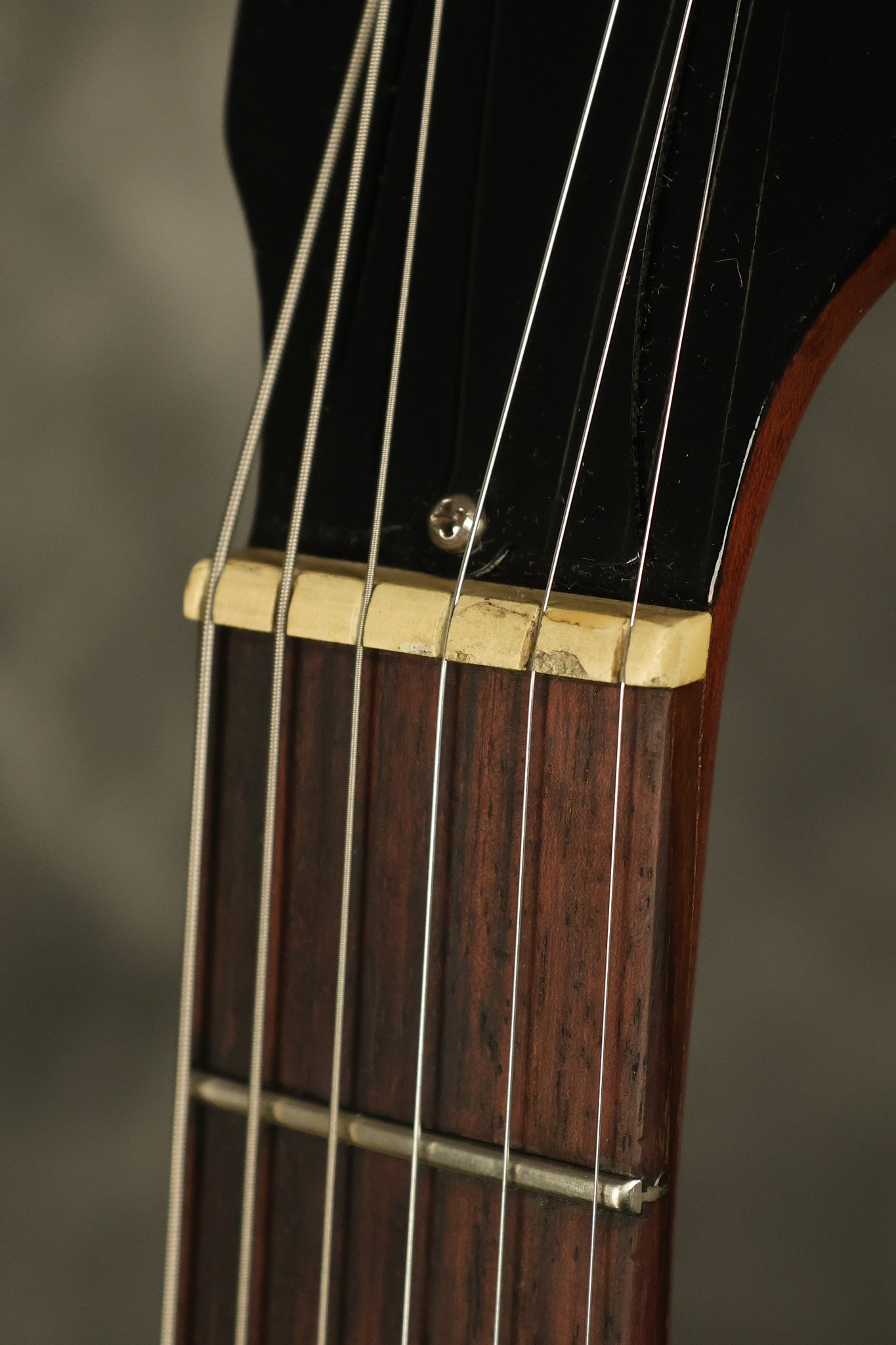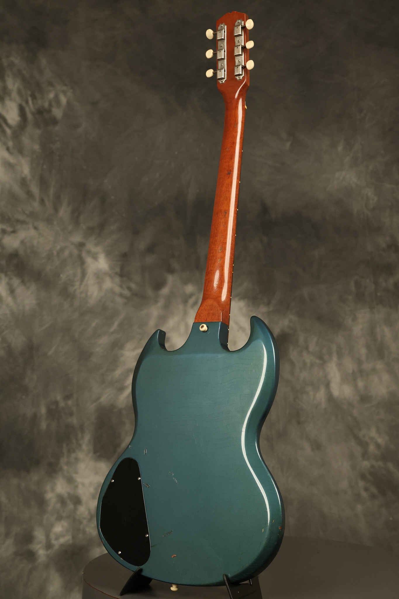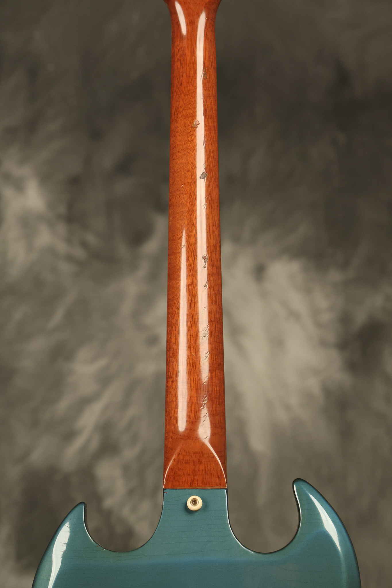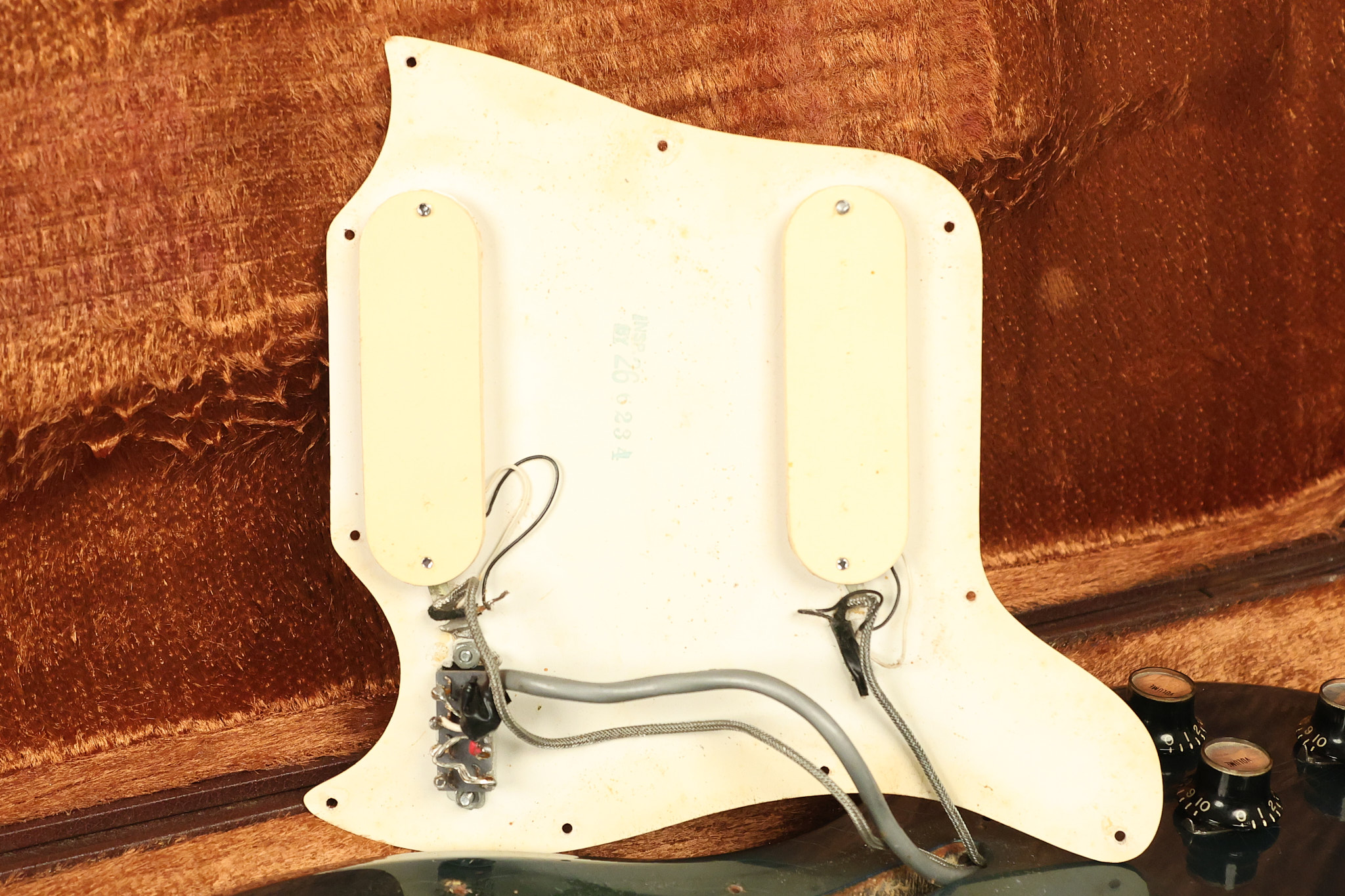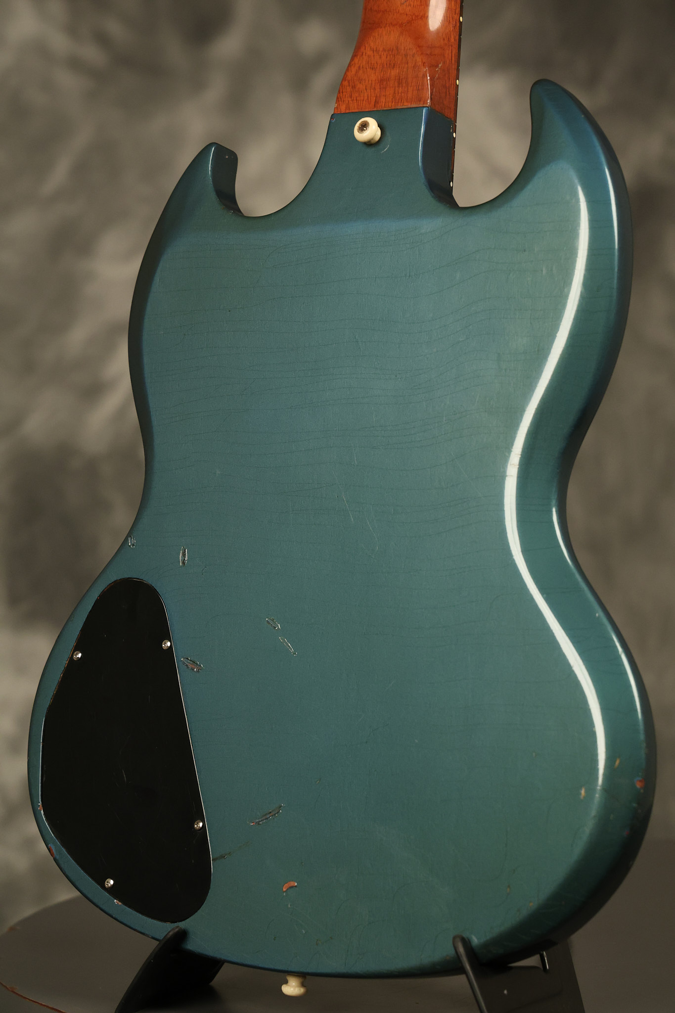 1966 Gibson Melody Maker II in its original Pelham Blue finish. It has a good playing neck as it has been re-fretted with a Plek machine by Wolff Guitars and includes the Plek certificate. It's all original with the exception of the switch and the frets (the original frets are included). The Vibrato arm and claw are included, but not recommended for use as it prevents a proper break angle over the bridge. A later non-original hardshell case is included. There are lots of nicks + dings, finish checking and other cosmetic wear. The guitar itself remains structurally sound with no cracks, breaks or repairs. All electronics work and sound great. There is a name etched on the underside of the back control cavity cover.