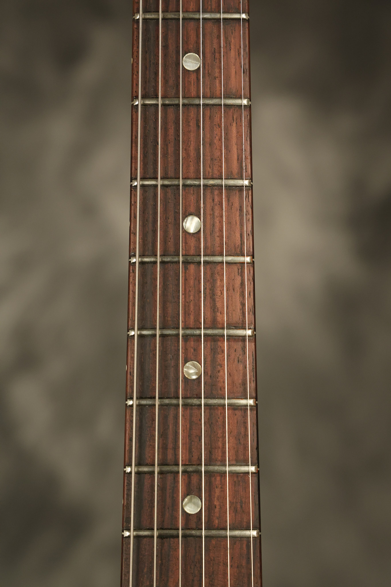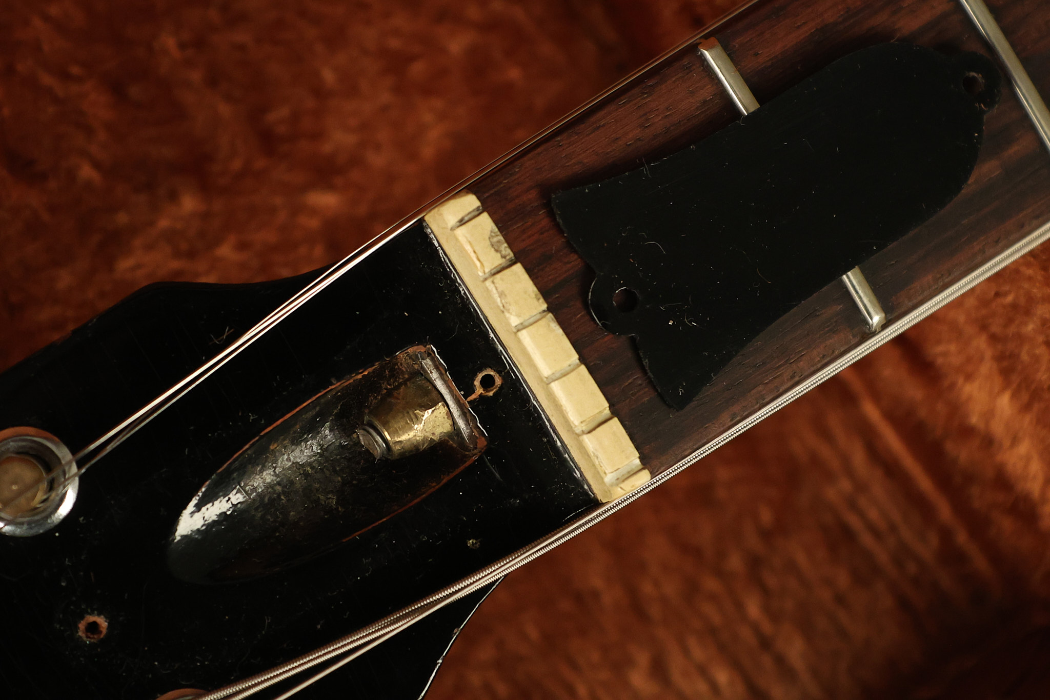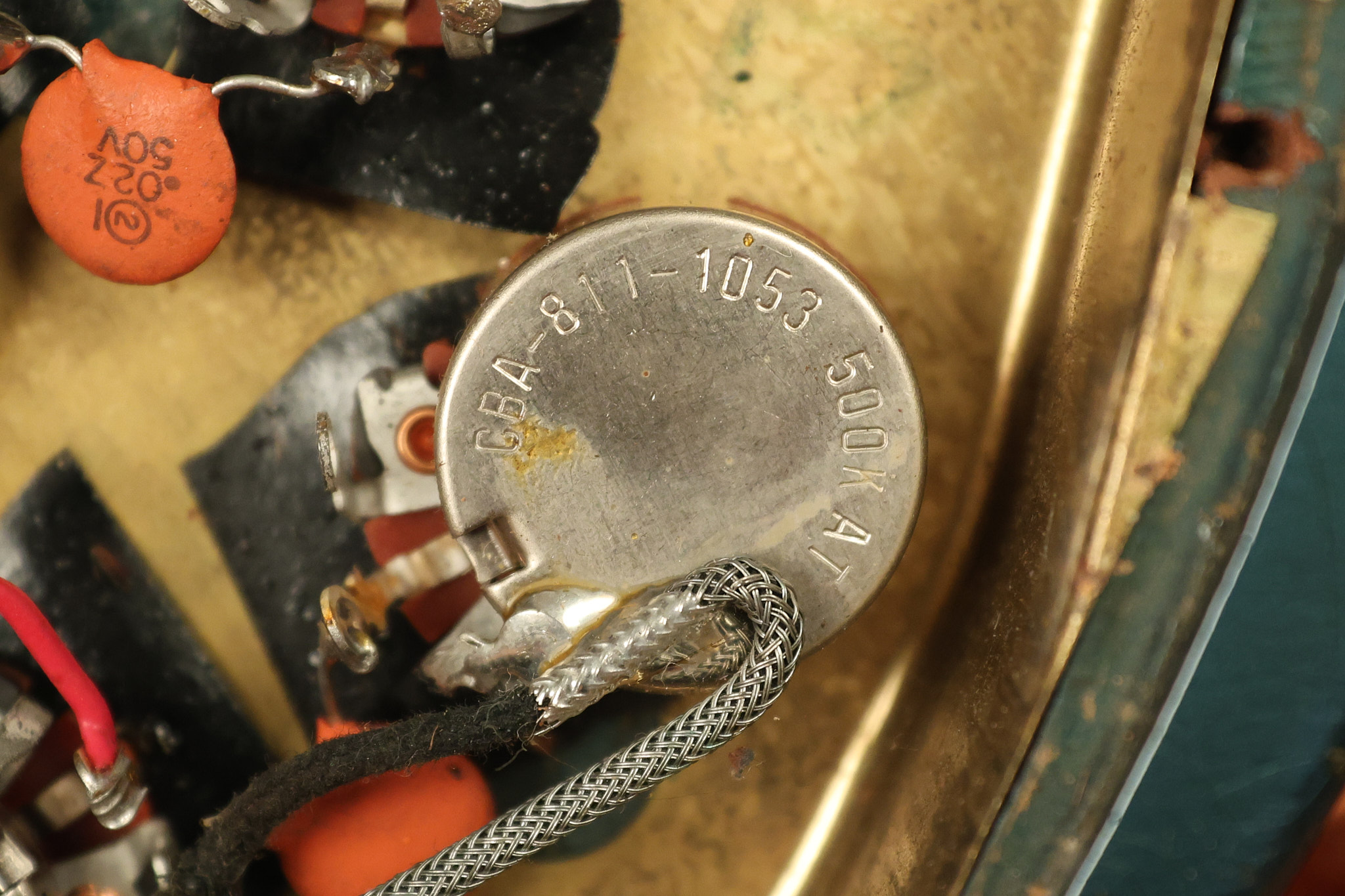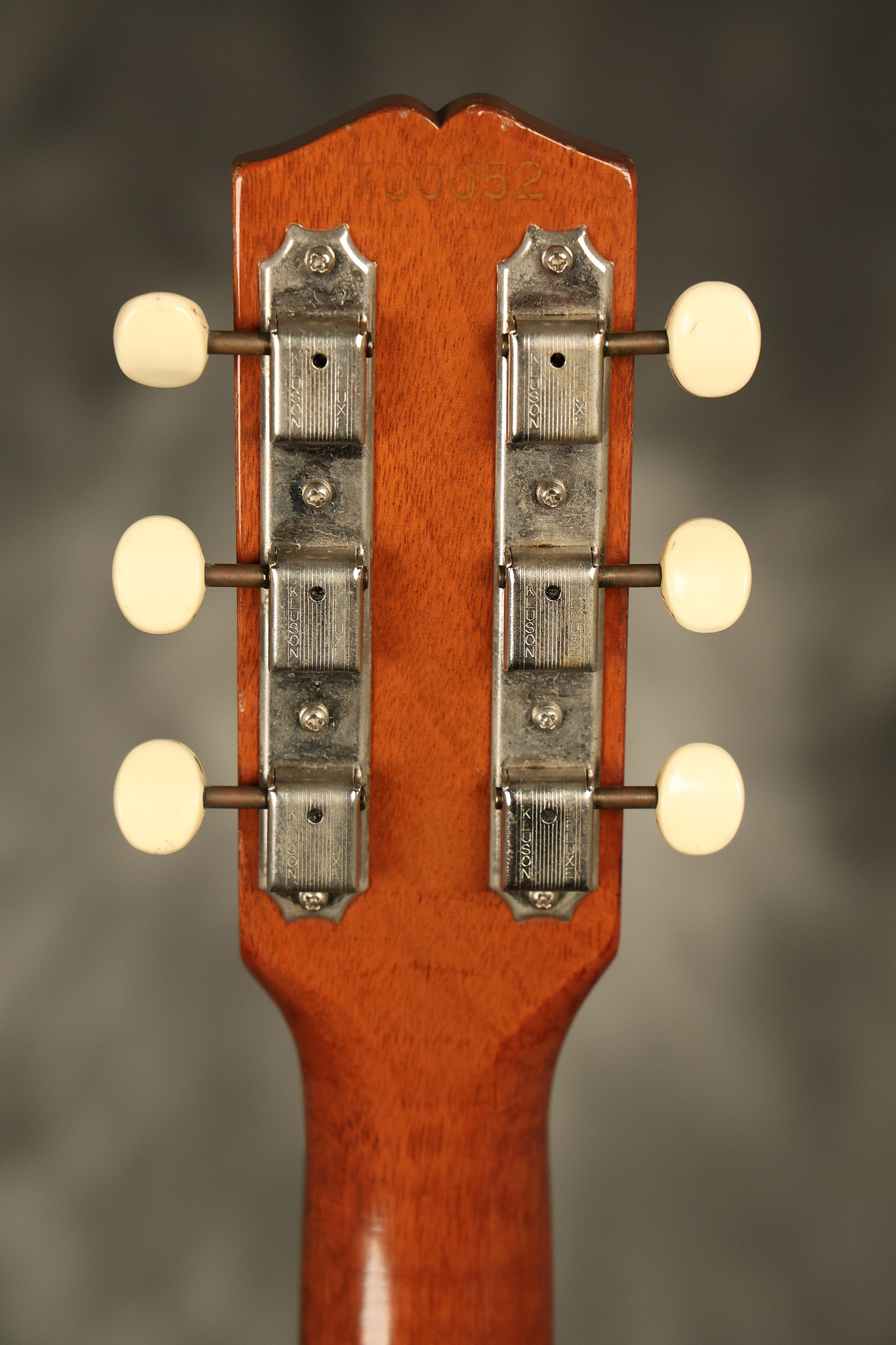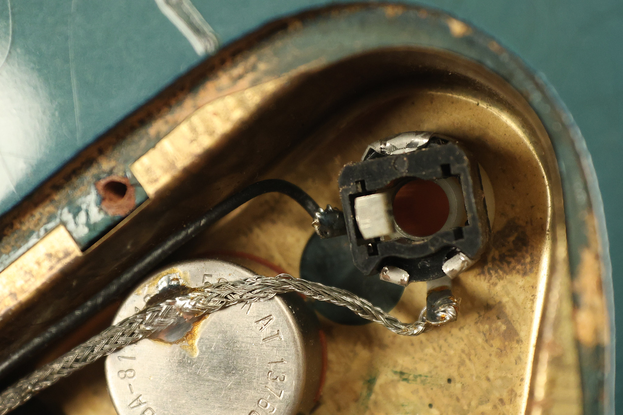 1966 Gibson Melody Maker II in its original Pelham Blue finish. It has a good playing neck as it has been re-fretted with a Plek machine by Wolff Guitars and includes the Plek certificate. It's all original with the exception of the switch and the frets (the original frets are included). The Vibrato arm and claw are included, but not recommended for use as it prevents a proper break angle over the bridge. A later non-original hardshell case is included. There are lots of nicks + dings, finish checking and other cosmetic wear. The guitar itself remains structurally sound with no cracks, breaks or repairs. All electronics work and sound great. There is a name etched on the underside of the back control cavity cover.